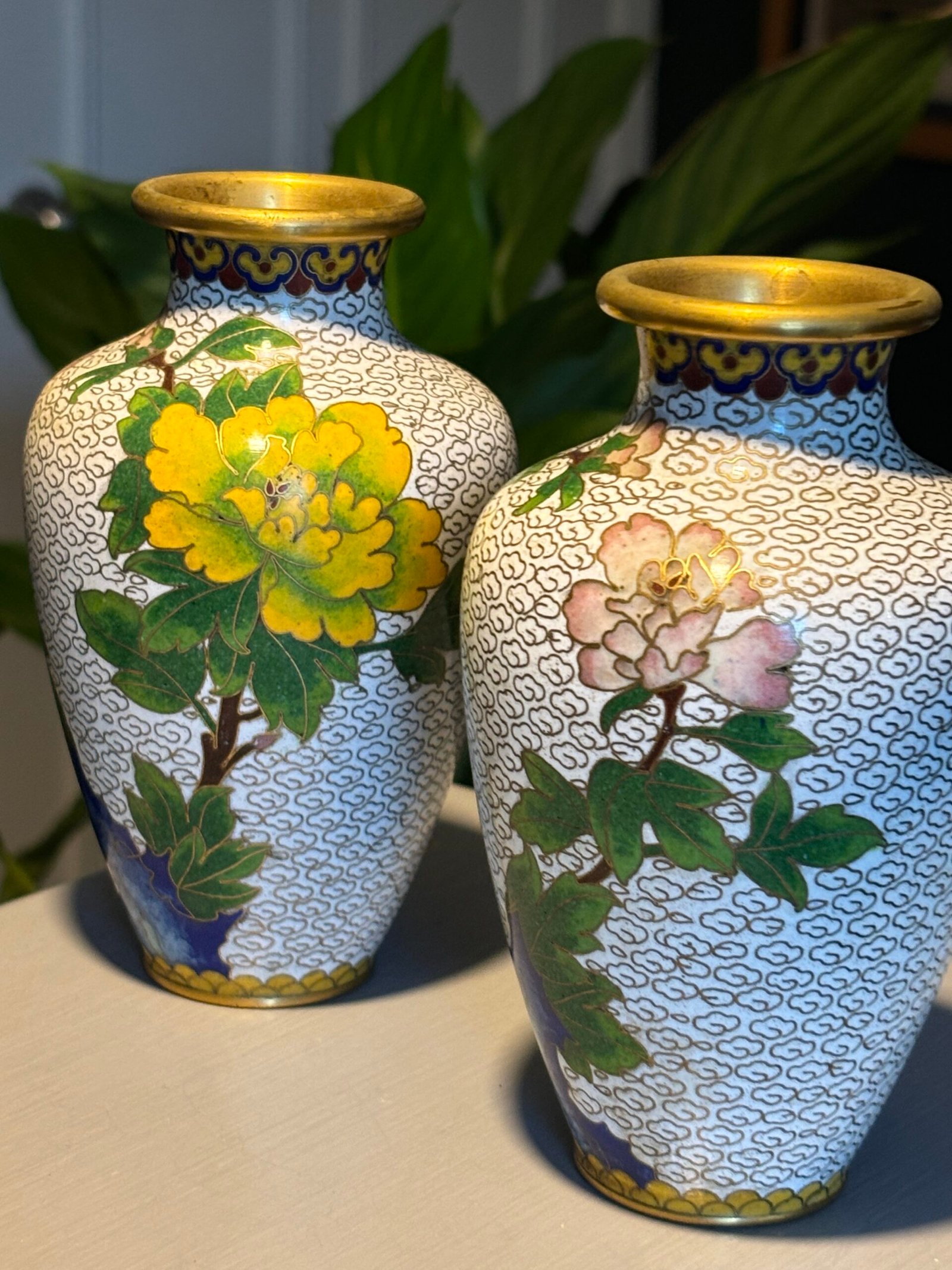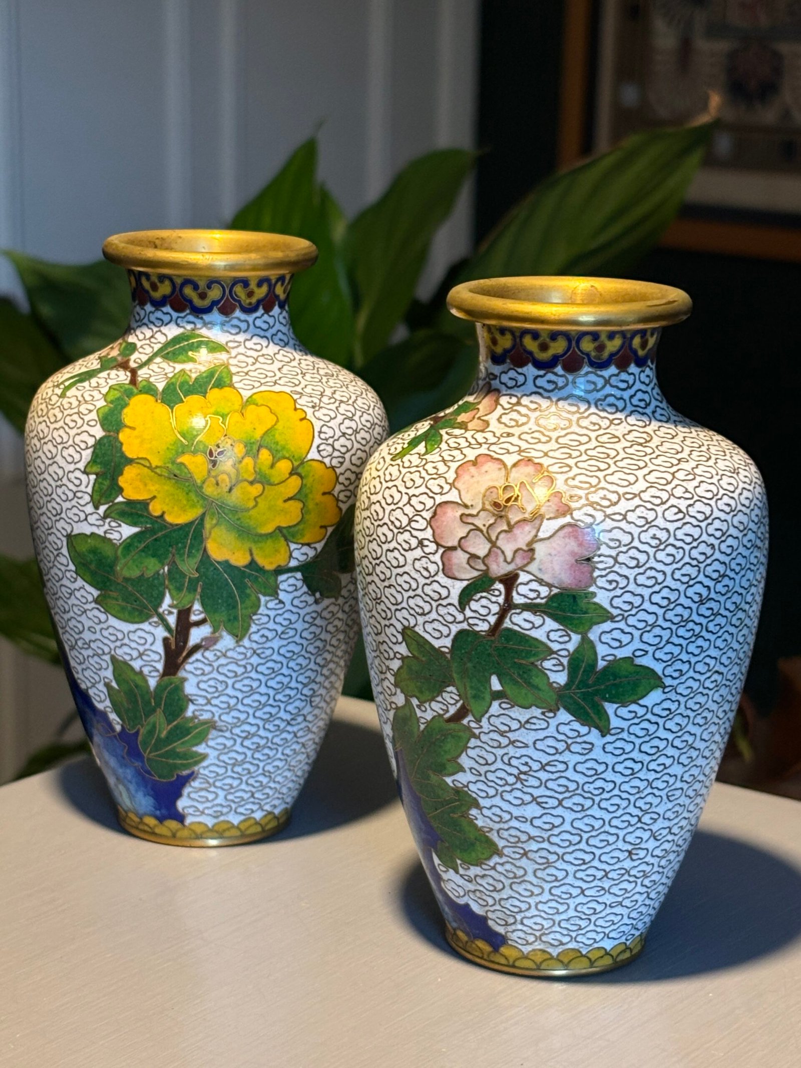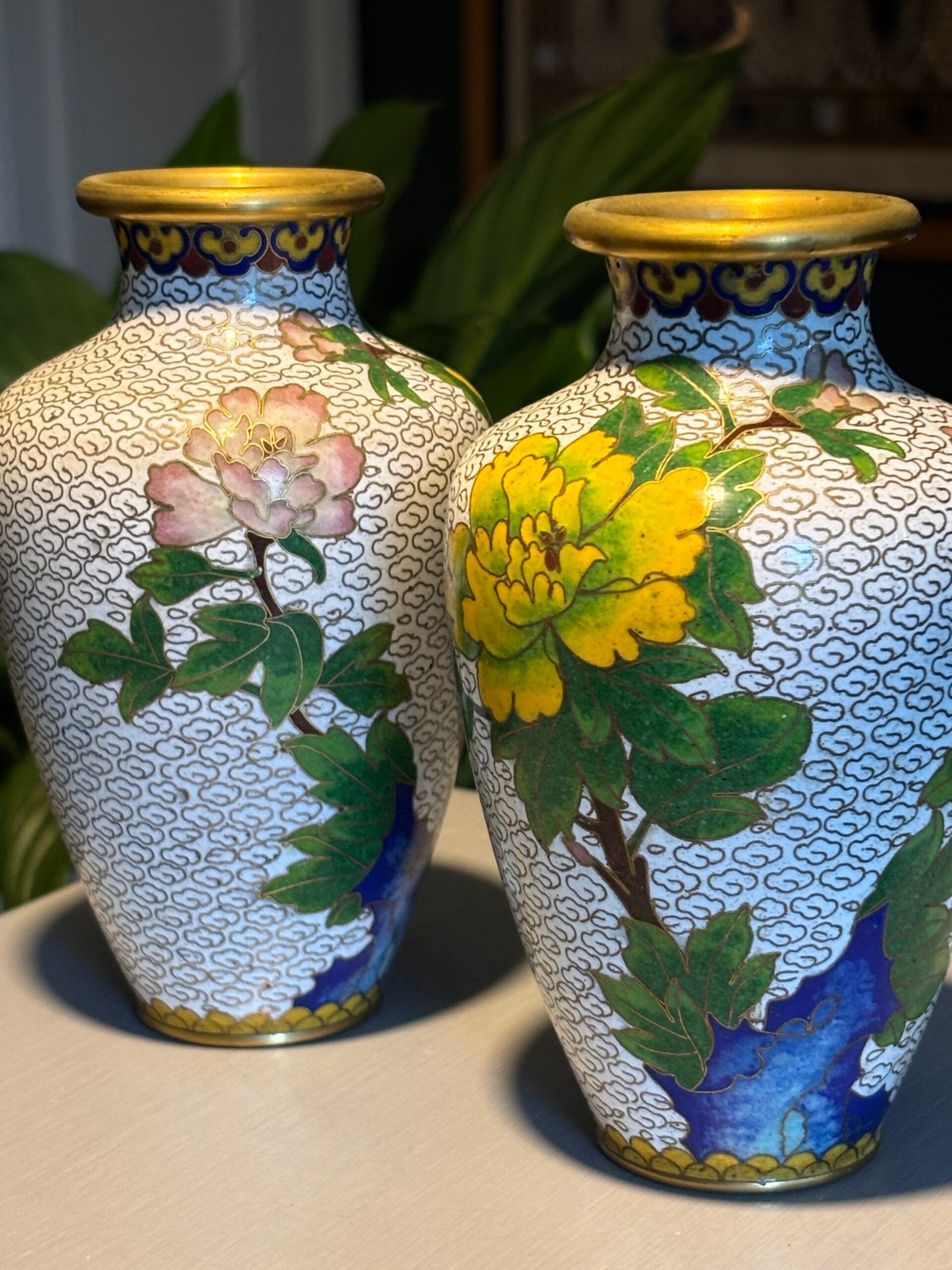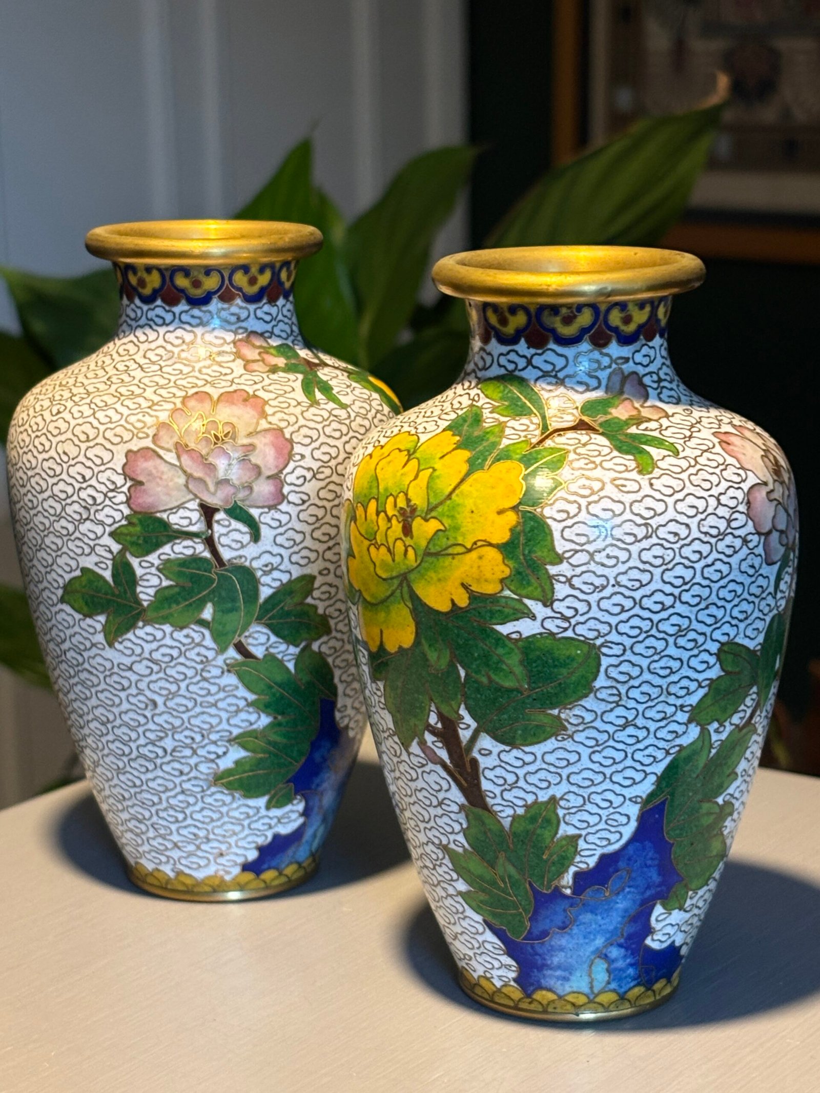Pair of Chinese Cloisonné Vases, Mid‑20th Century A matched pair of baluster‑form cloisonné enamel vases, each finely decorated with peony blossoms and foliate branches on a white cloud‑scroll ground, with polychrome lappet borders and gilt rims and bases, the undersides in turquoise enamel.