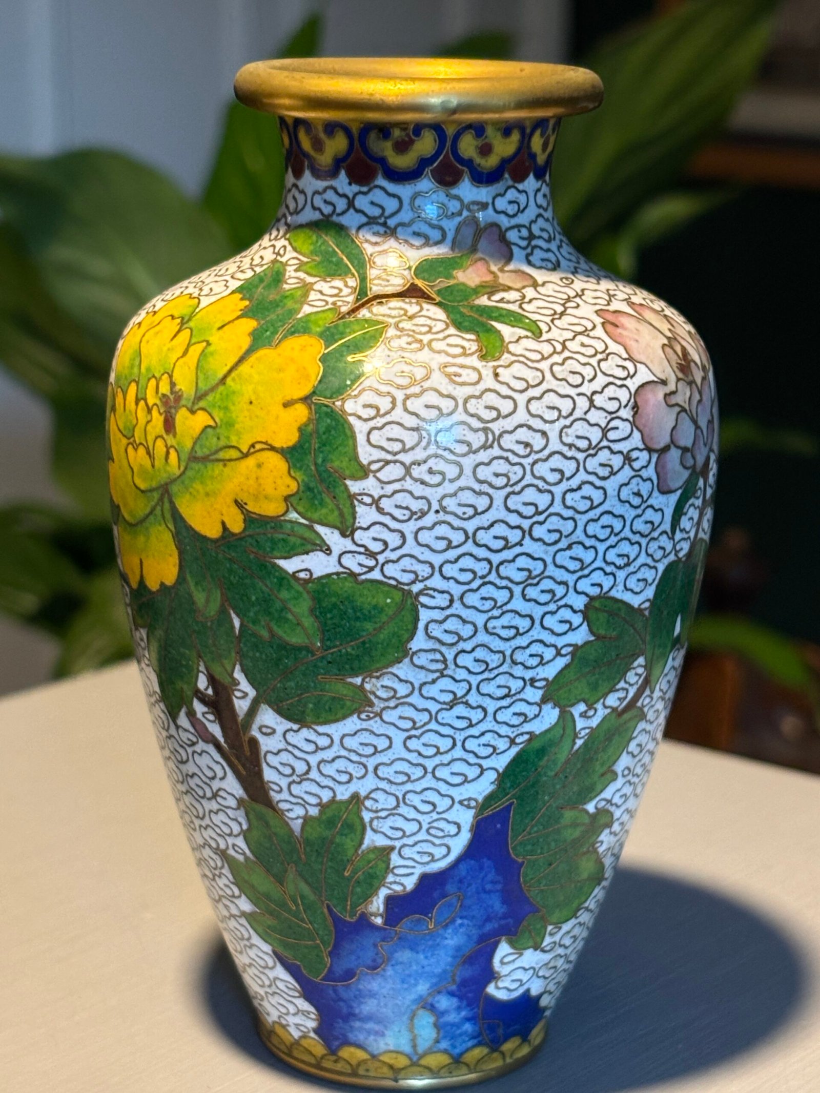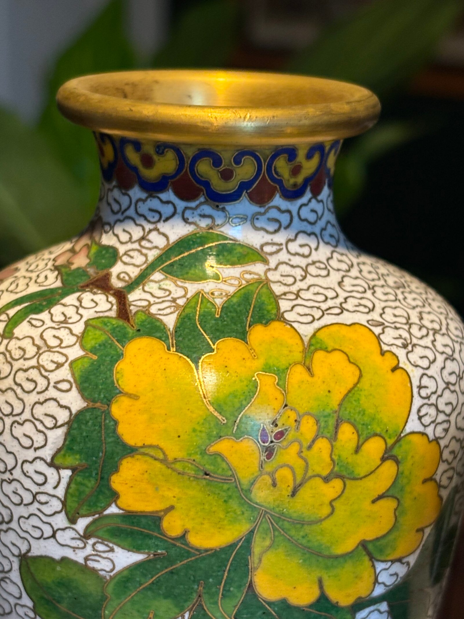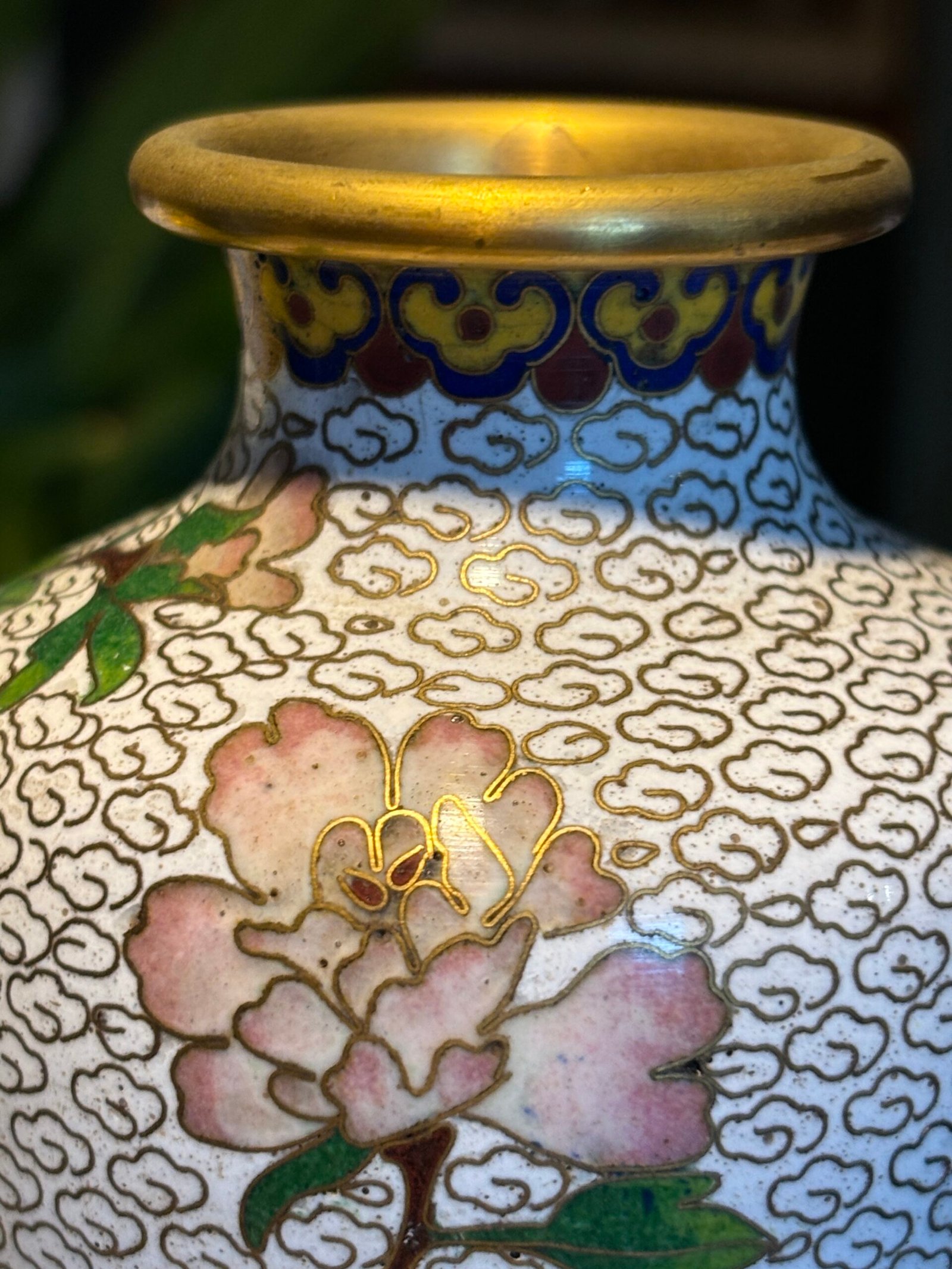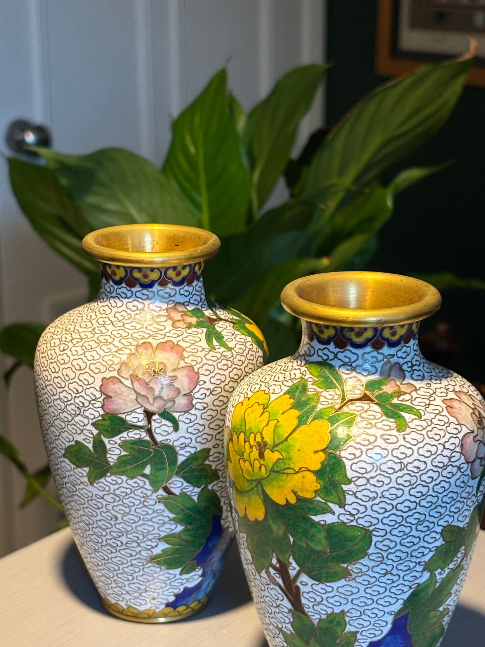 Pair of Chinese Cloisonné Vases, Mid‑20th Century A matched pair of baluster‑form cloisonné enamel vases, each finely decorated with peony blossoms and foliate branches on a white cloud‑scroll ground, with polychrome lappet borders and gilt rims and bases, the undersides in turquoise enamel.