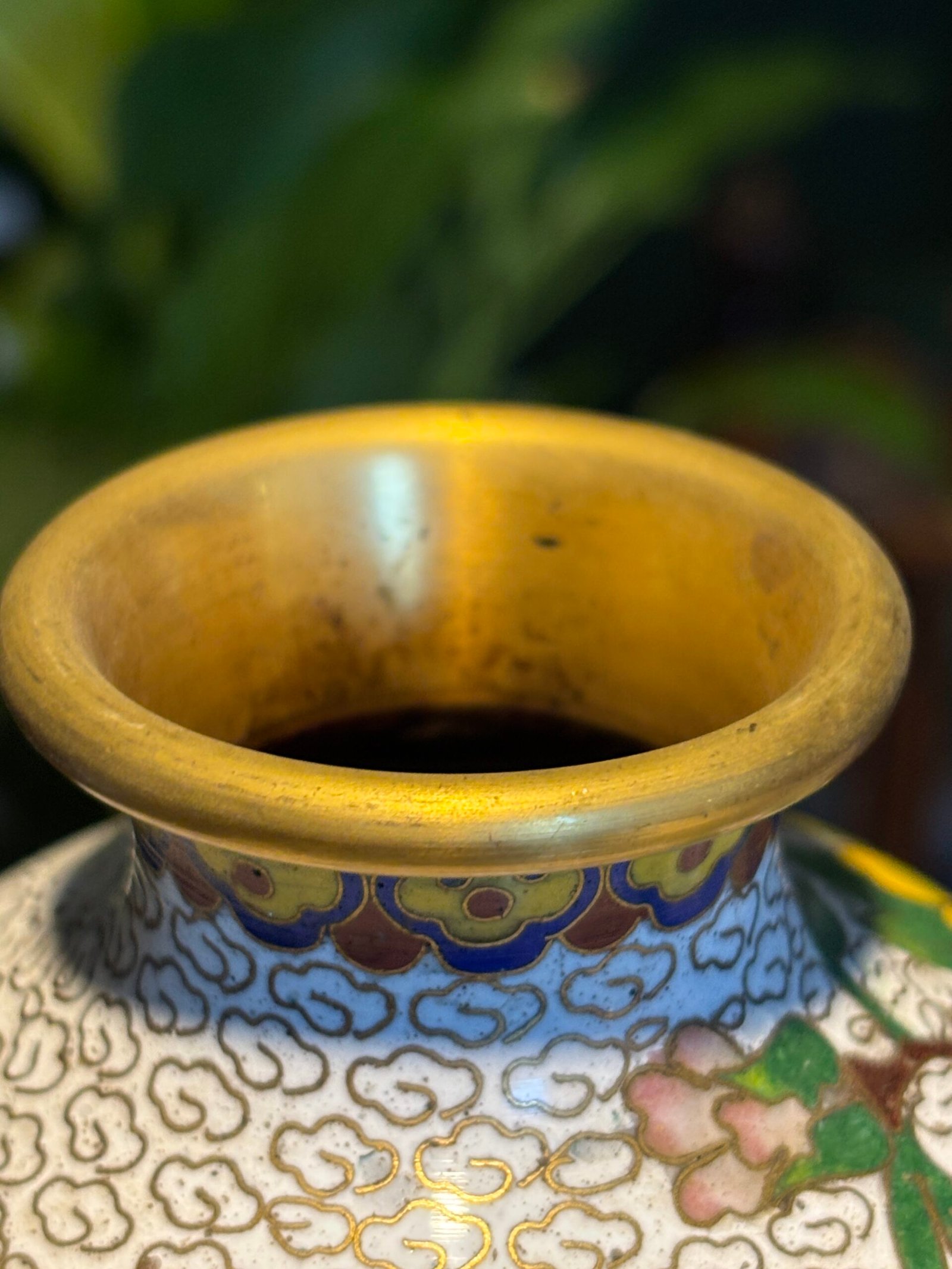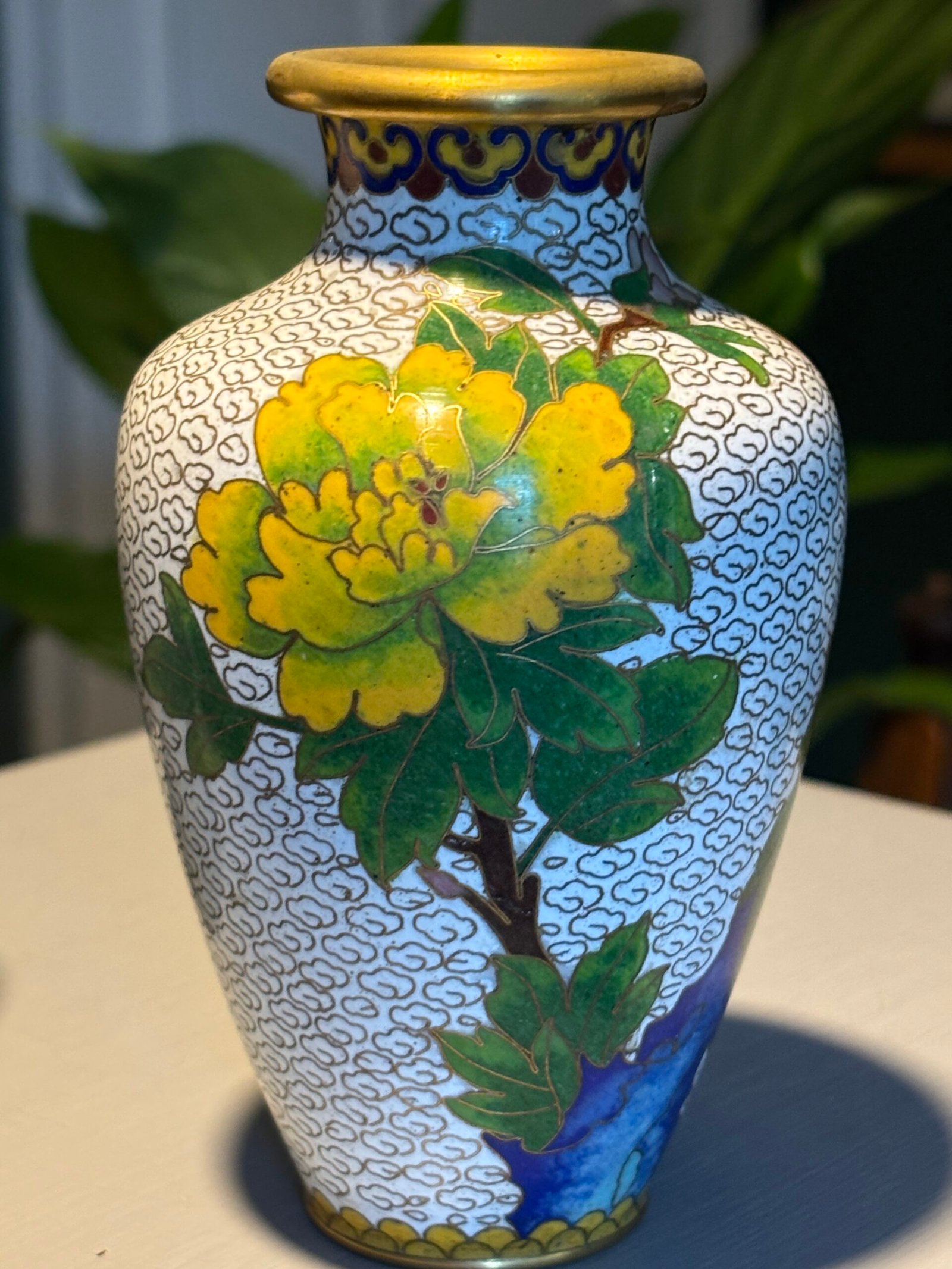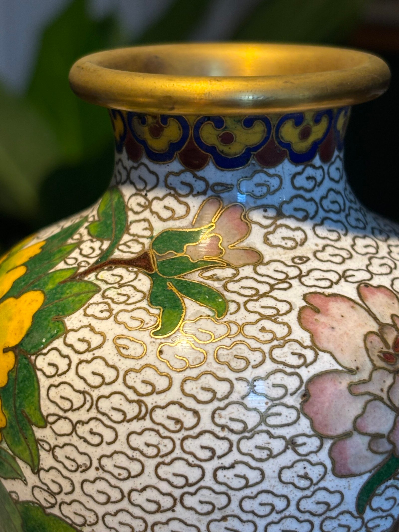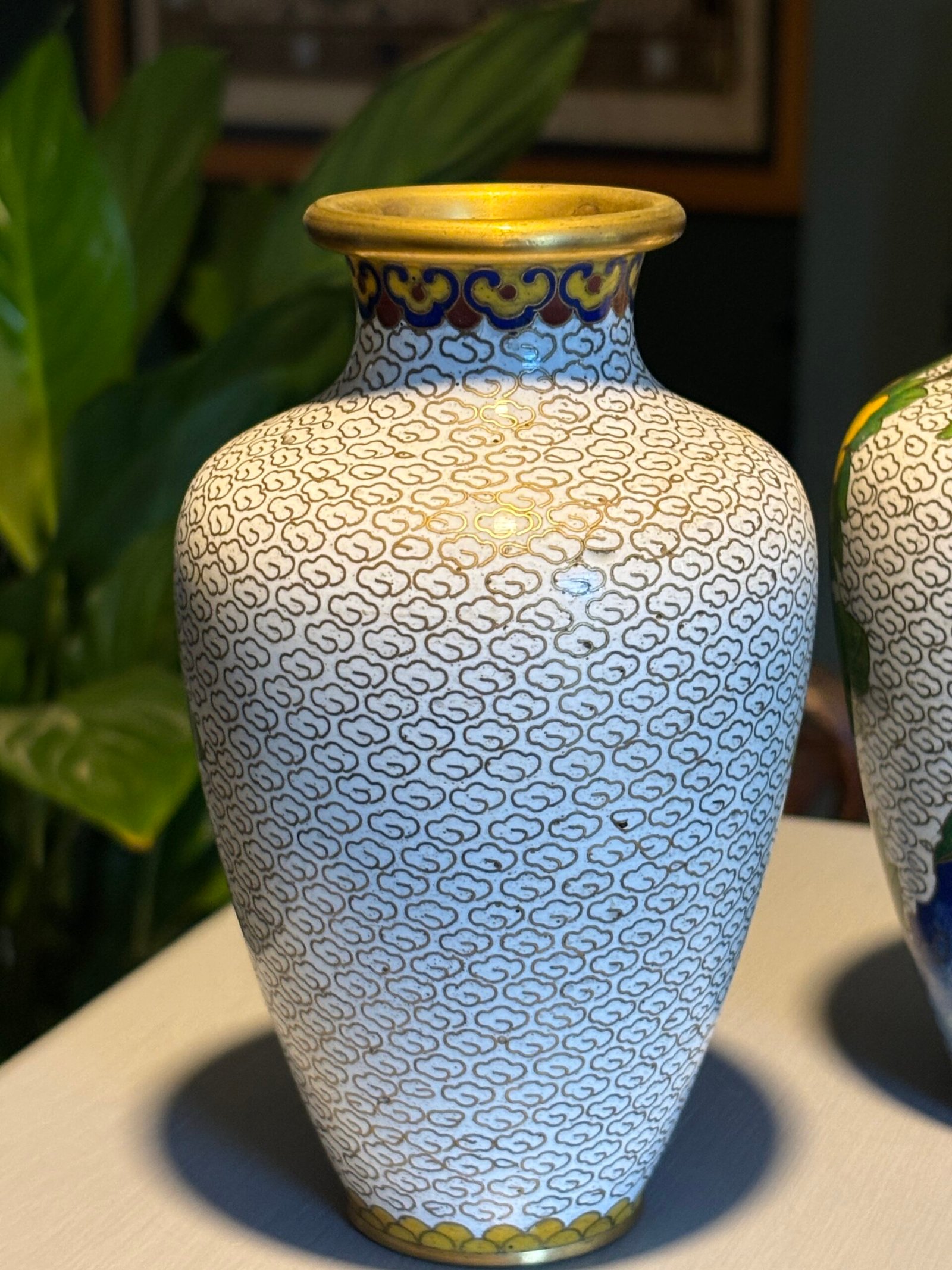 Pair of Chinese Cloisonné Vases, Mid‑20th Century A matched pair of baluster‑form cloisonné enamel vases, each finely decorated with peony blossoms and foliate branches on a white cloud‑scroll ground, with polychrome lappet borders and gilt rims and bases, the undersides in turquoise enamel.
