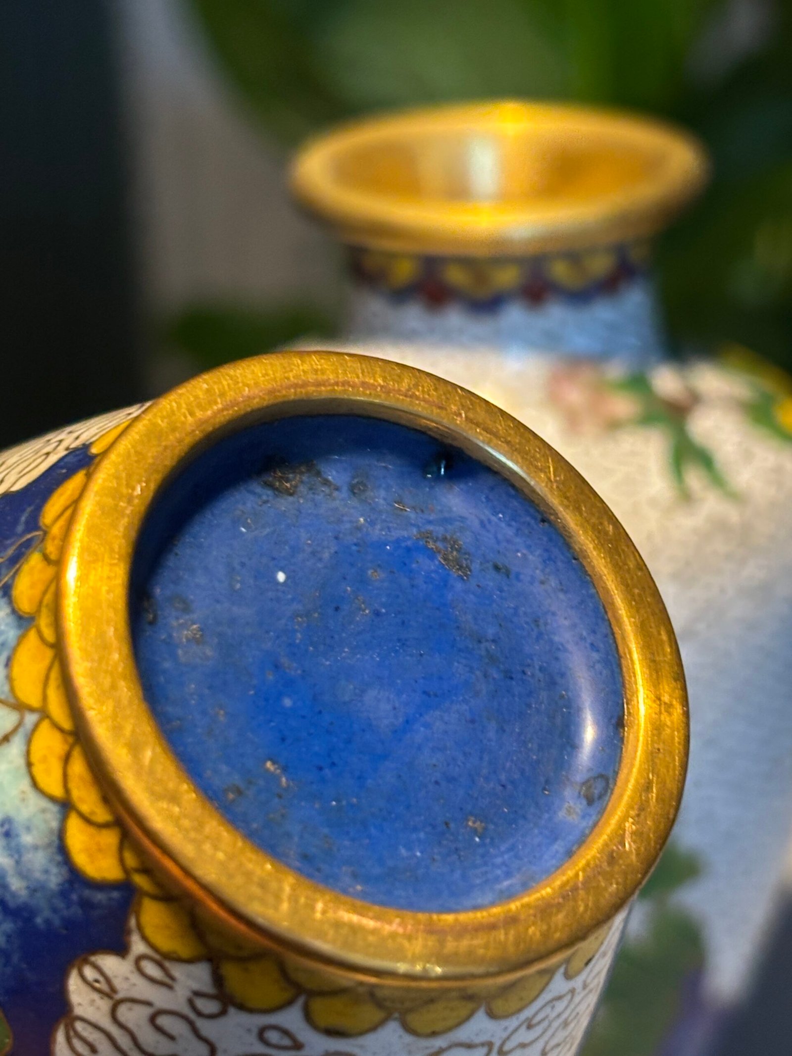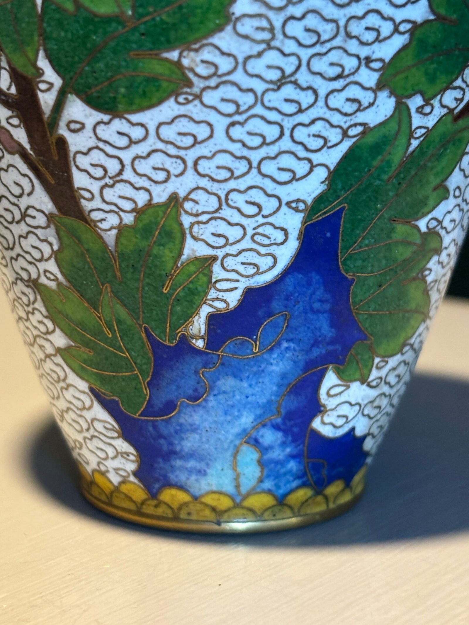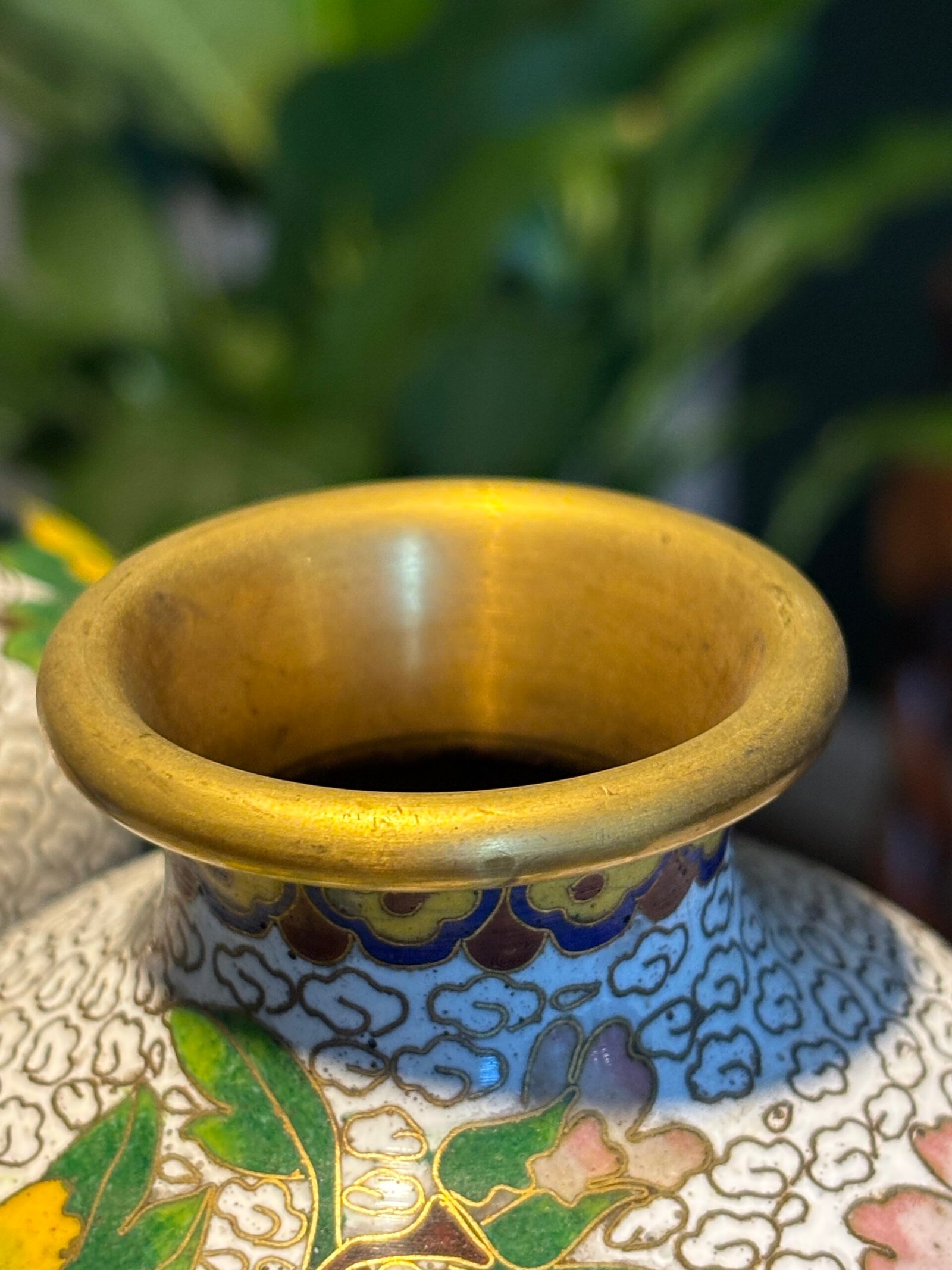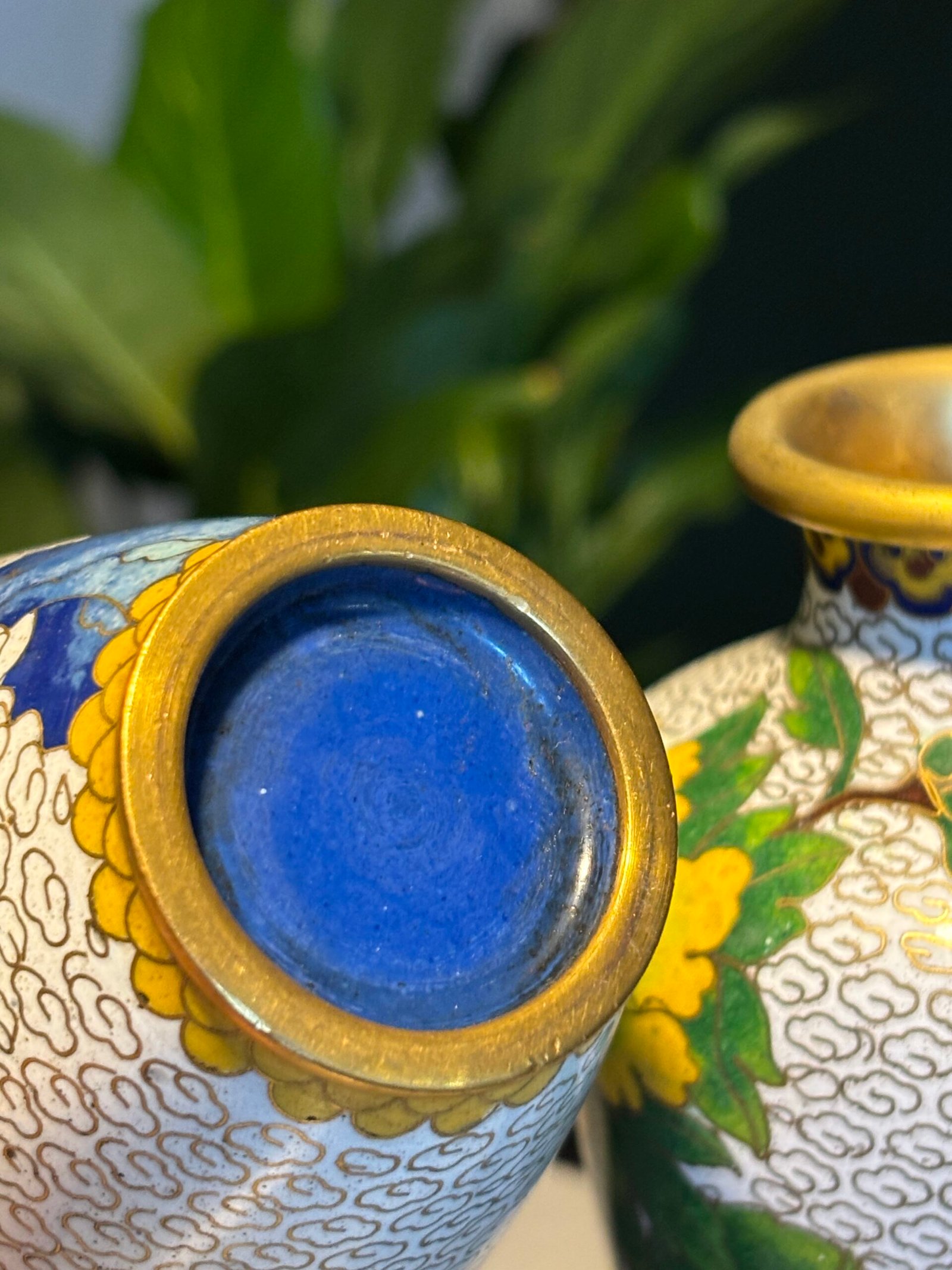 Pair of Chinese Cloisonné Vases, Mid‑20th Century A matched pair of baluster‑form cloisonné enamel vases, each finely decorated with peony blossoms and foliate branches on a white cloud‑scroll ground, with polychrome lappet borders and gilt rims and bases, the undersides in turquoise enamel.