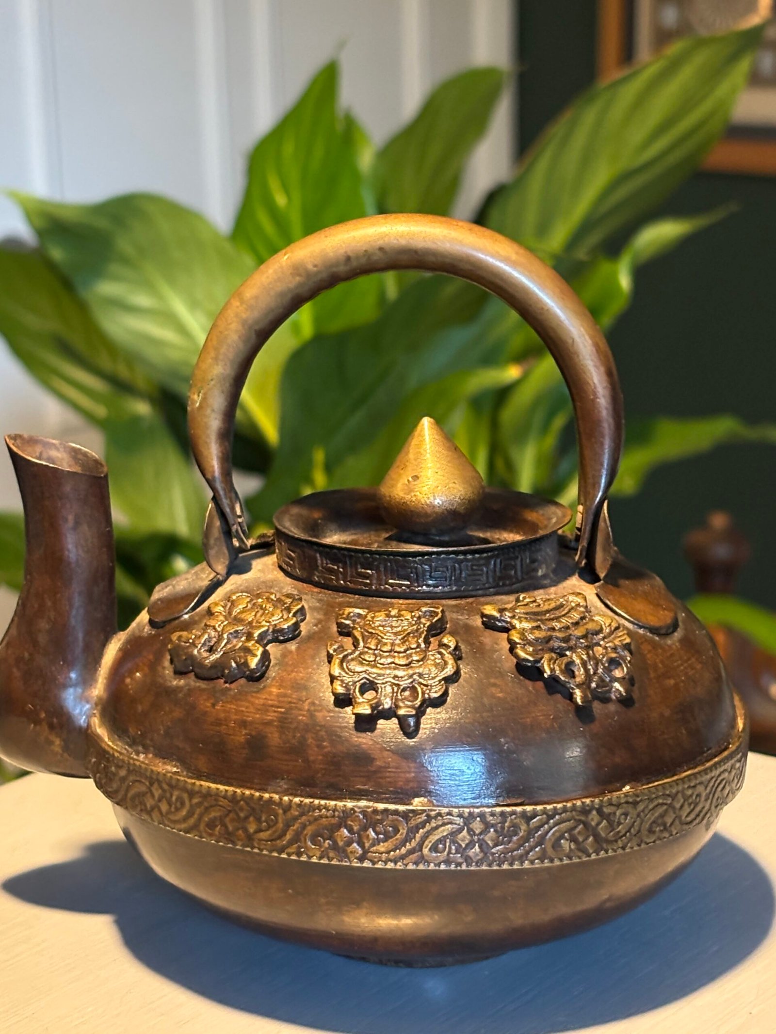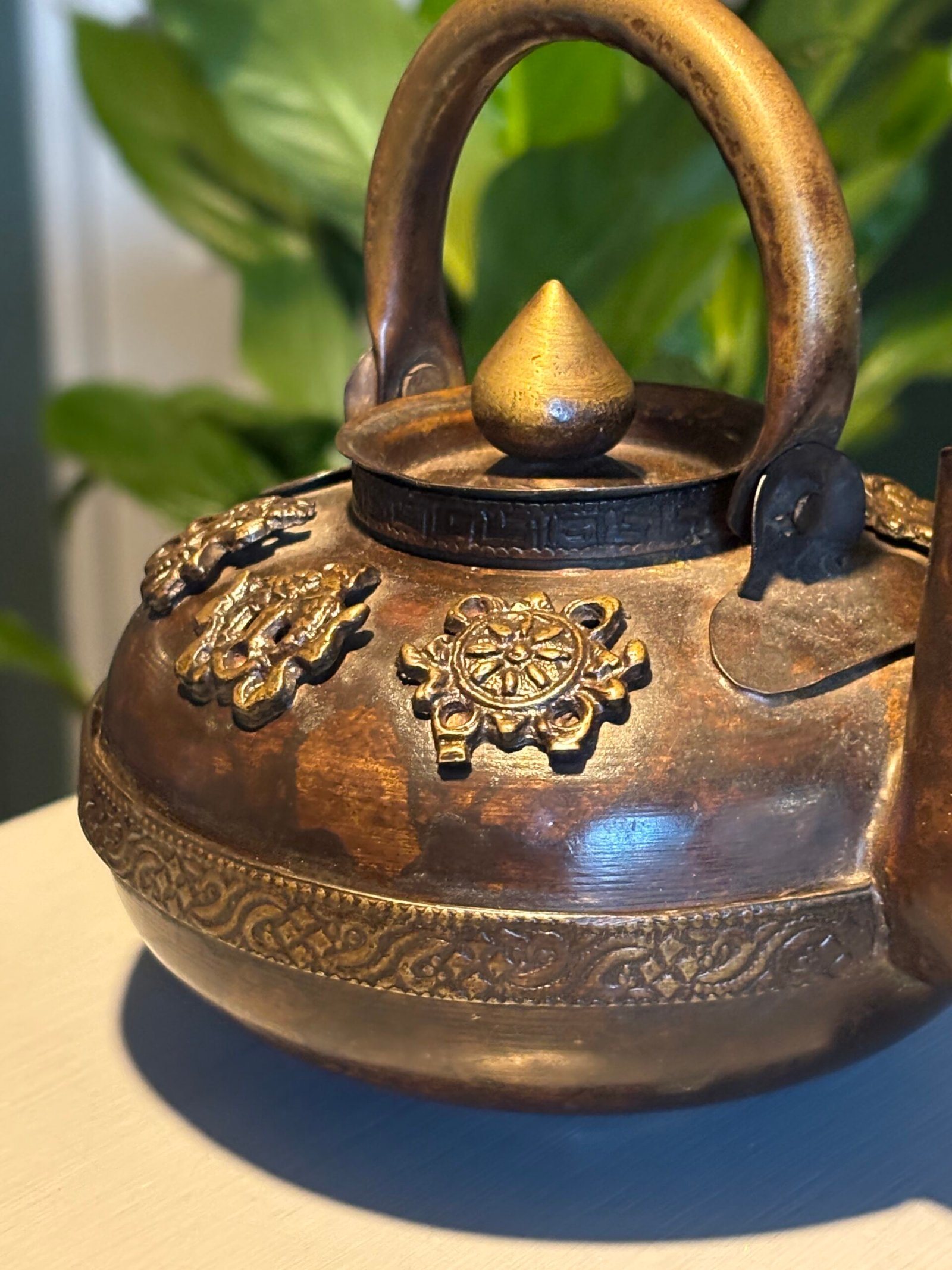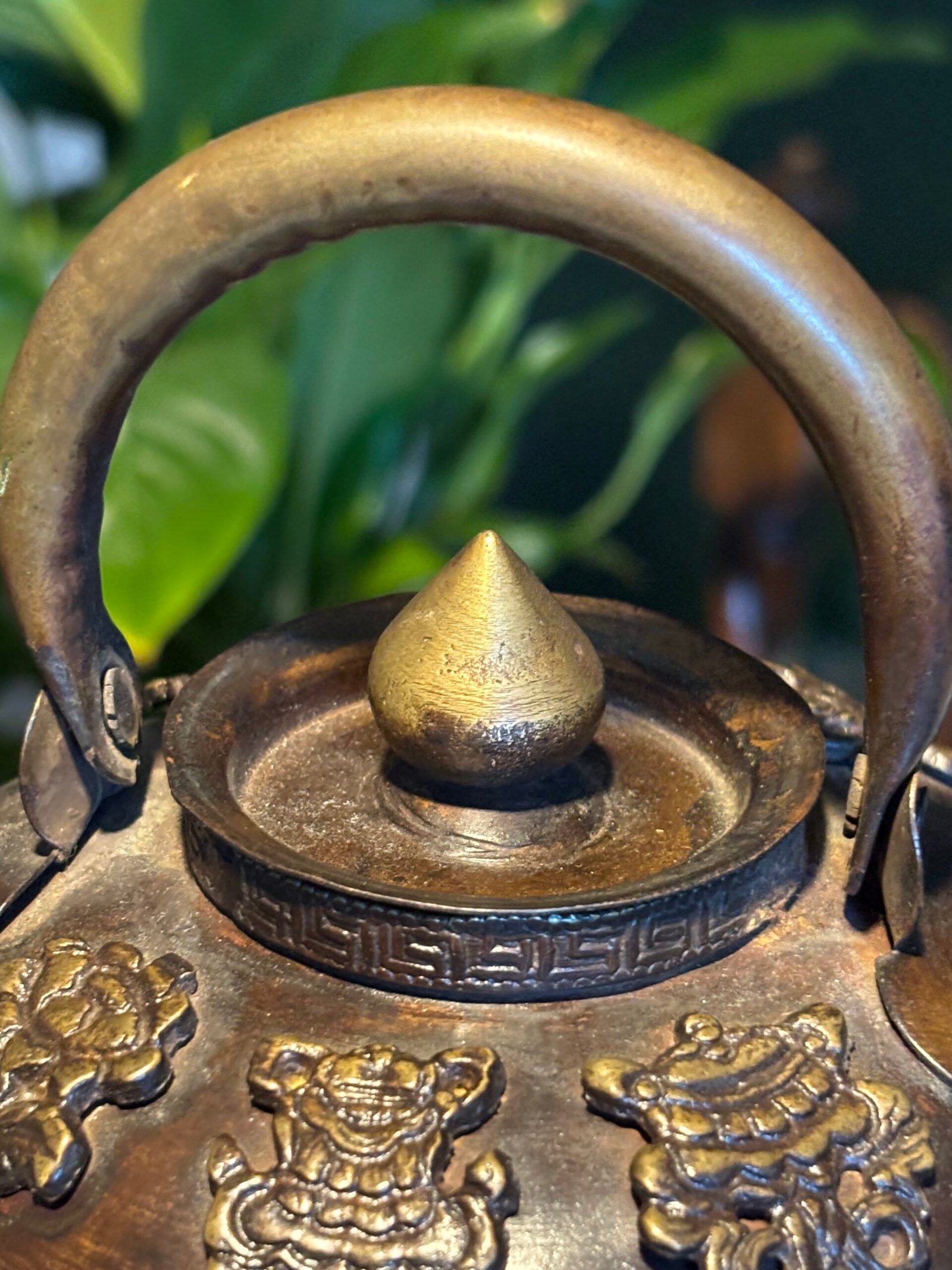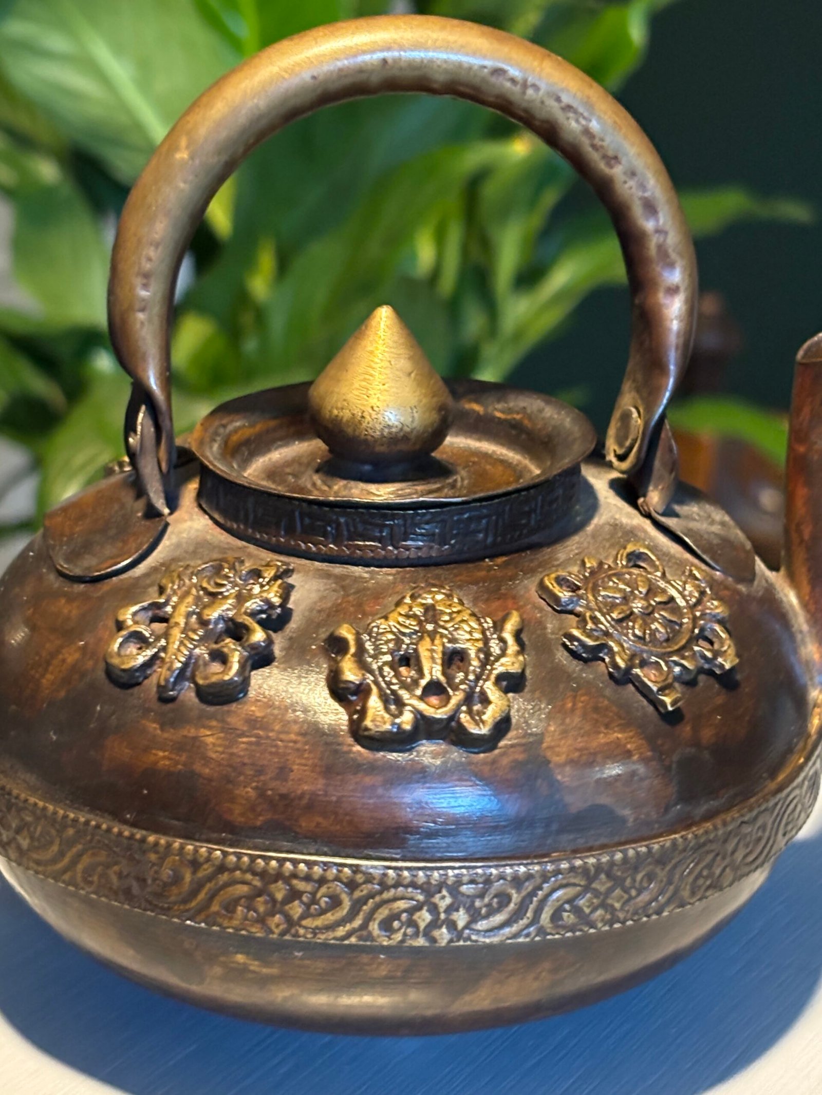 A Beautiful vintage Tibetan or Himalayan ceremonial teapot, possibly used for ritual or decorative purposes rather than for actual tea service, featuring raised Buddhist motifs.