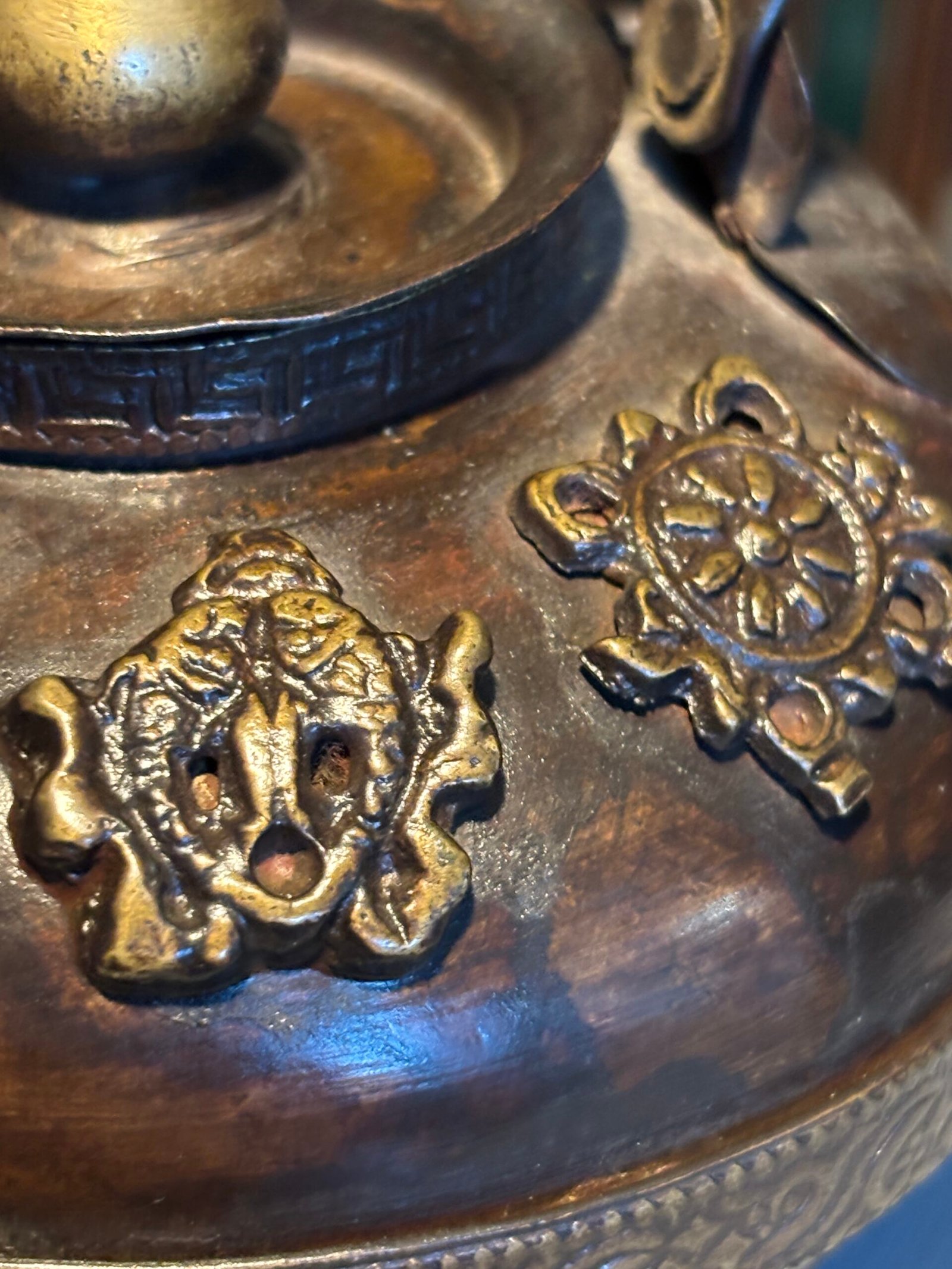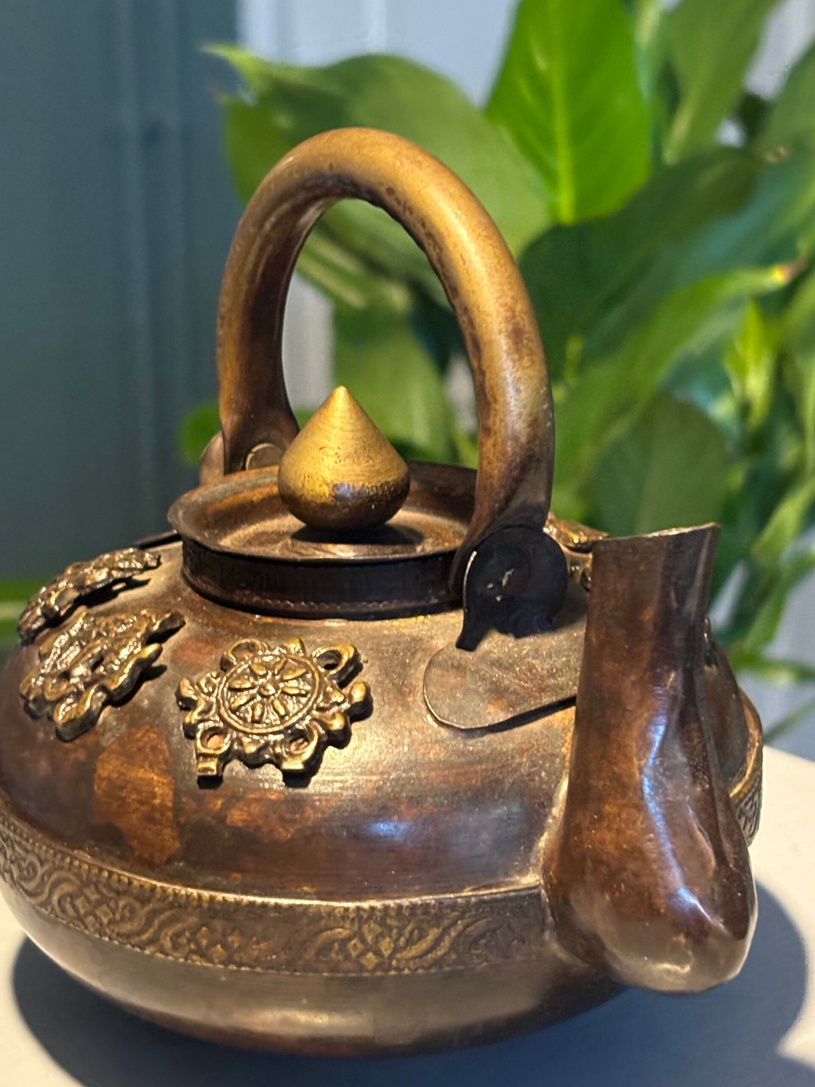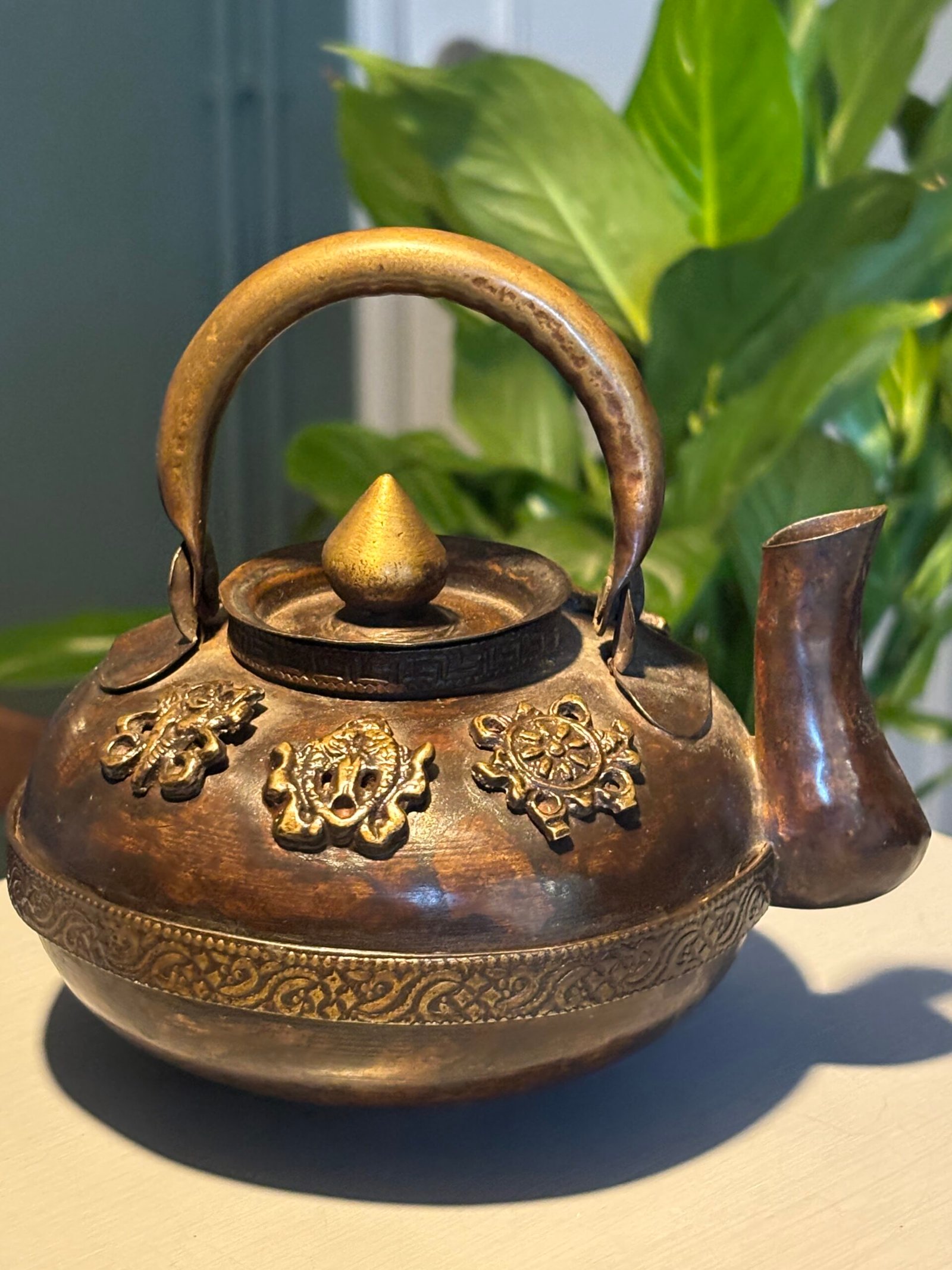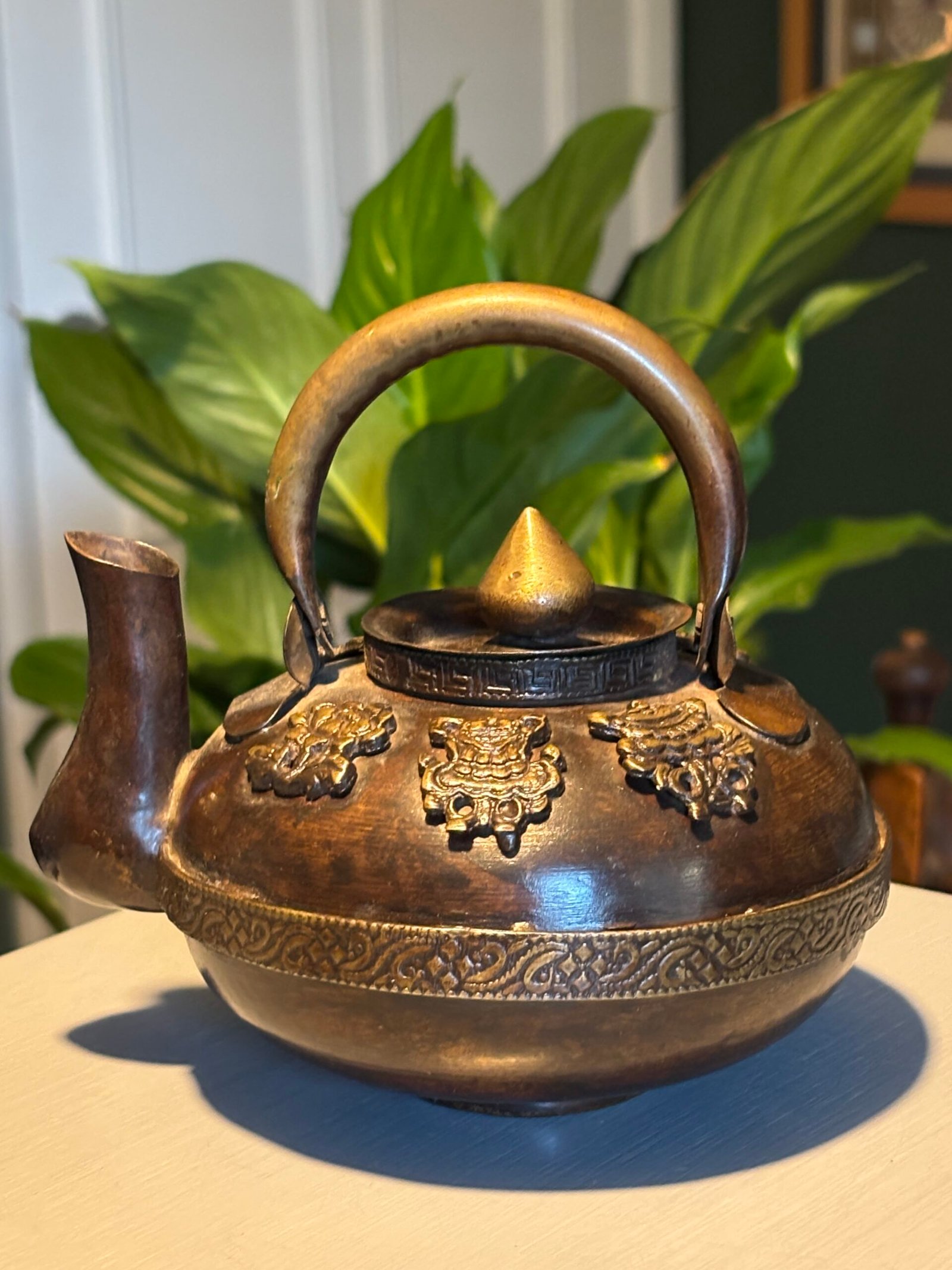 A Beautiful vintage Tibetan or Himalayan ceremonial teapot, possibly used for ritual or decorative purposes rather than for actual tea service, featuring raised Buddhist motifs.