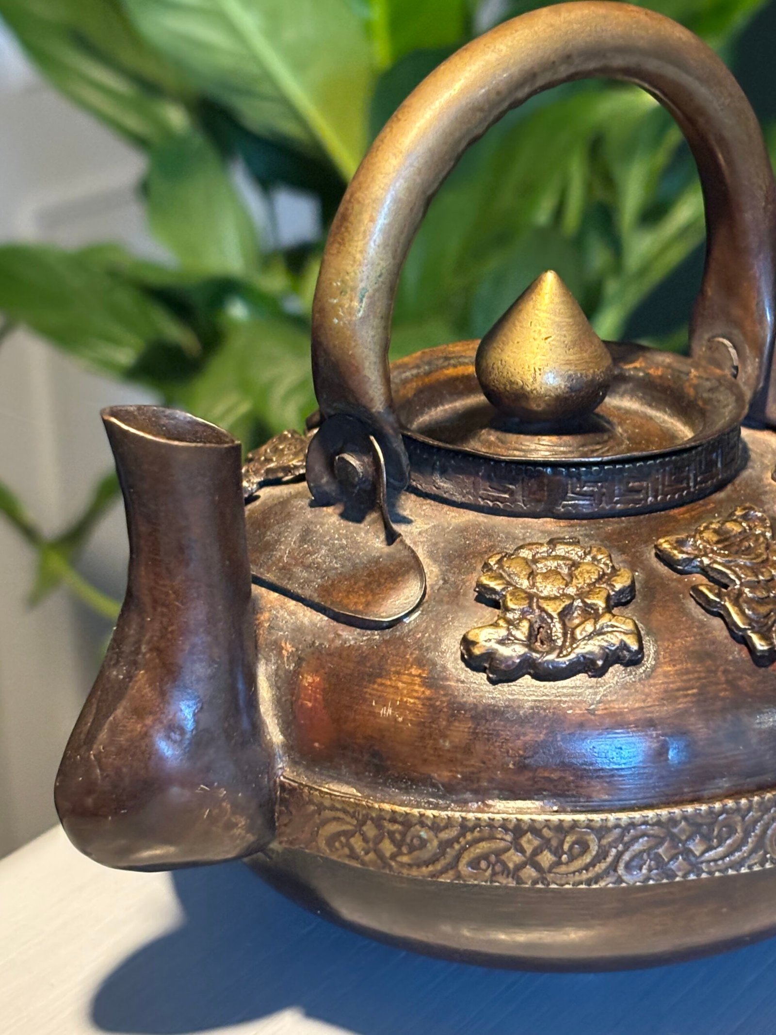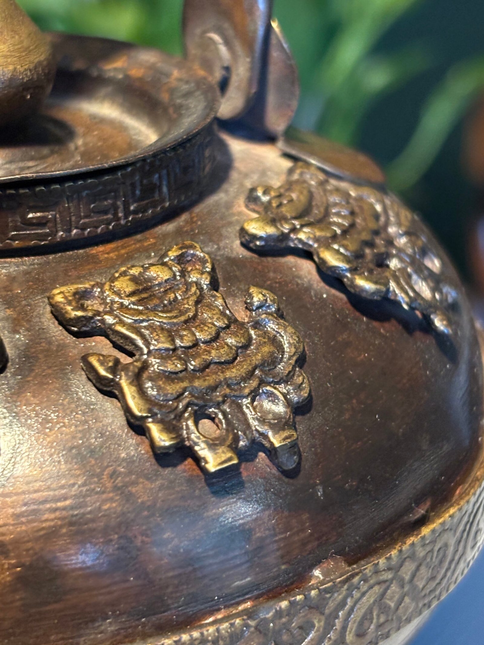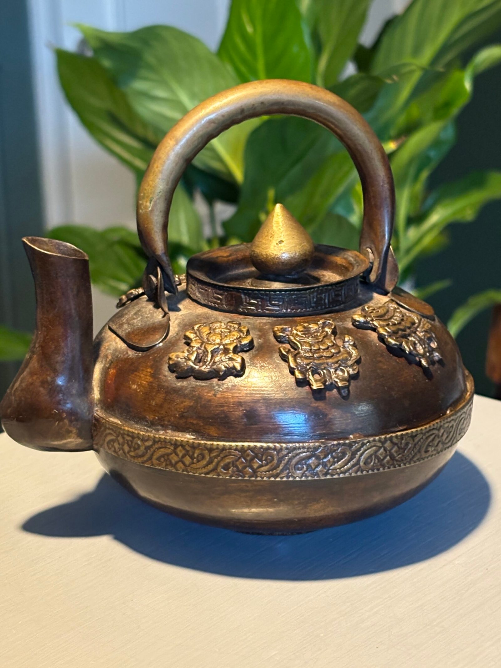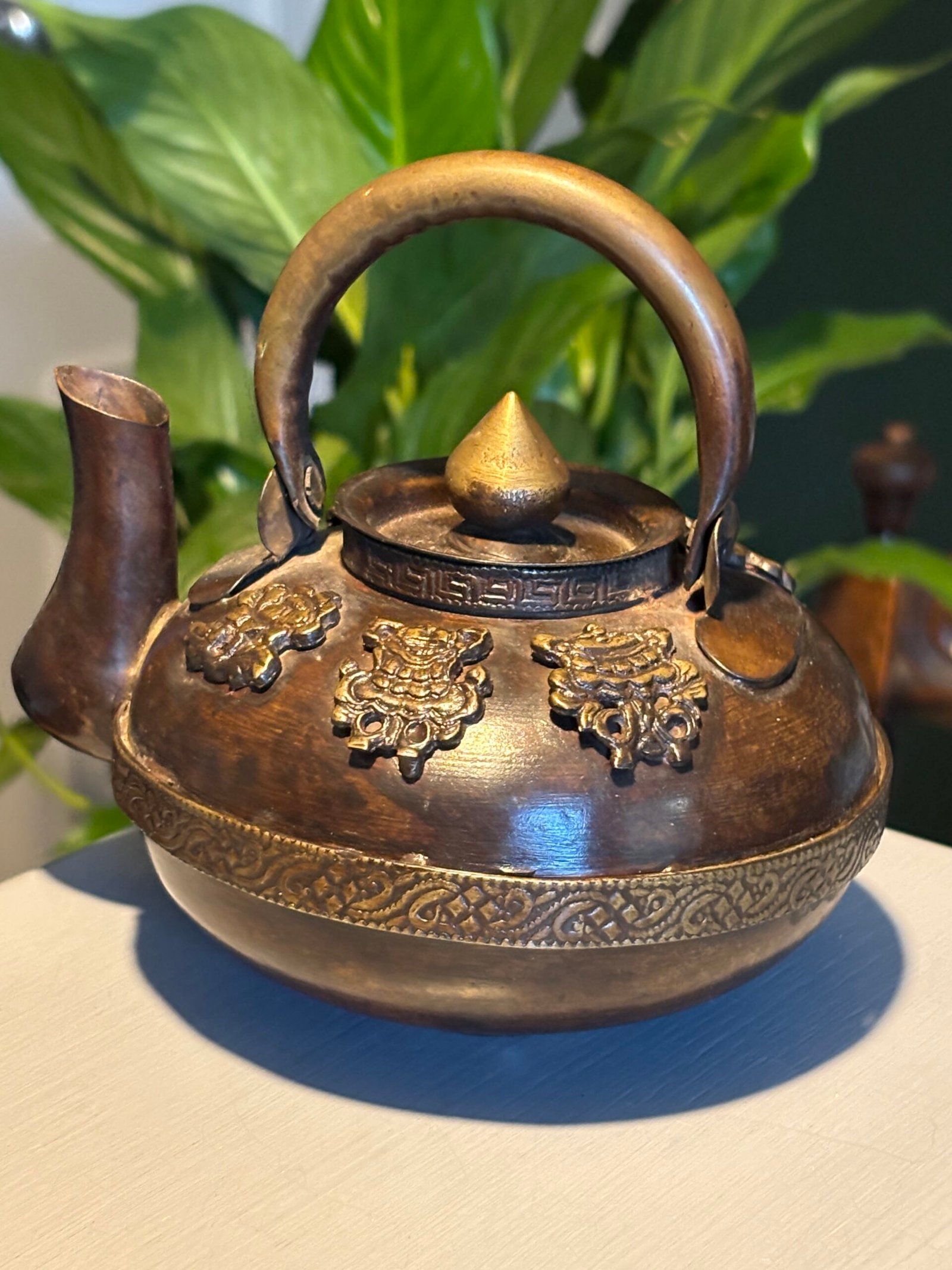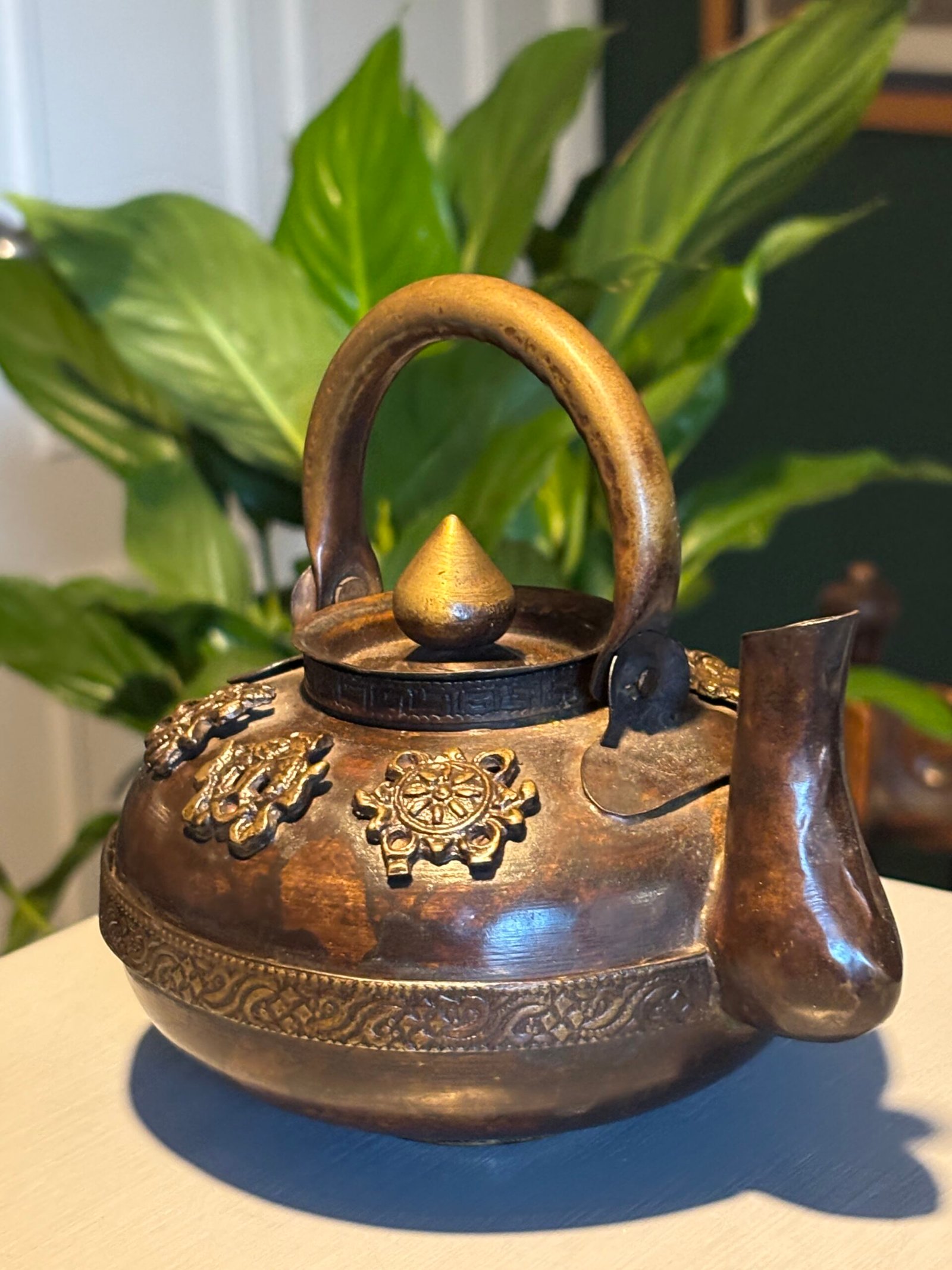 A Beautiful vintage Tibetan or Himalayan ceremonial teapot, possibly used for ritual or decorative purposes rather than for actual tea service, featuring raised Buddhist motifs.