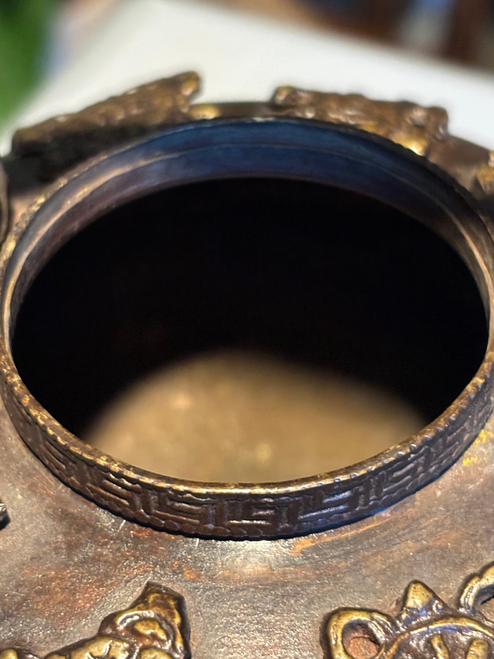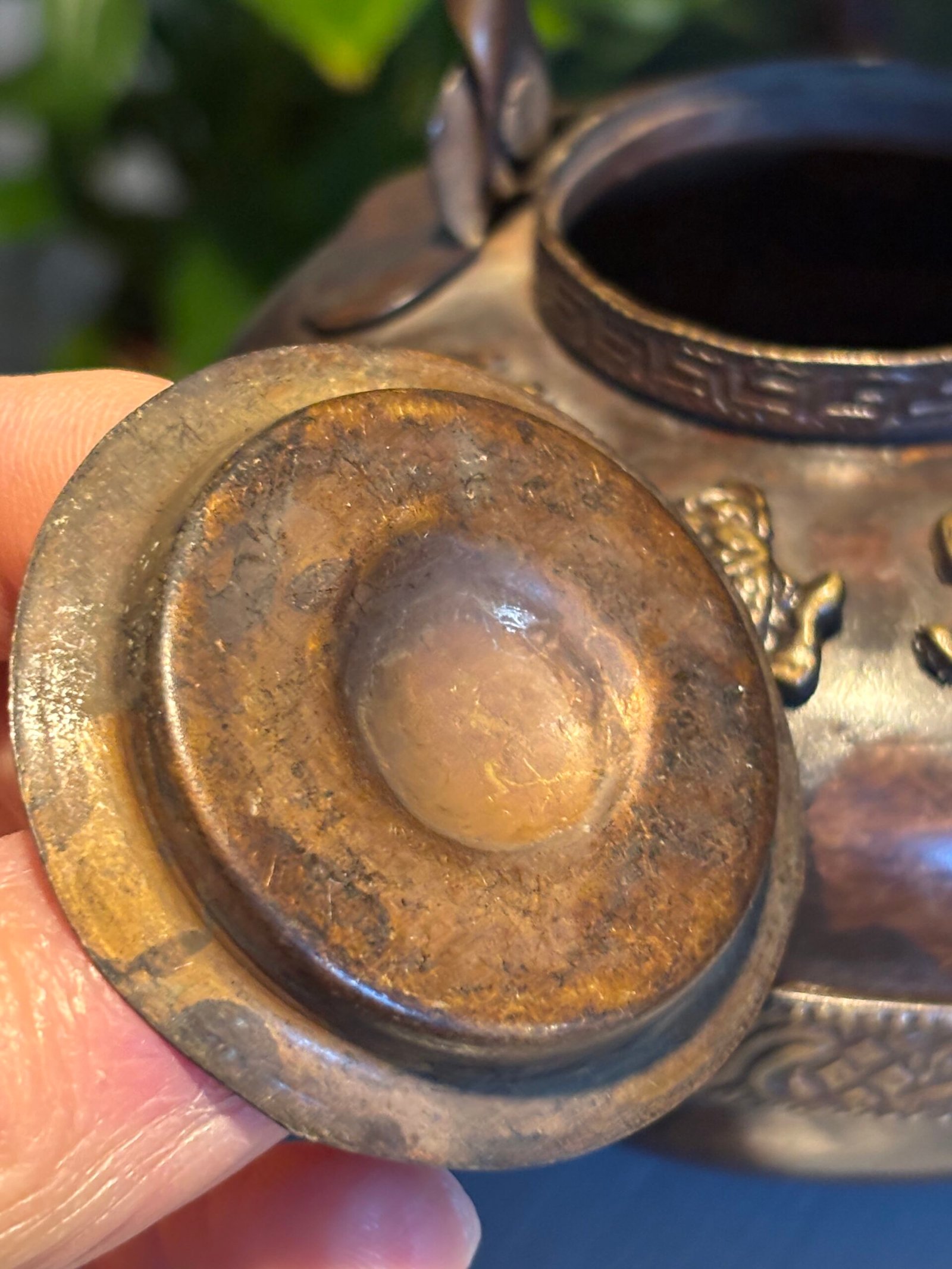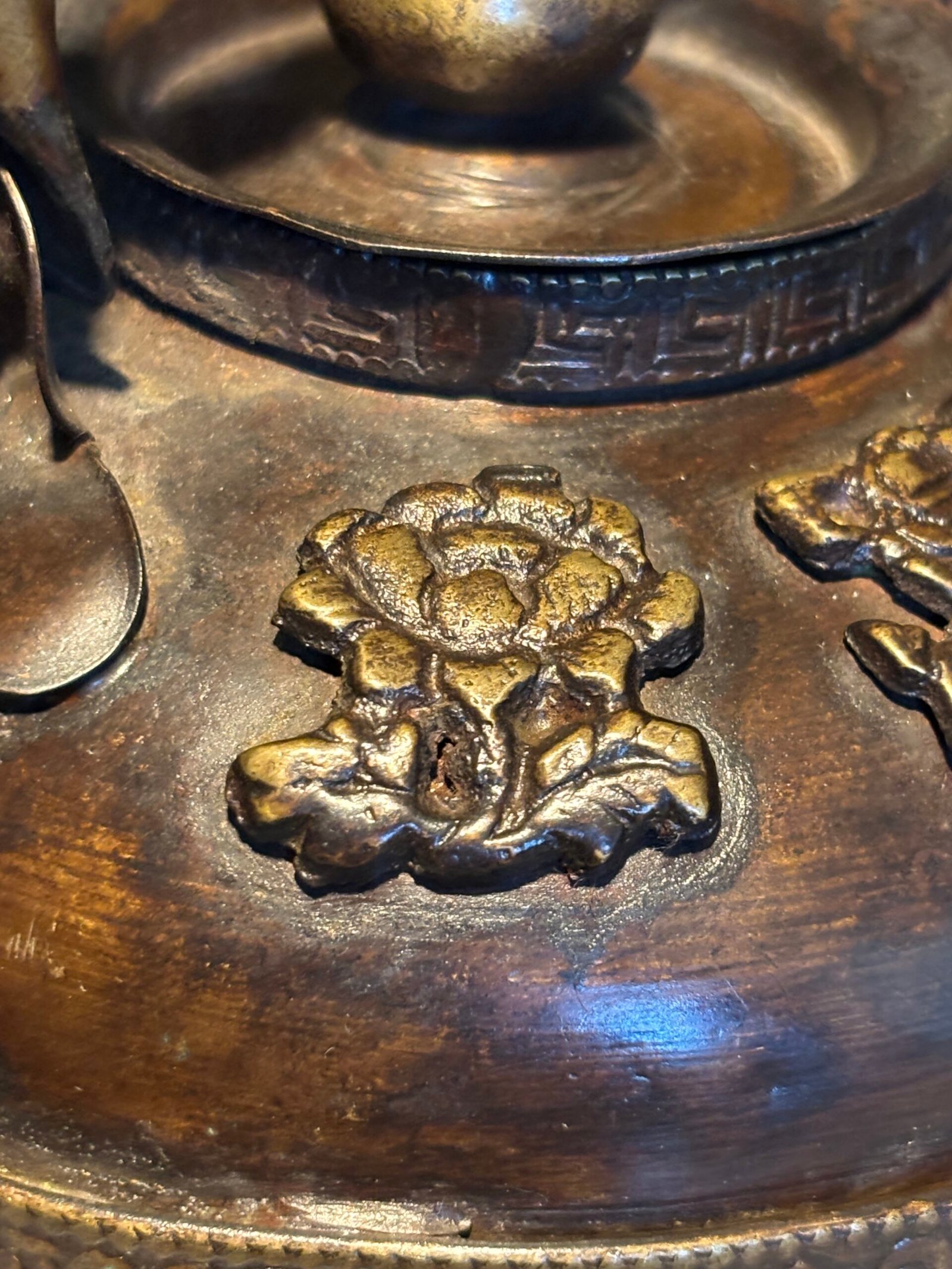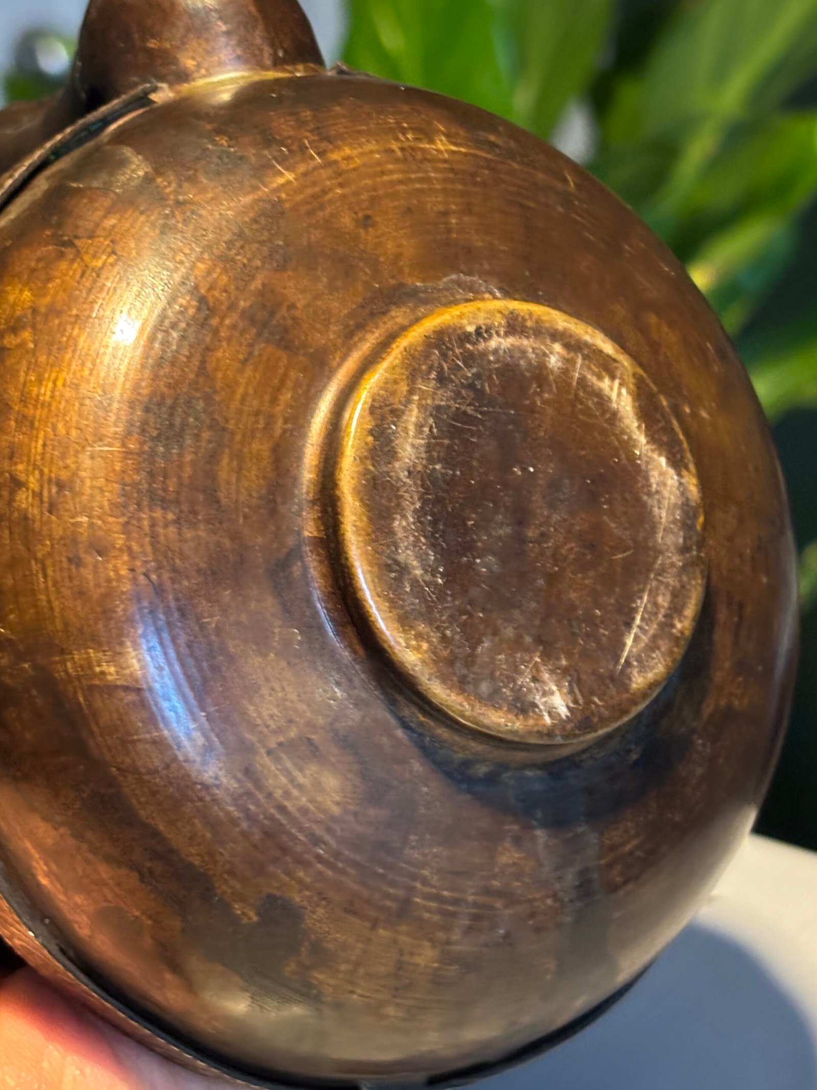 A Beautiful vintage Tibetan or Himalayan ceremonial teapot, possibly used for ritual or decorative purposes rather than for actual tea service, featuring raised Buddhist motifs.