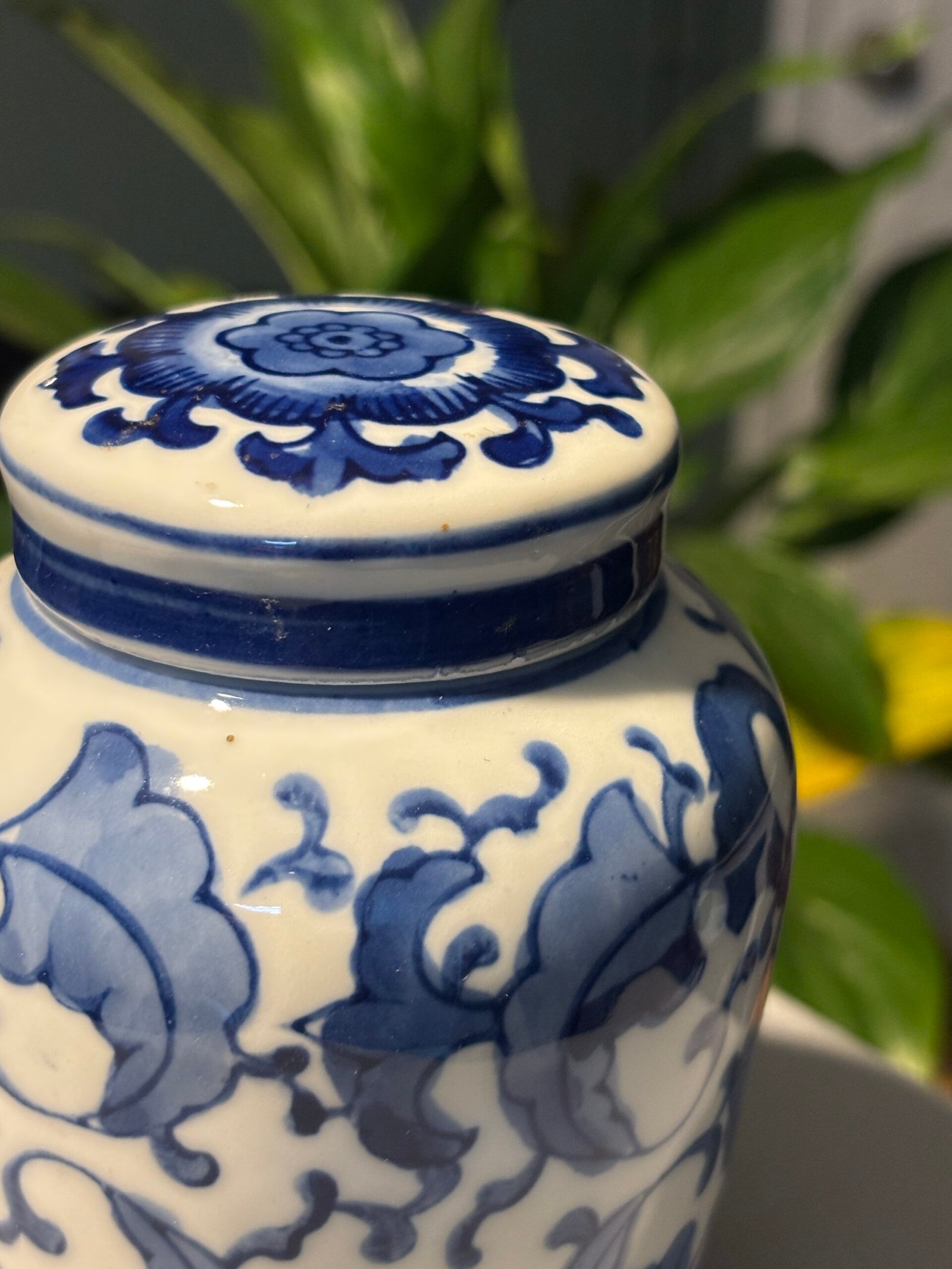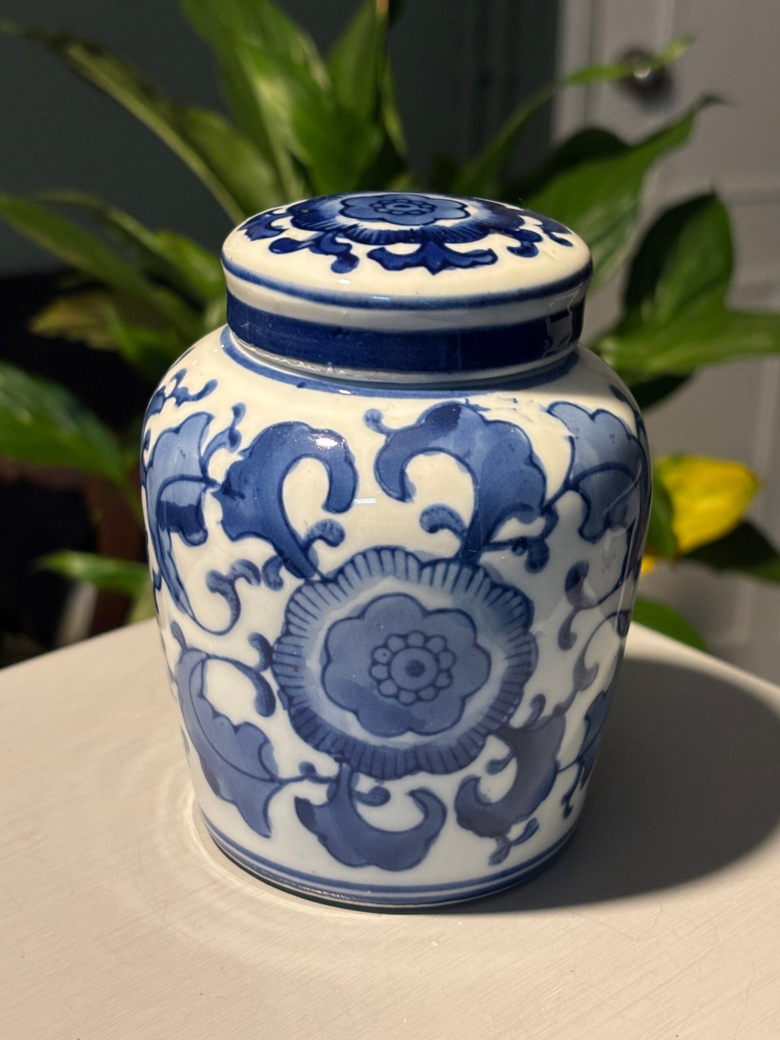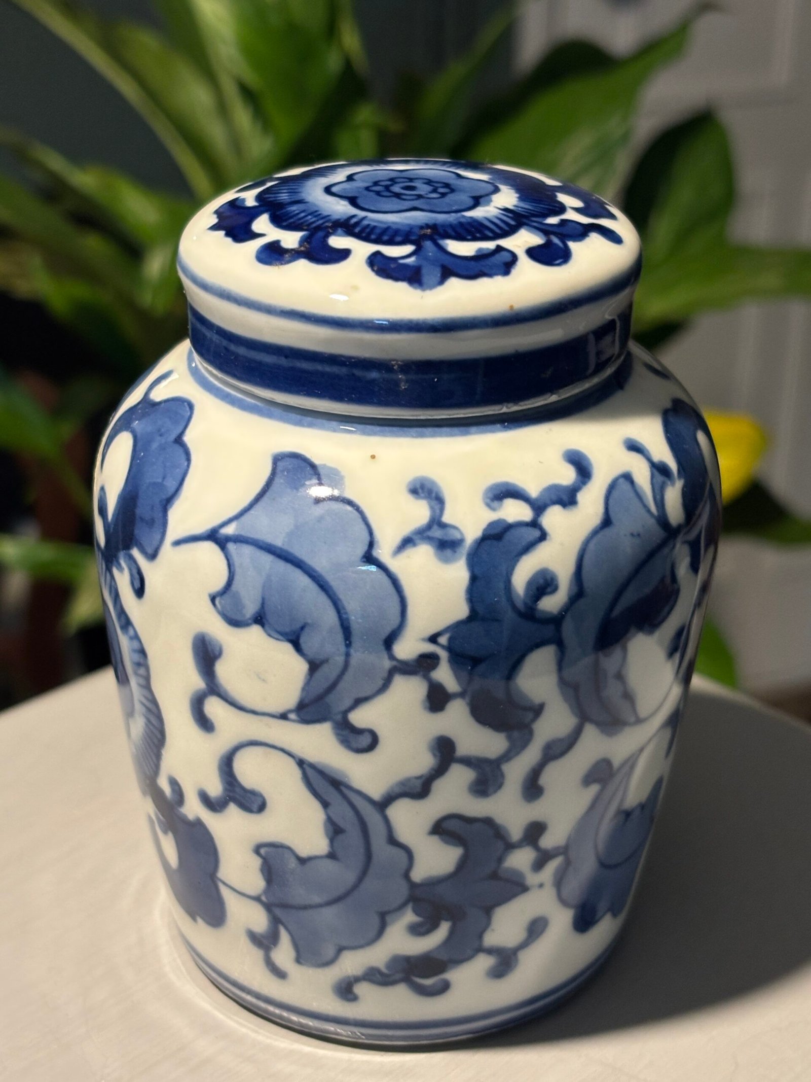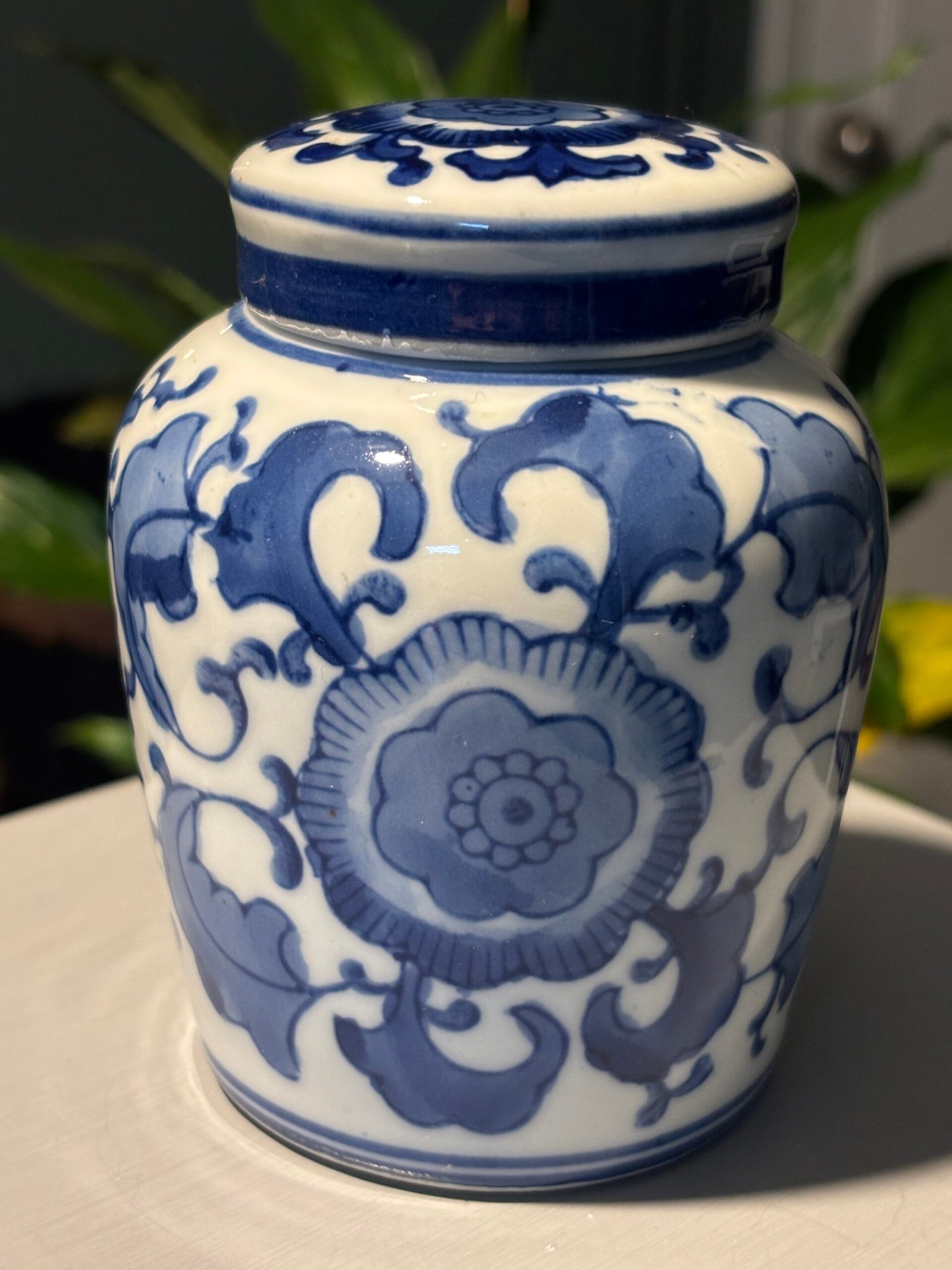 A beautiful Vintage Chinese porcelain lidded, blue and white ginger jar with flower and leaf motifs. Please see photos for condition.