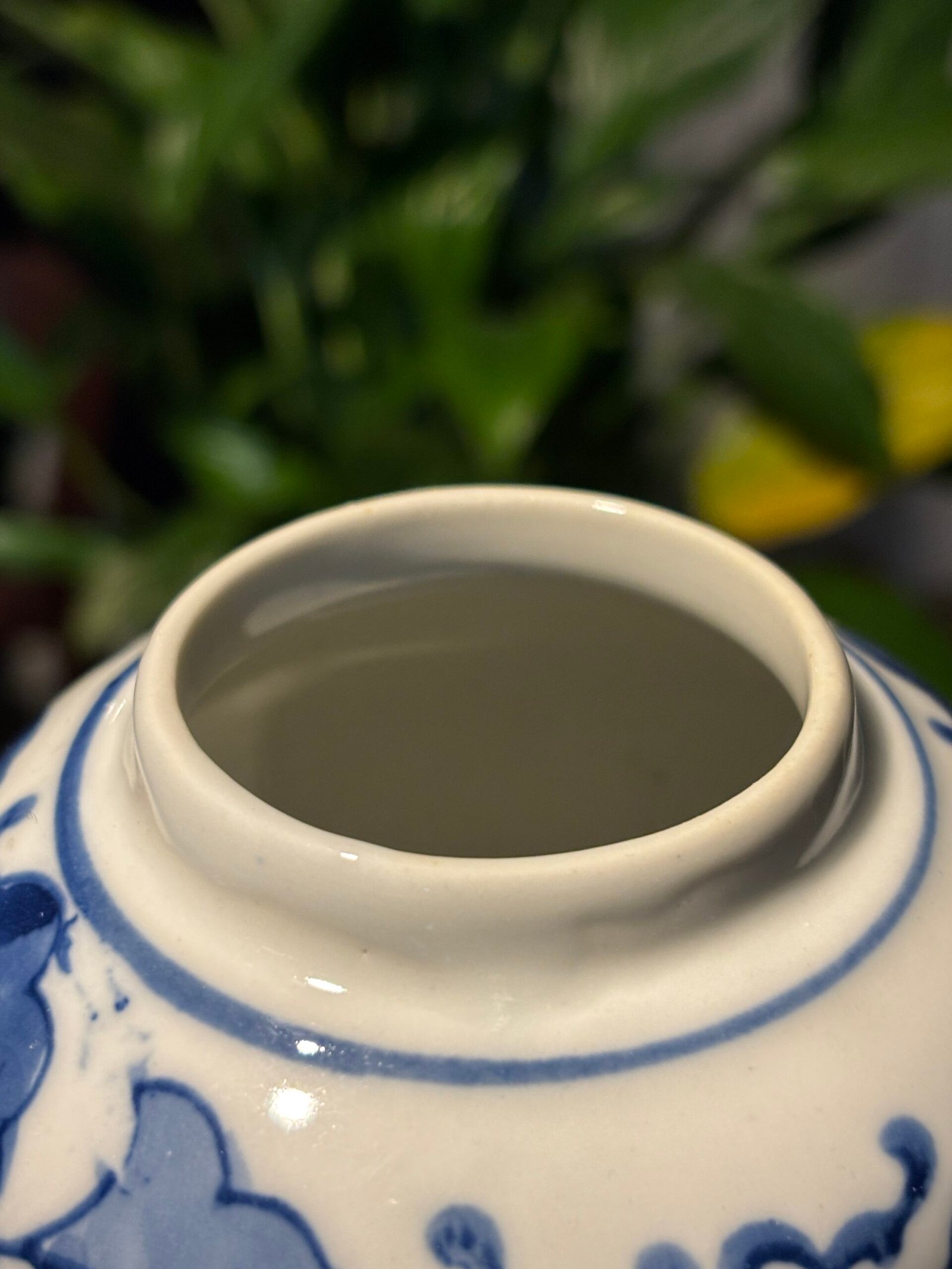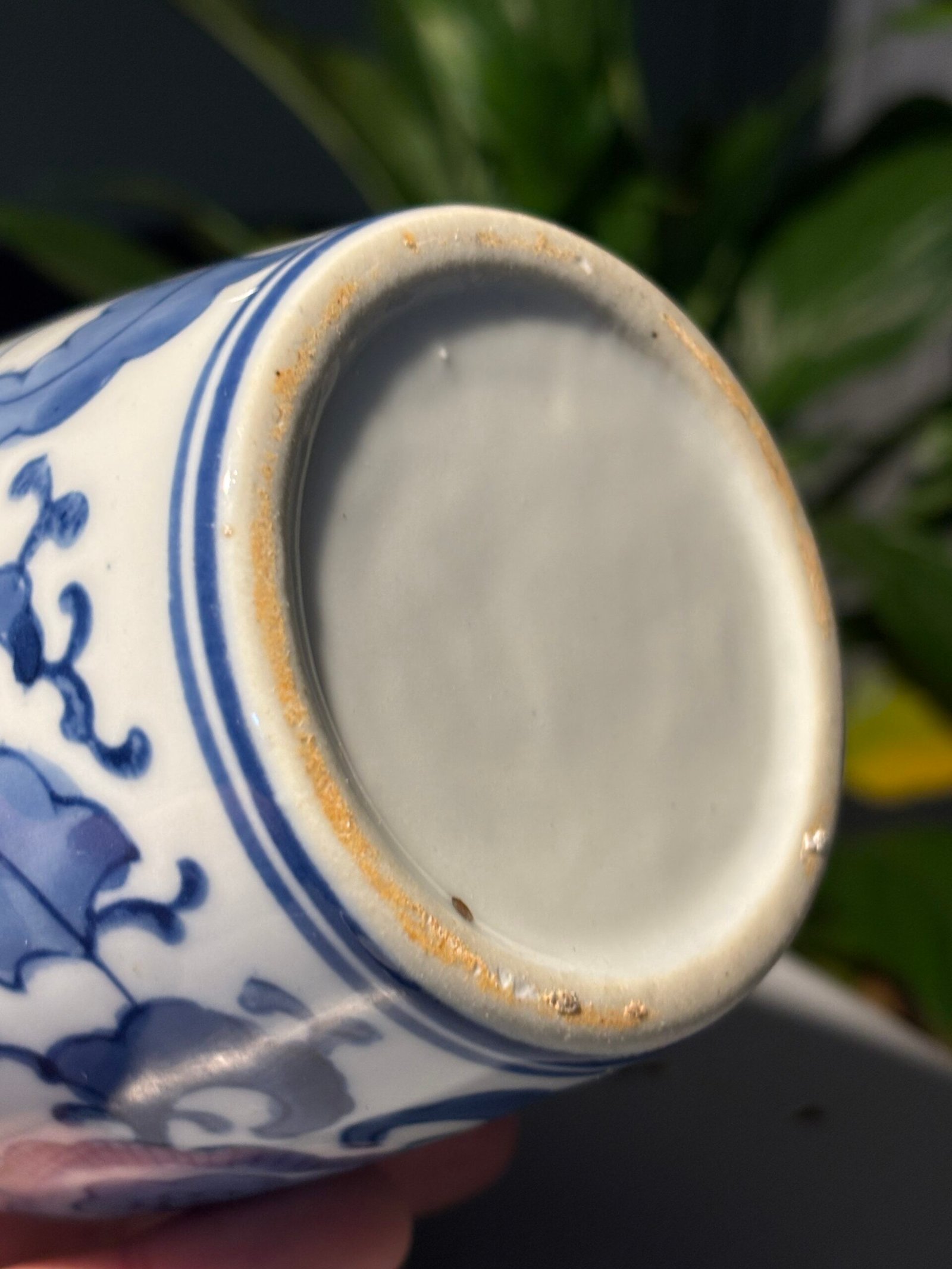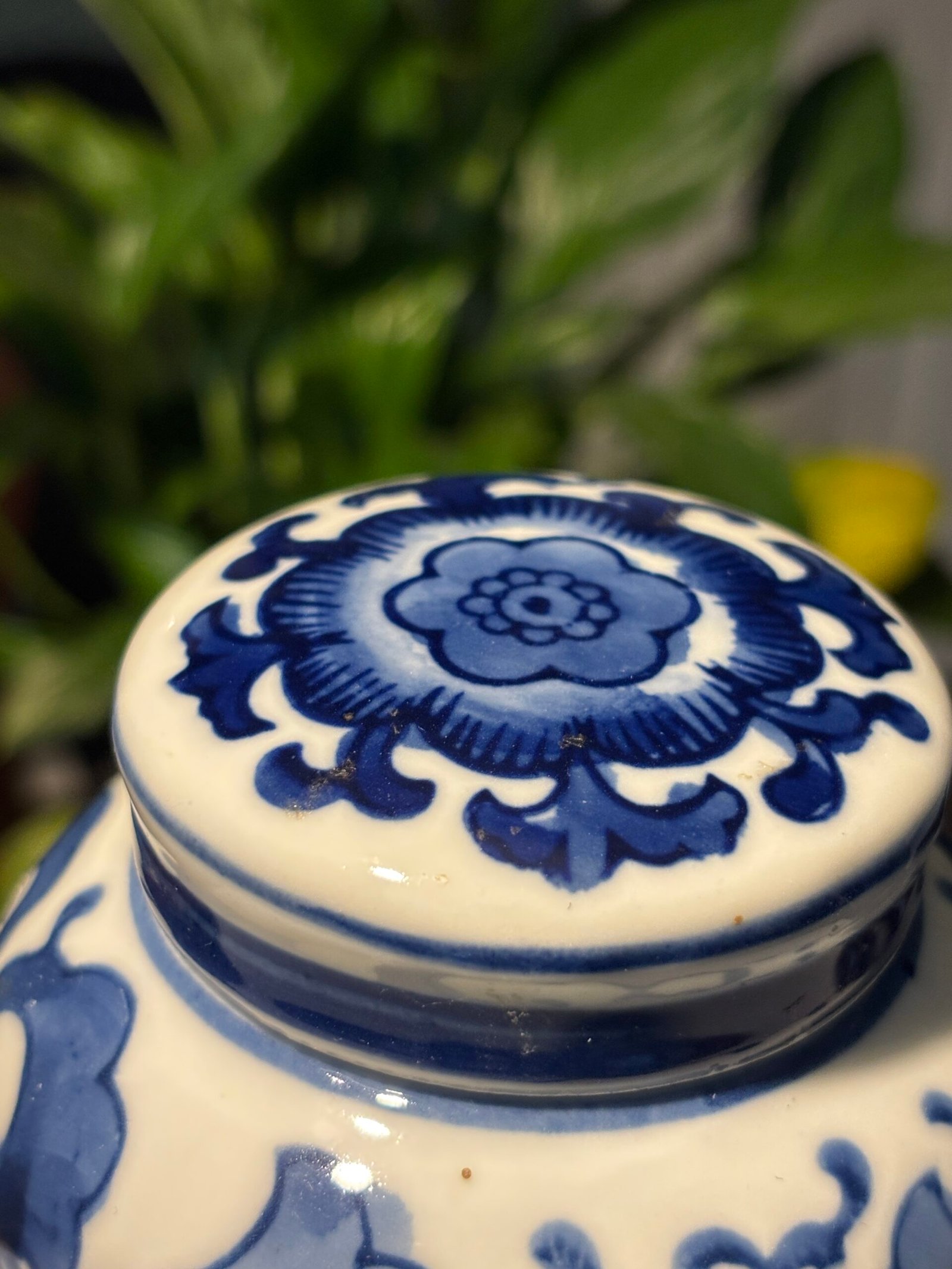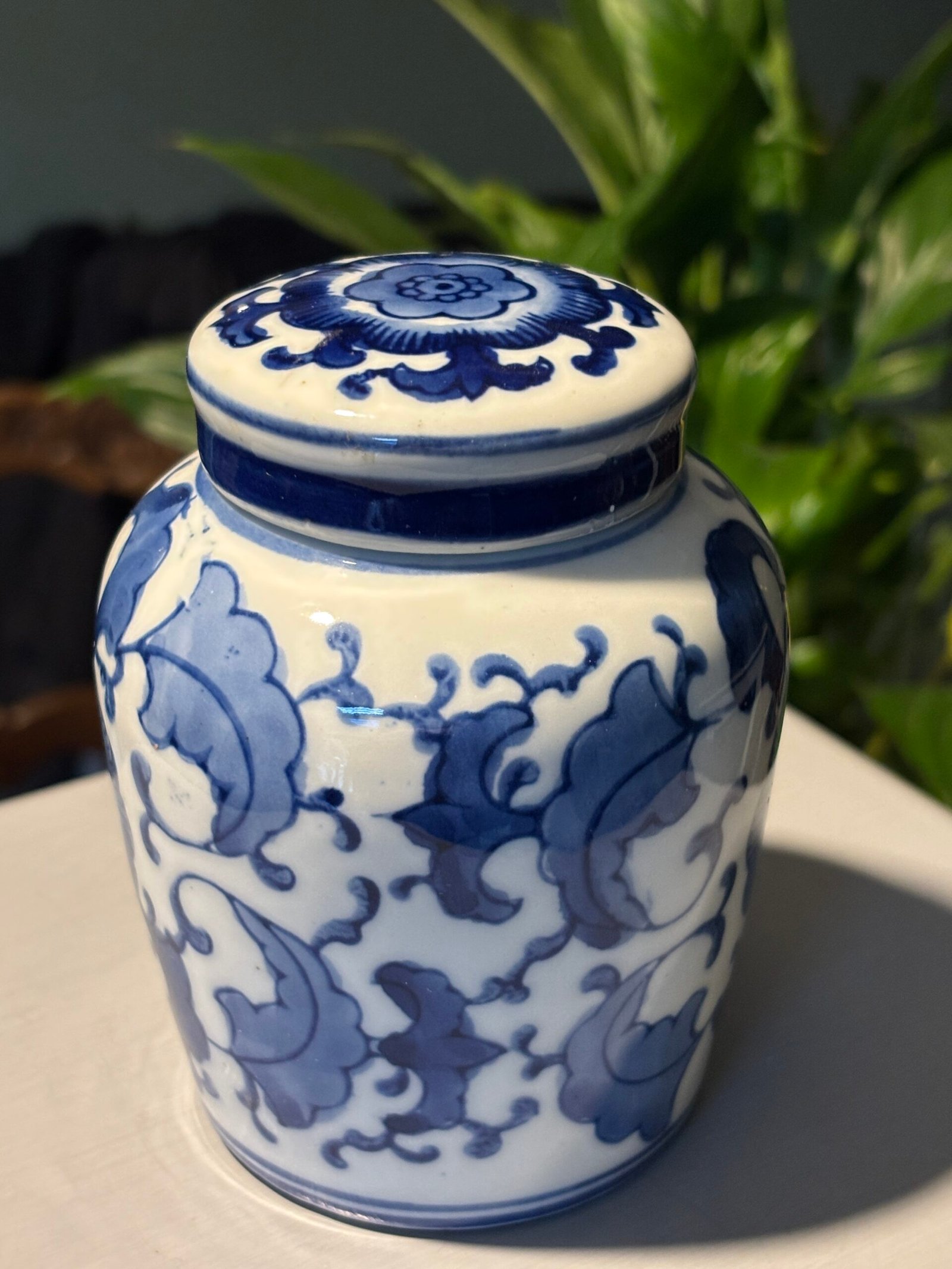 A beautiful Vintage Chinese porcelain lidded, blue and white ginger jar with flower and leaf motifs. Please see photos for condition.