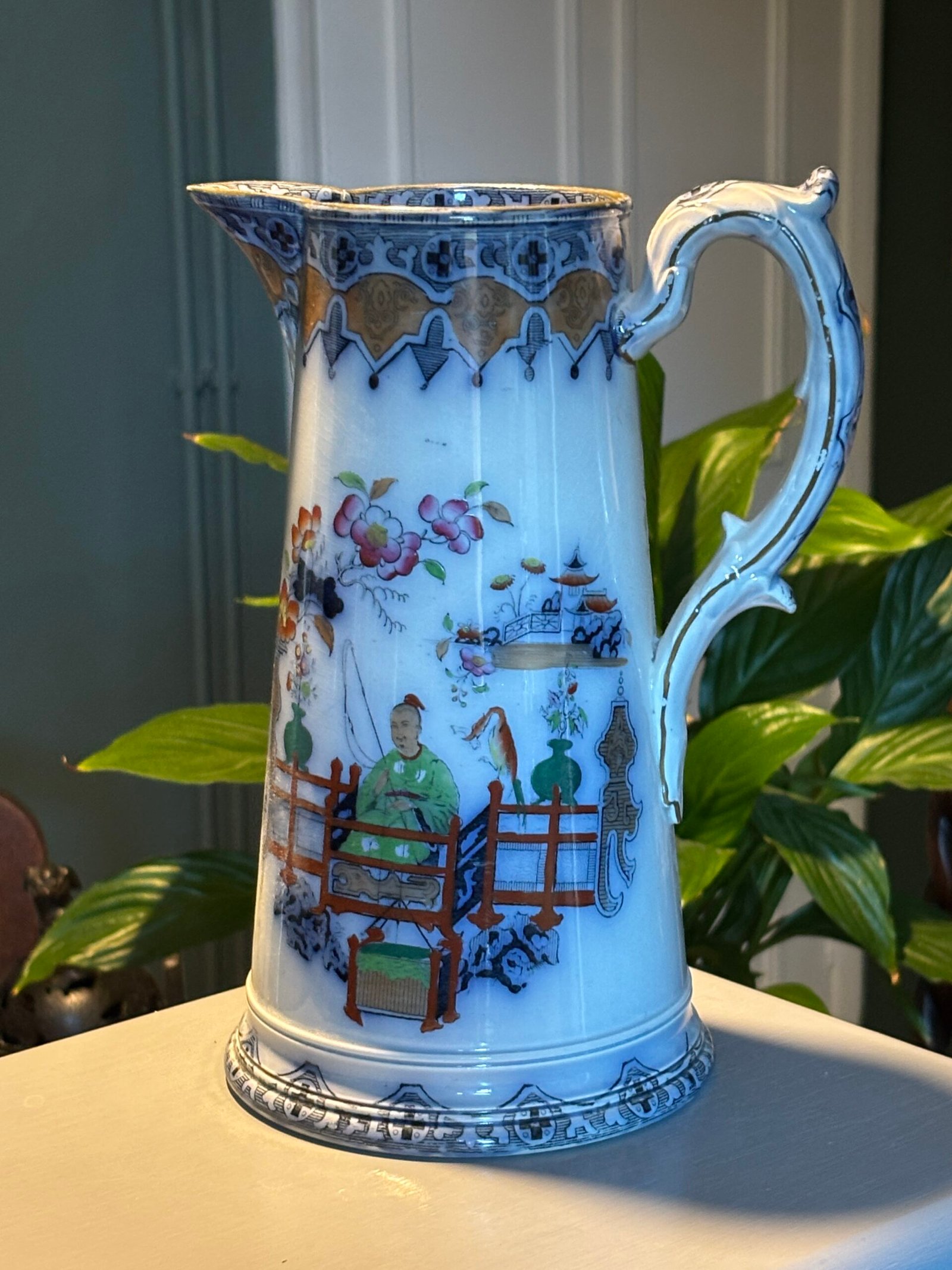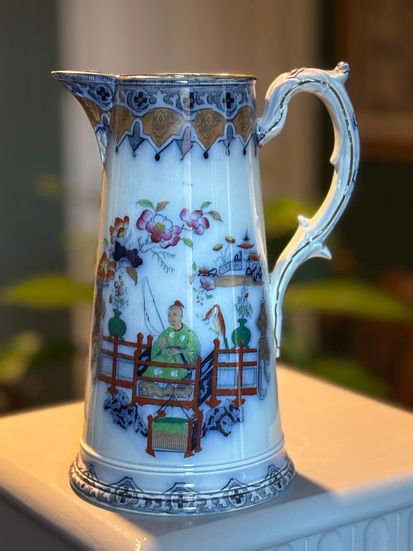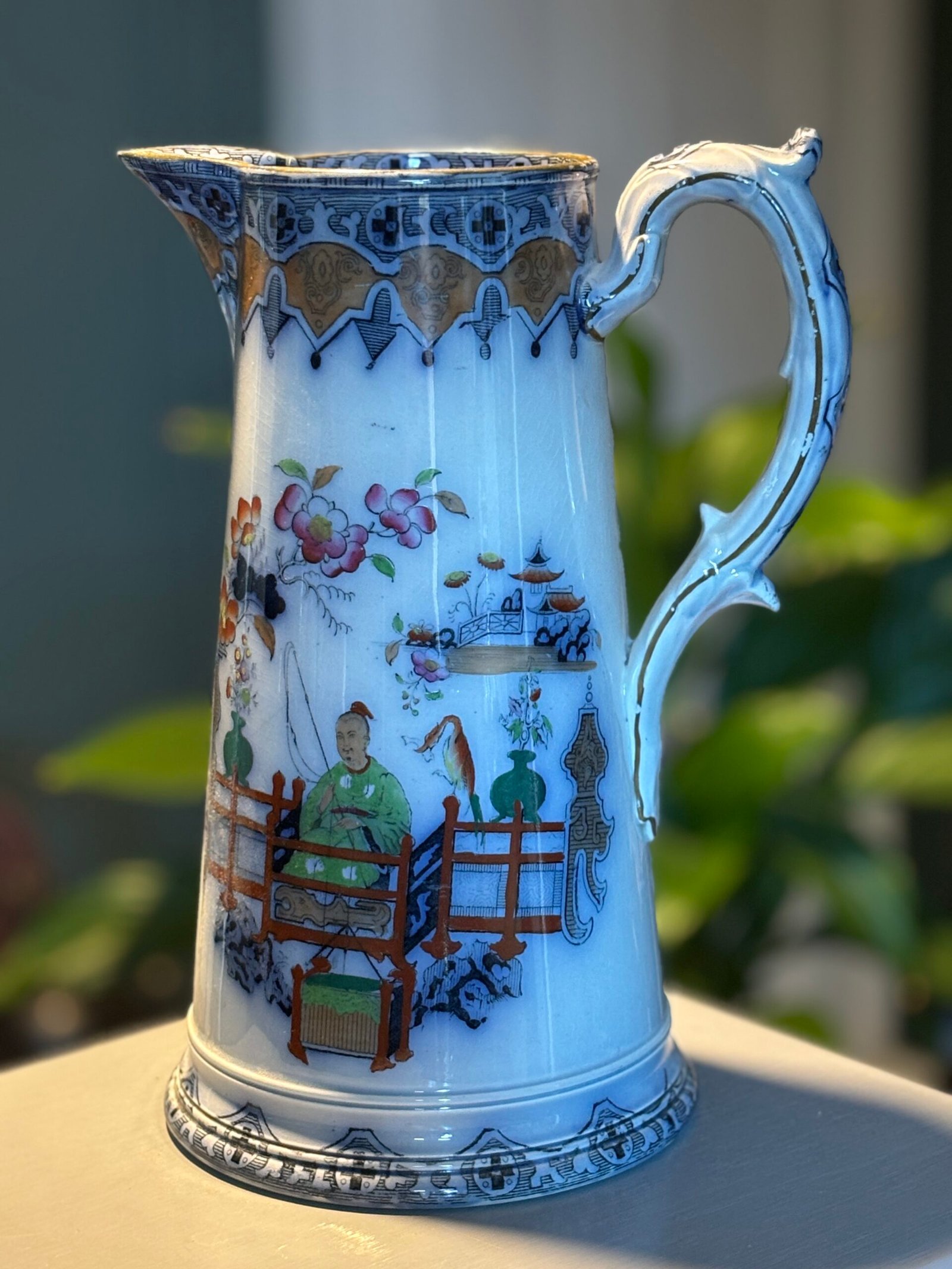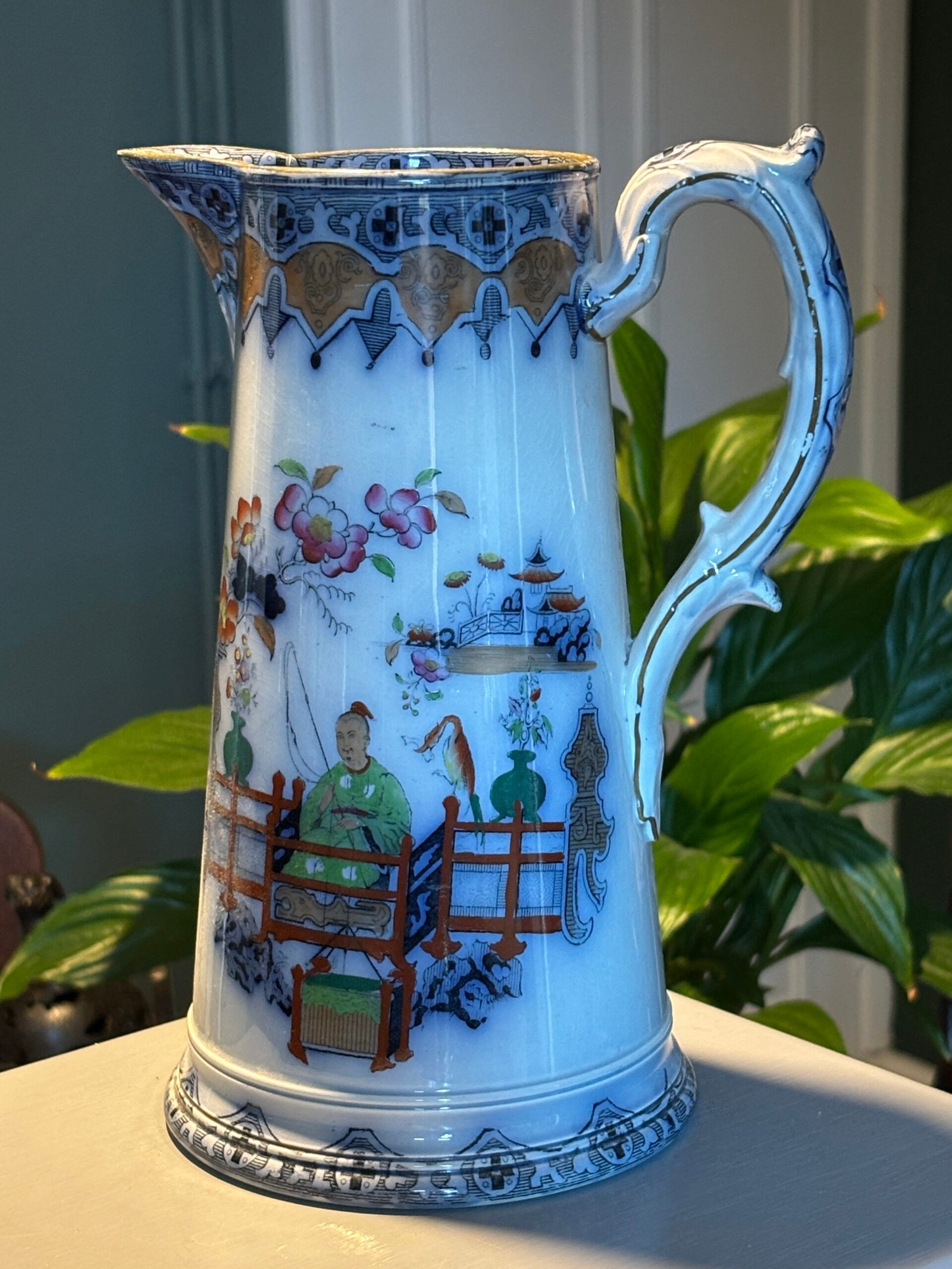 A stunning Victorian antique ceramic jug featuring a highly detailed Chinoiserie scene.
