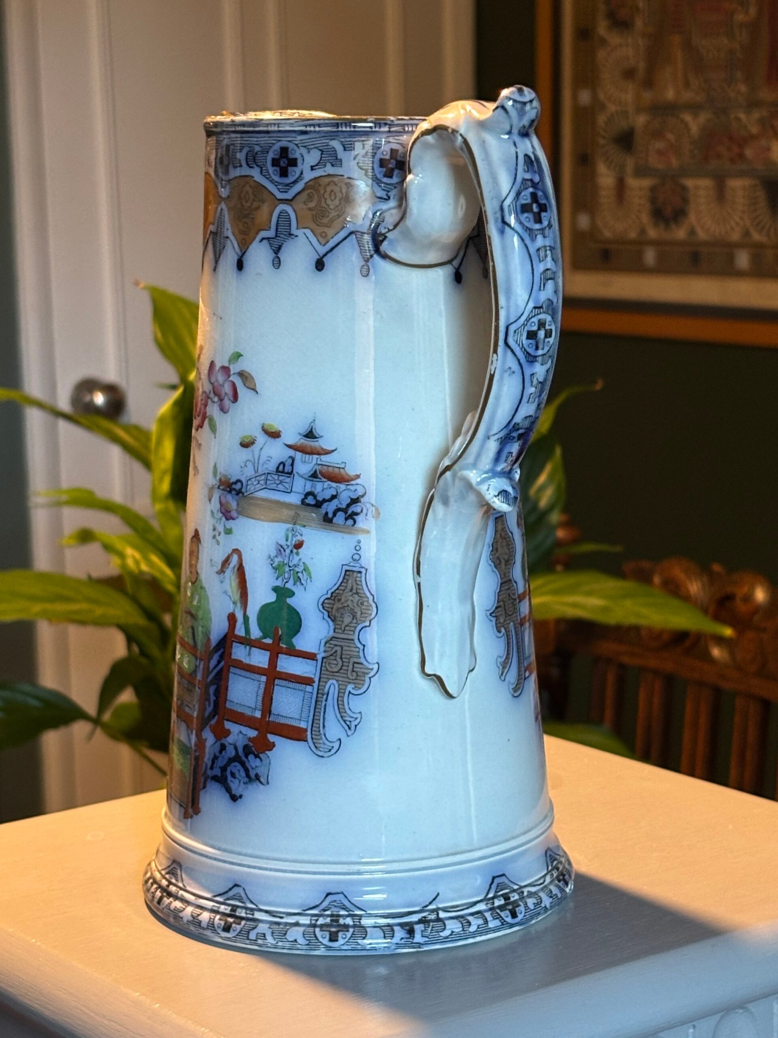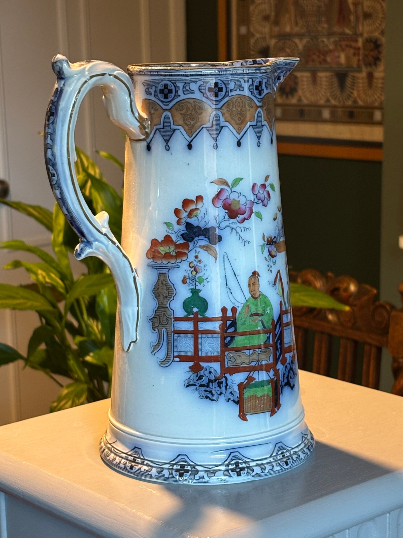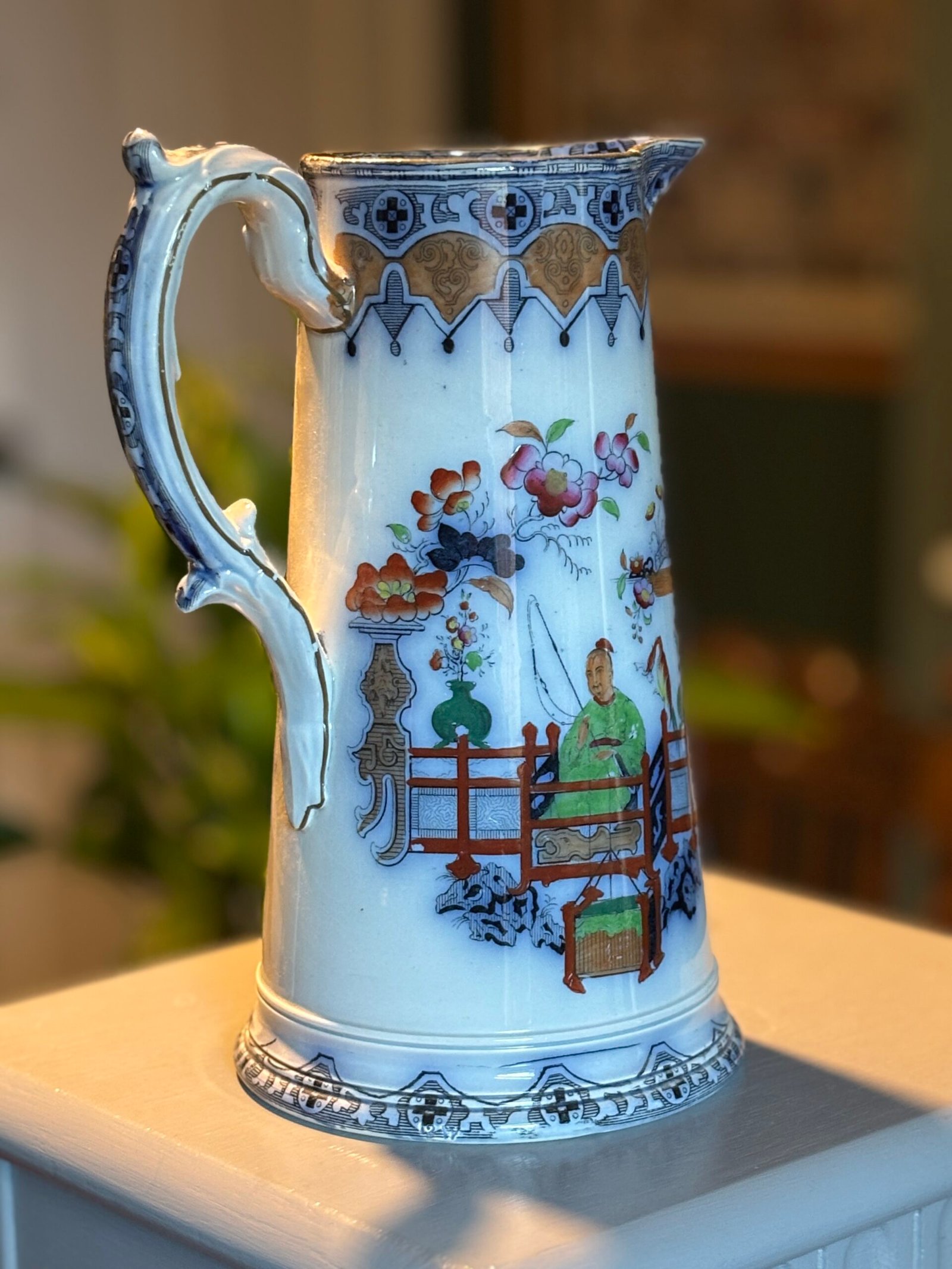 A stunning Victorian antique ceramic jug featuring a highly detailed Chinoiserie scene.