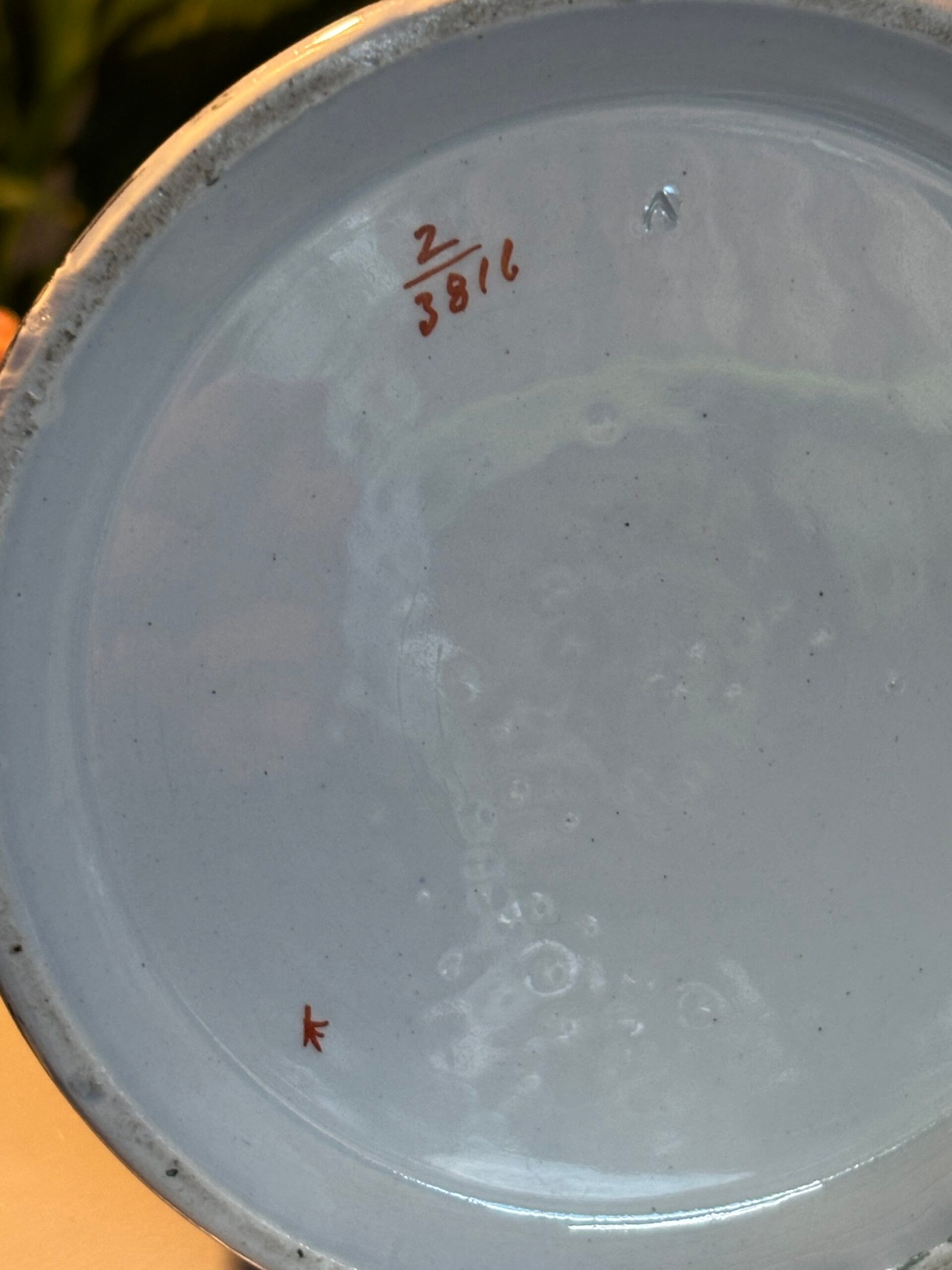 The piece is finished with a sophisticated geometric border in blue and ochre, accented by delicate hand-gilded detailing on the rim and the elaborate, rococo-style scrolling handle. Please see photos for condition.
