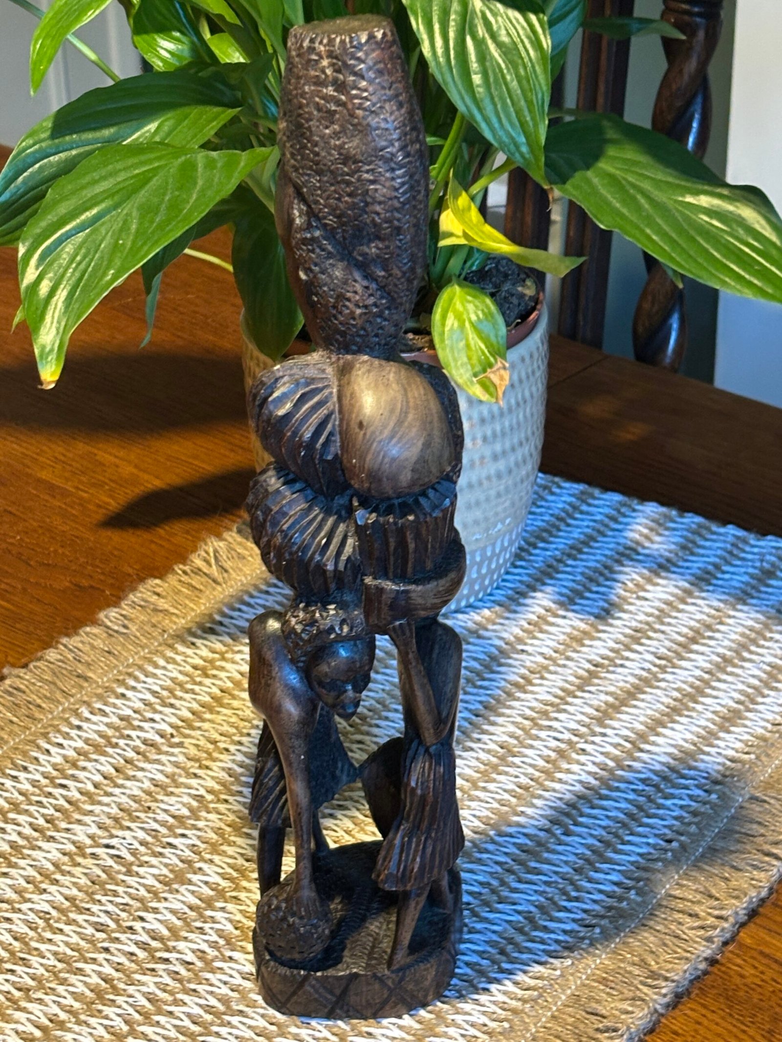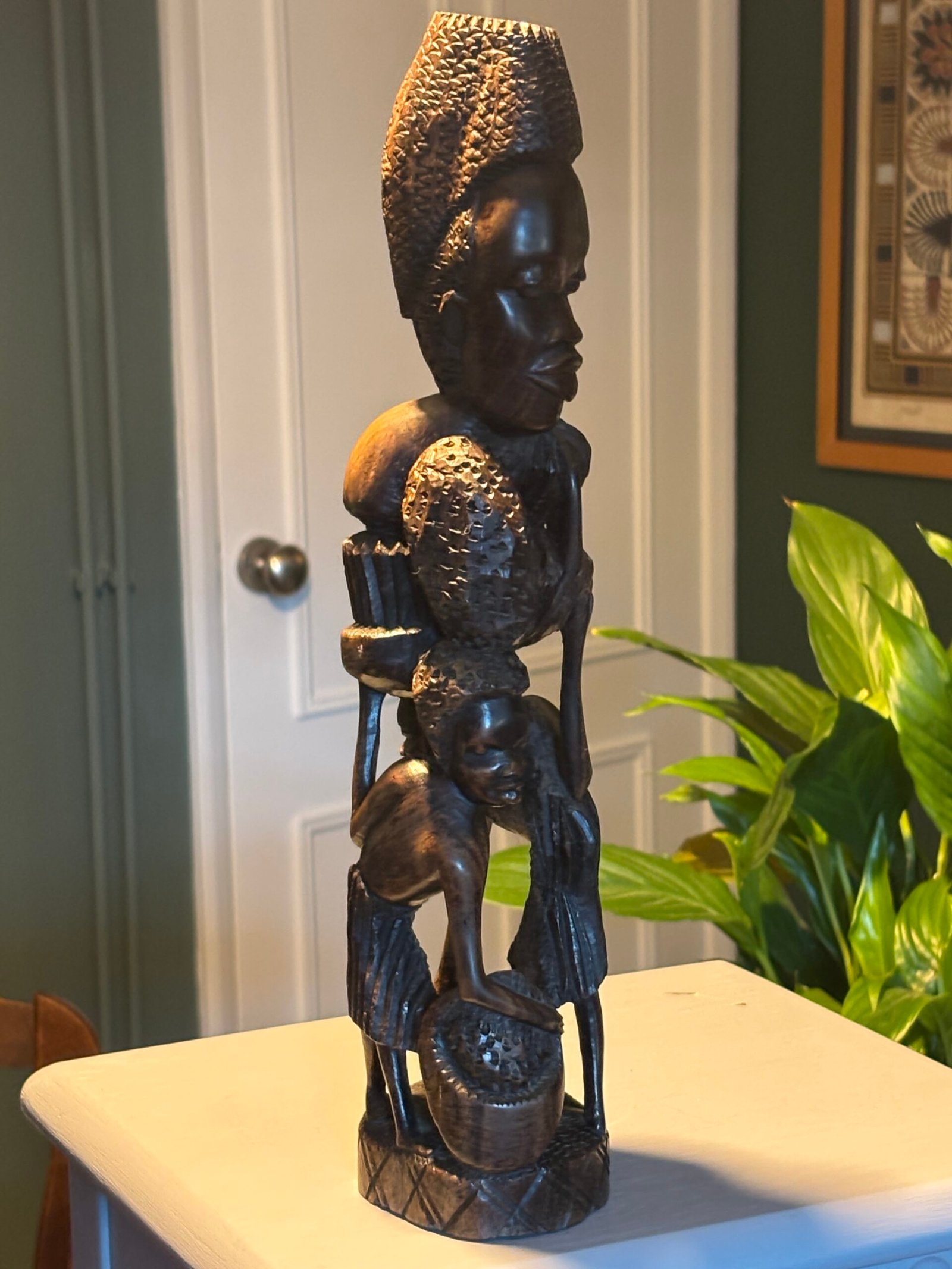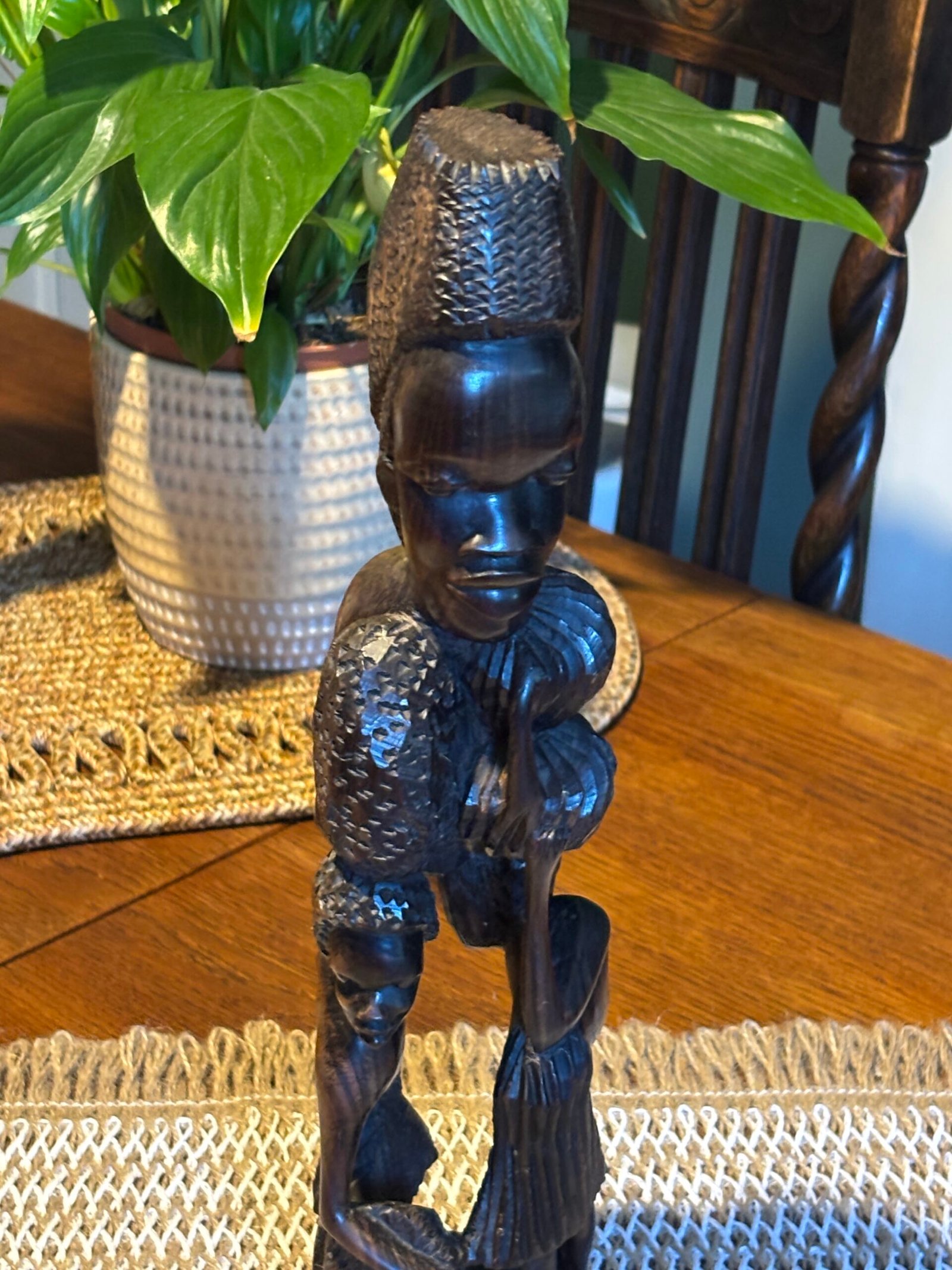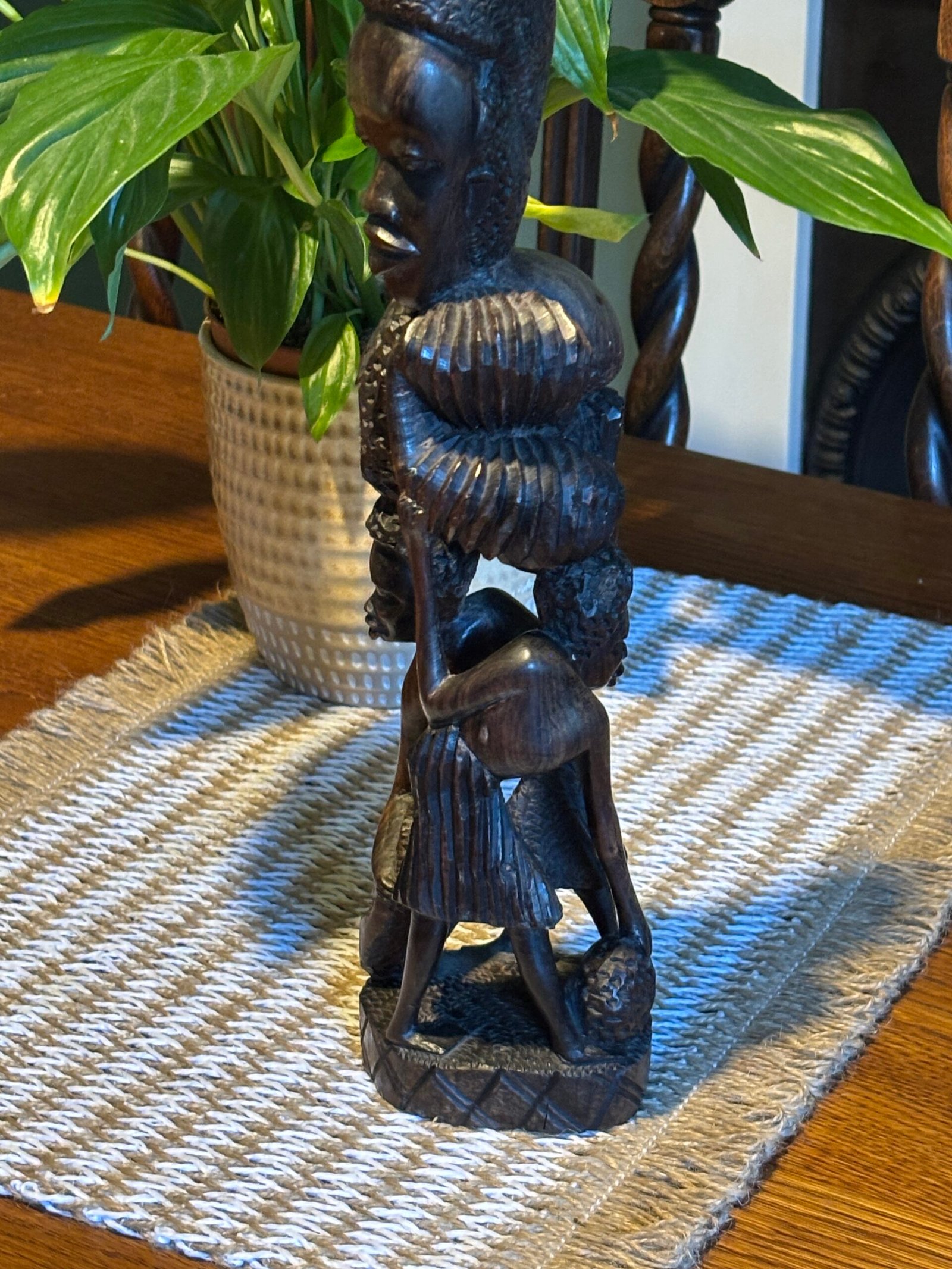 Beautiful authentic hand-carved wooden sculpture, featuring multiple figures in a vertical “Tree of Life” or “Ujamaa” style. This piece is meticulously crafted from a single block of dense, dark hardwood—characteristic of traditional East African (Makonde) craftsmanship.