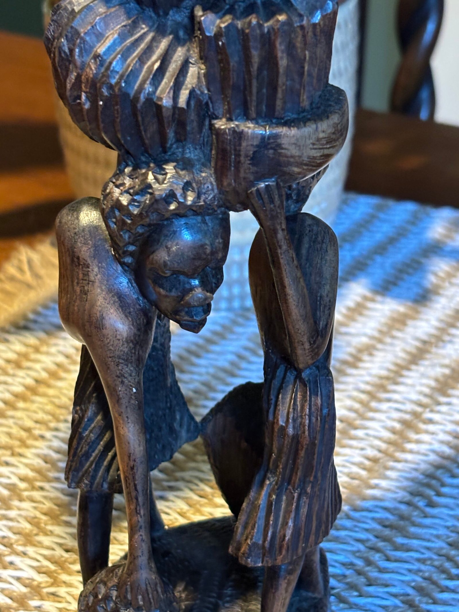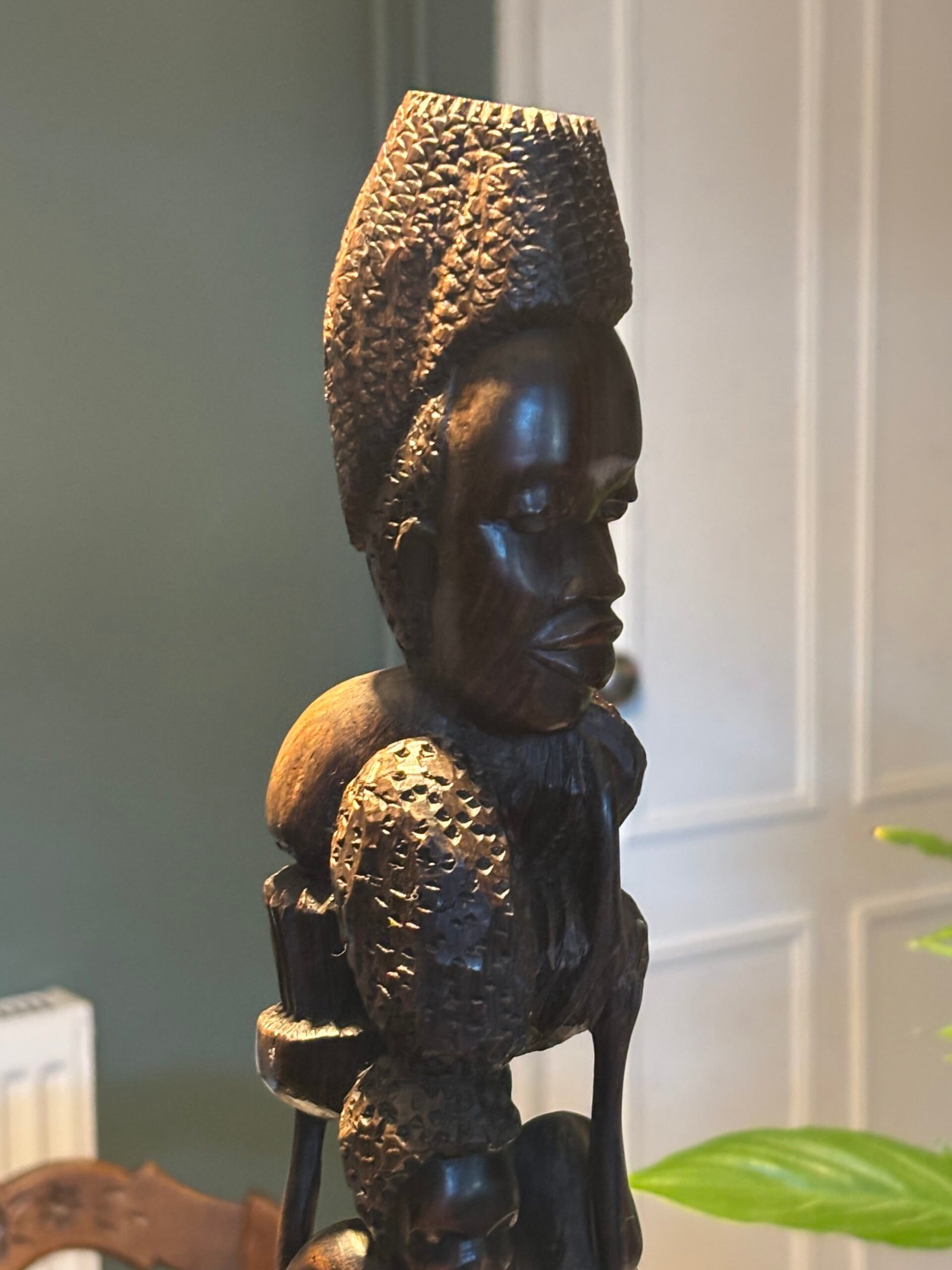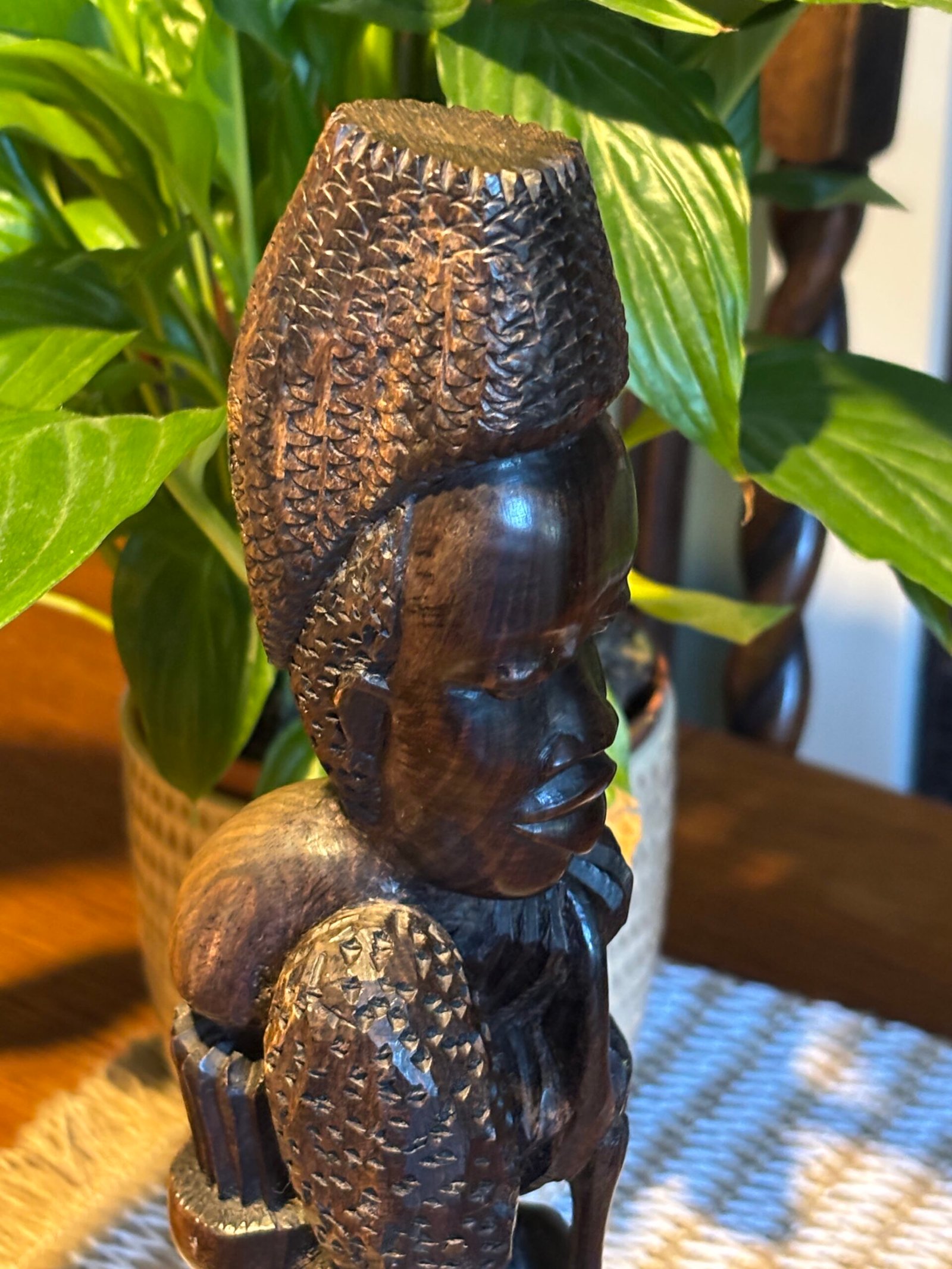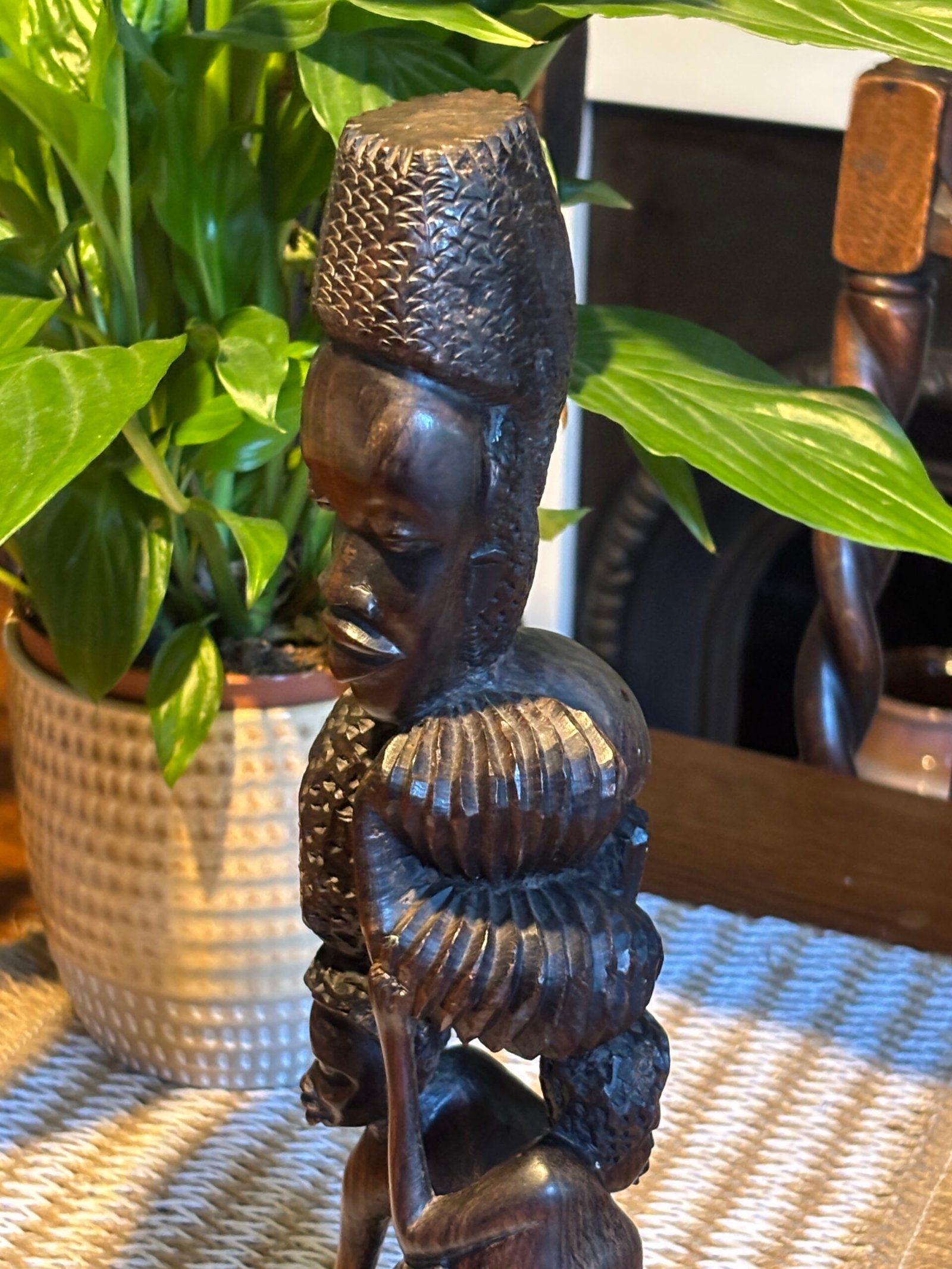 Beautiful authentic hand-carved wooden sculpture, featuring multiple figures in a vertical “Tree of Life” or “Ujamaa” style. This piece is meticulously crafted from a single block of dense, dark hardwood—characteristic of traditional East African (Makonde) craftsmanship.
