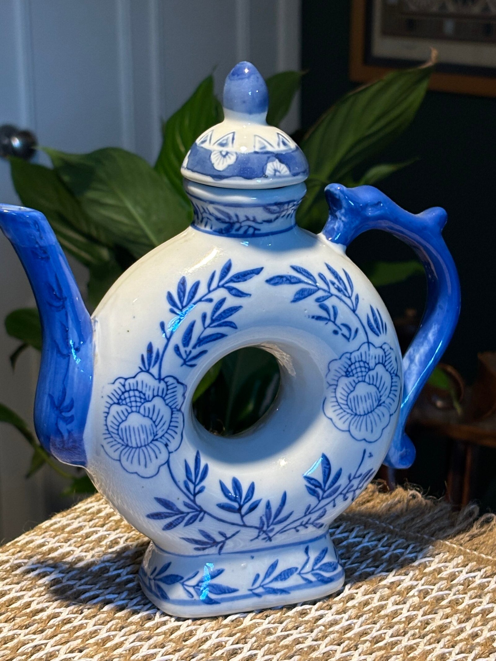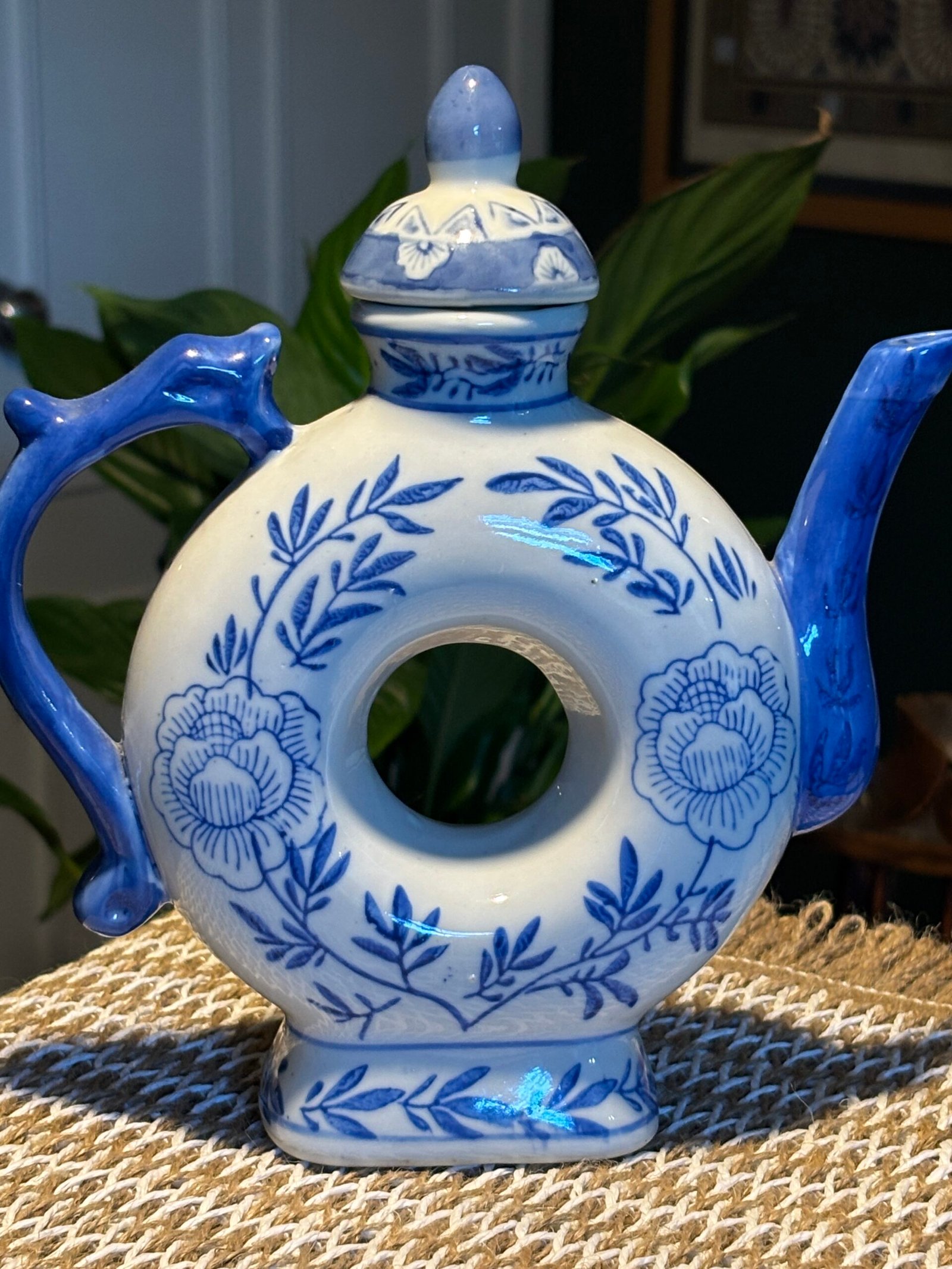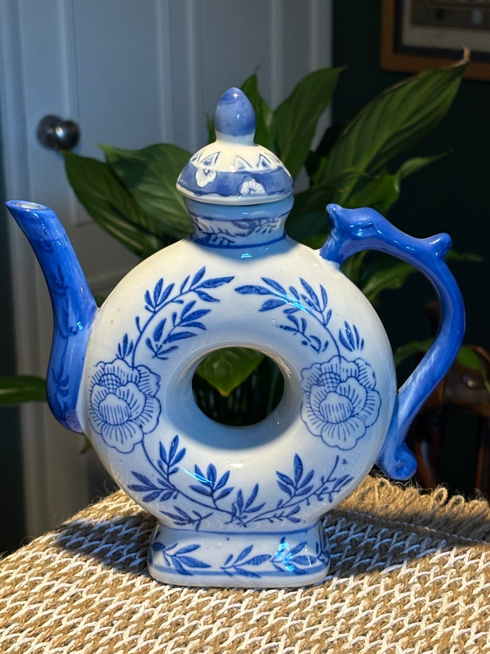 Charming vintage Chinese ceramic ornamental teapot featuring a distinctive circular “donut” body with a central hole. Hand-decorated in classic blue and white floral patterns with elegant leaf detailing.