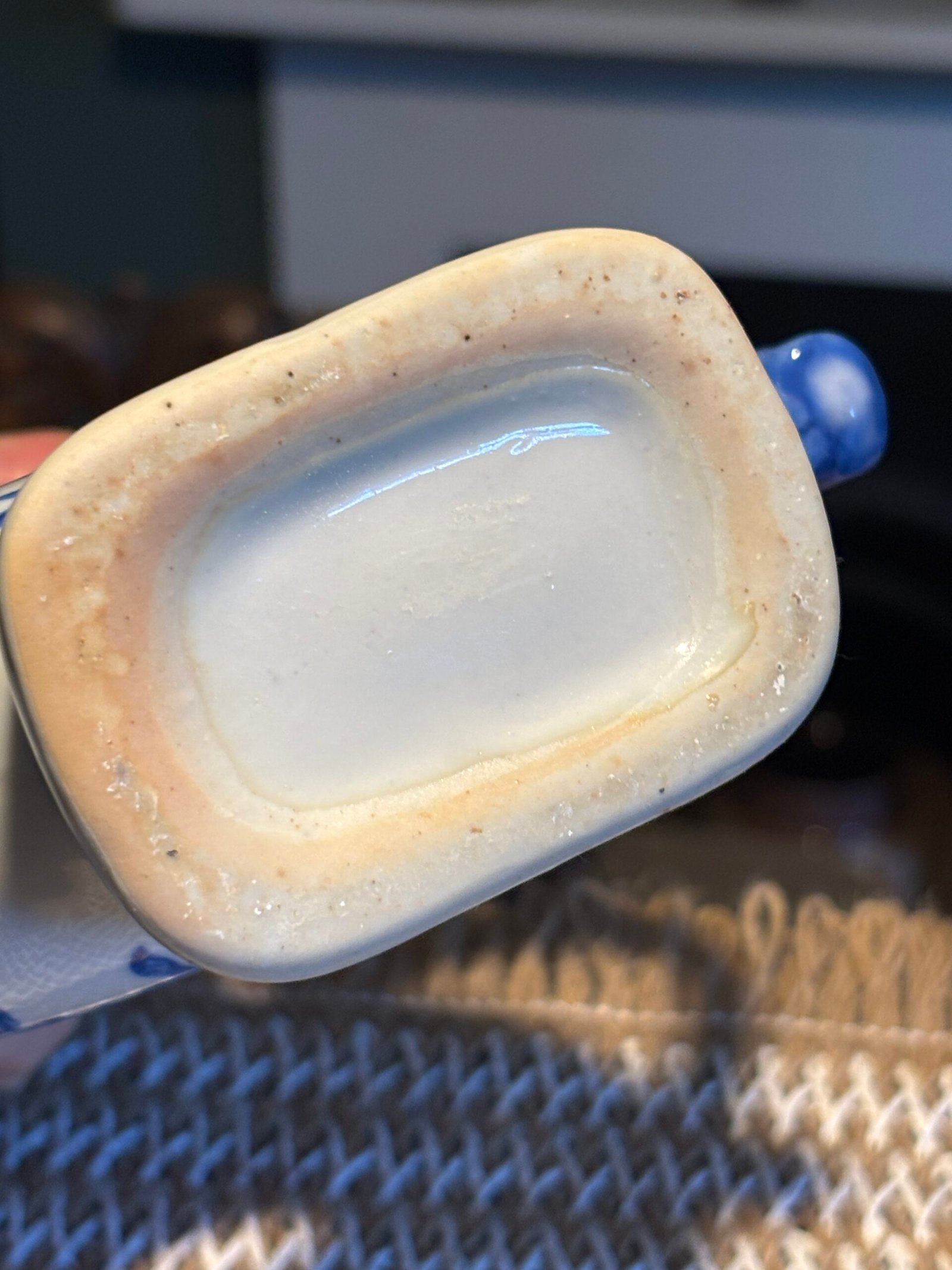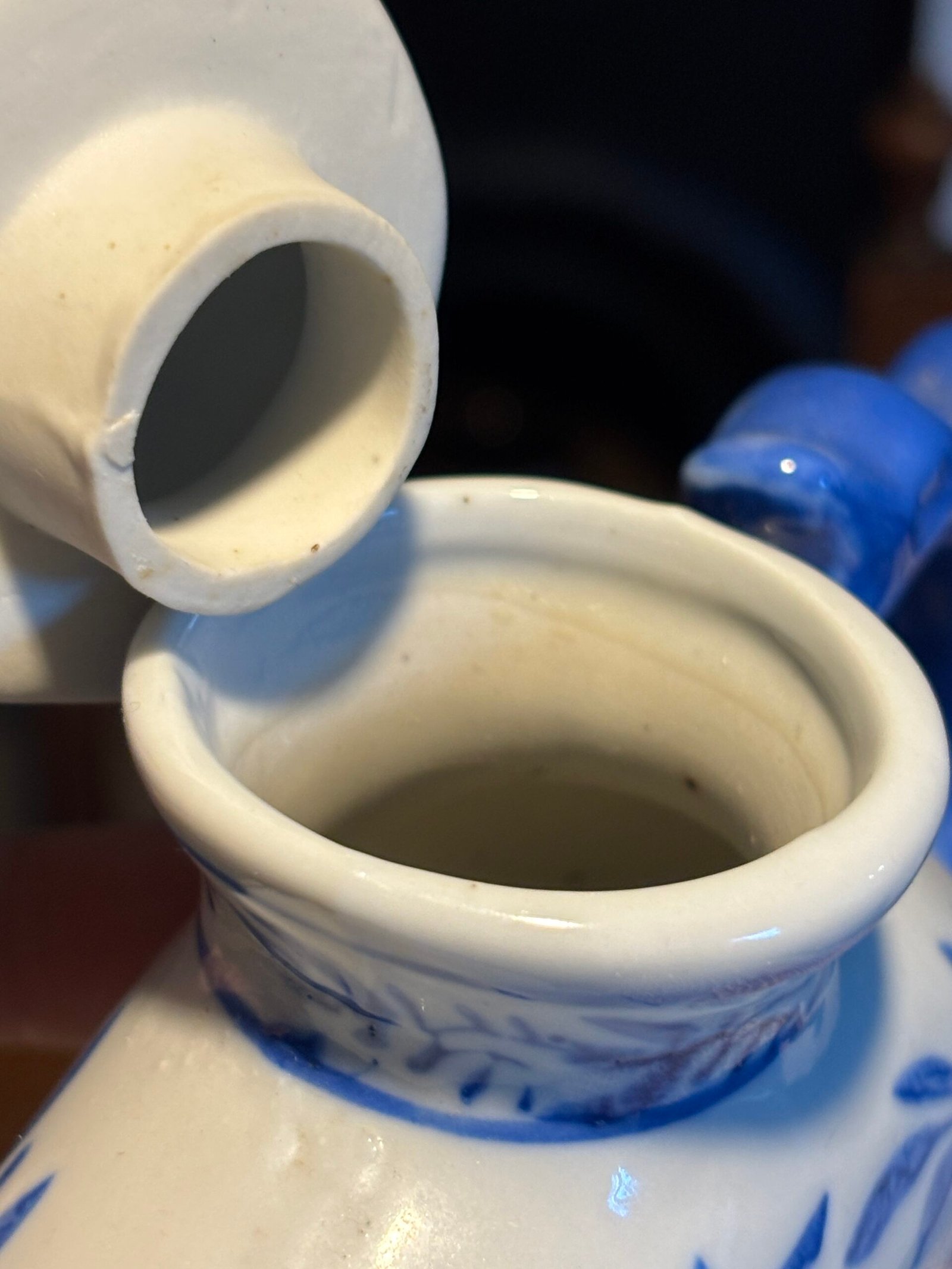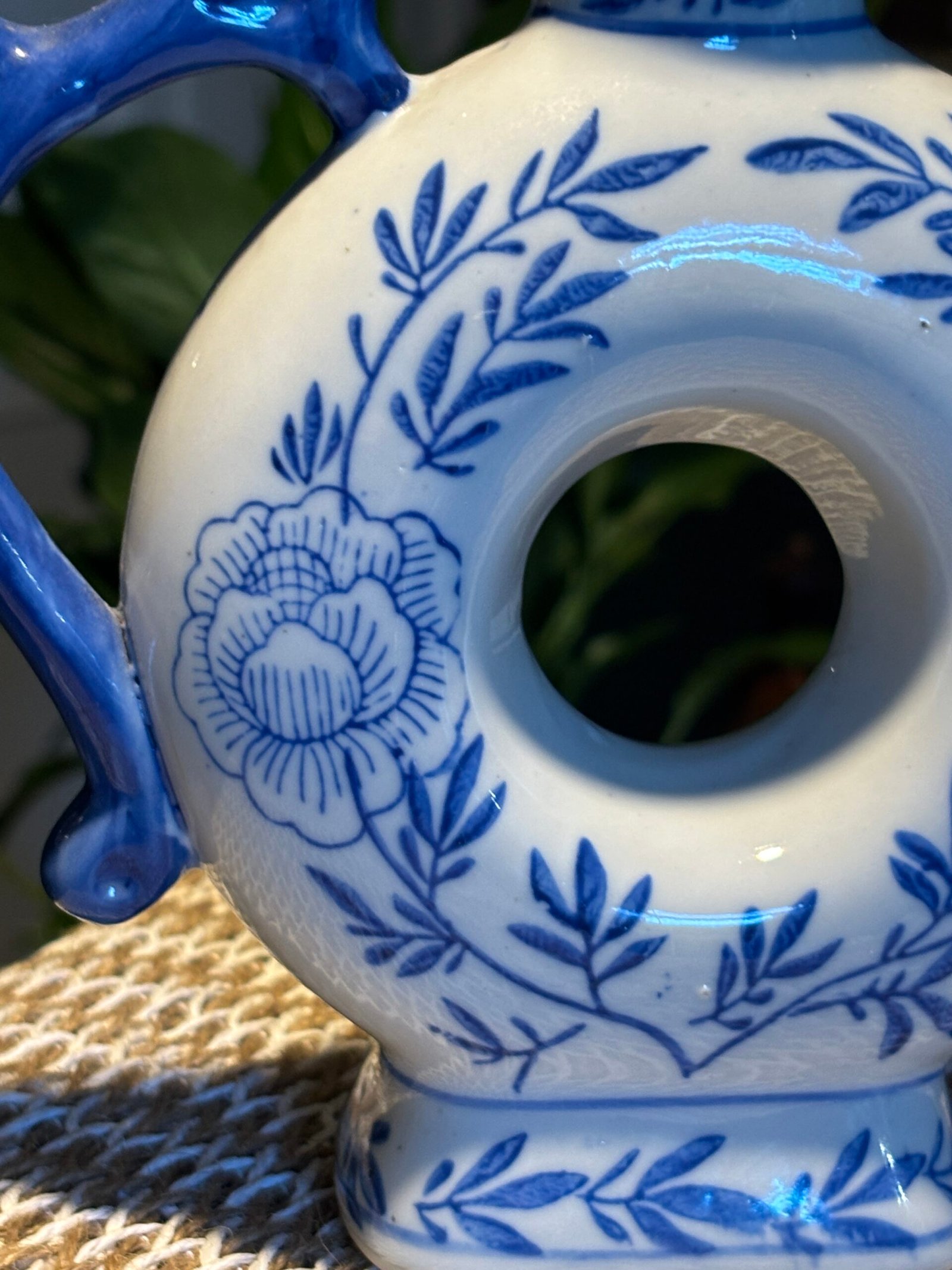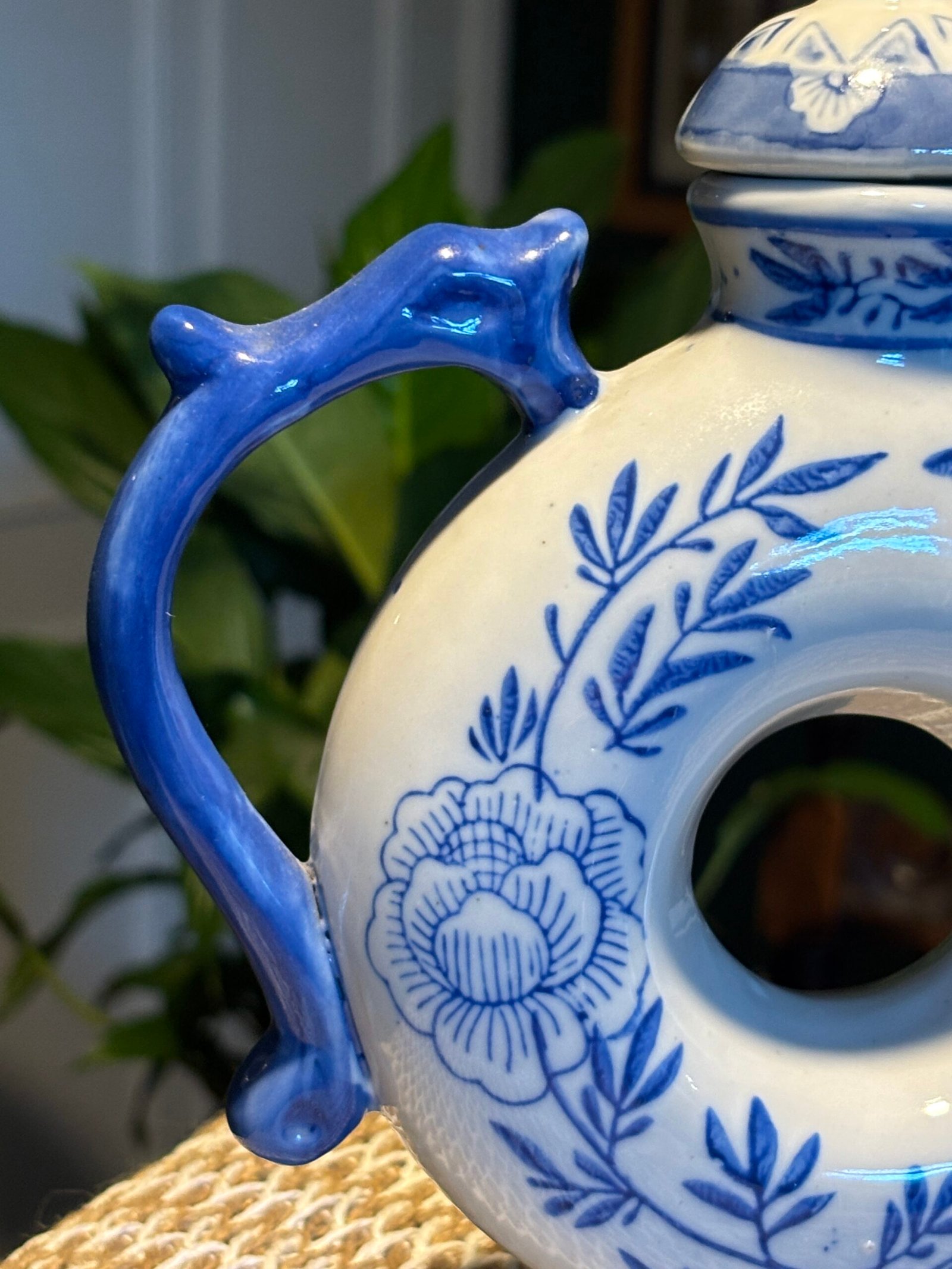 Charming vintage Chinese ceramic ornamental teapot featuring a distinctive circular “donut” body with a central hole. Hand-decorated in classic blue and white floral patterns with elegant leaf detailing.