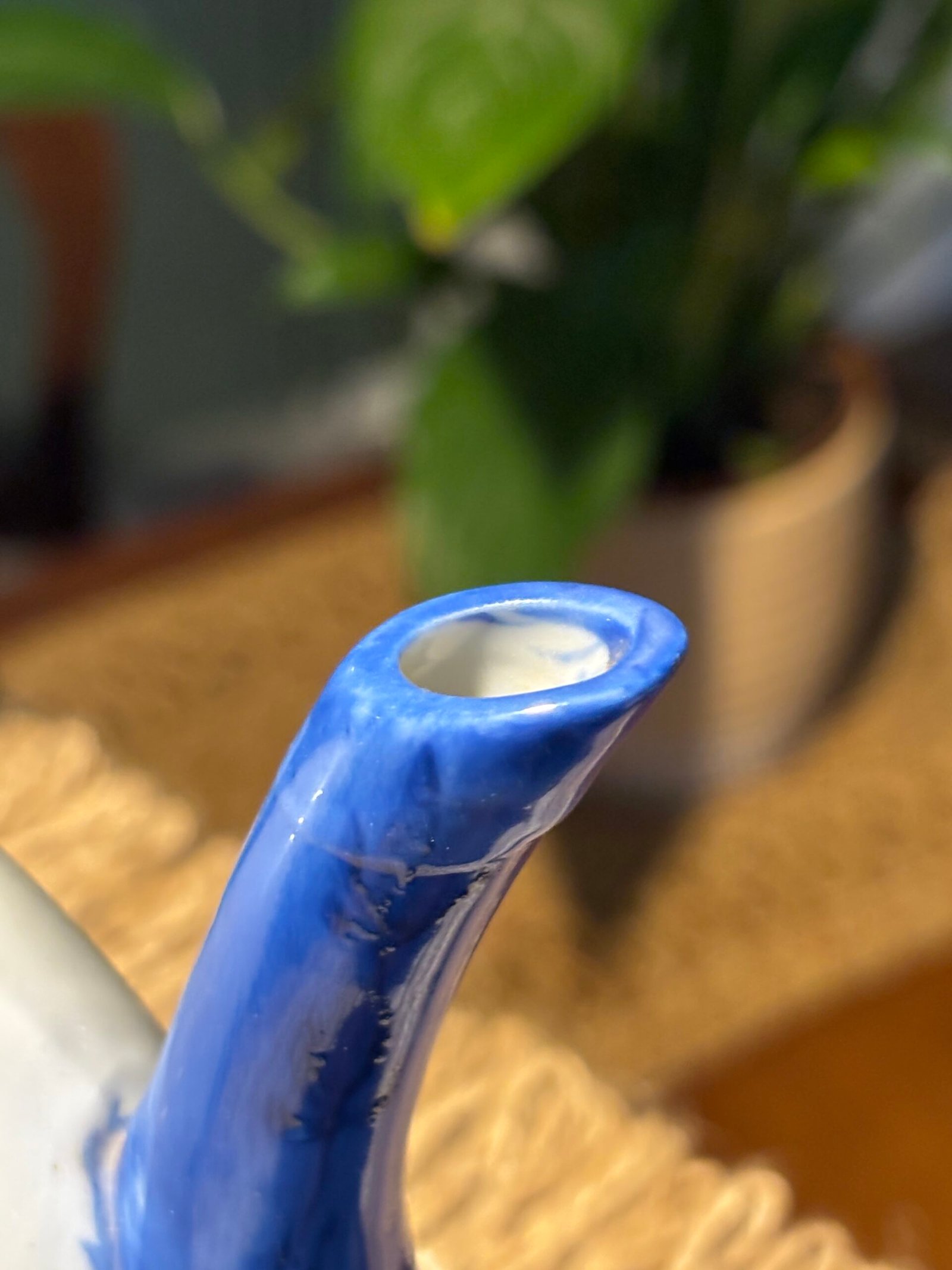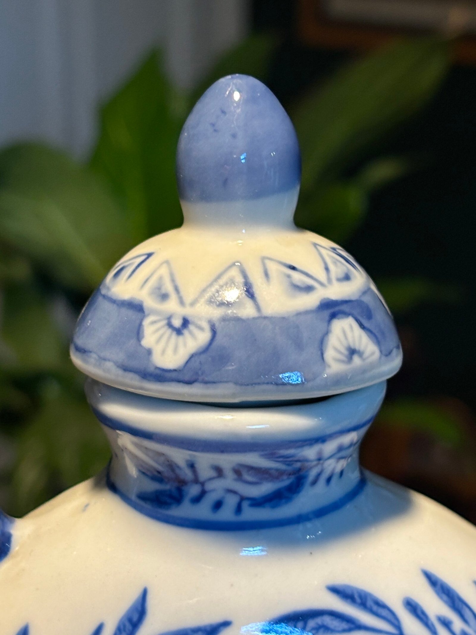 The handle and spout have a rich cobalt blue glaze, and the lid features complementary floral accents.