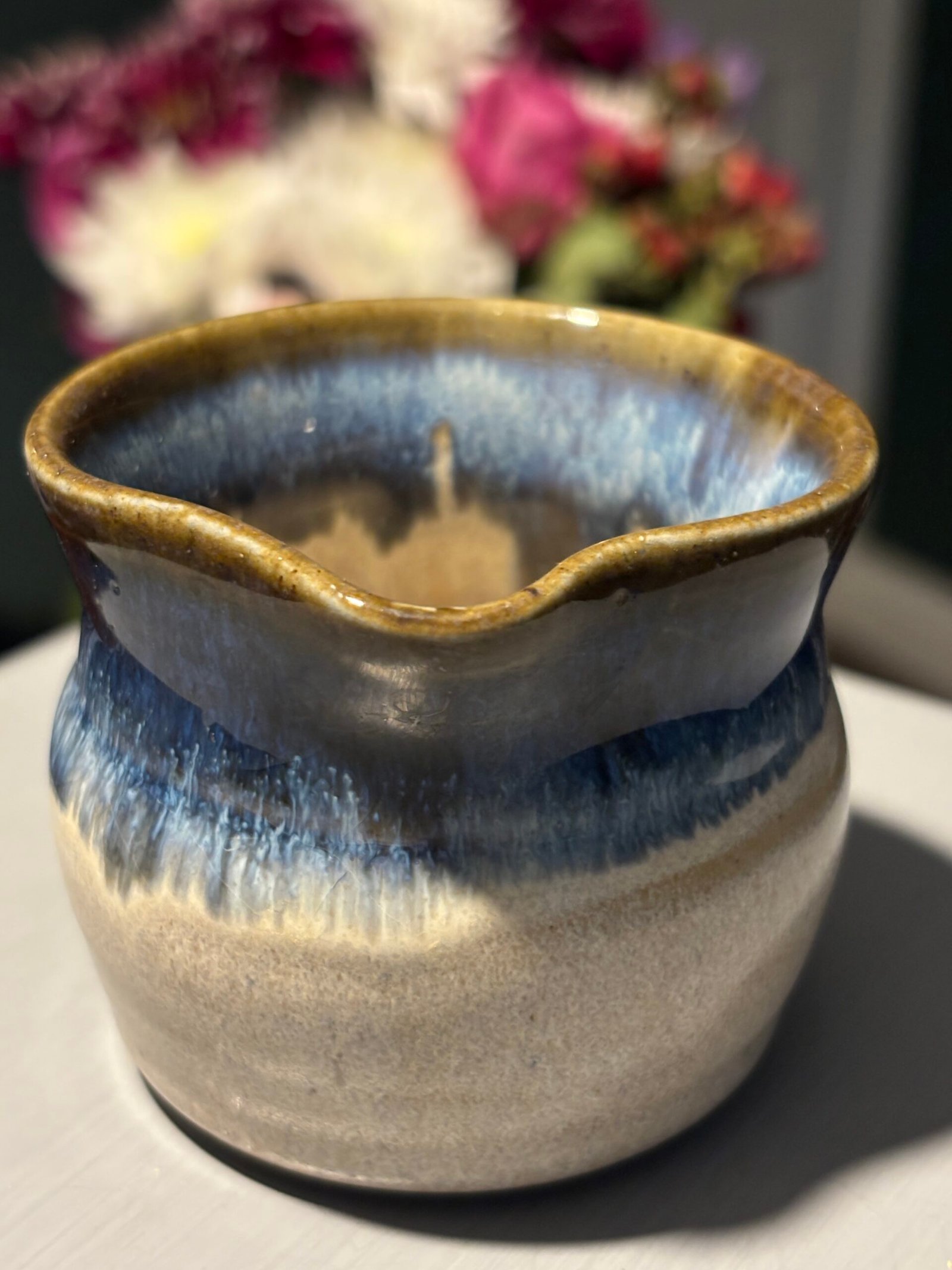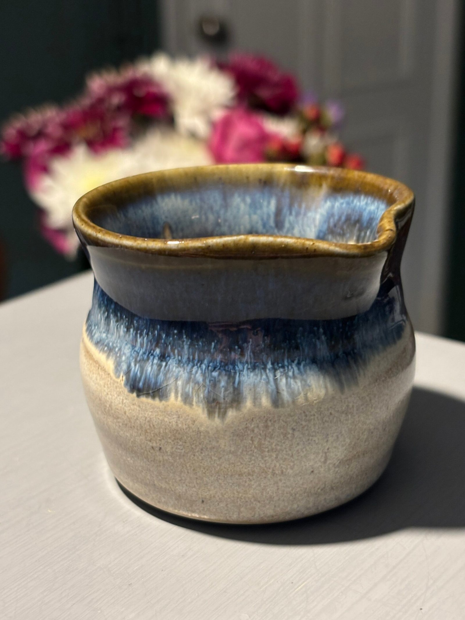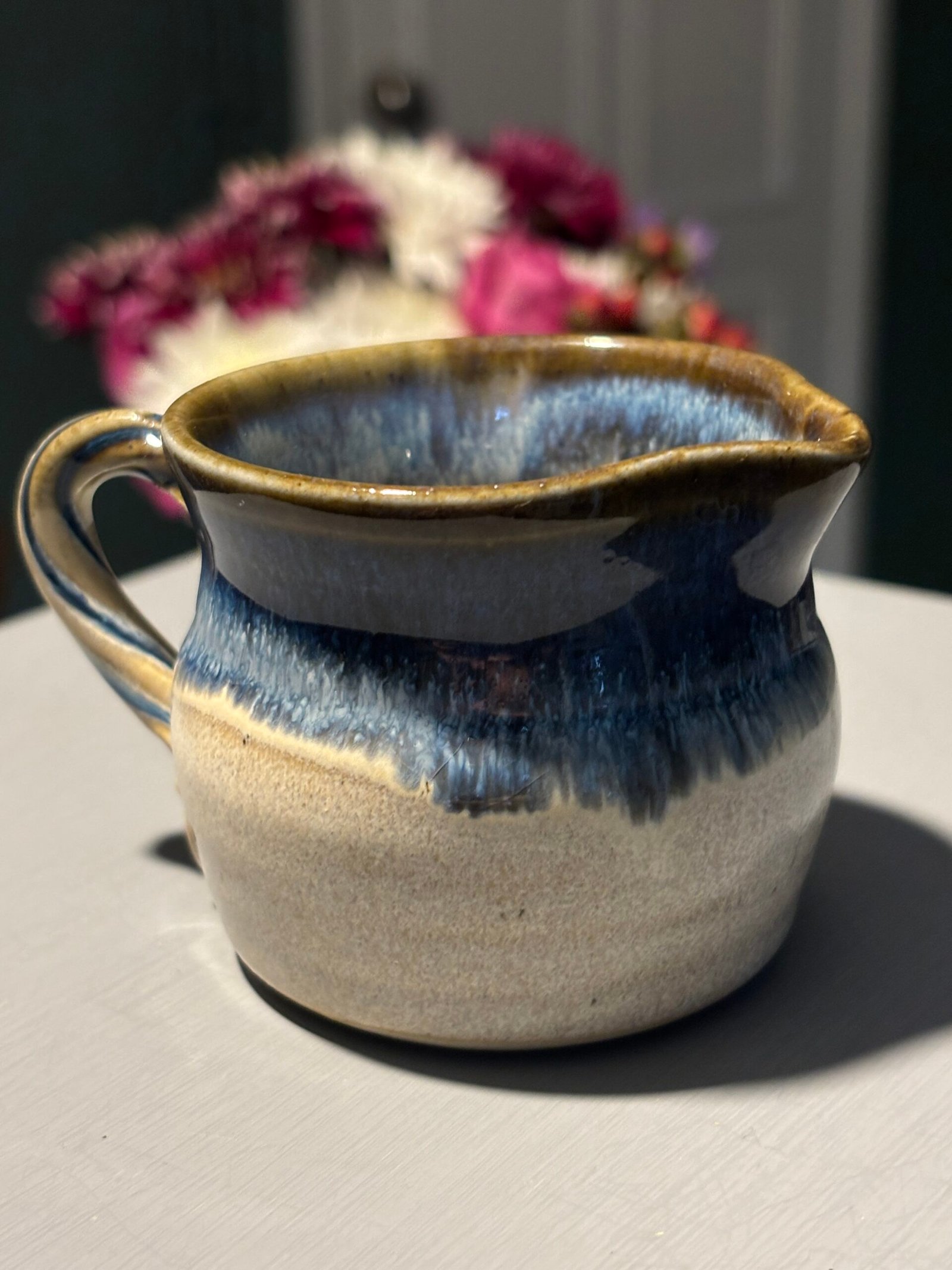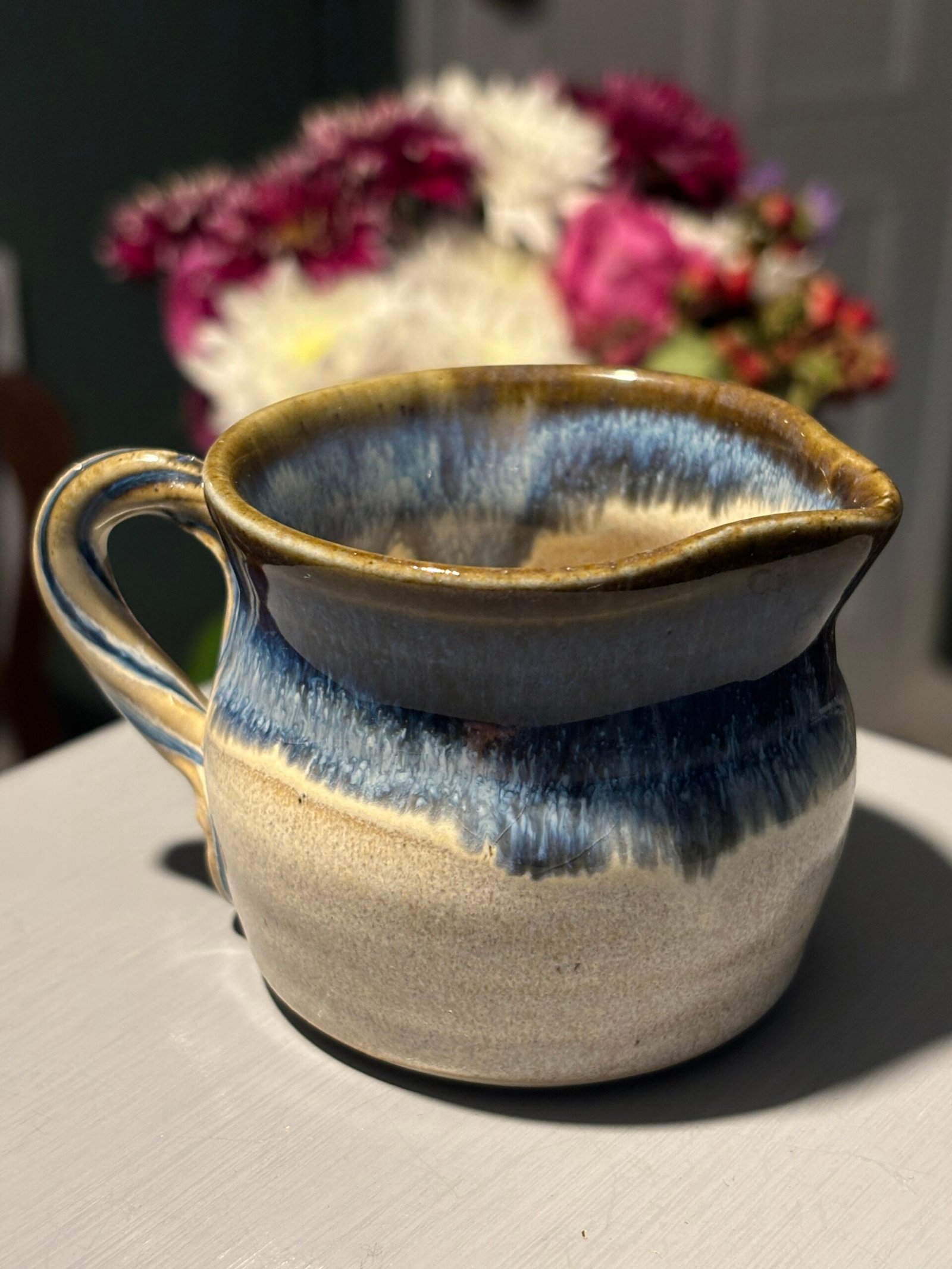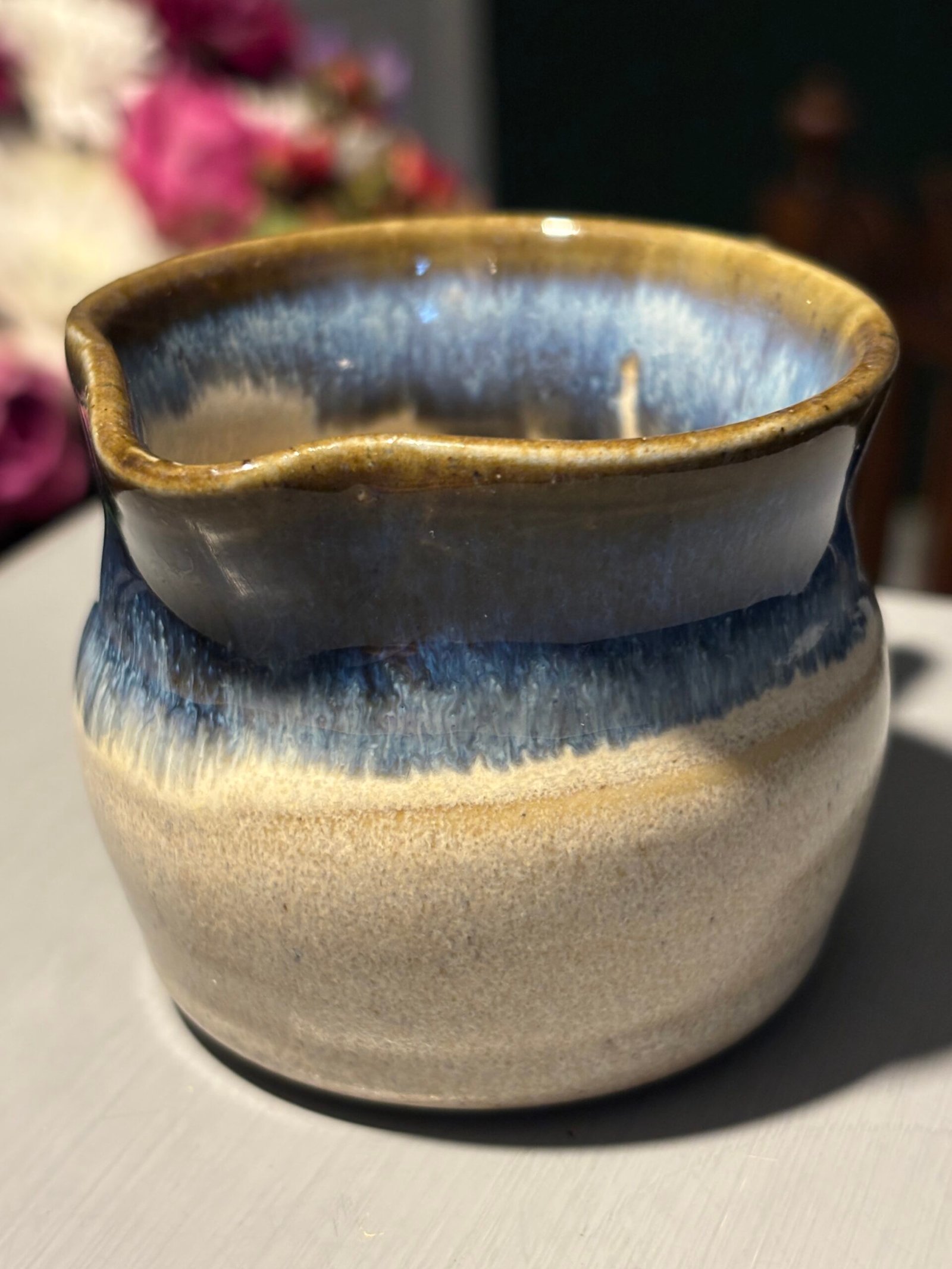 Beautiful vintage handmade ceramic jug with a blue and tan drip glaze.