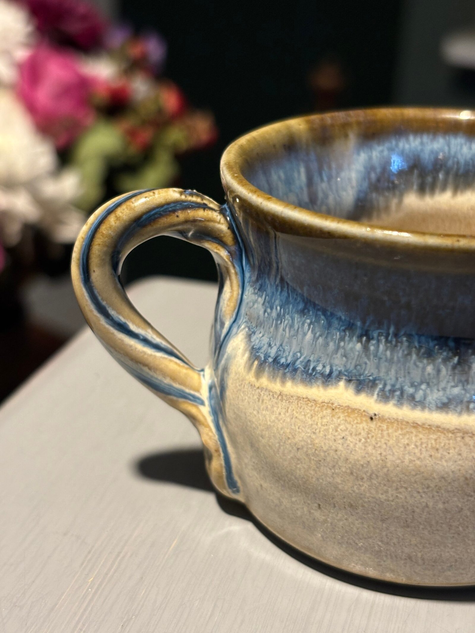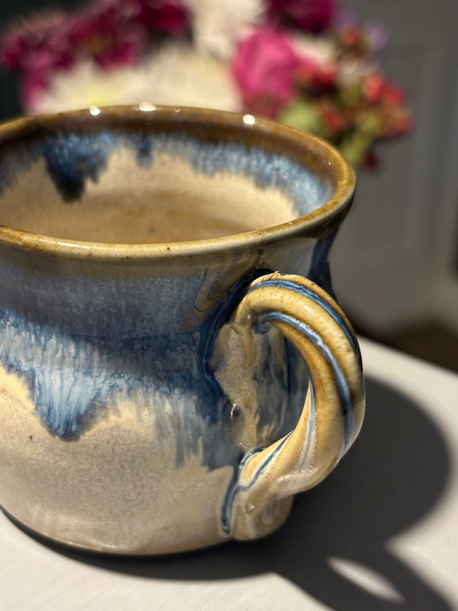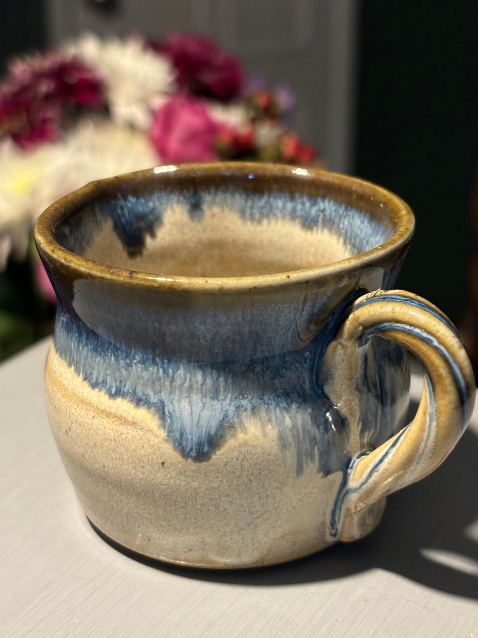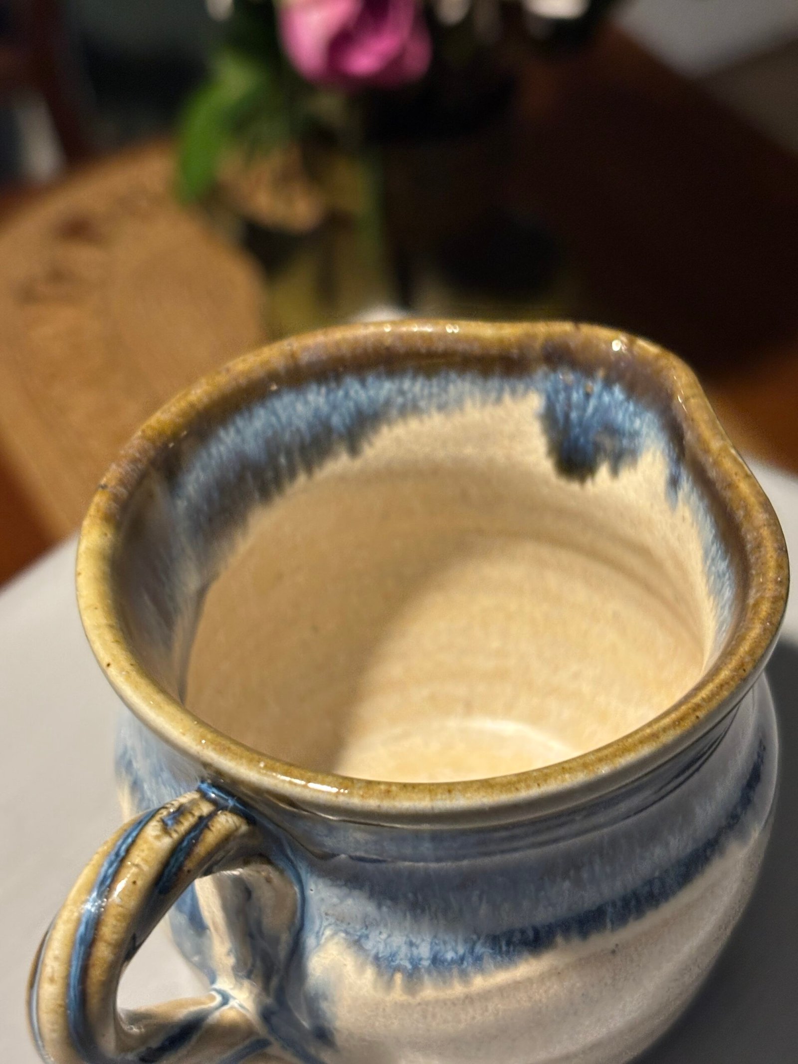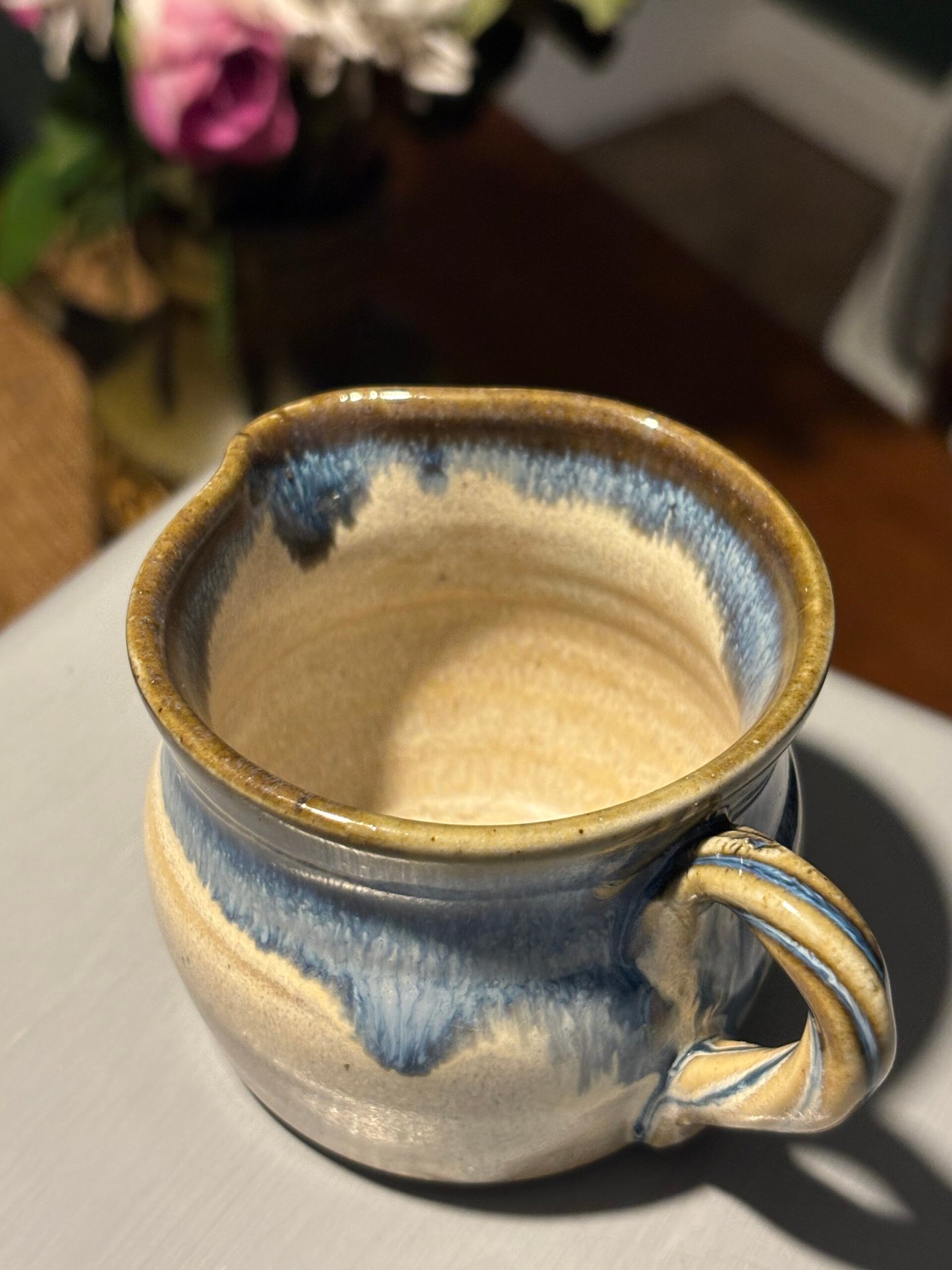 Beautiful vintage handmade ceramic jug with a blue and tan drip glaze.