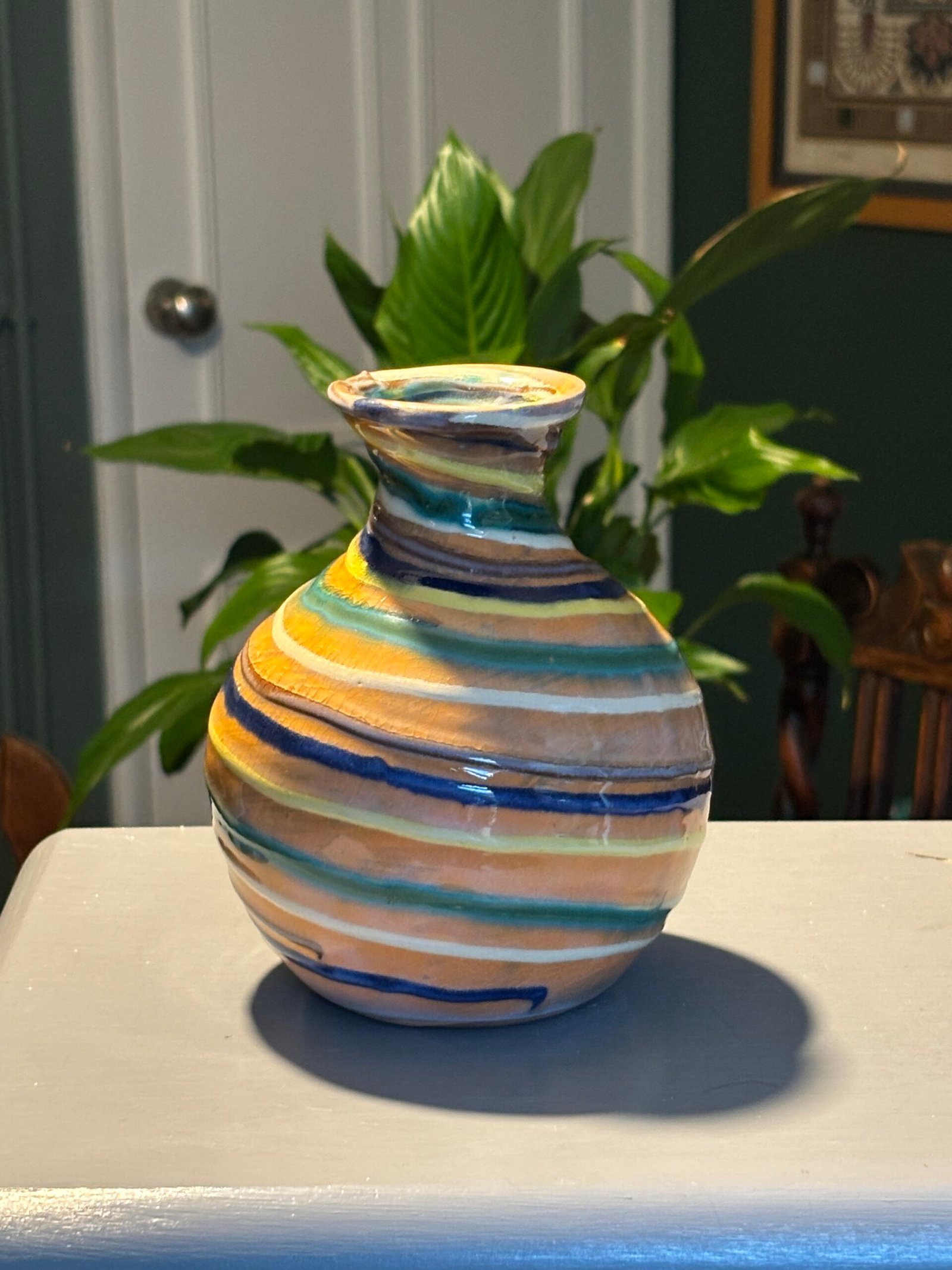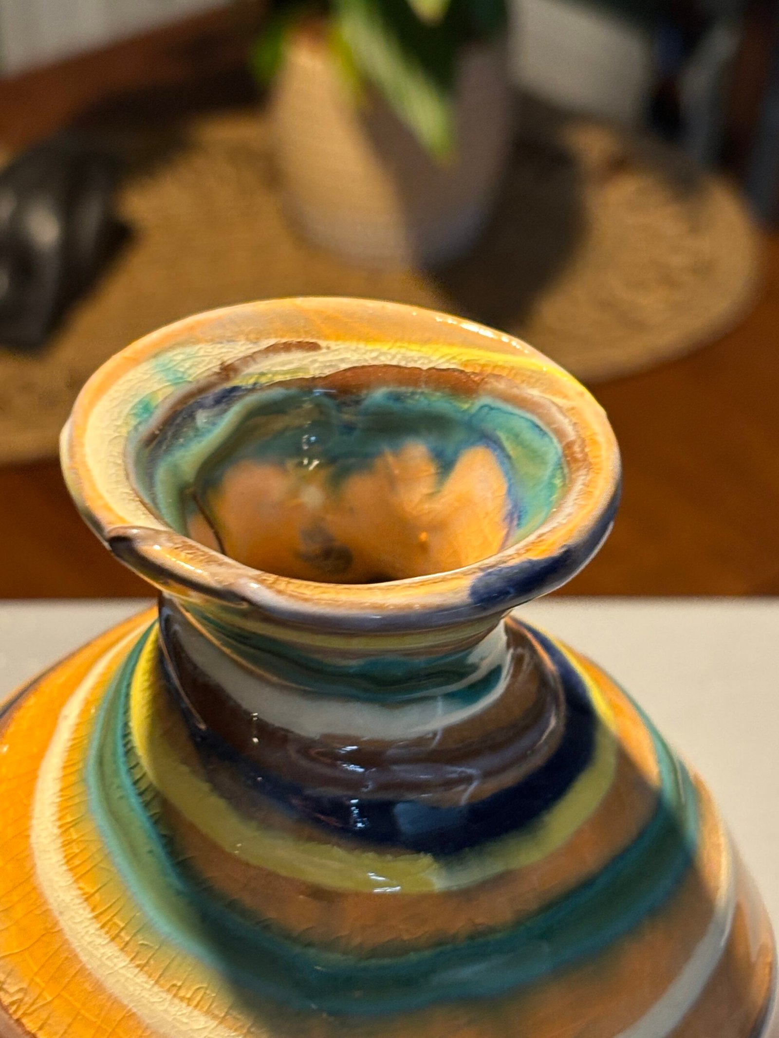This piece features the studio’s signature vibrant colour palette, with hand-applied concentric stripes in shades of tropical blue, sun-yellow, earthy ochre, and turquoise.