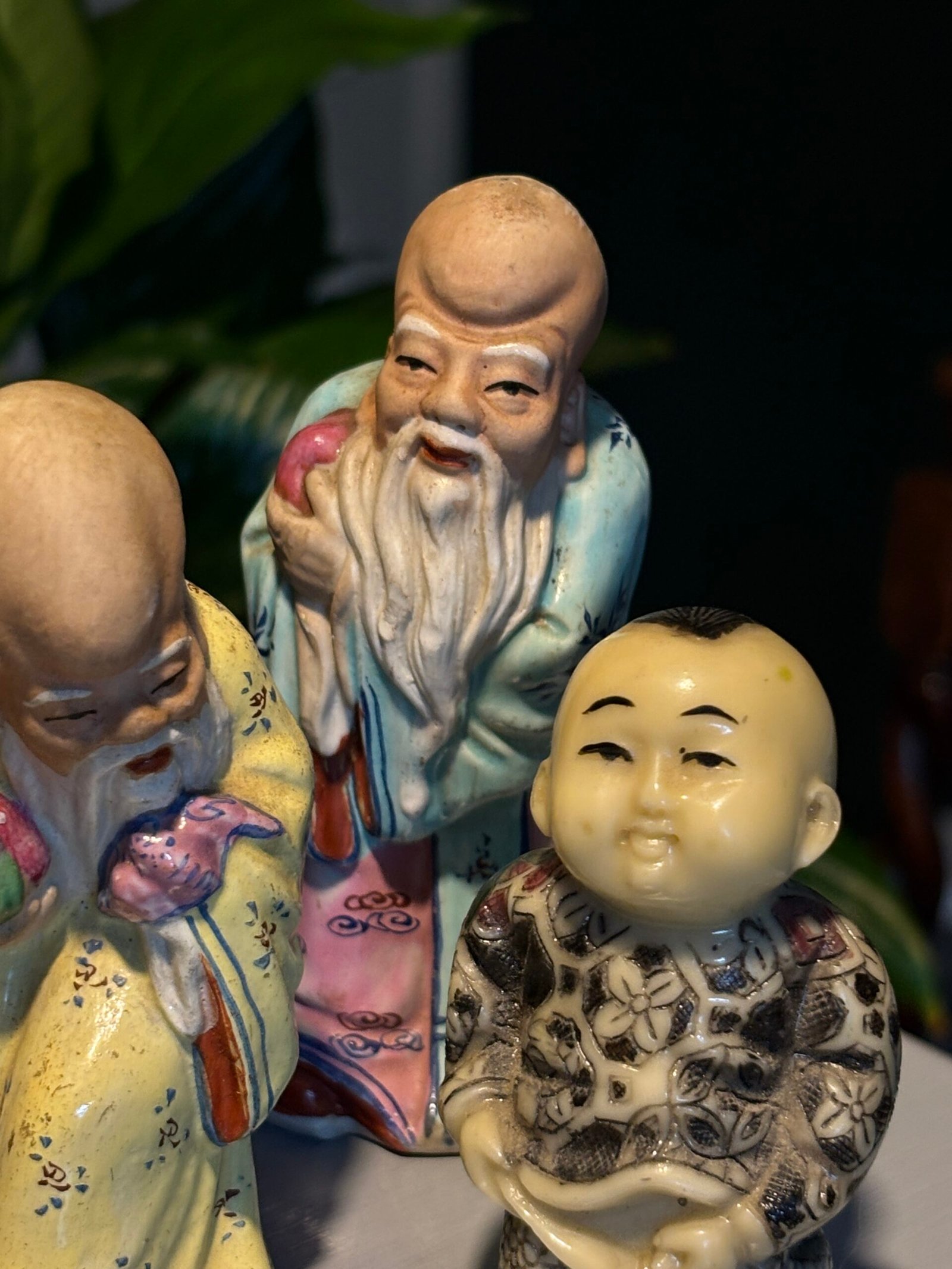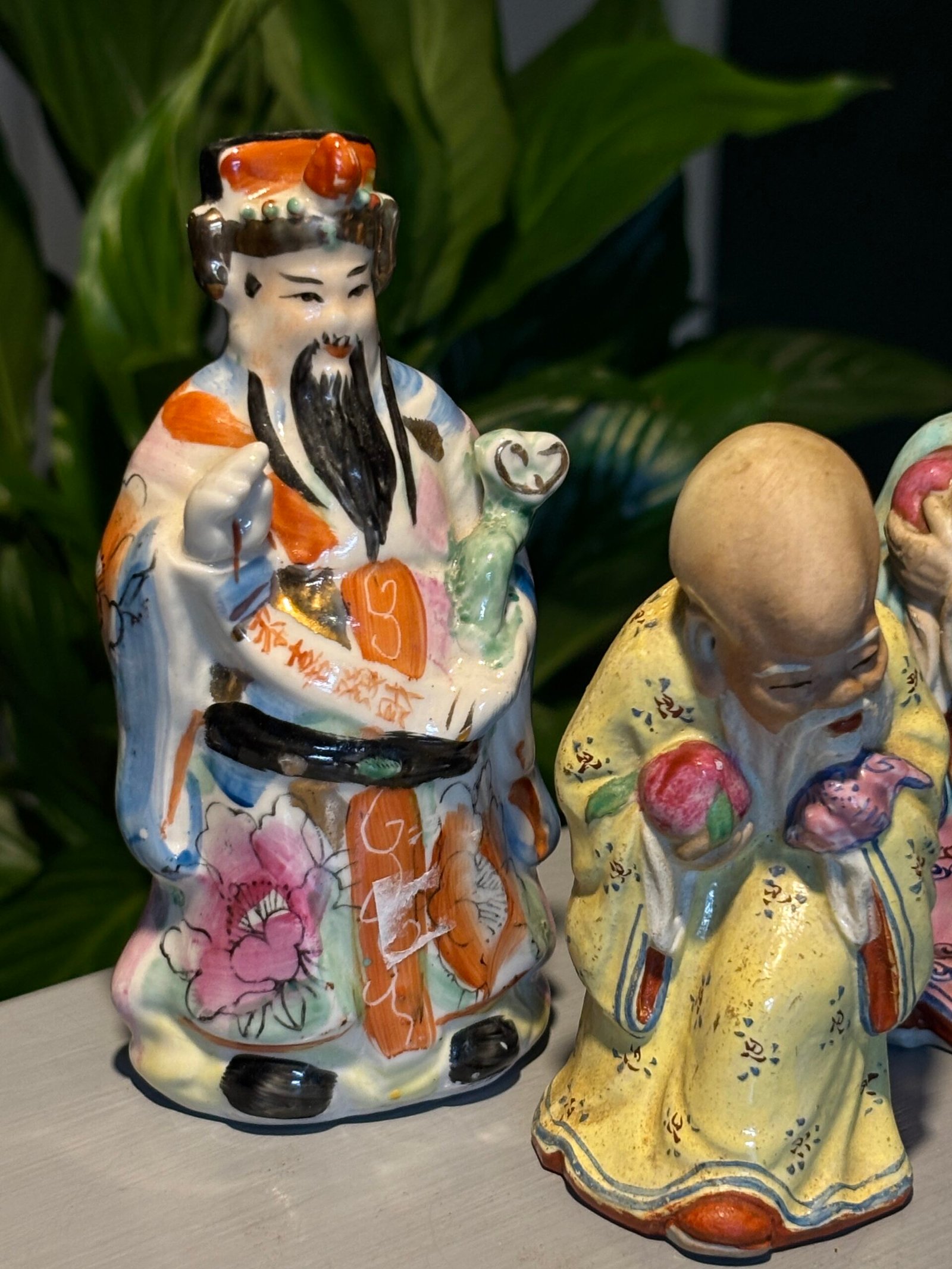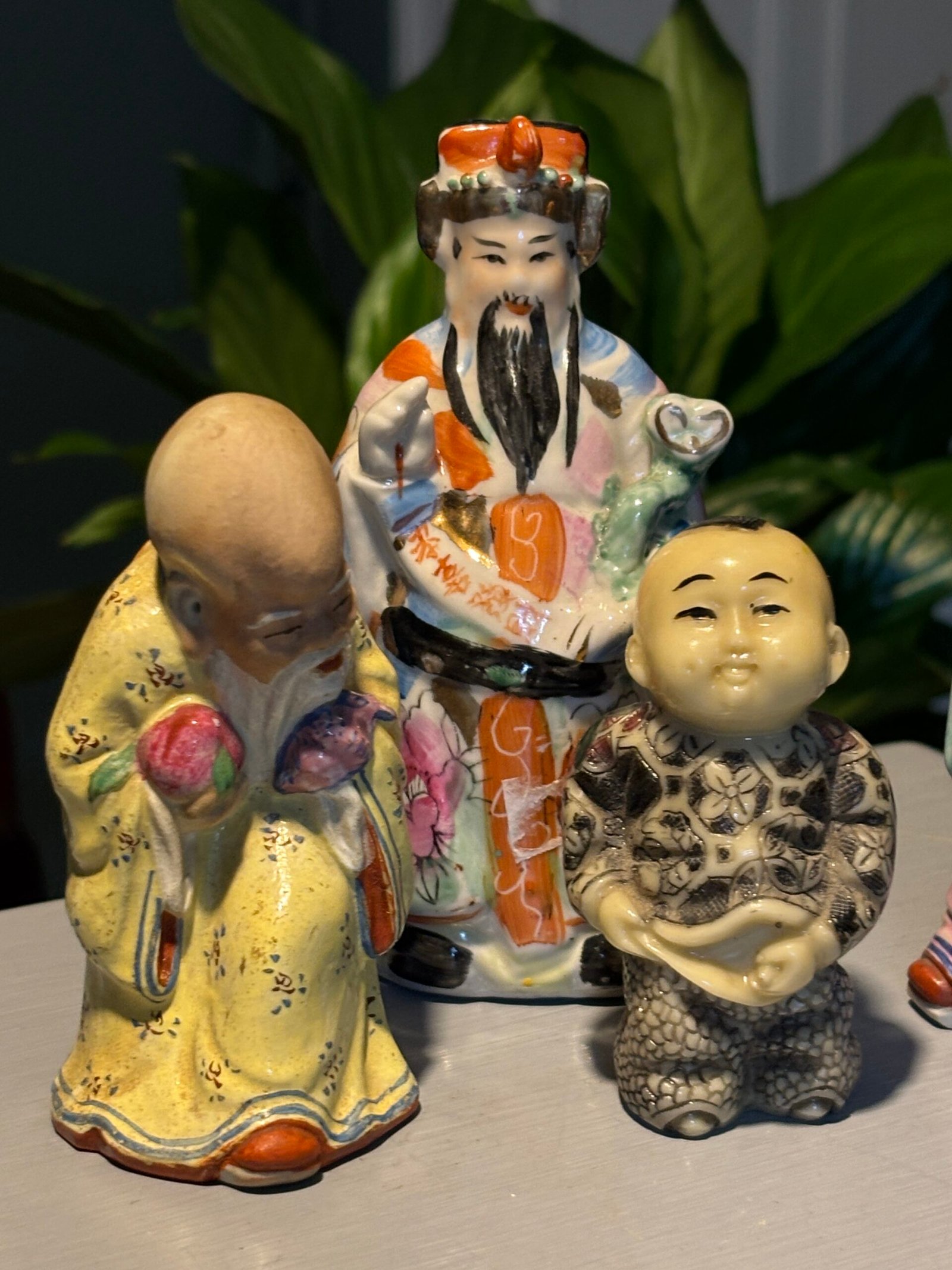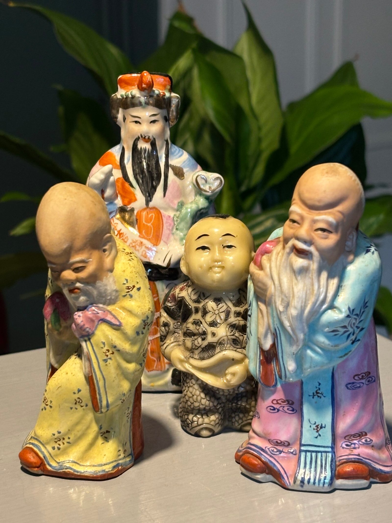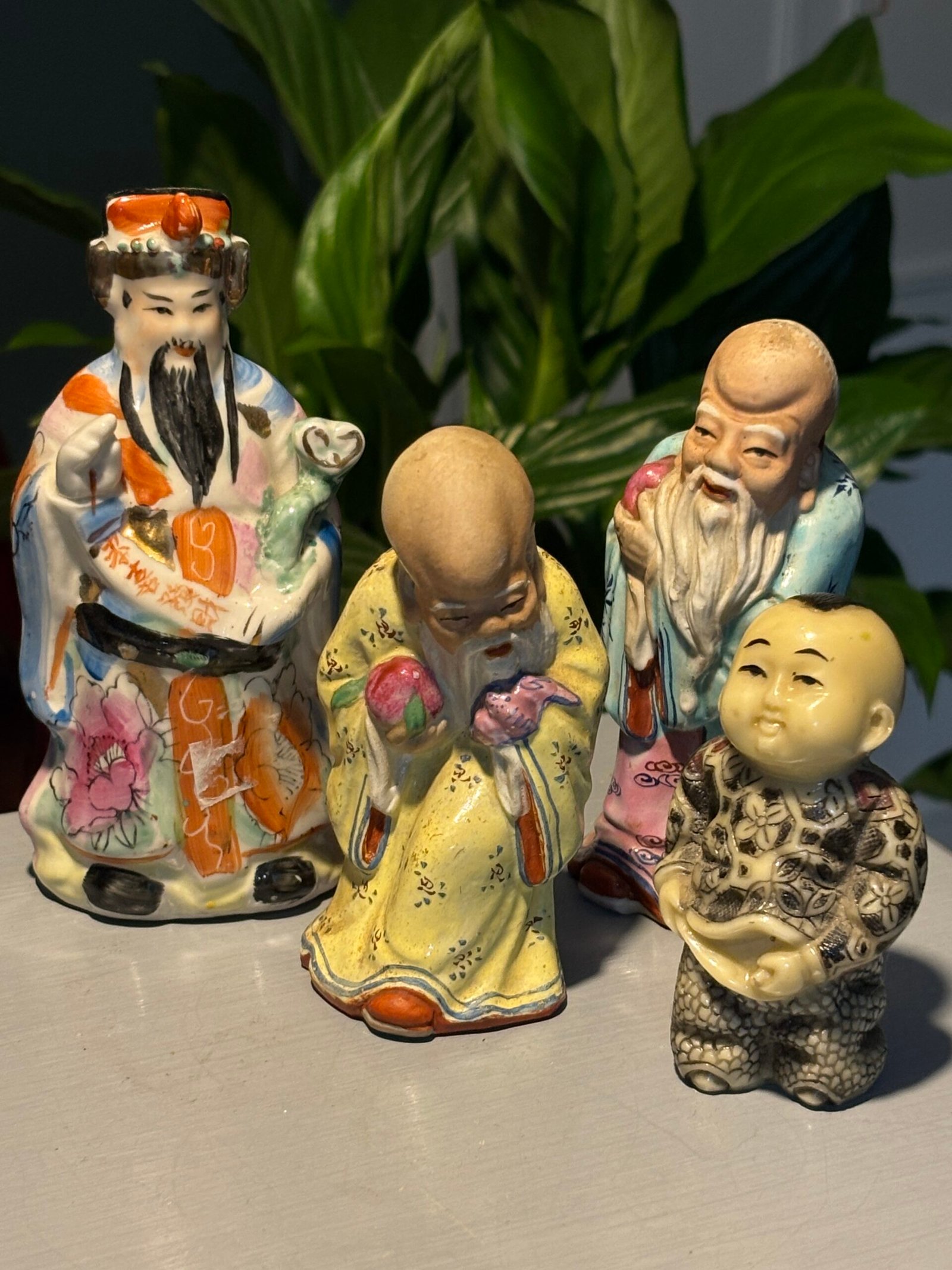 A charming set of four East Asian vintage figures. This set includes the “Three Star Gods” of luck and a detailed Japanese-style Karako boy.