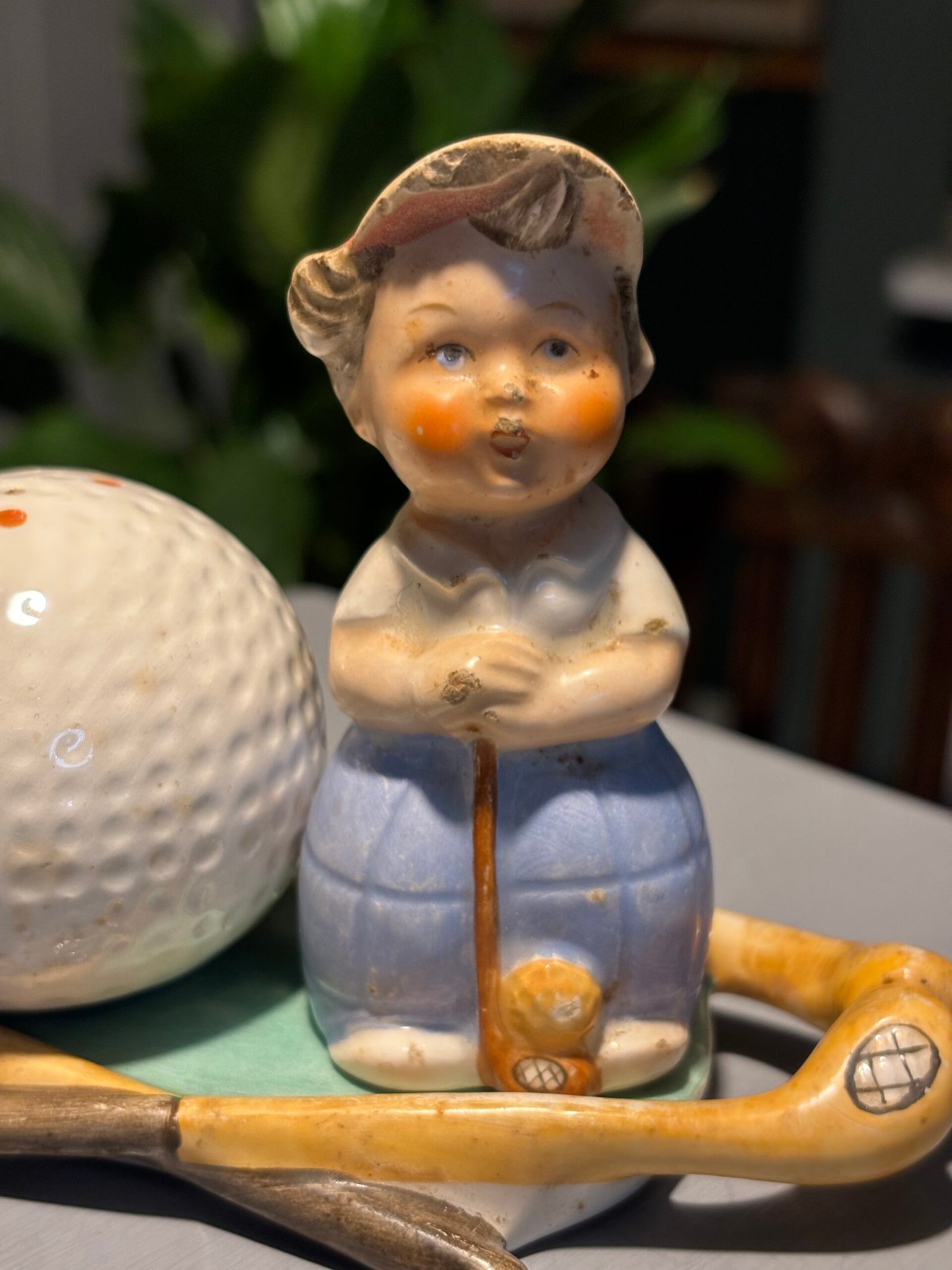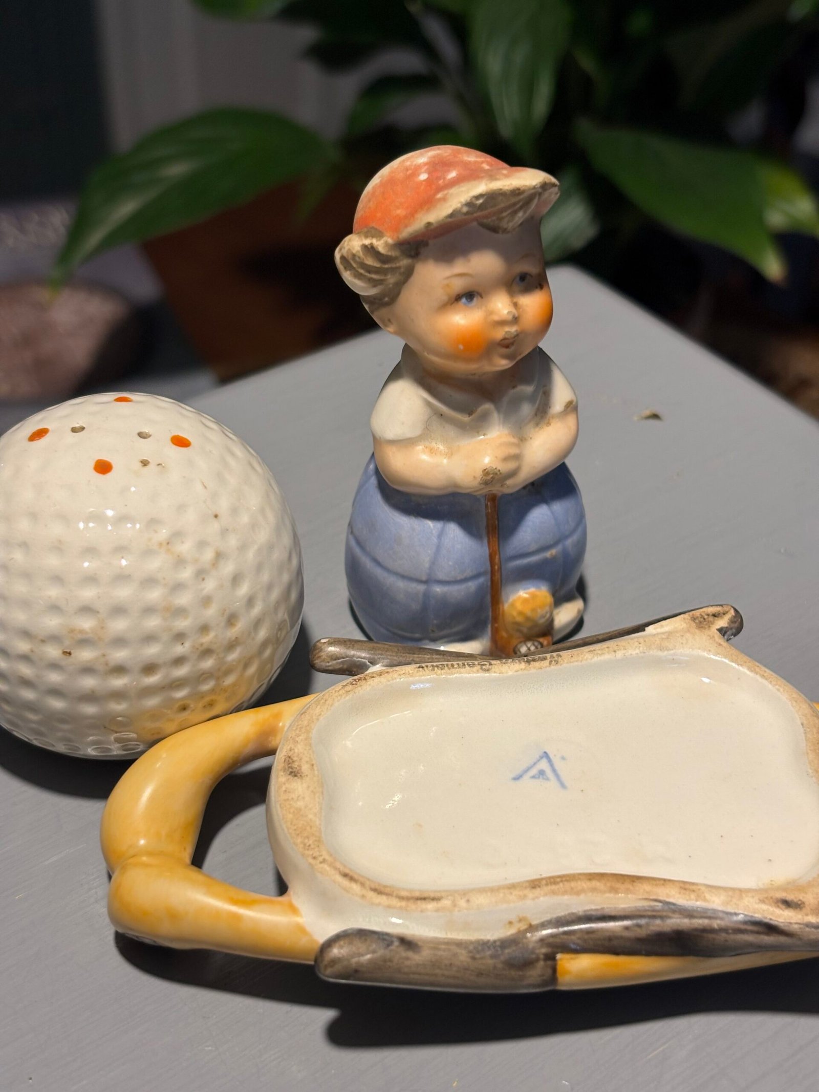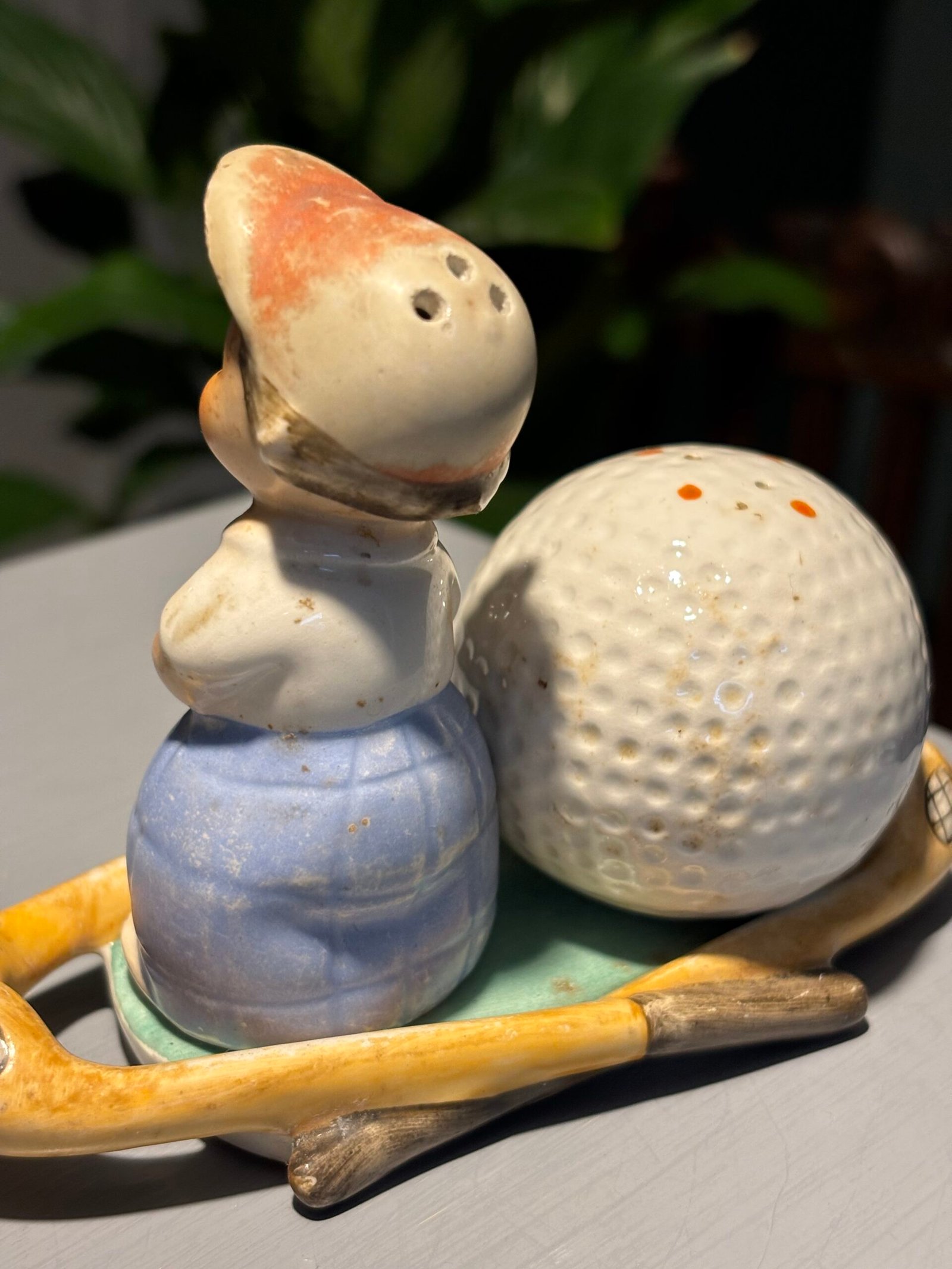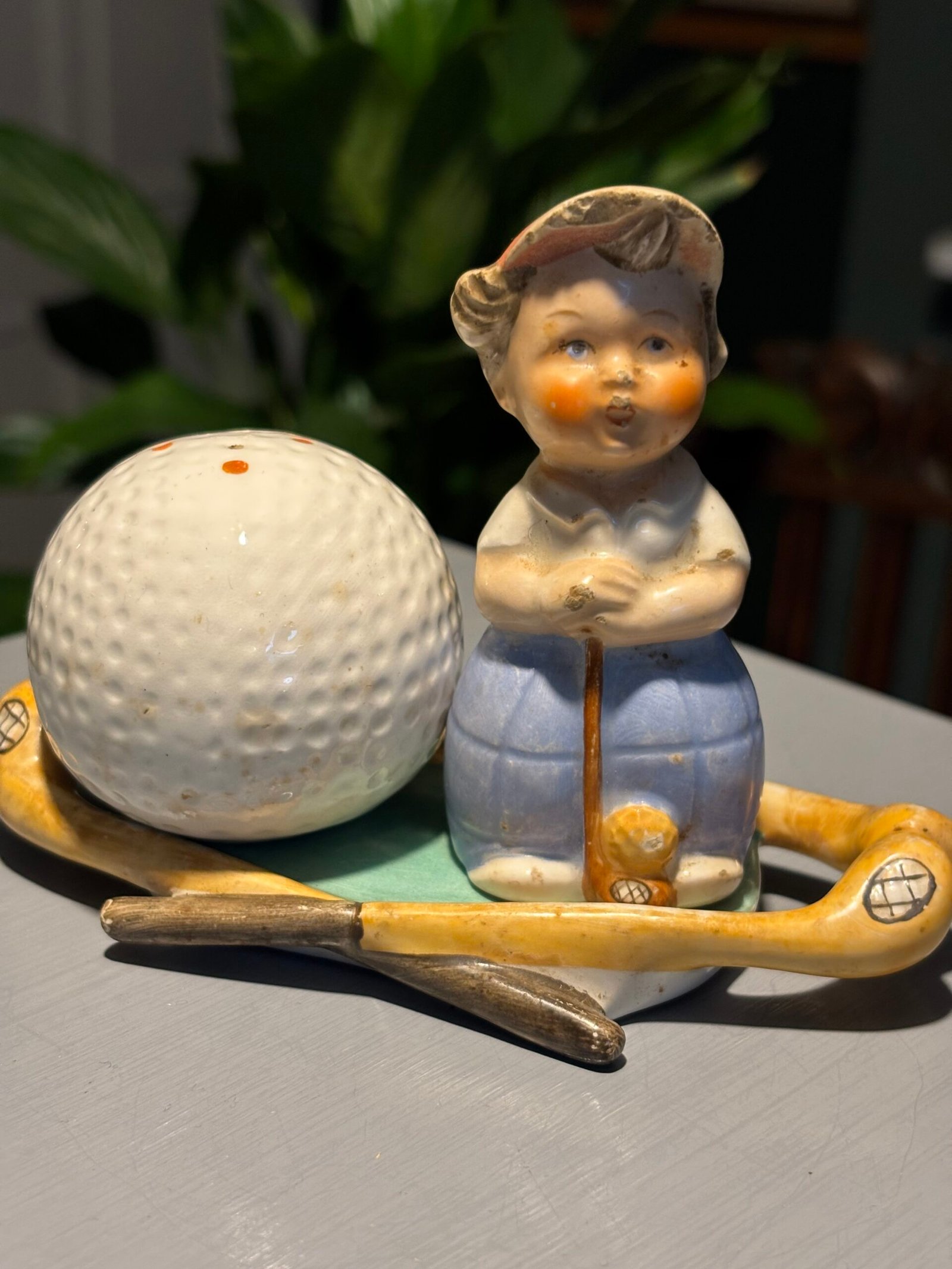 Rare vintage Goebel Hummel M28 golfer and golf ball salt & pepper shakers on golf stick base.
