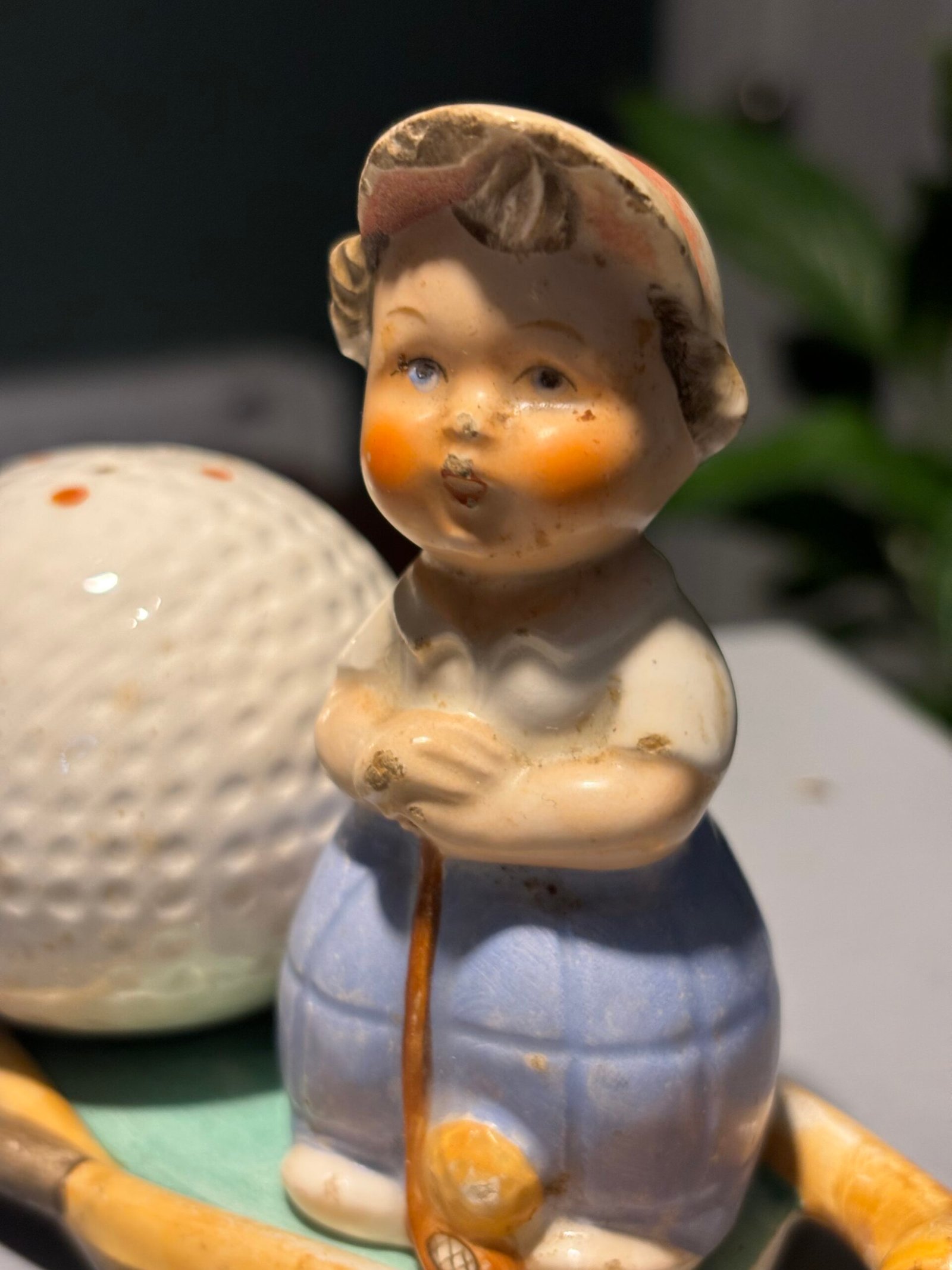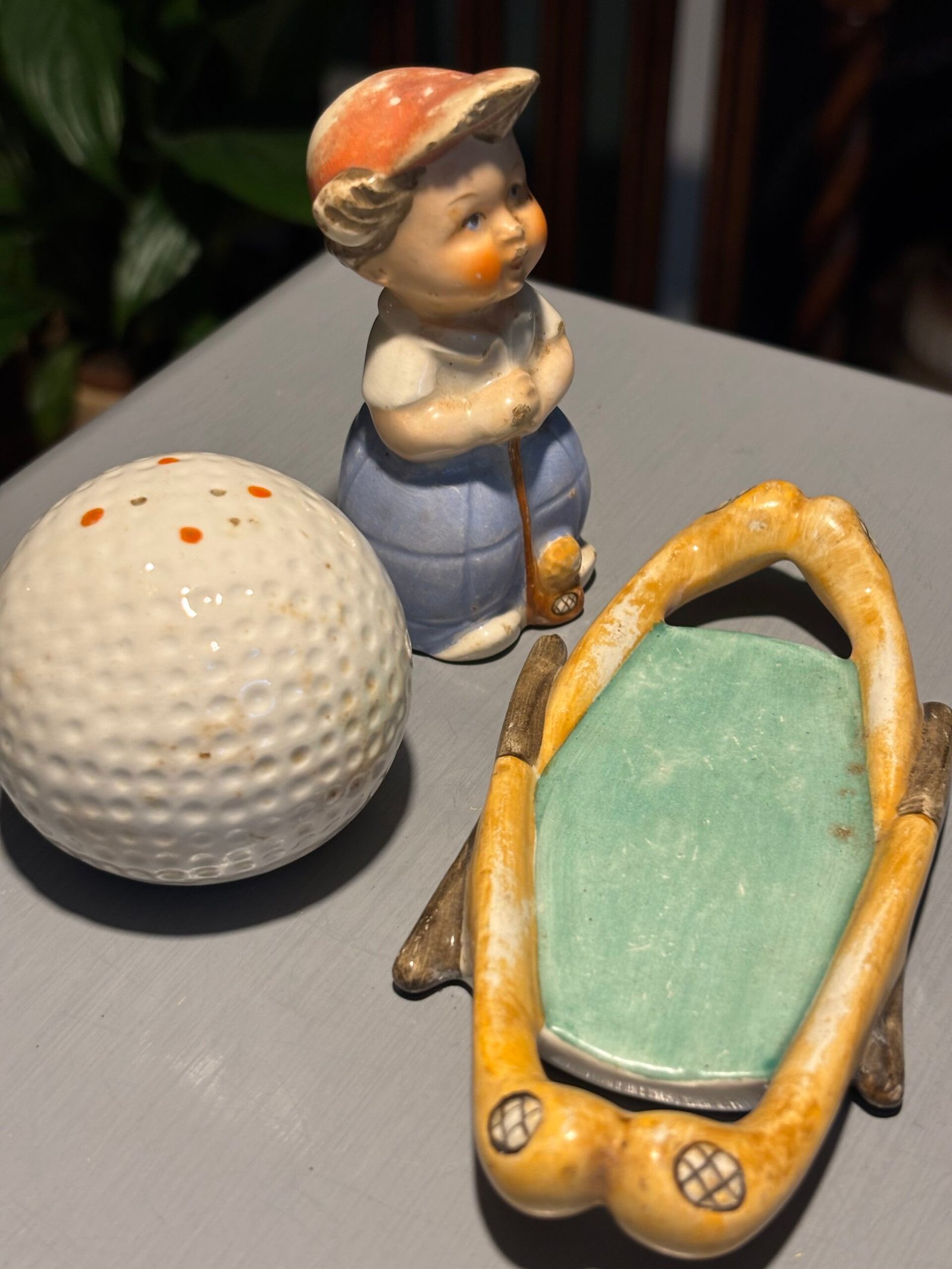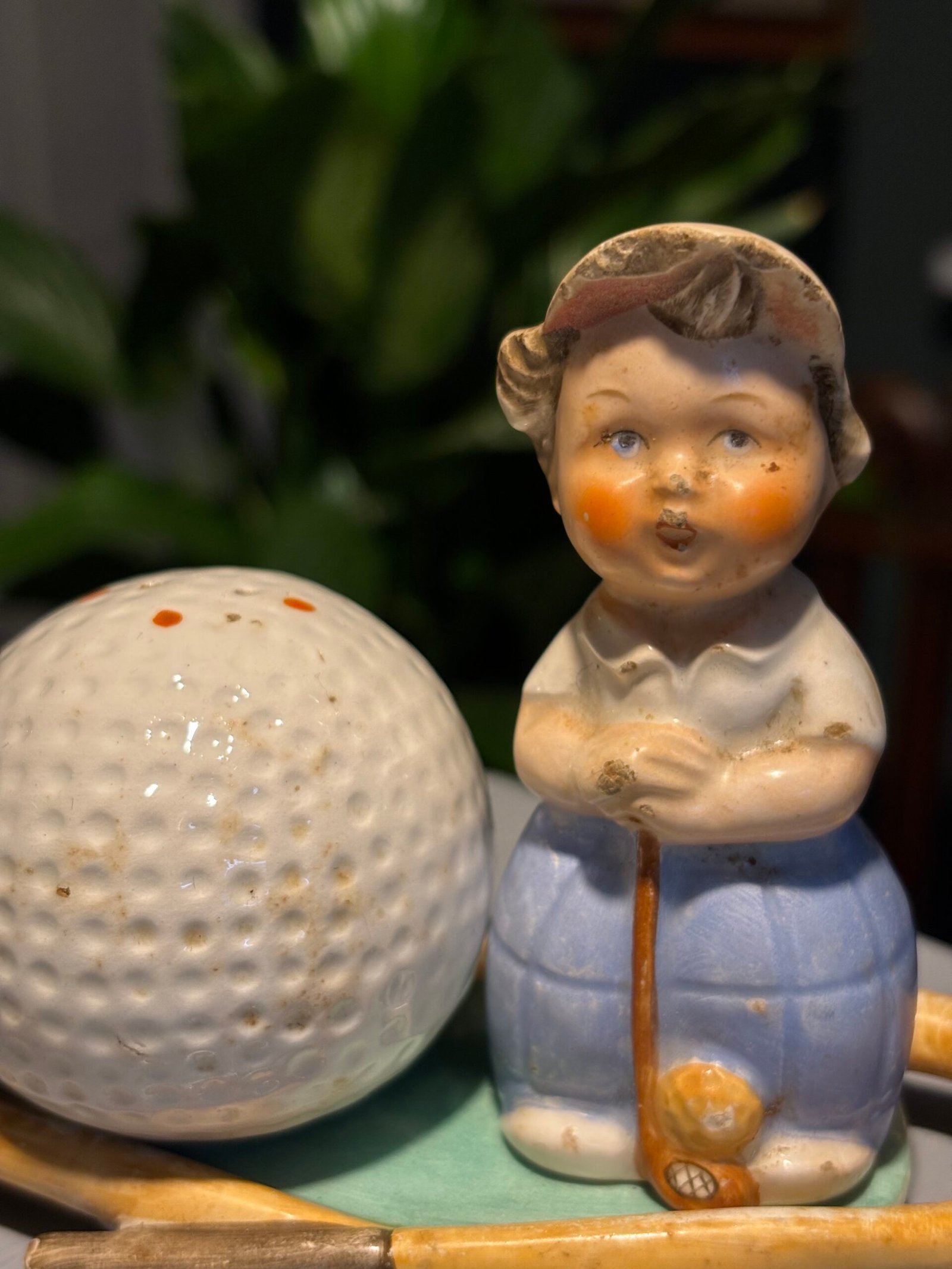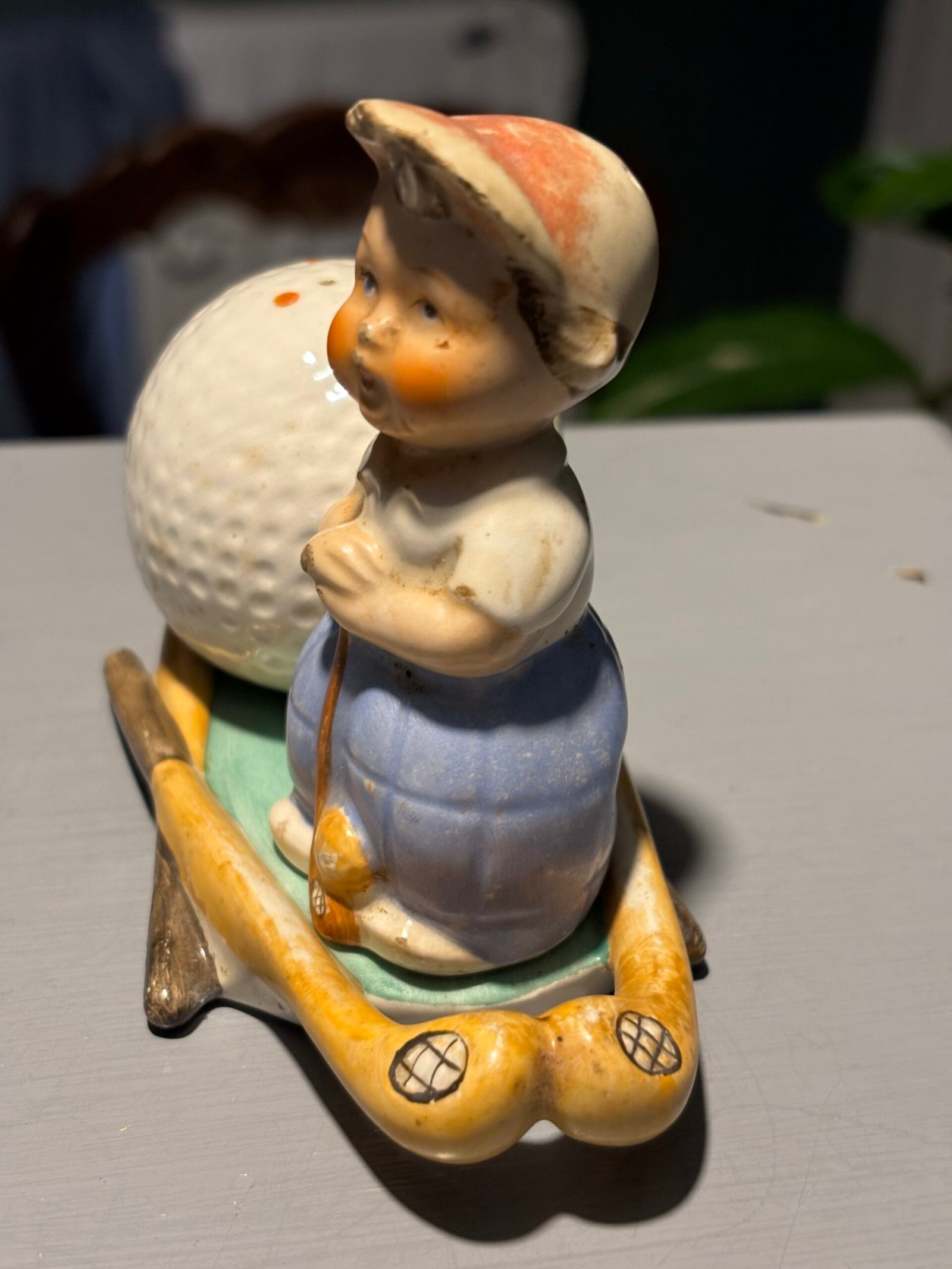Rare vintage Goebel Hummel M28 golfer and golf ball salt & pepper shakers on golf stick base.