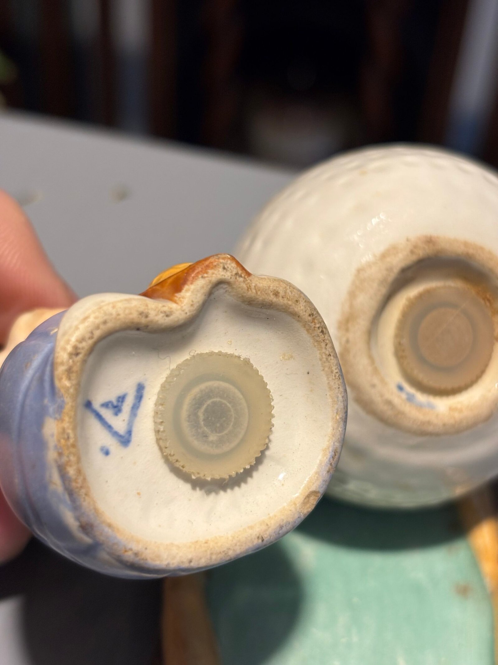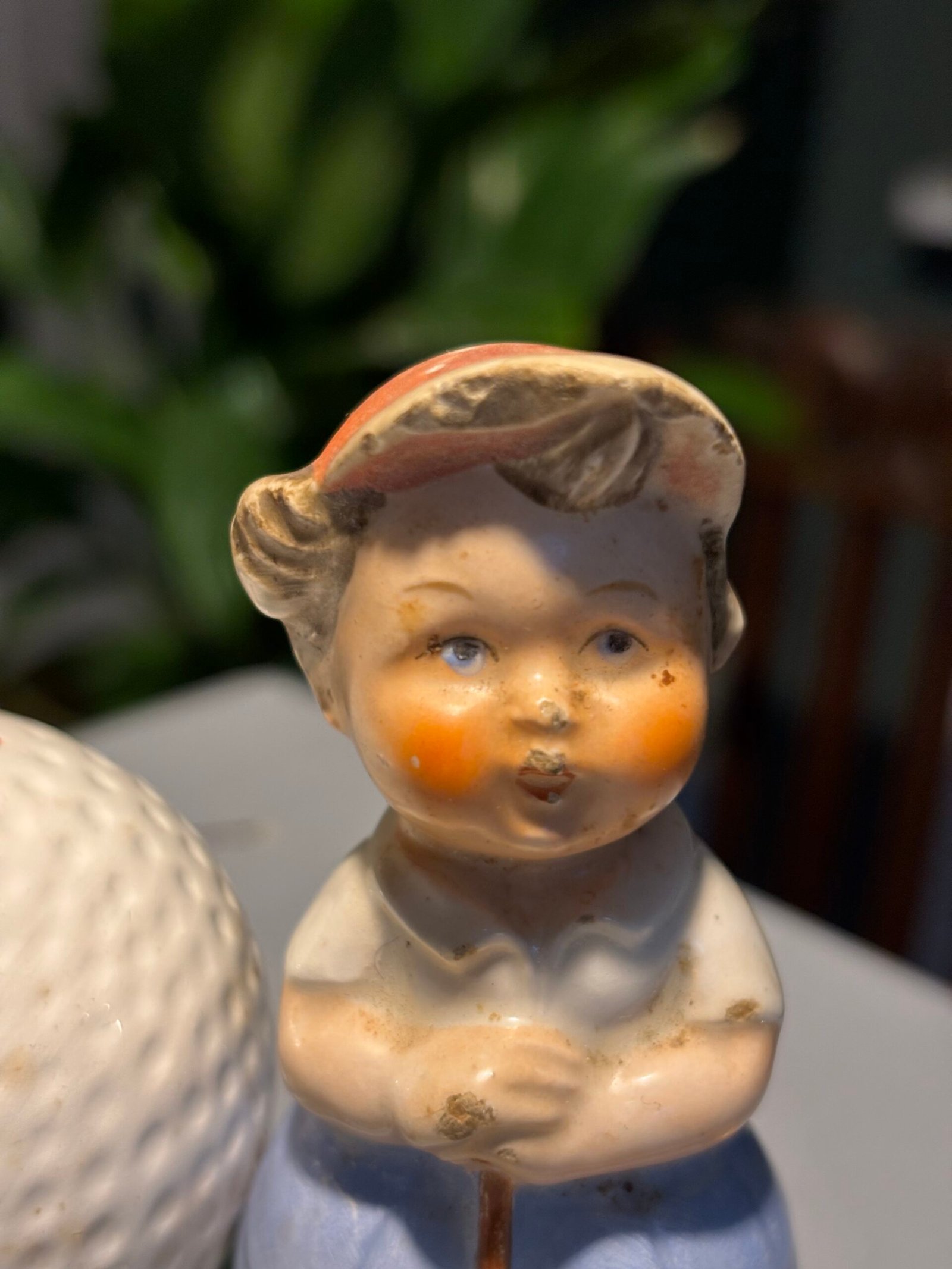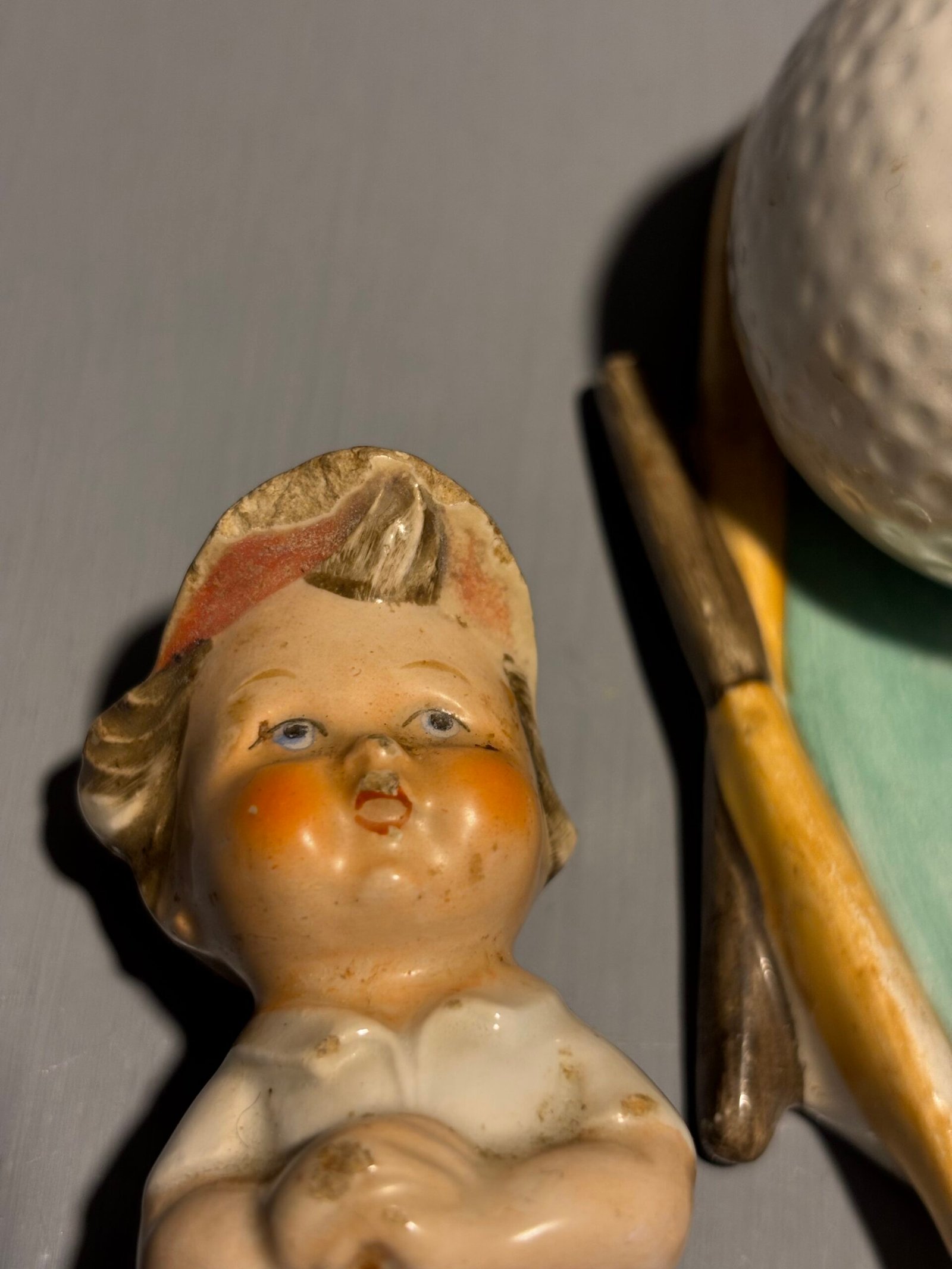 Does have a chip to hat and minor marks to face, however these were made many years ago and are not really that noticeable. Fading to colour.