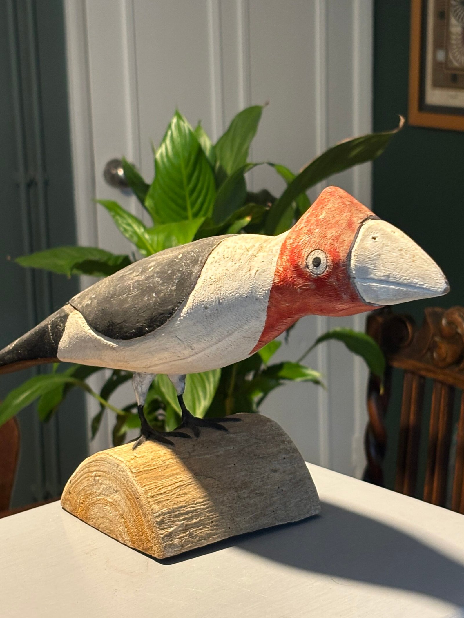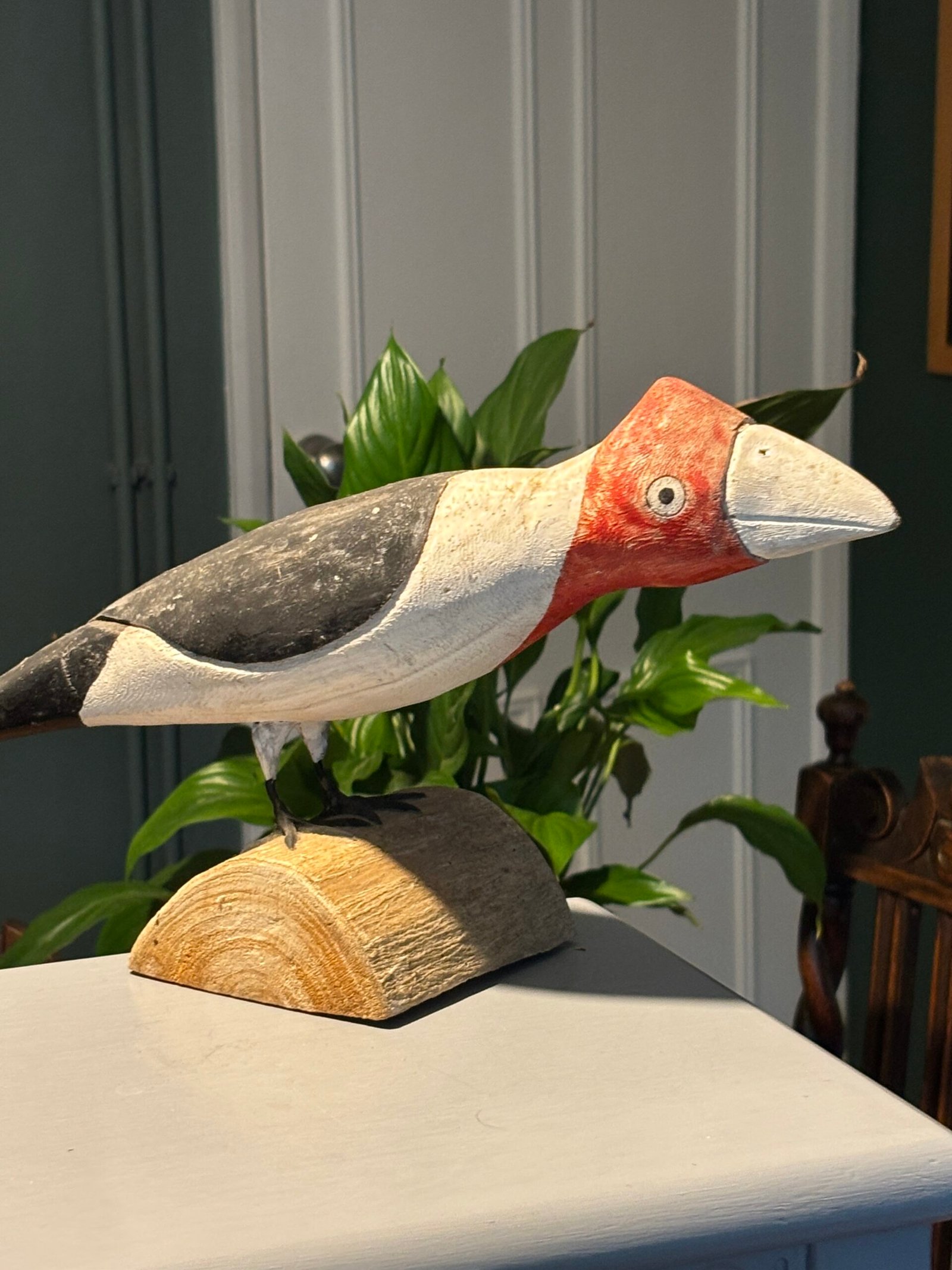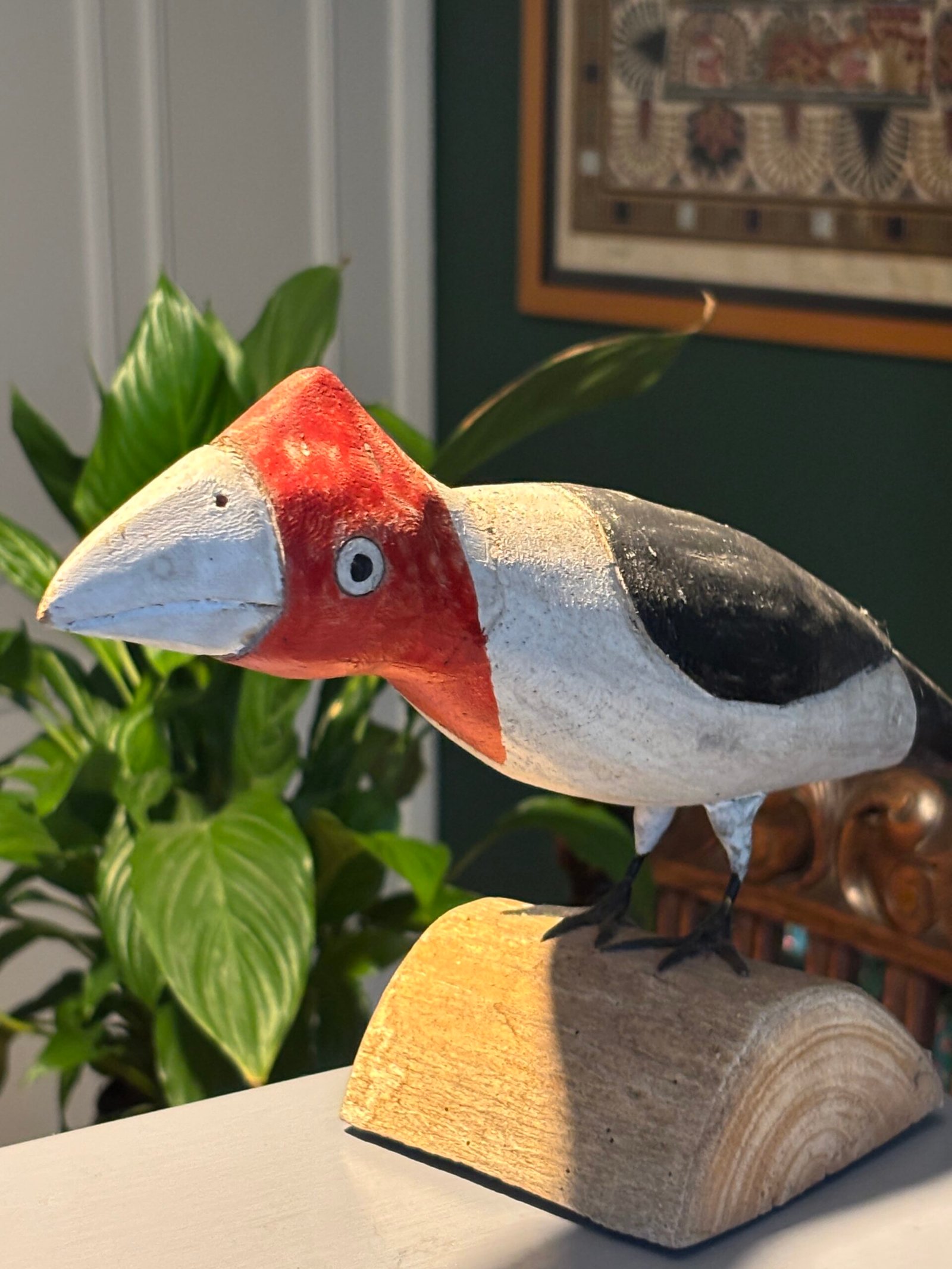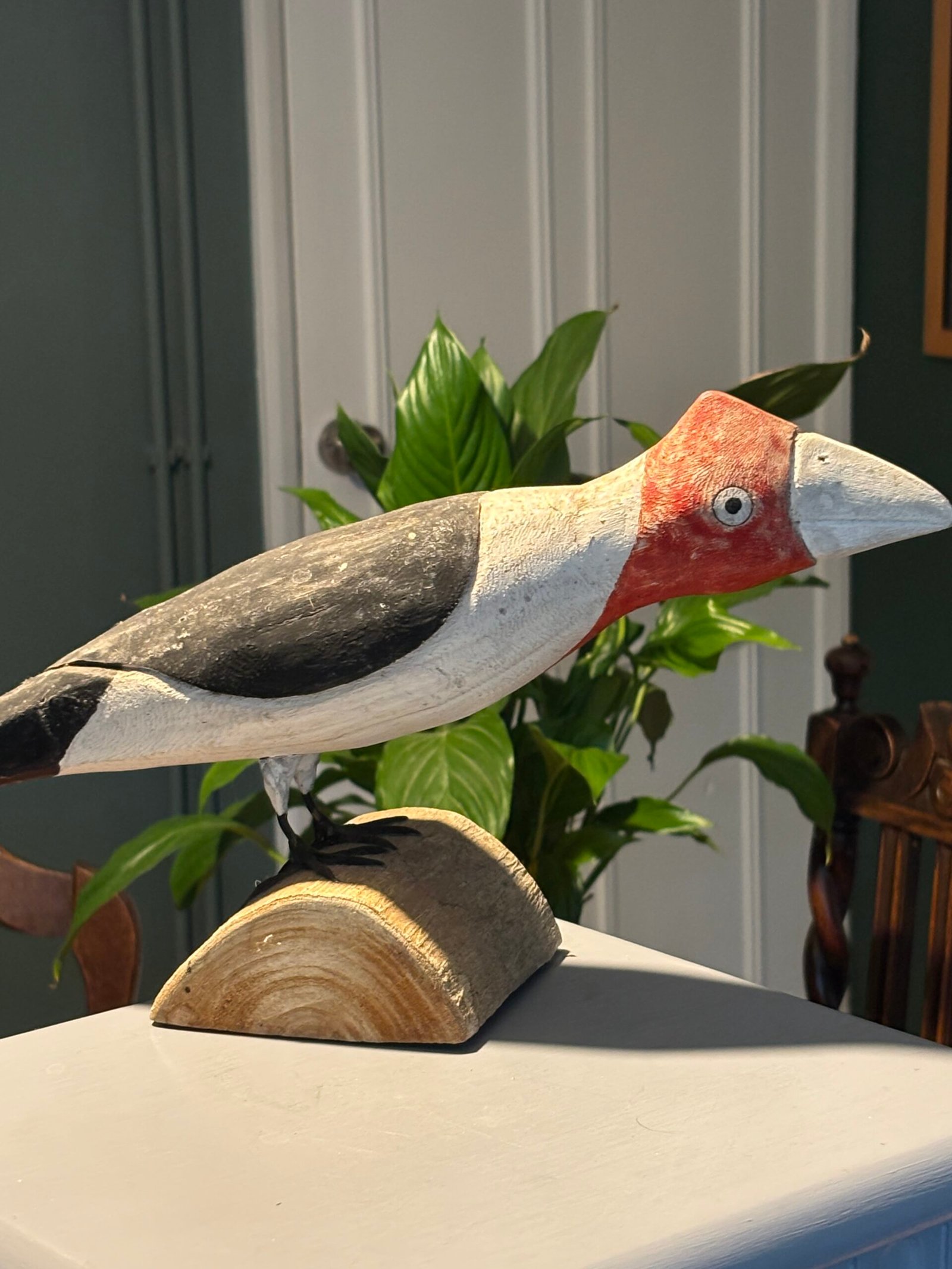 A striking and unique hand-painted wooden bird sculpture, full of character and rustic charm. This piece features a bold, stylized design with a vibrant red head, clean white breast, and dark grey/black wings.