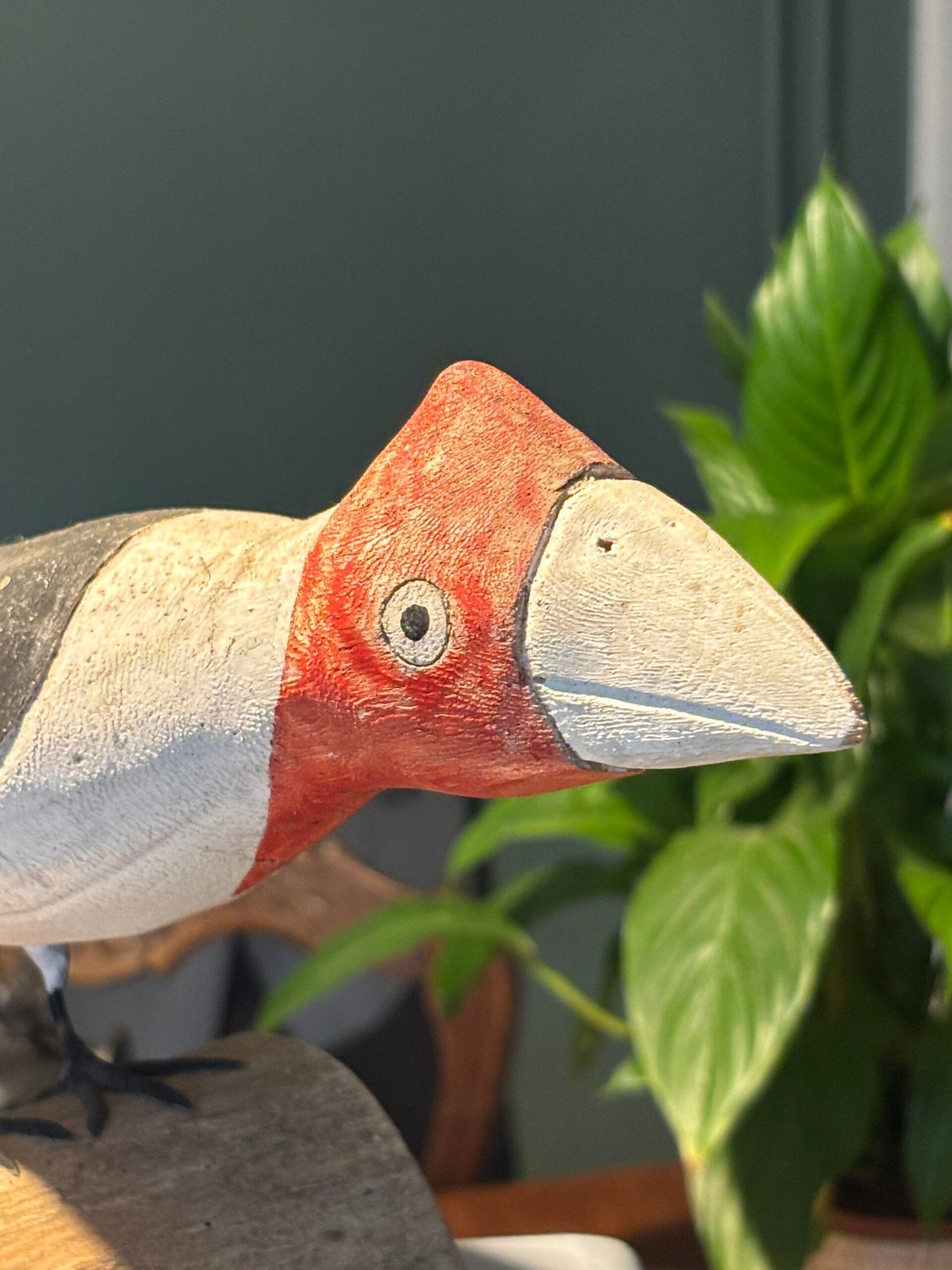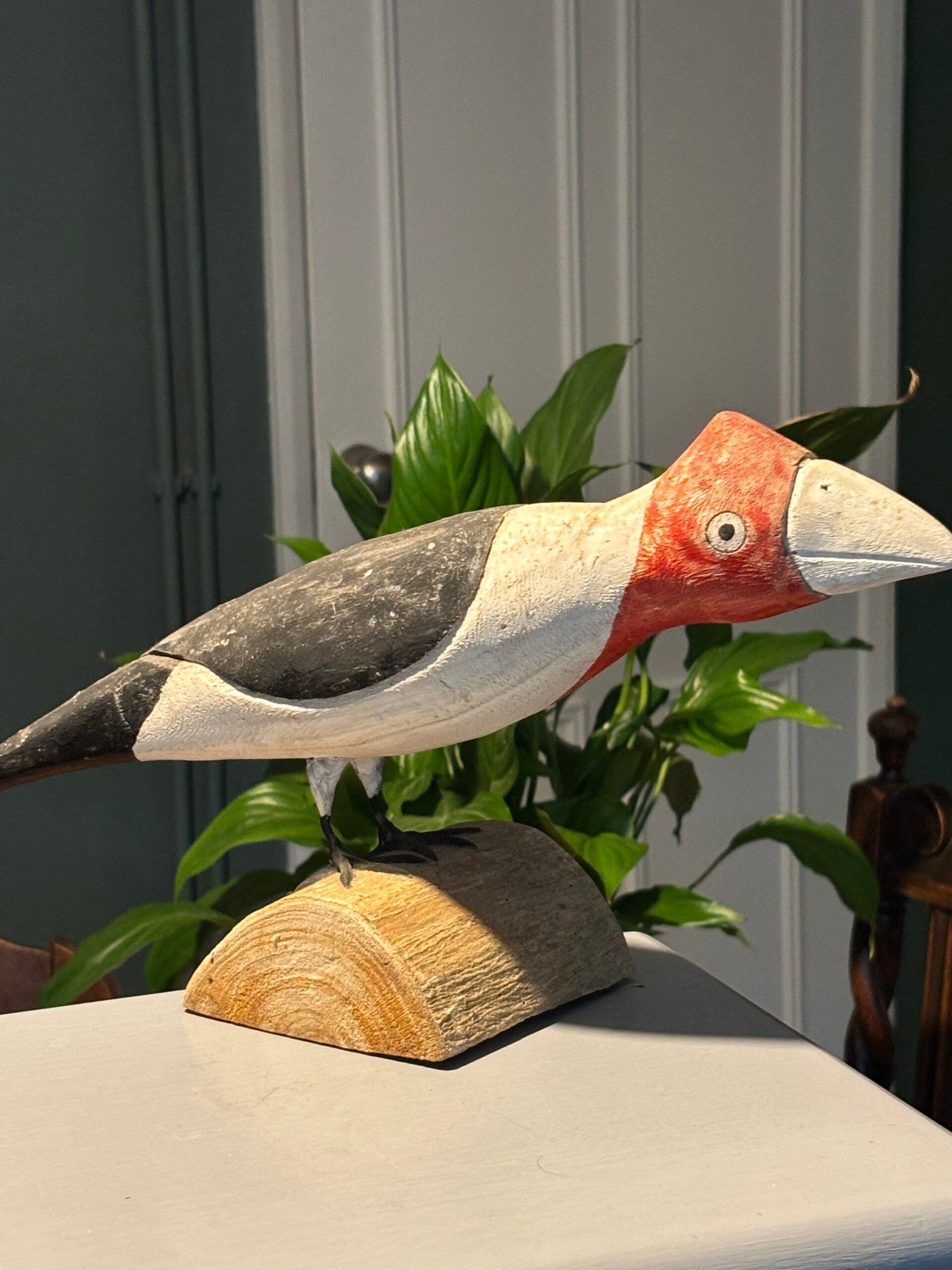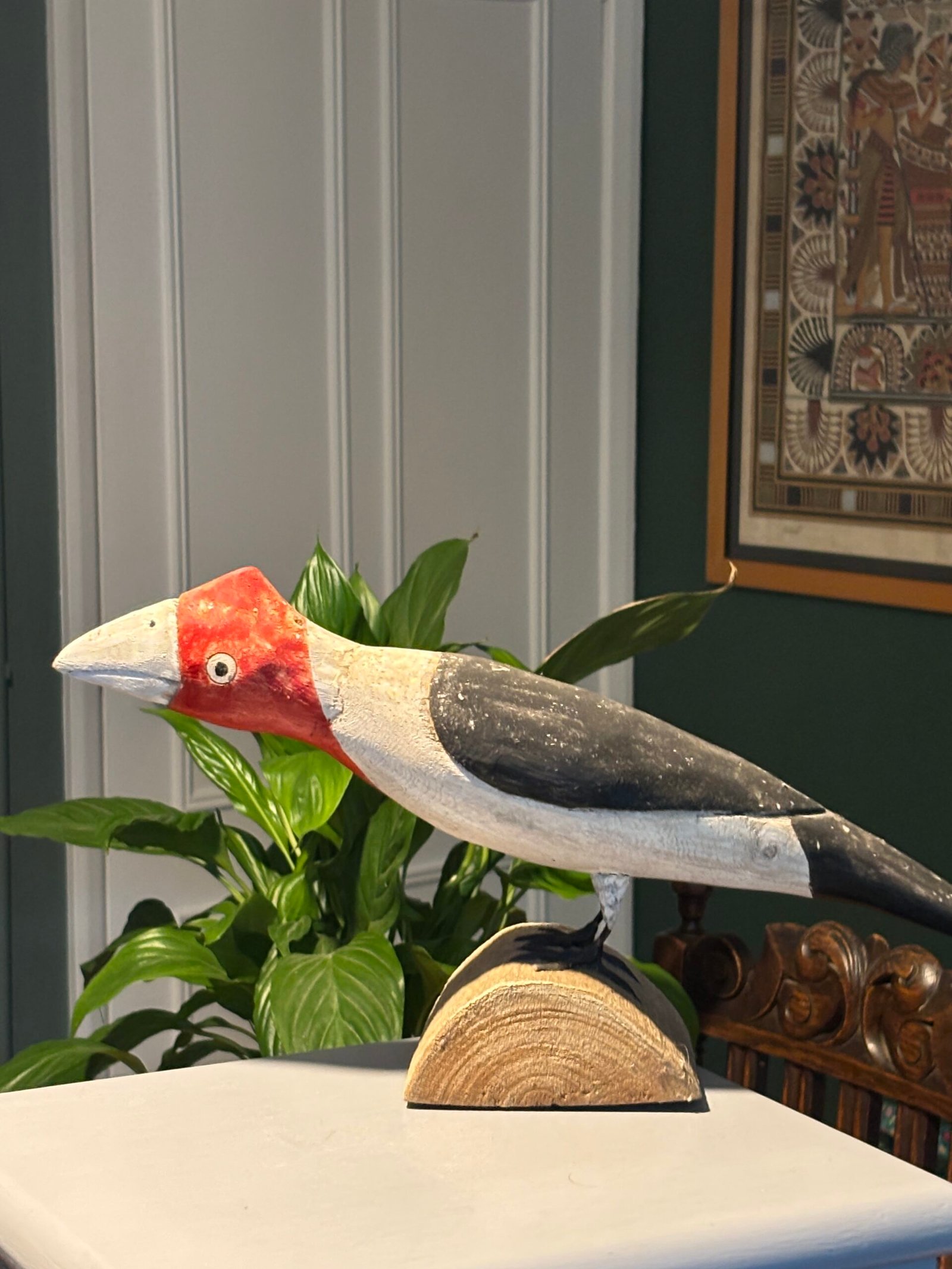 A striking and unique hand-painted wooden bird sculpture, full of character and rustic charm. This piece features a bold, stylized design with a vibrant red head, clean white breast, and dark grey/black wings.