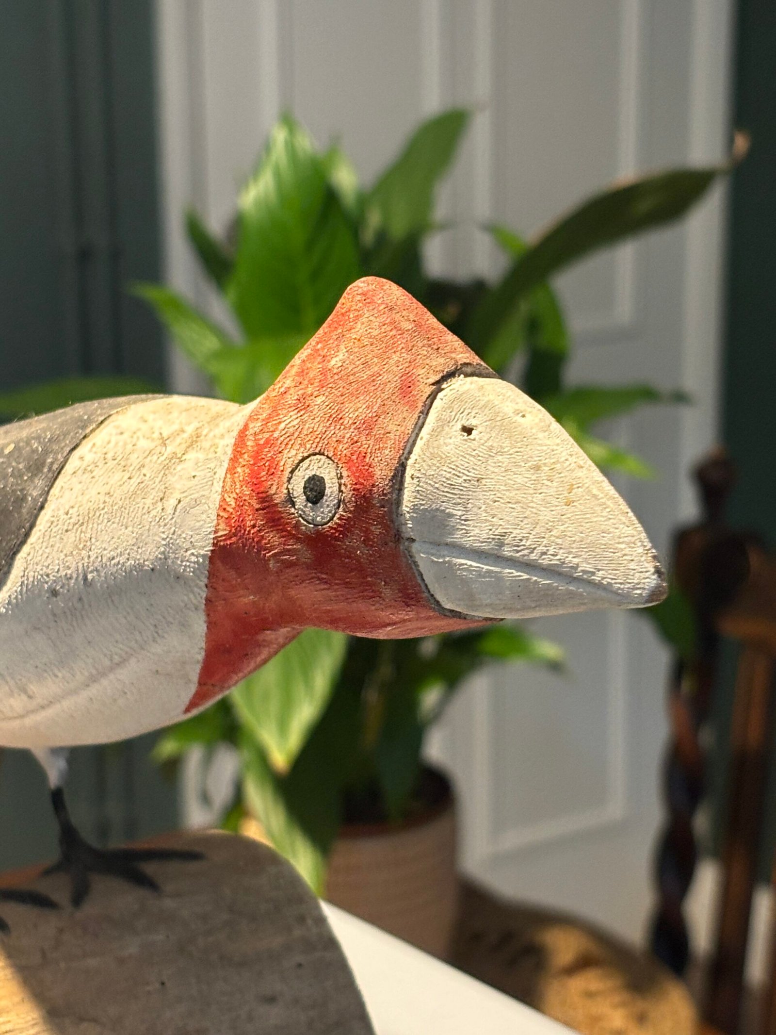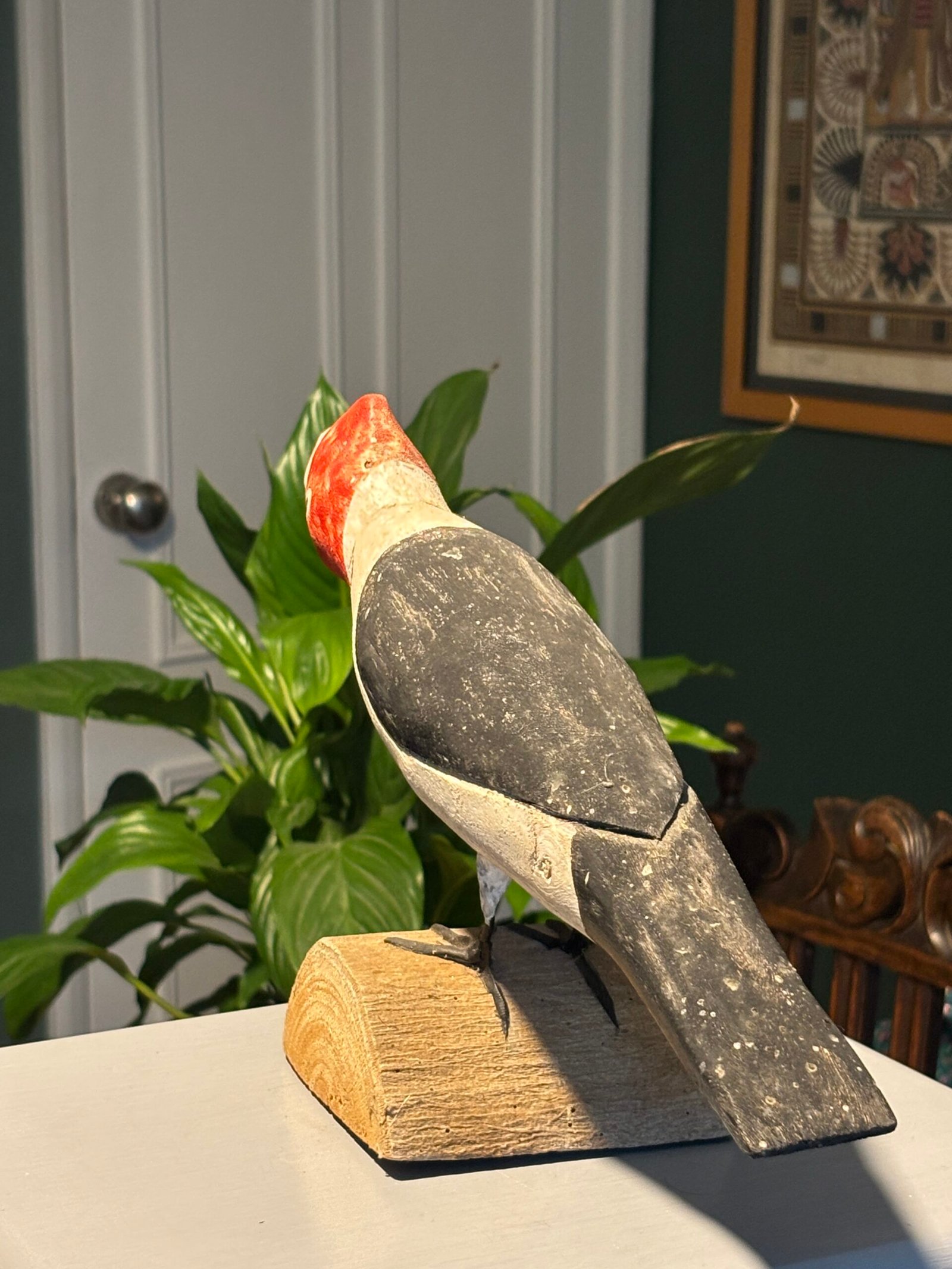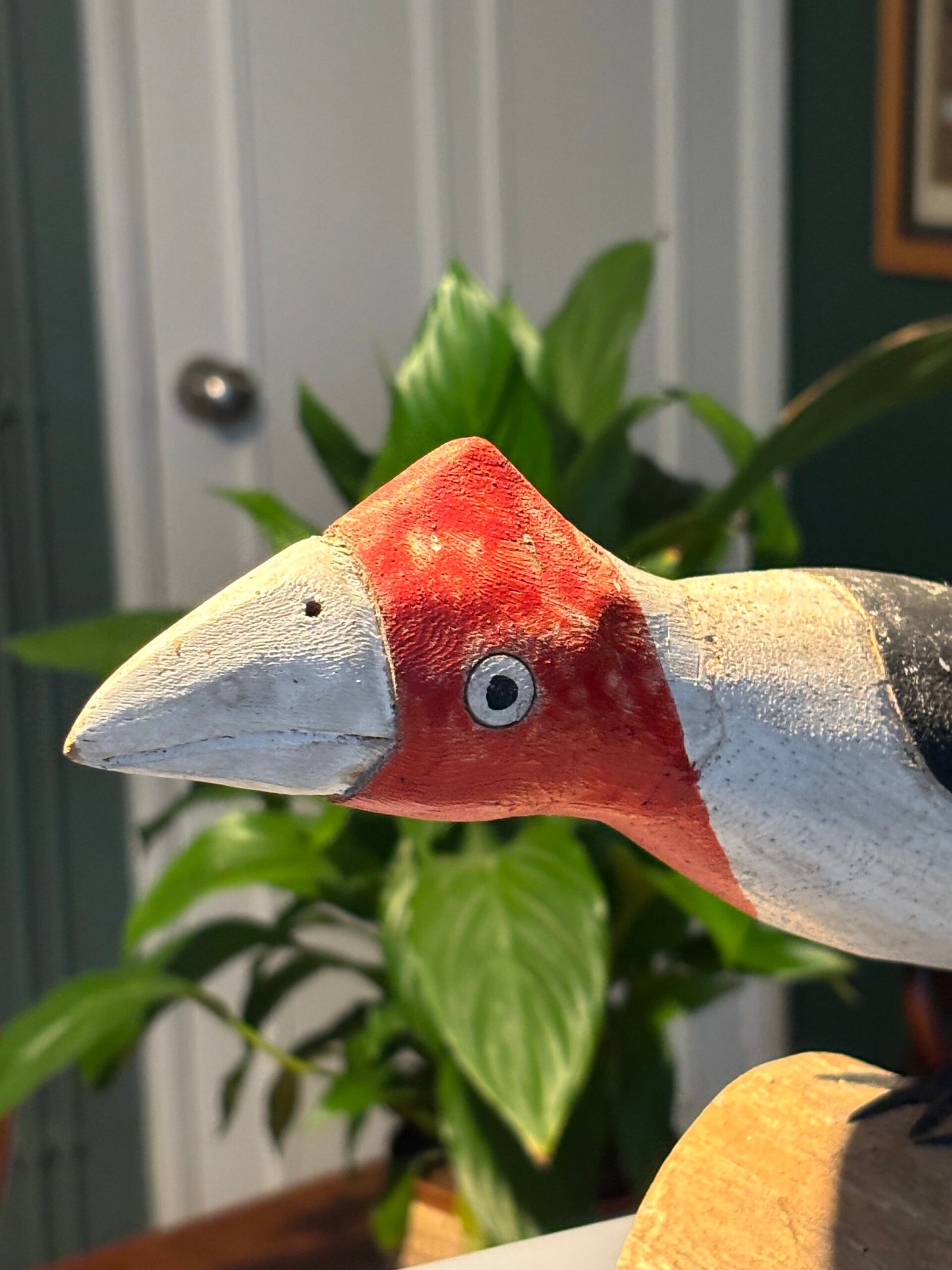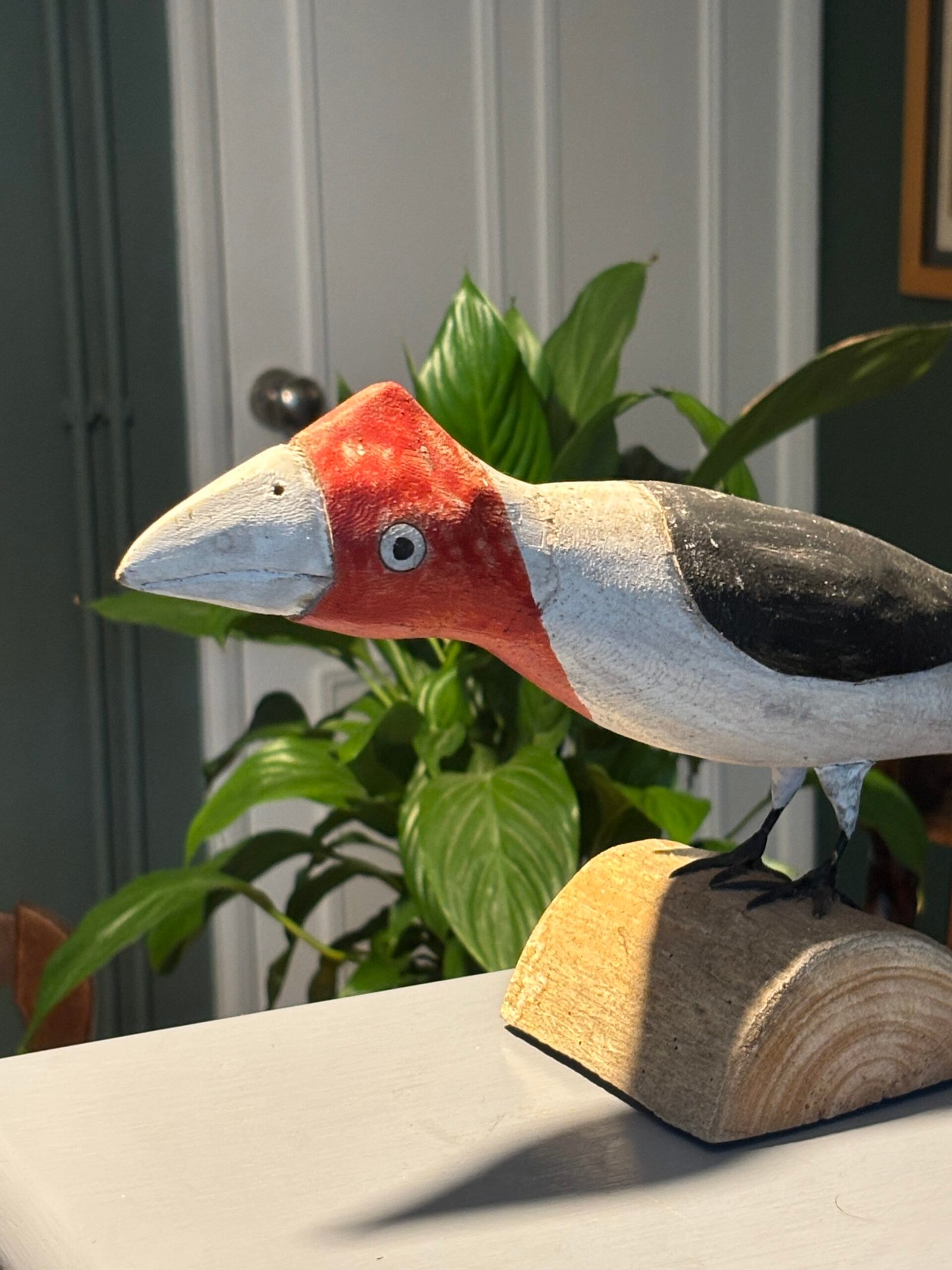 A striking and unique hand-painted wooden bird sculpture, full of character and rustic charm. This piece features a bold, stylized design with a vibrant red head, clean white breast, and dark grey/black wings.