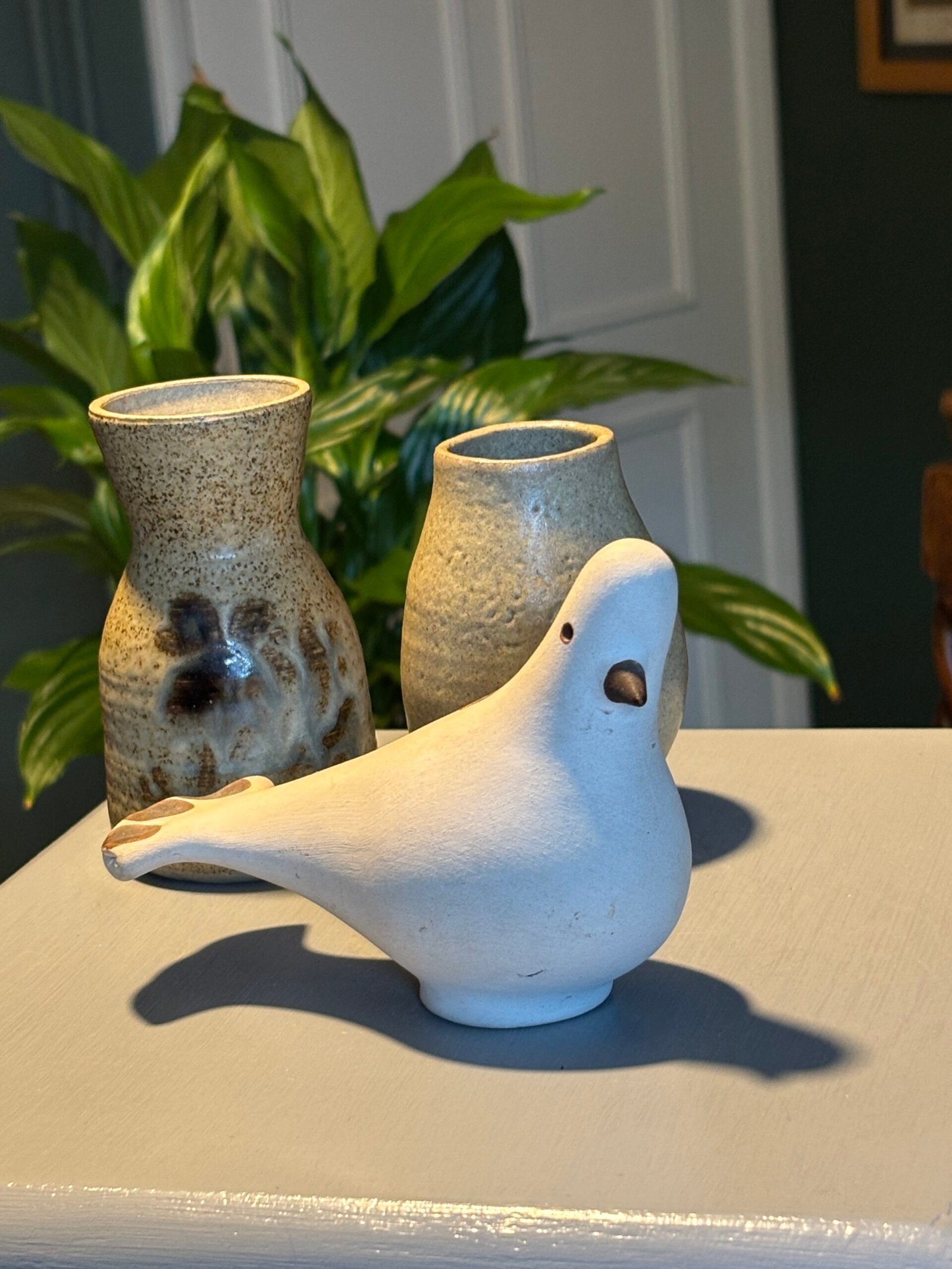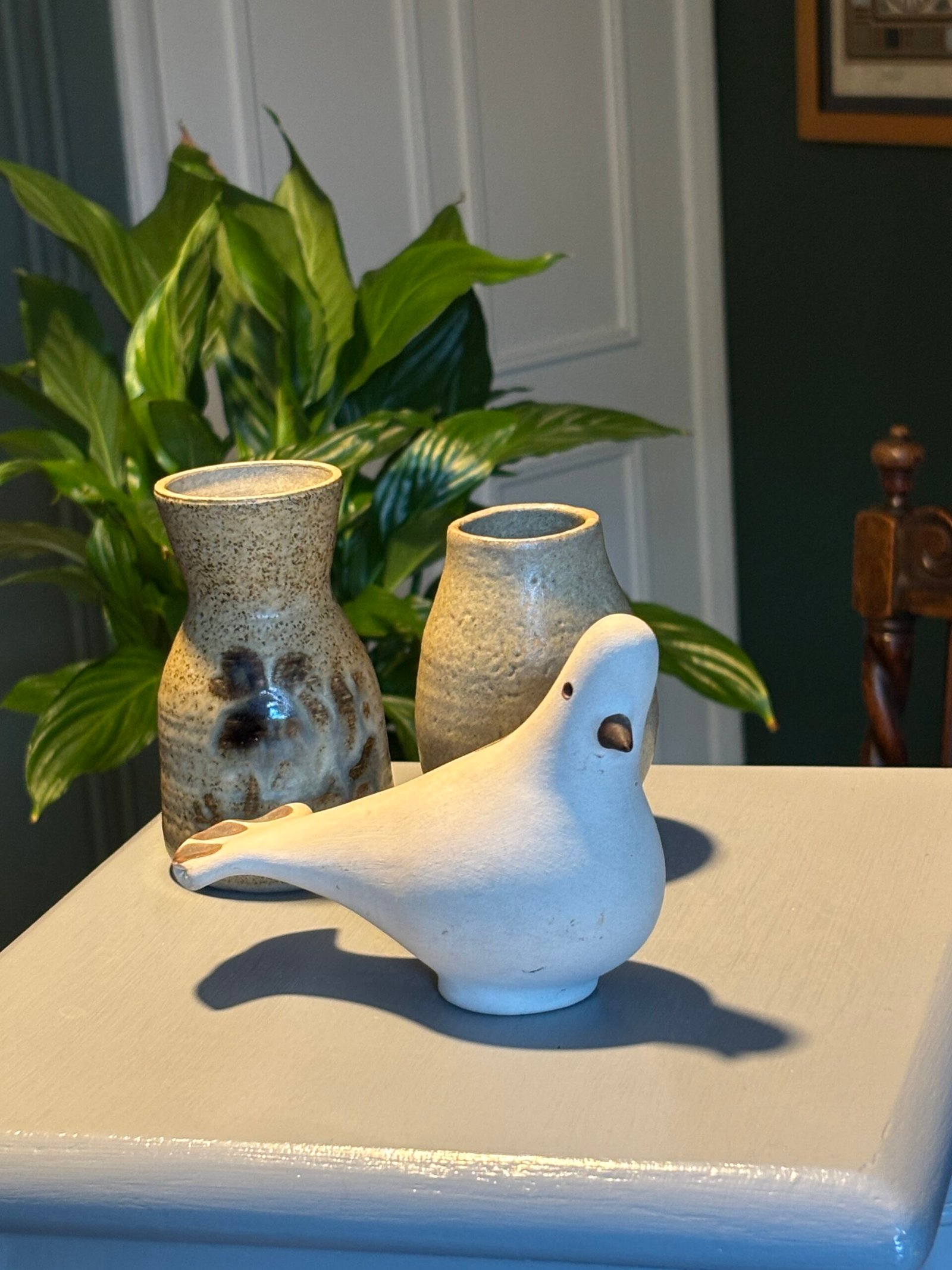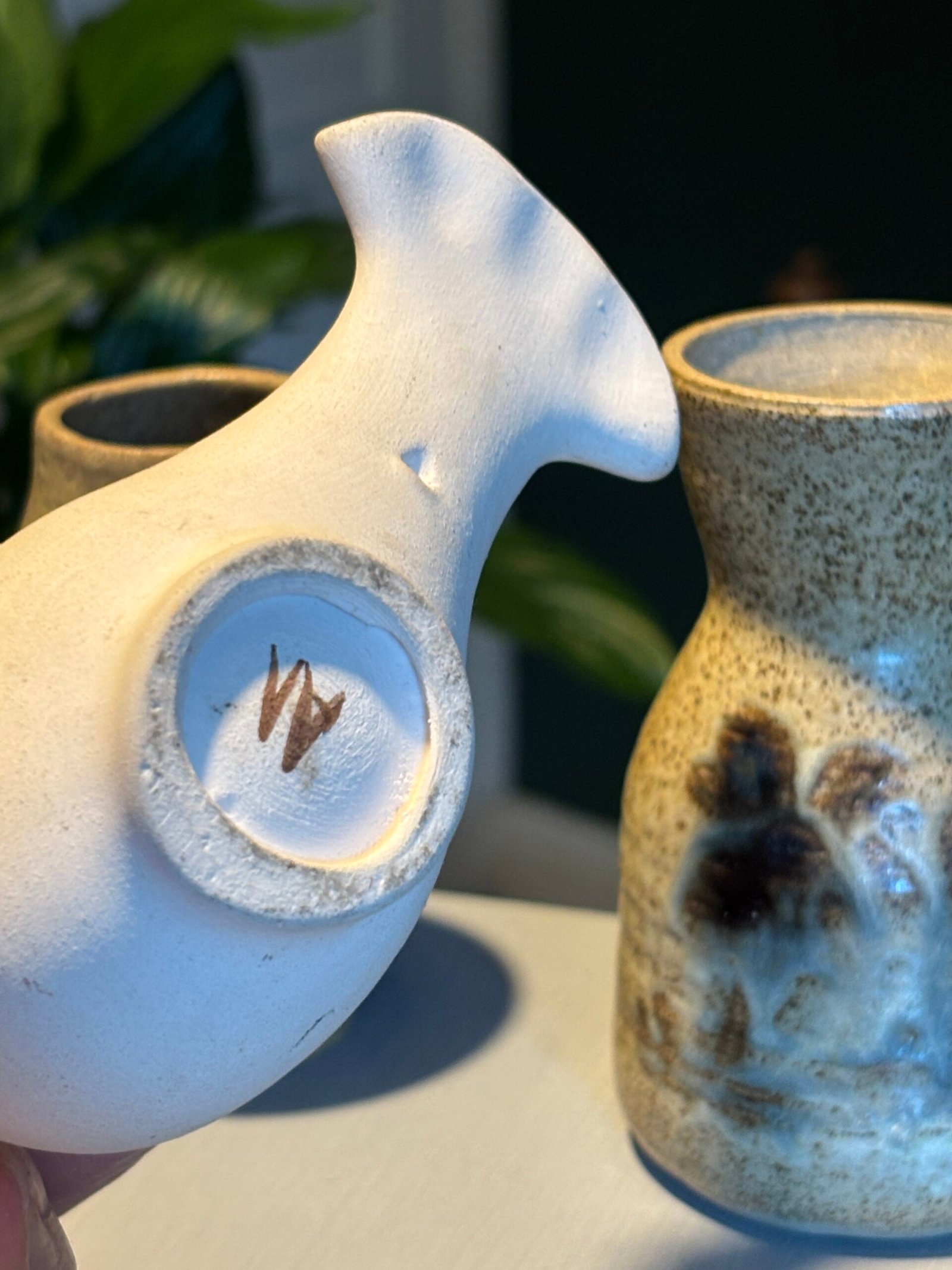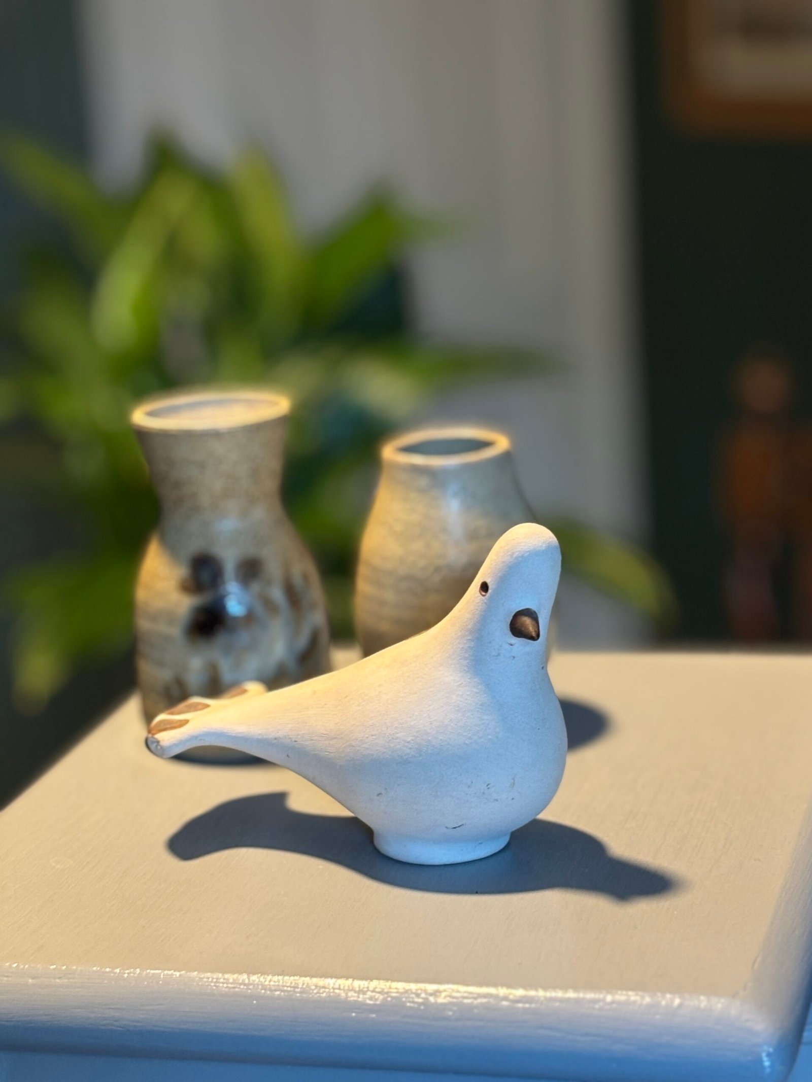 The Set Includes: Artisan Bird Figurine: A stunning matte stoneware bird with hand-painted details. Signed by the artist on the base (see photos).