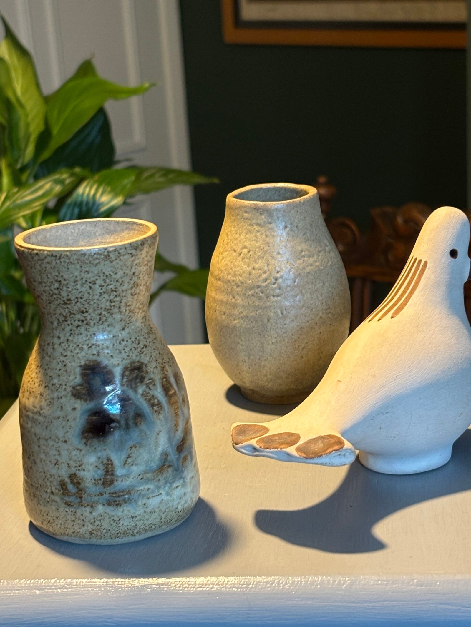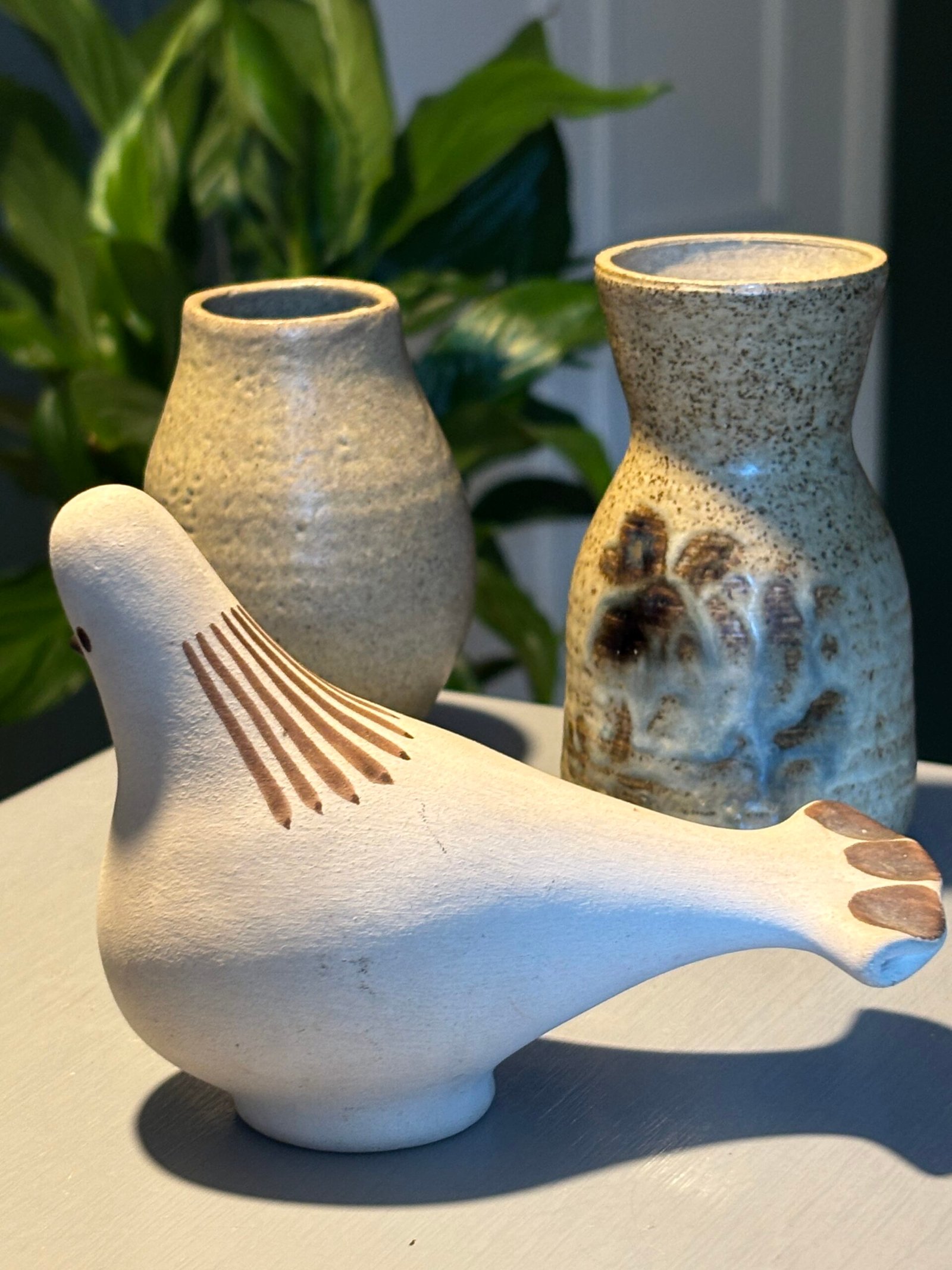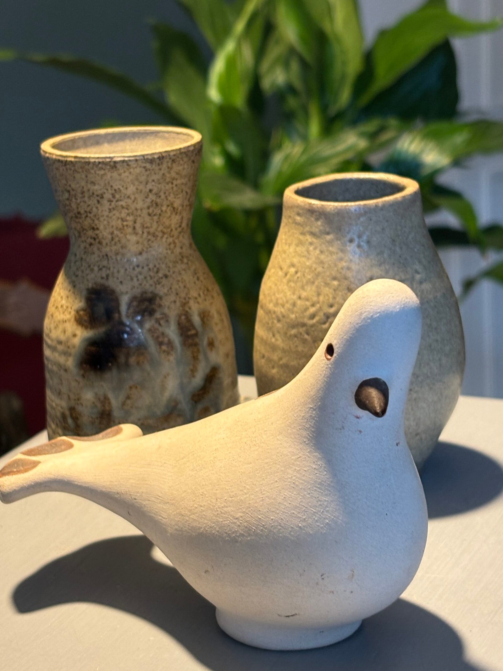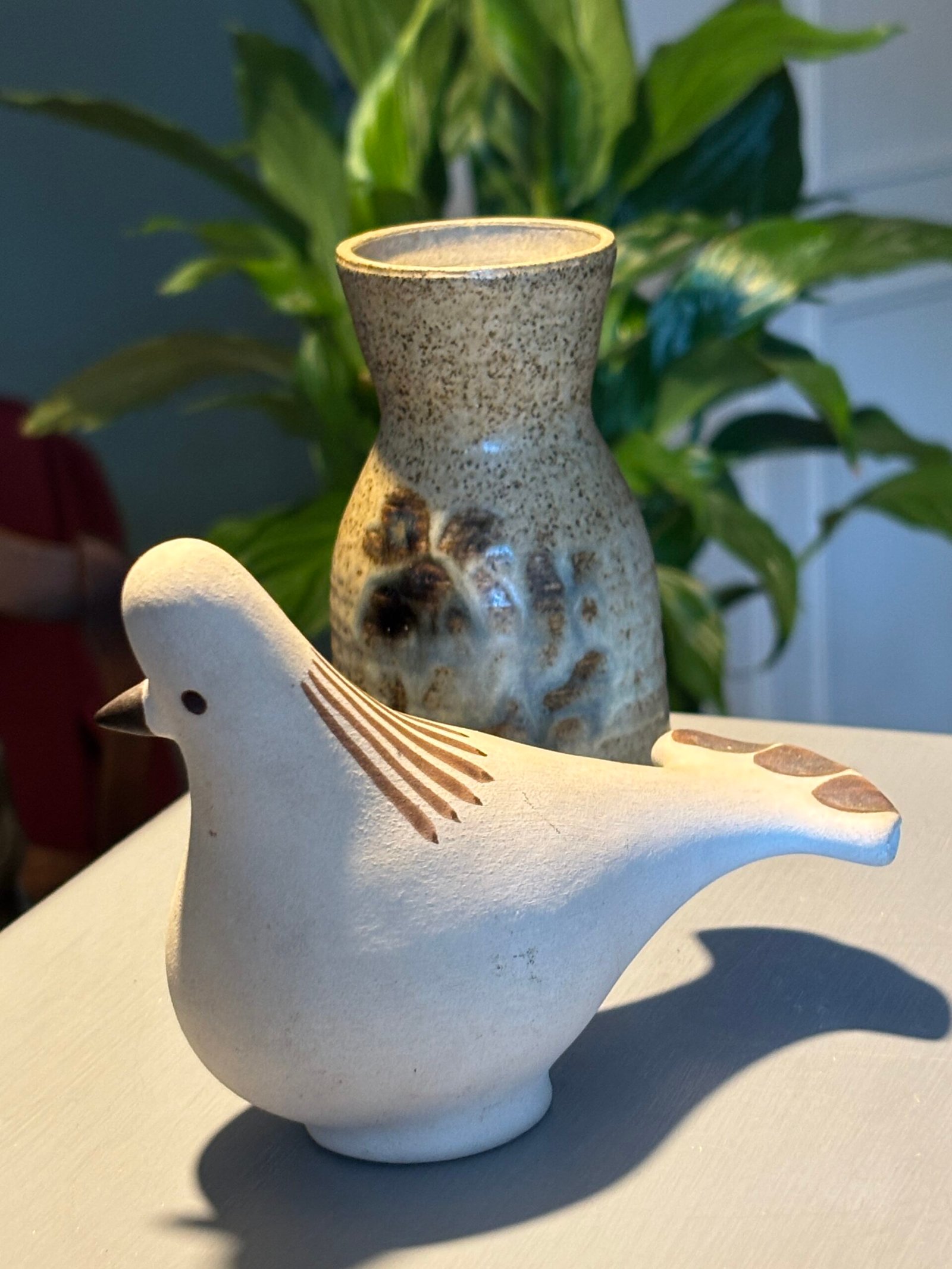 The Set Includes: Artisan Bird Figurine: A stunning matte stoneware bird with hand-painted details. Signed by the artist on the base (see photos).