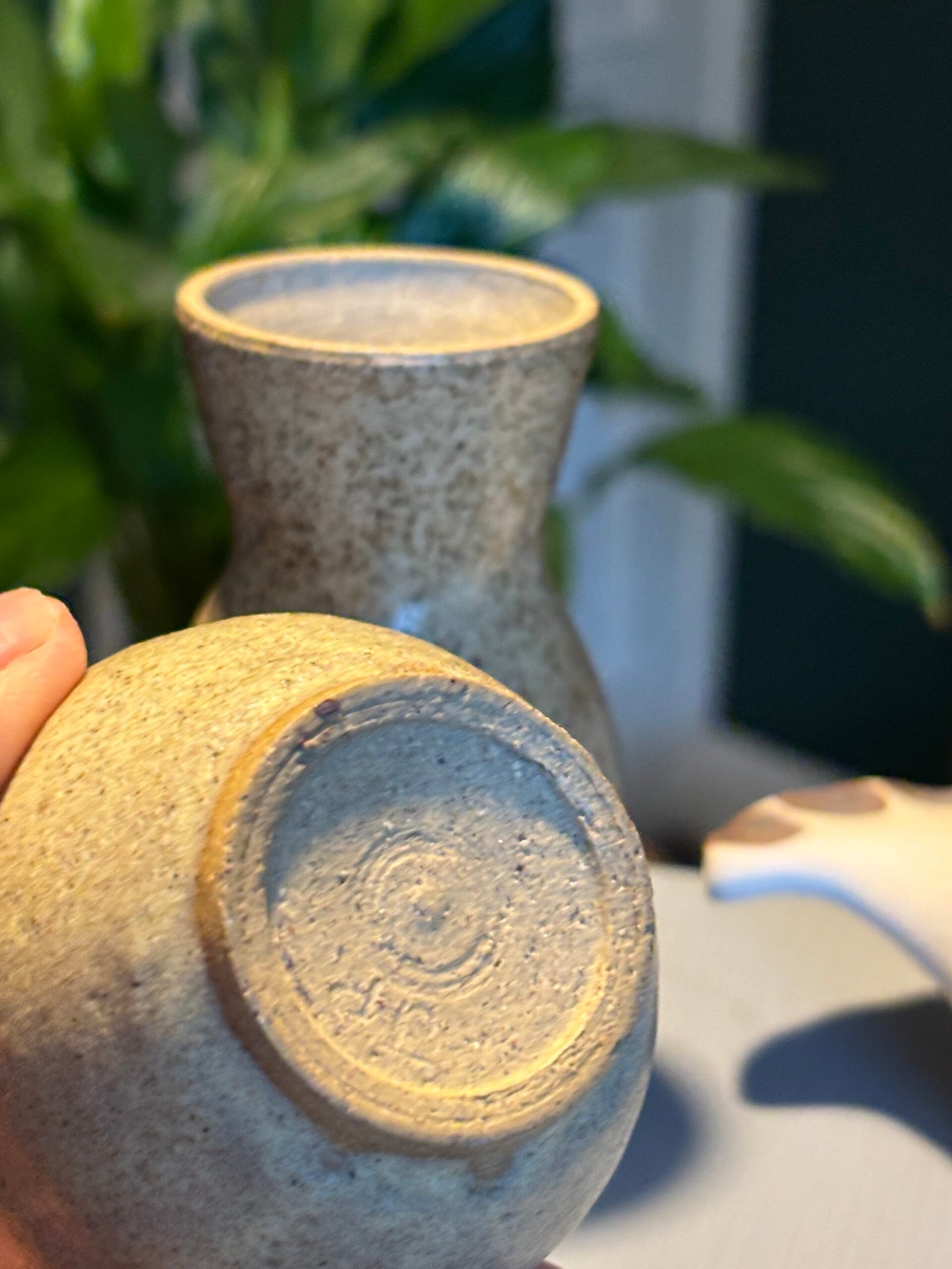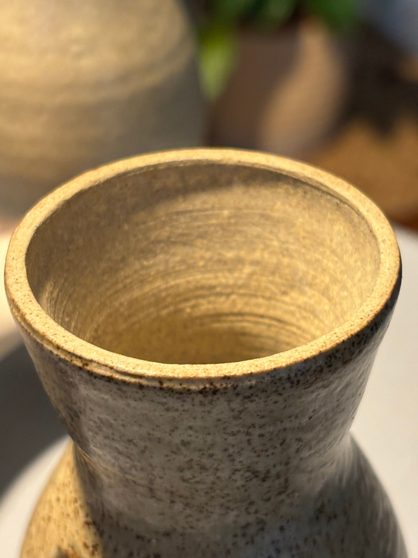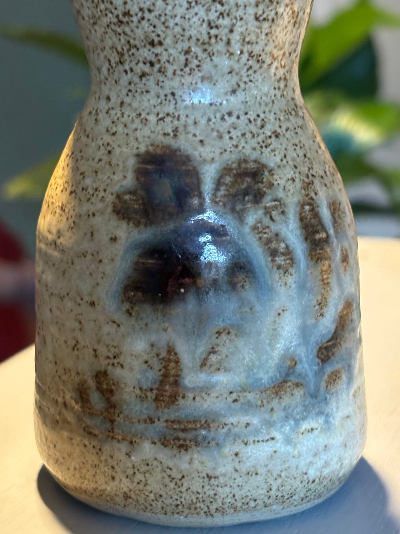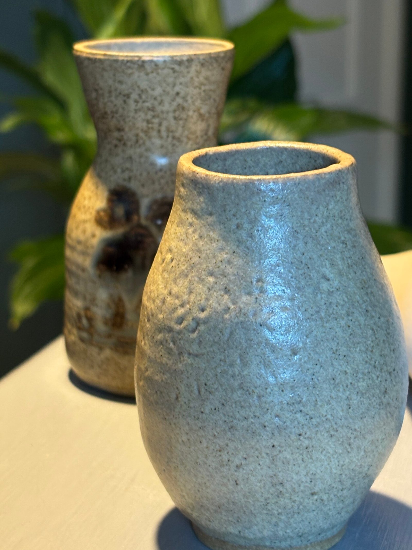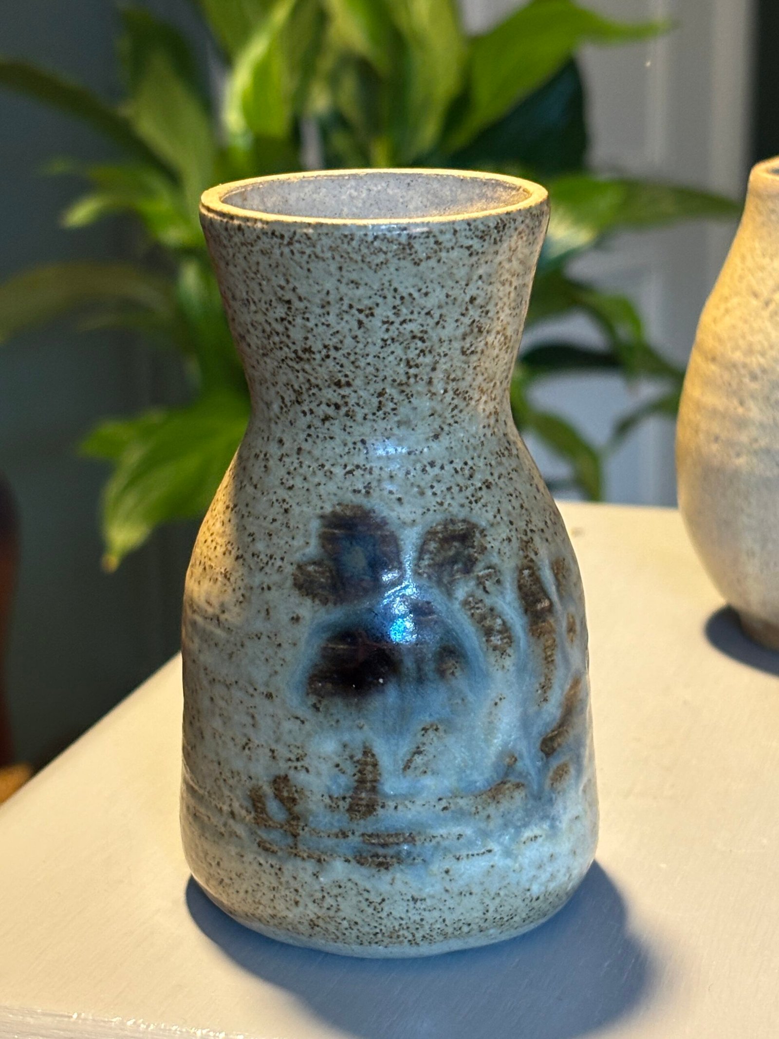 Textured Bud Vase: Bulbous shape with a tactile, sandy-speckled glaze. Abstract Glazed Bud Vase: Tapered silhouette with a unique dark oxide/cobalt flourish. All in great condition.