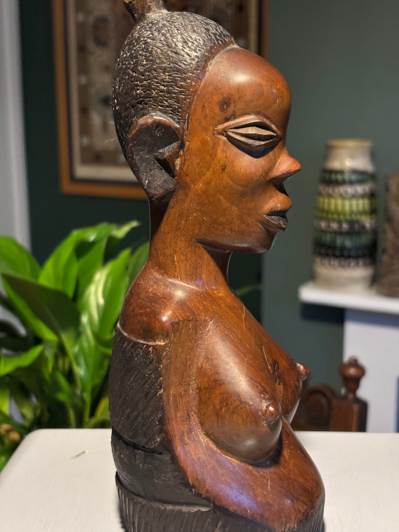 Vintage African woman hand carved wooden bust.