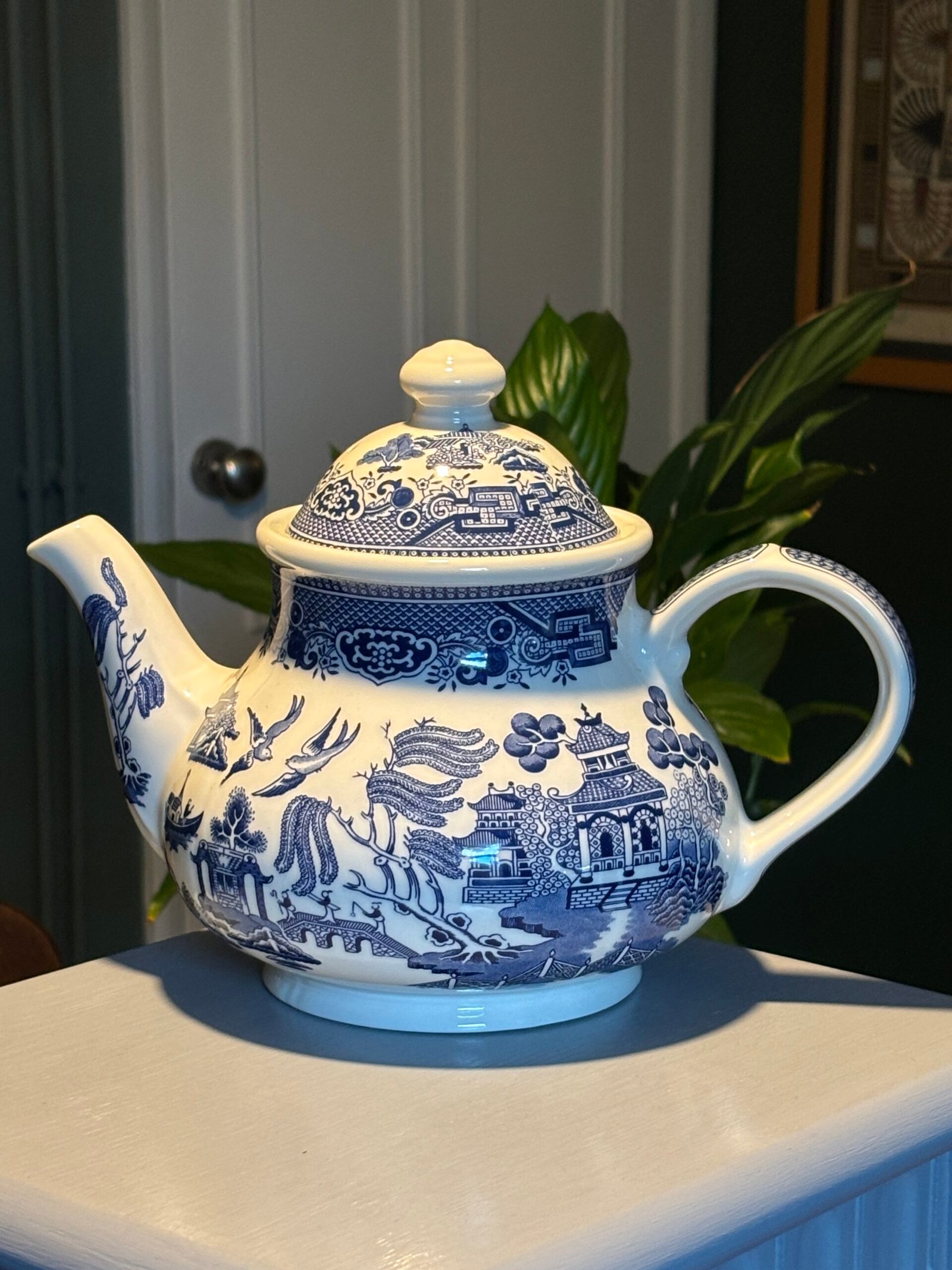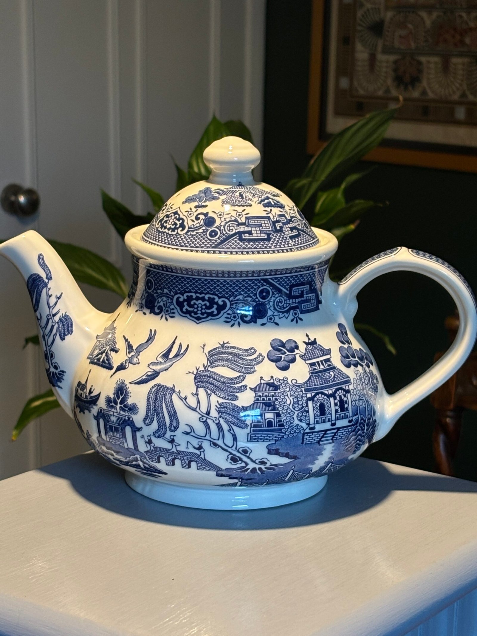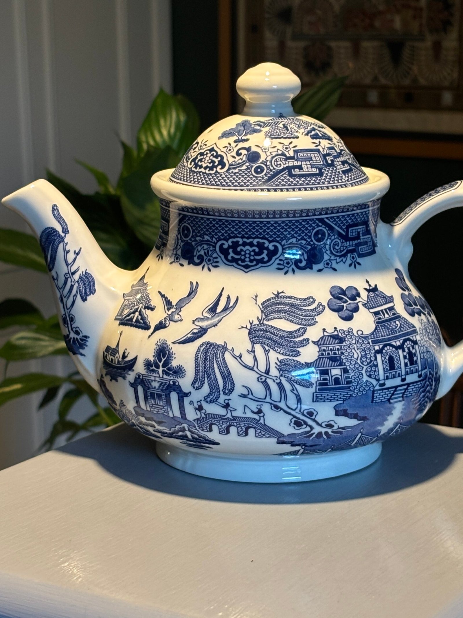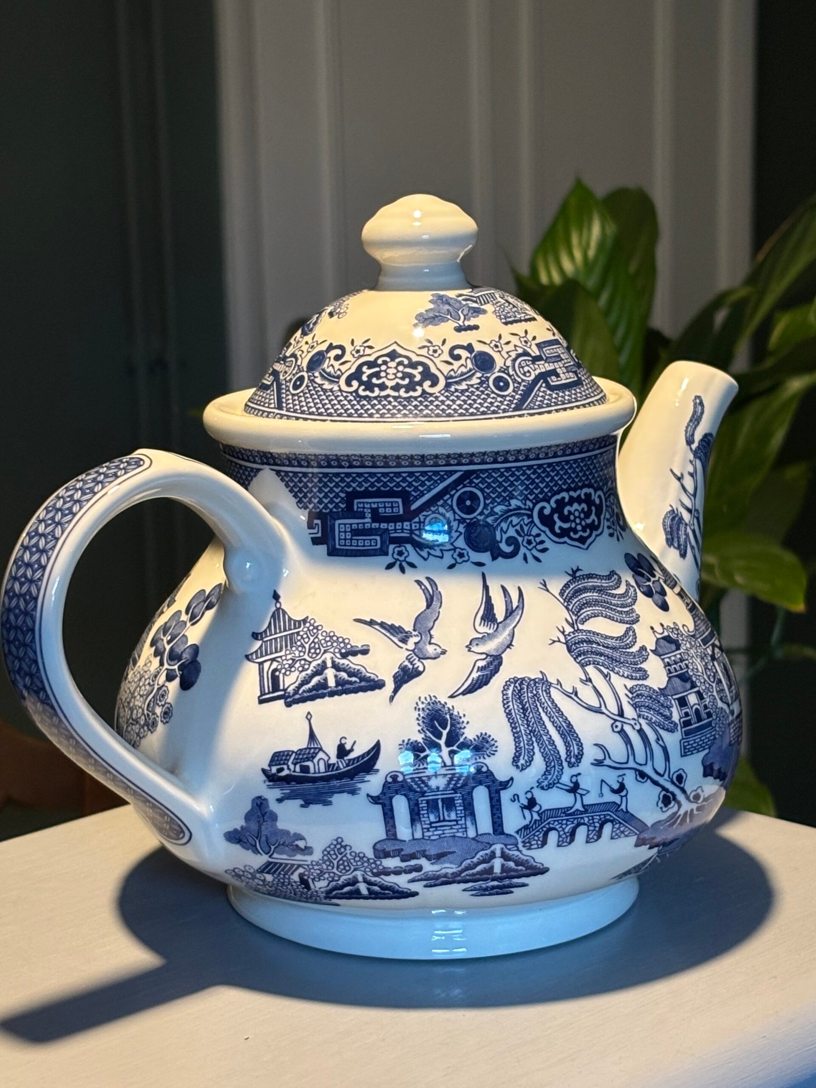 A beautiful tea pot in the classic Blue Willow pattern by Churchill Staffordshire , Made in England. A truly timeless design, the illustration includes pagoda, a tea house, people crossing a bridge, a boat, two birds, fruit trees and of course a willow tree.