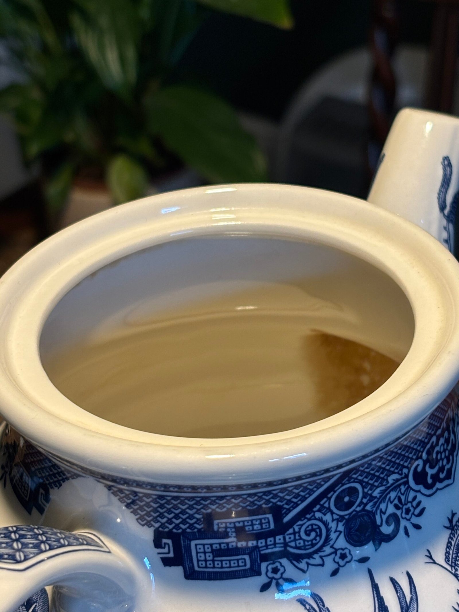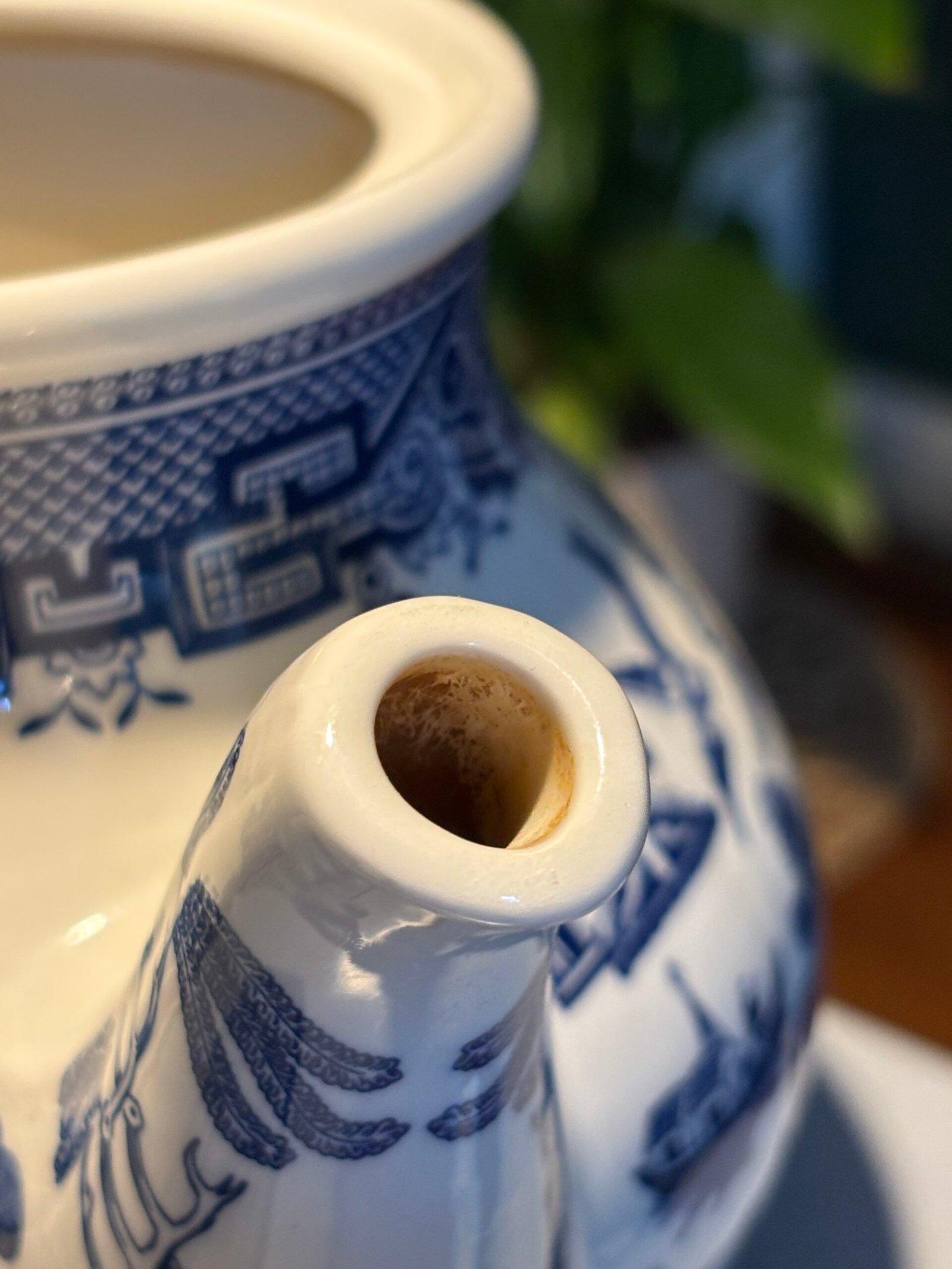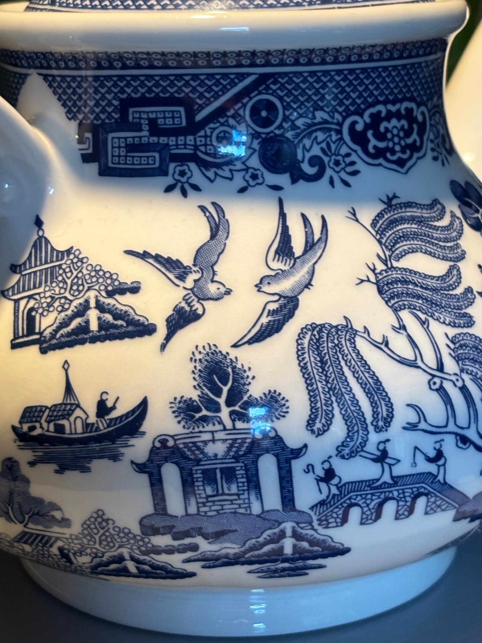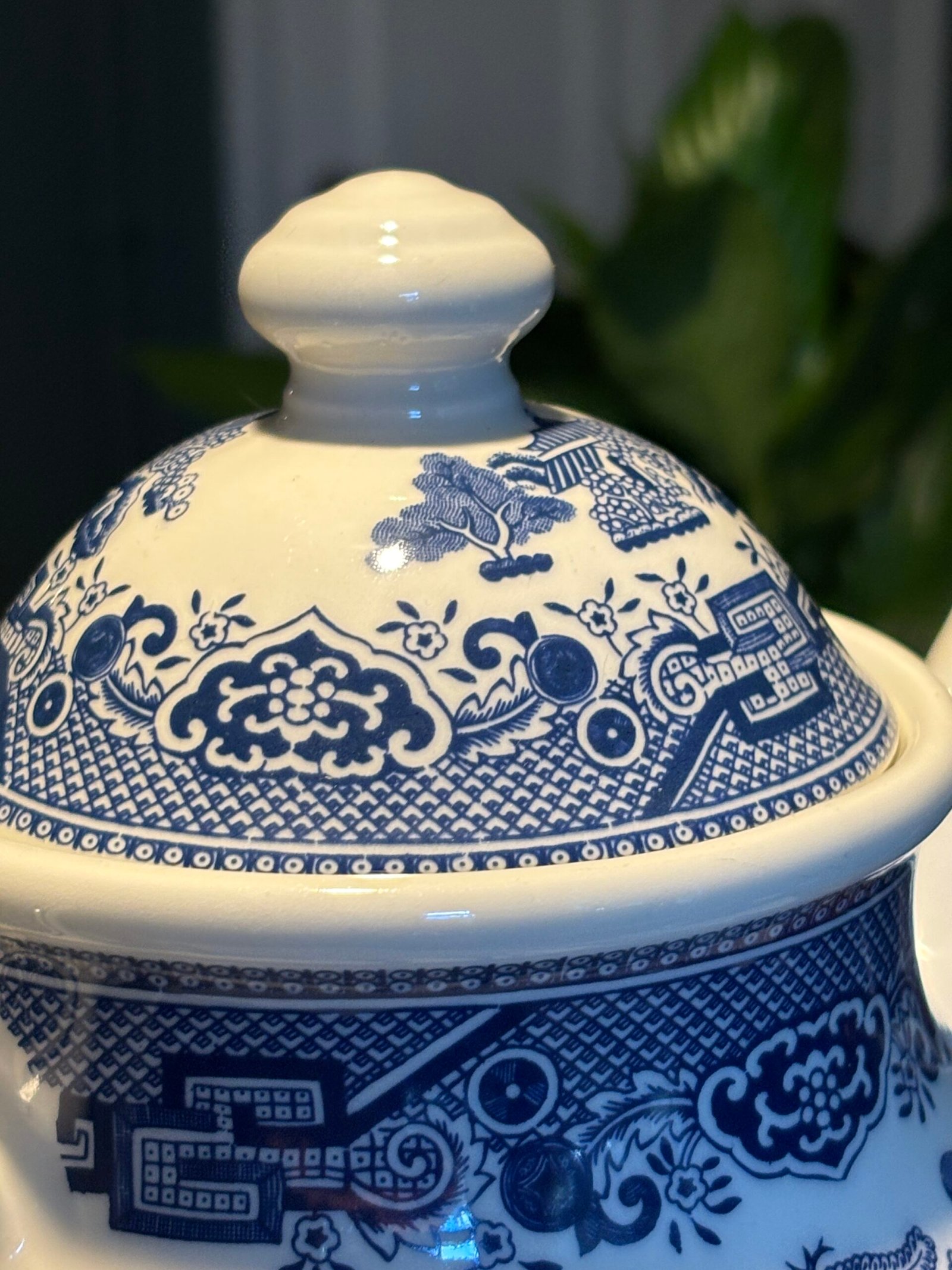 A beautiful tea pot in the classic Blue Willow pattern by Churchill Staffordshire , Made in England. A truly timeless design, the illustration includes pagoda, a tea house, people crossing a bridge, a boat, two birds, fruit trees and of course a willow tree.