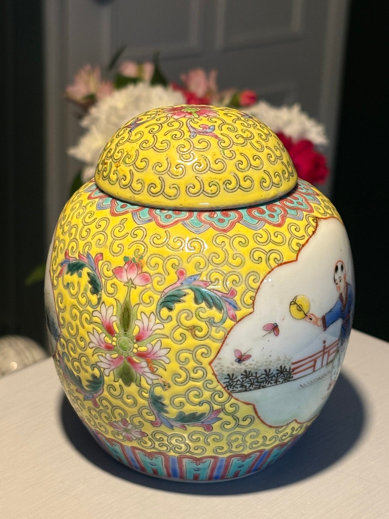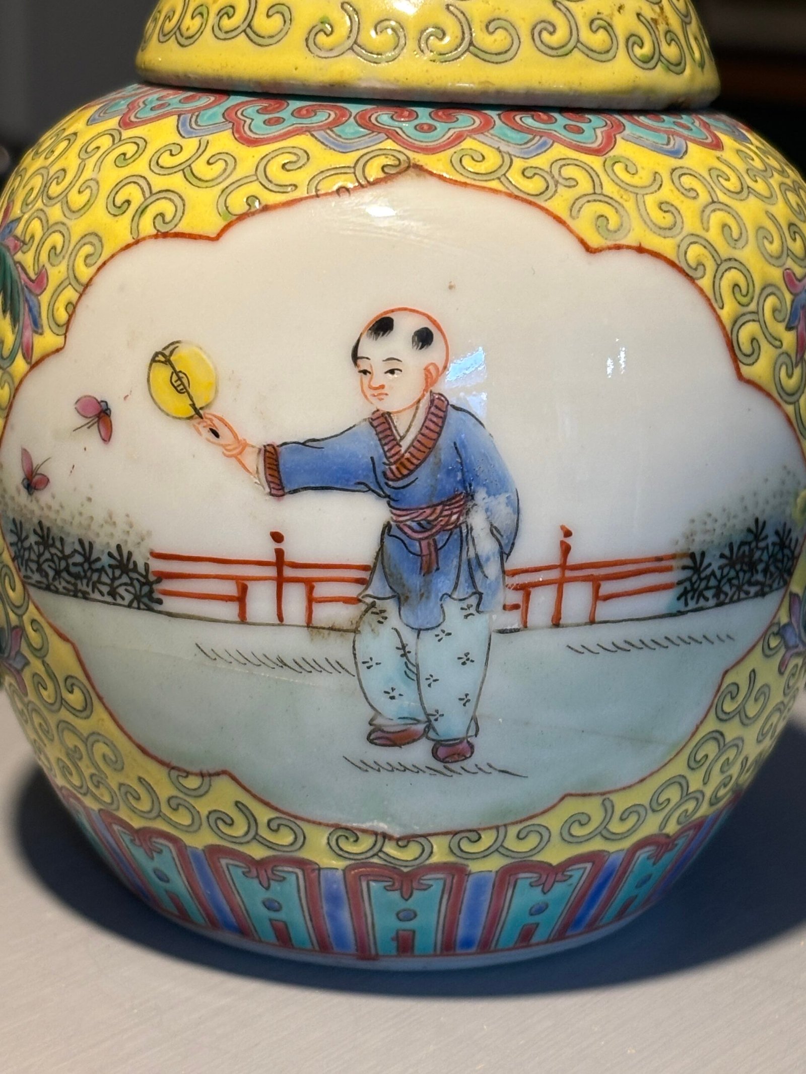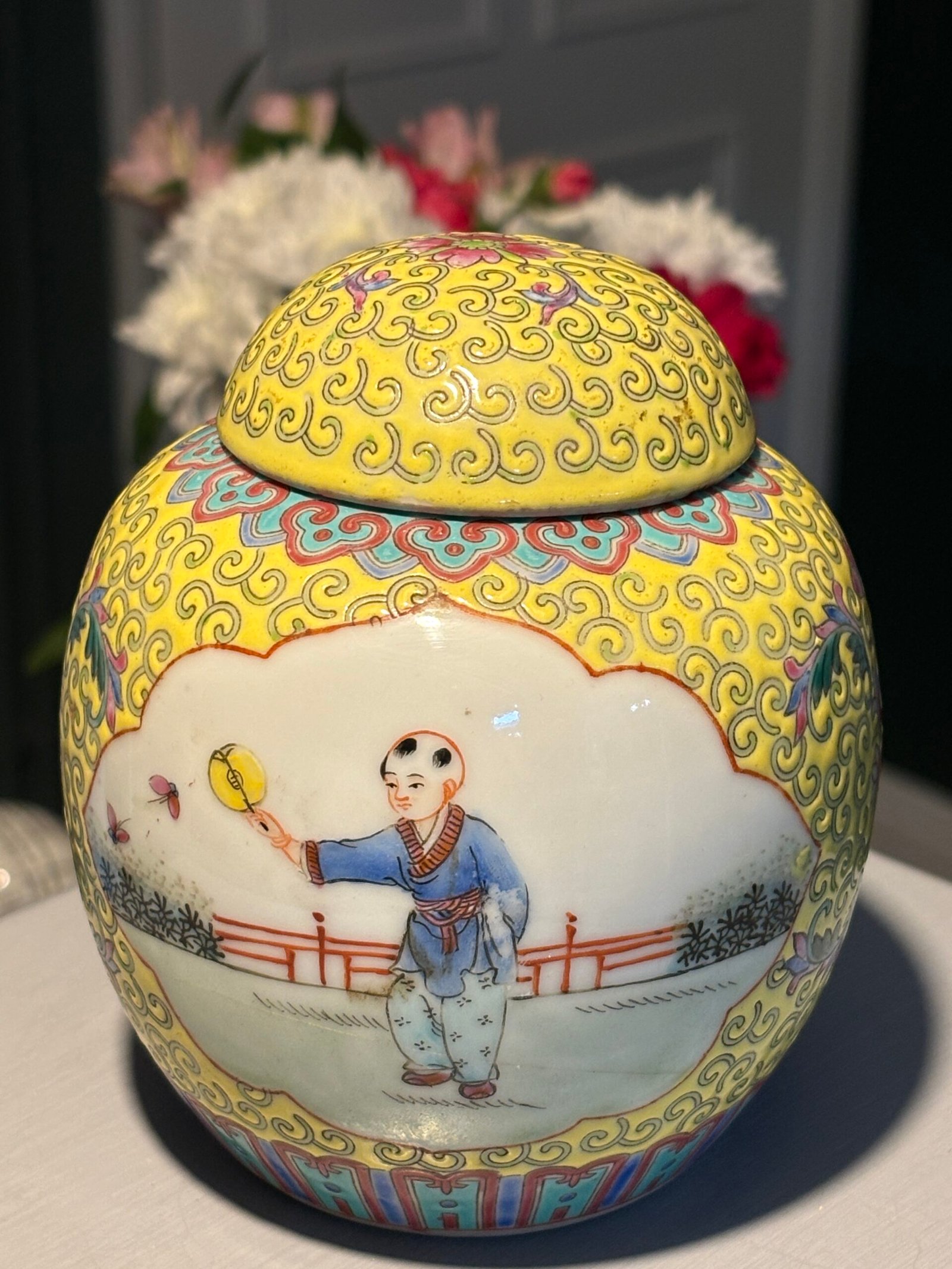 Vintage Chinese Famille Jaune Ginger Jar with Lid – Hand Painted “Boys at Play”