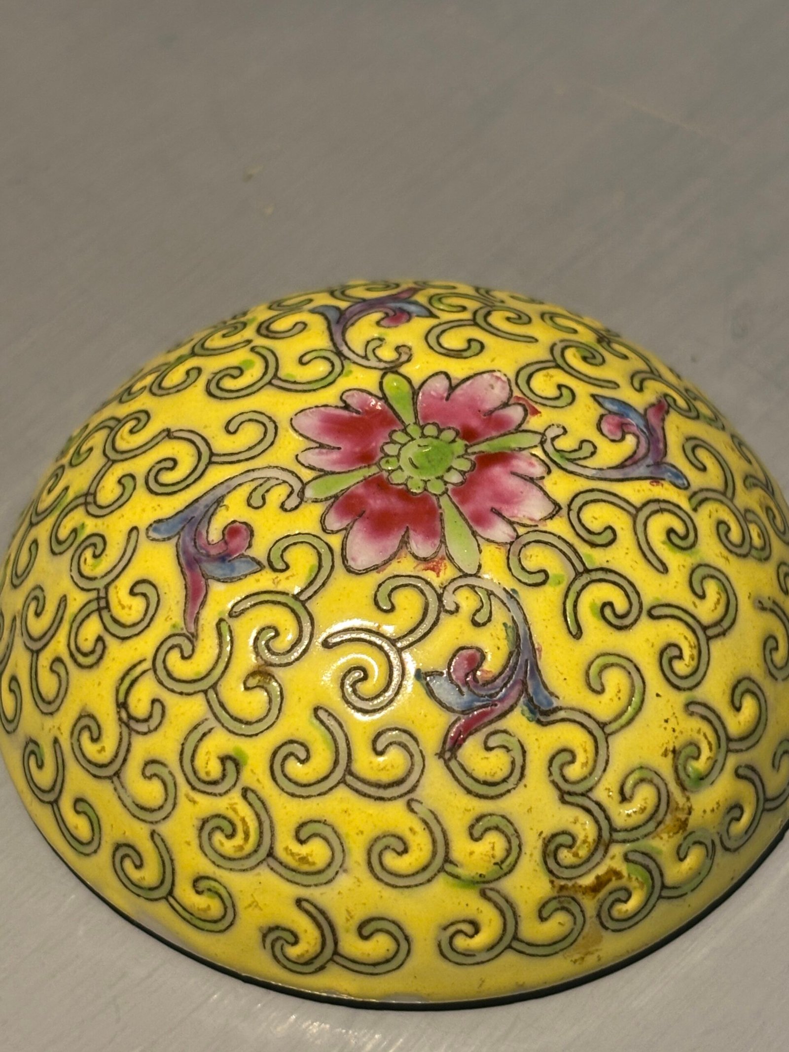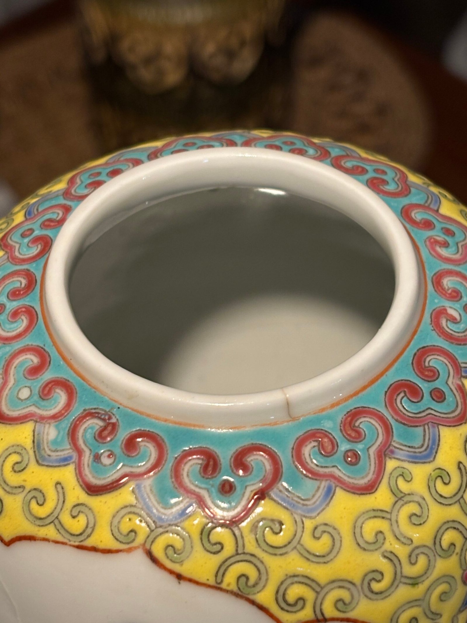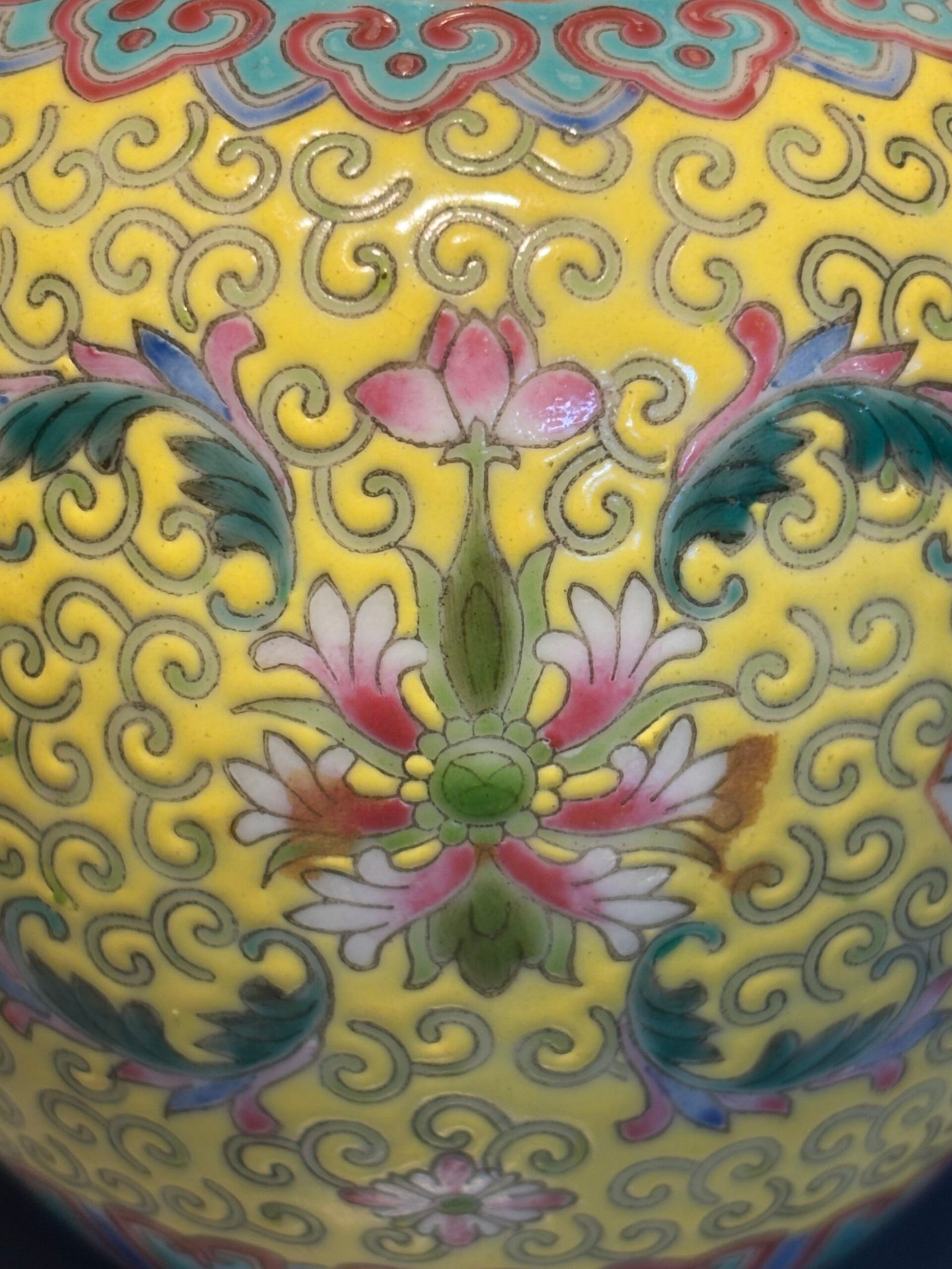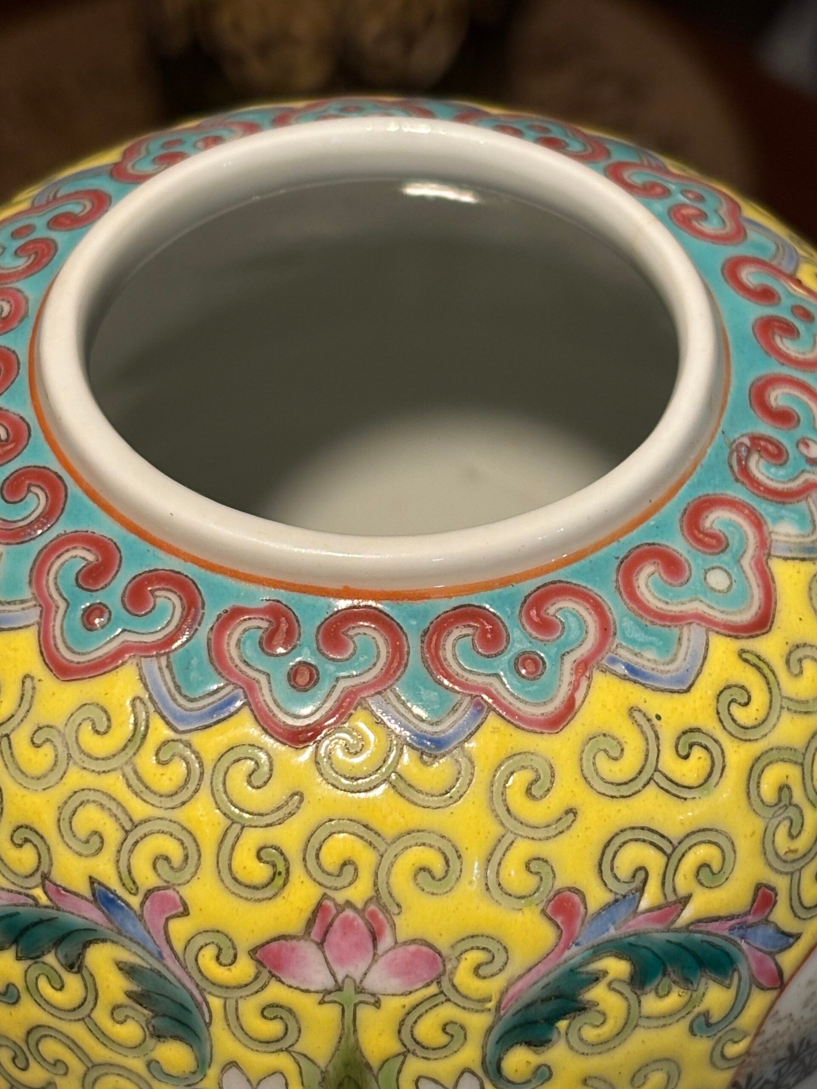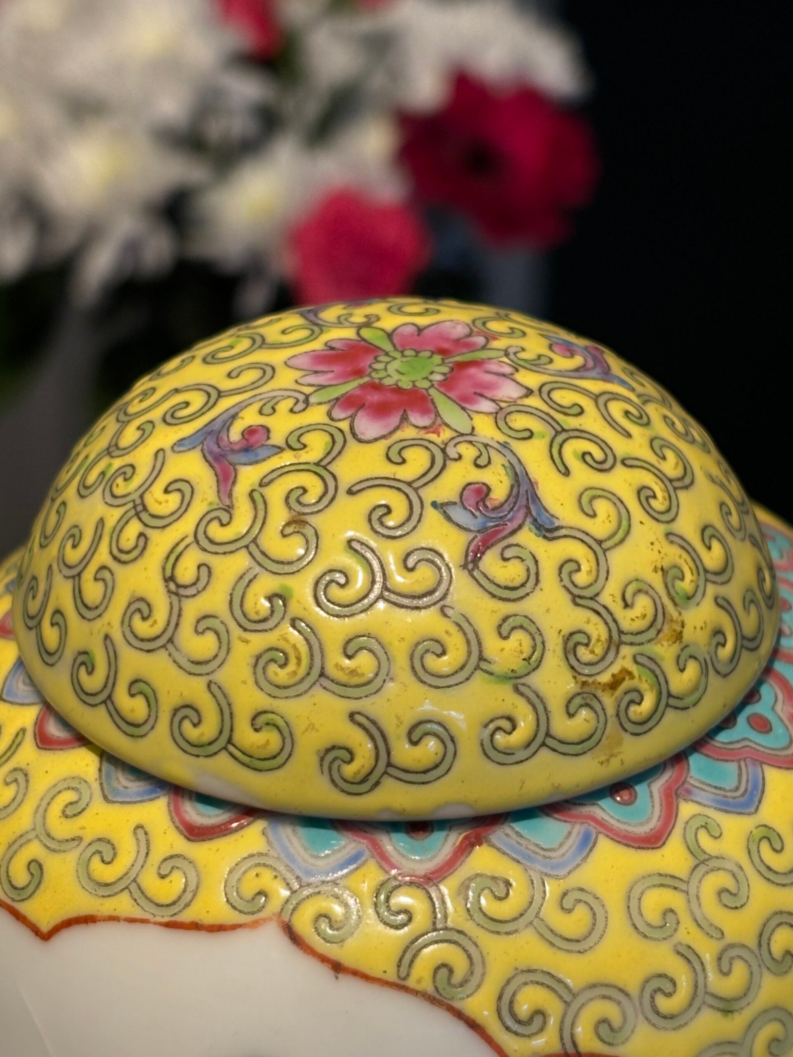 Style: Famille Jaune with a “cloud” or “scroll” textured yellow background. Finished with a classic floral lid and decorative geometric borders at the base.