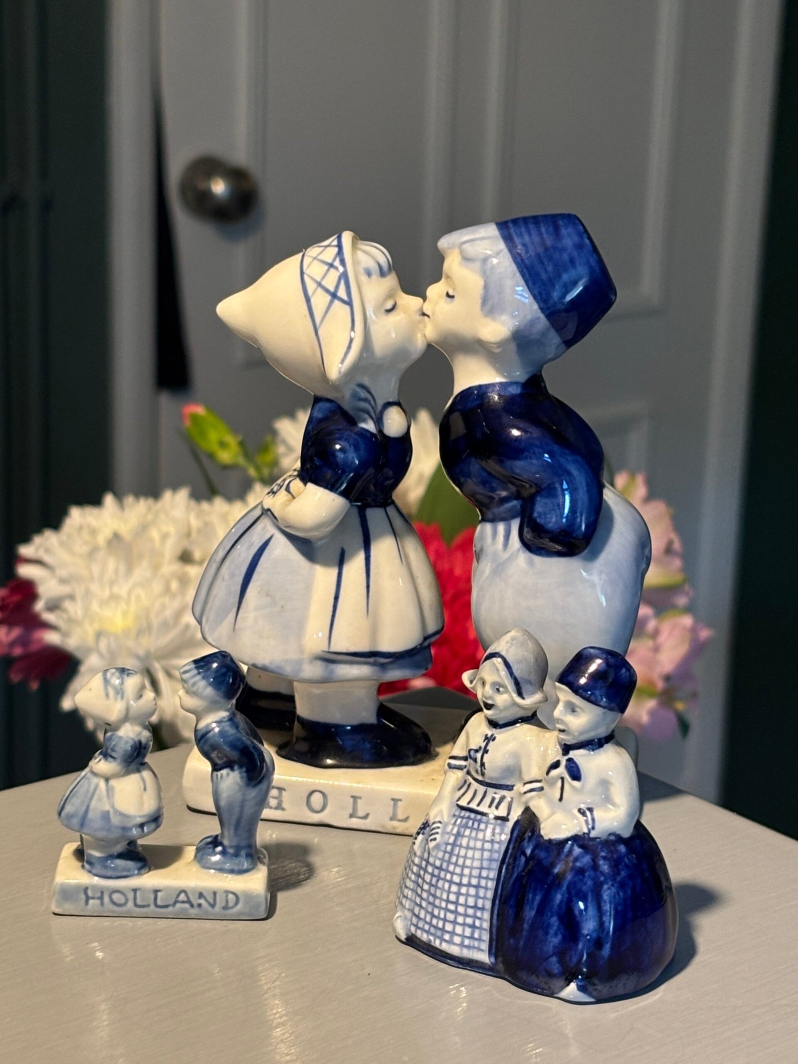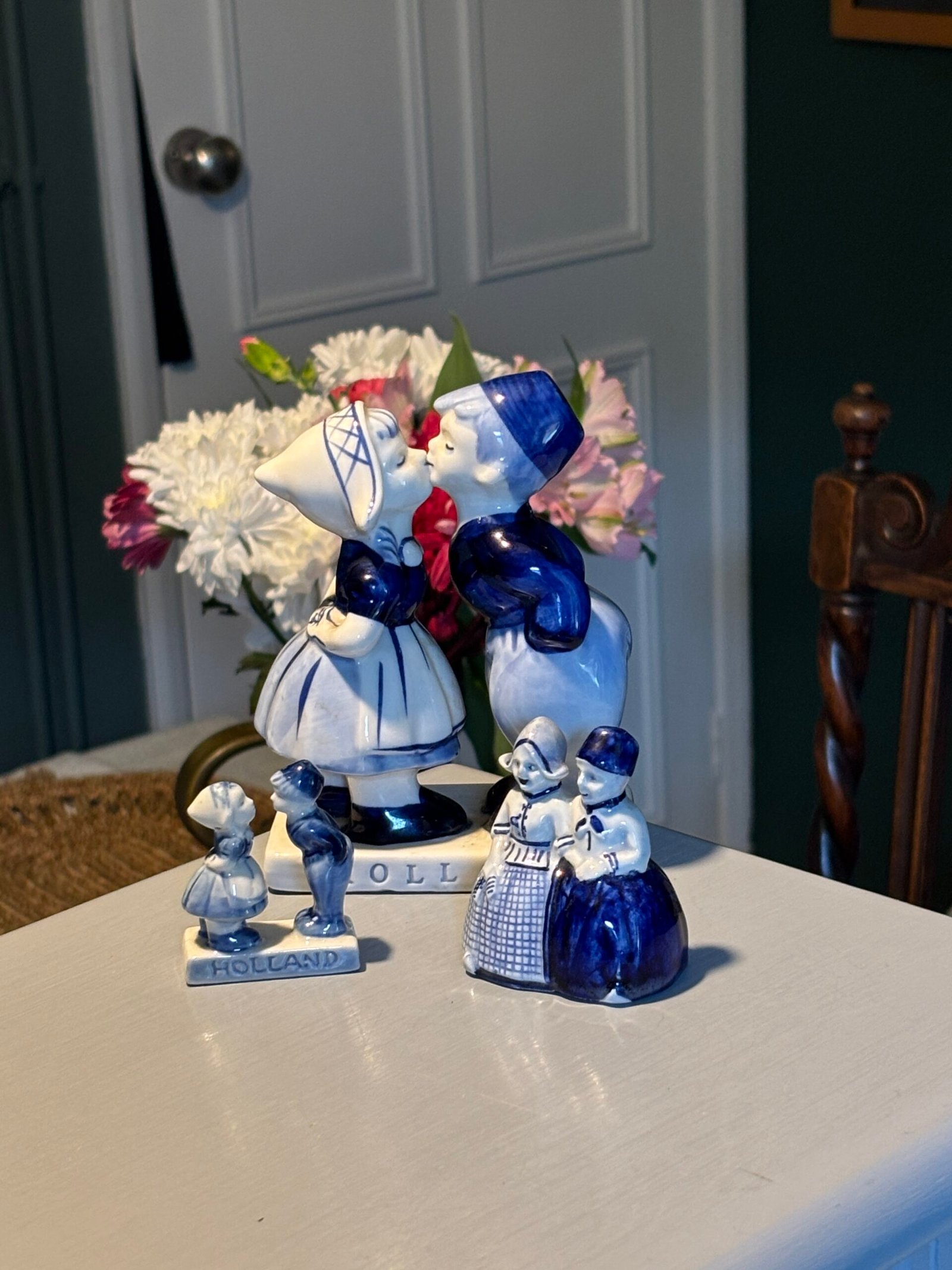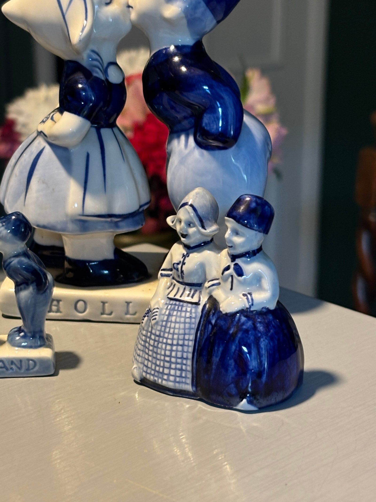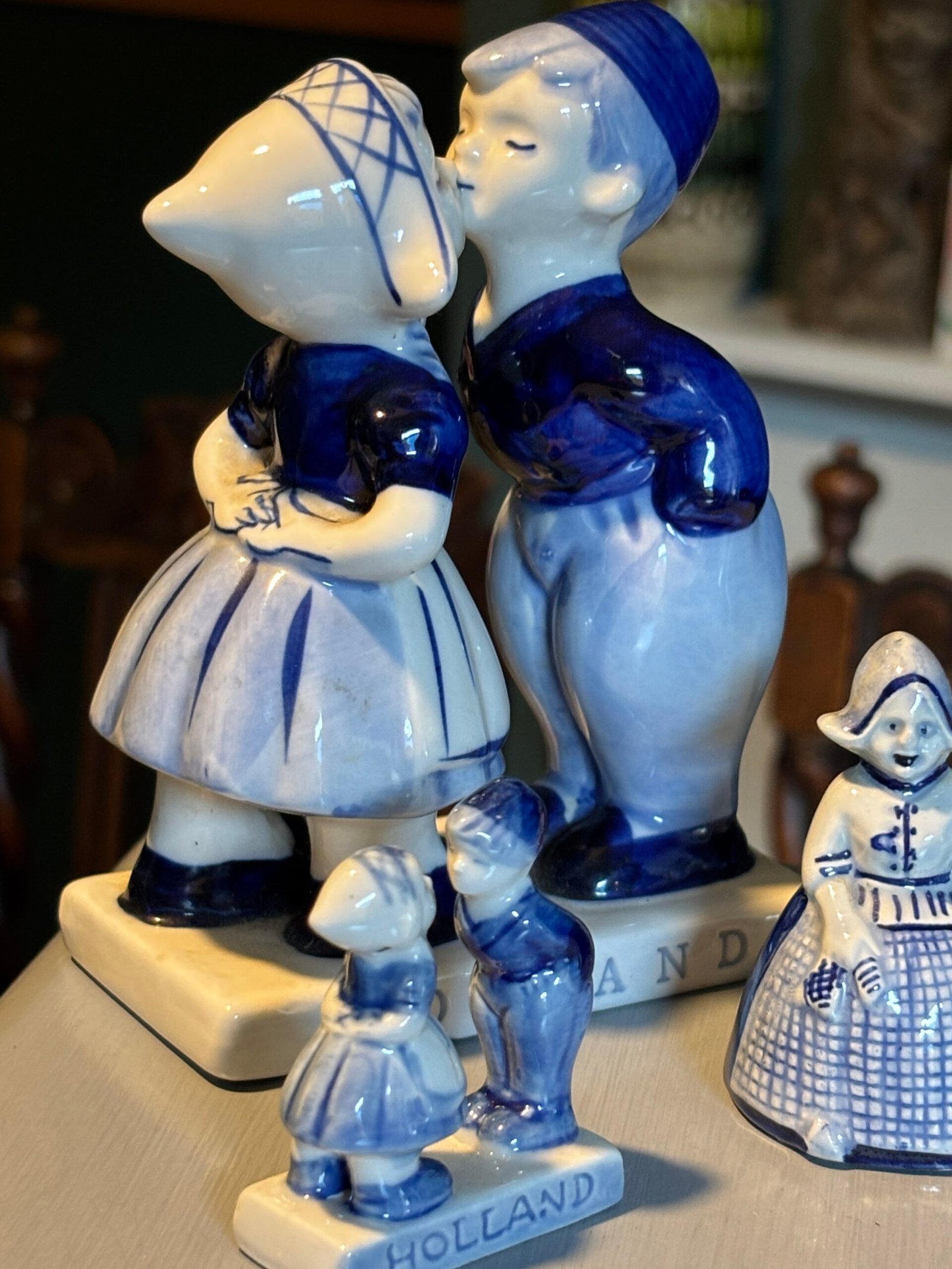 Capture the charm of the Netherlands with this beautiful collection of authentic Vintage Delft Blue ceramic figurines. This set features the iconic “Kissing Dutch Couple” in three different sizes, perfect for a mantel, windowsill, or as a gift for a collector of blue and white porcelain.