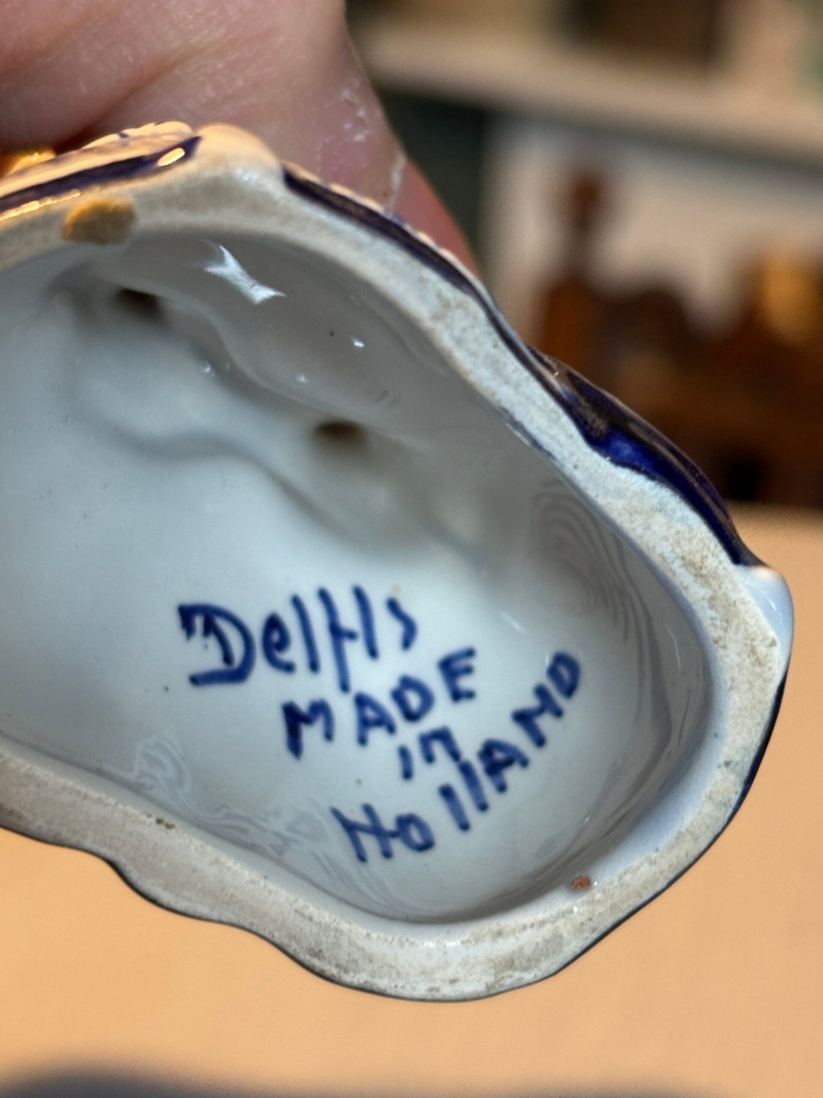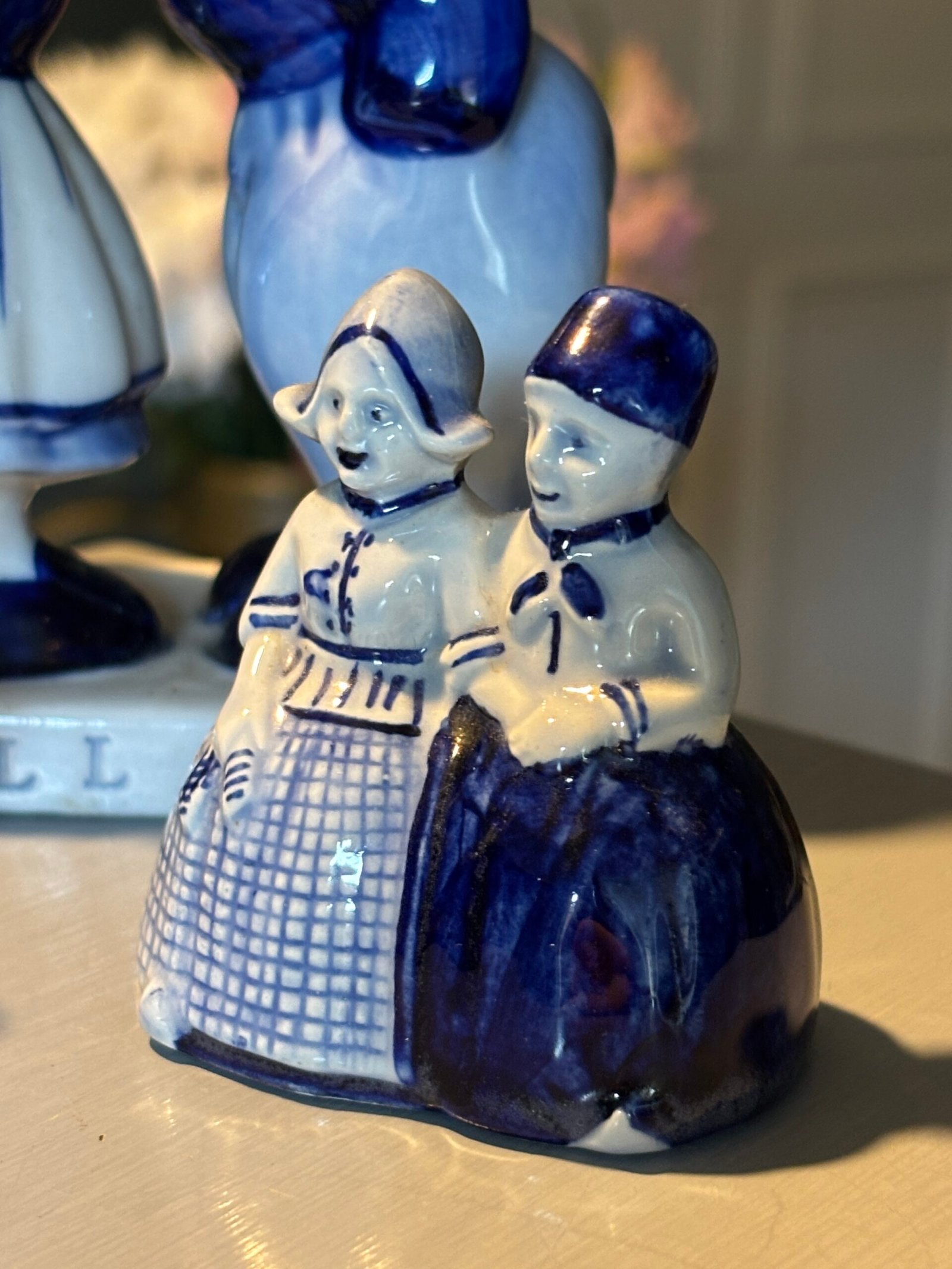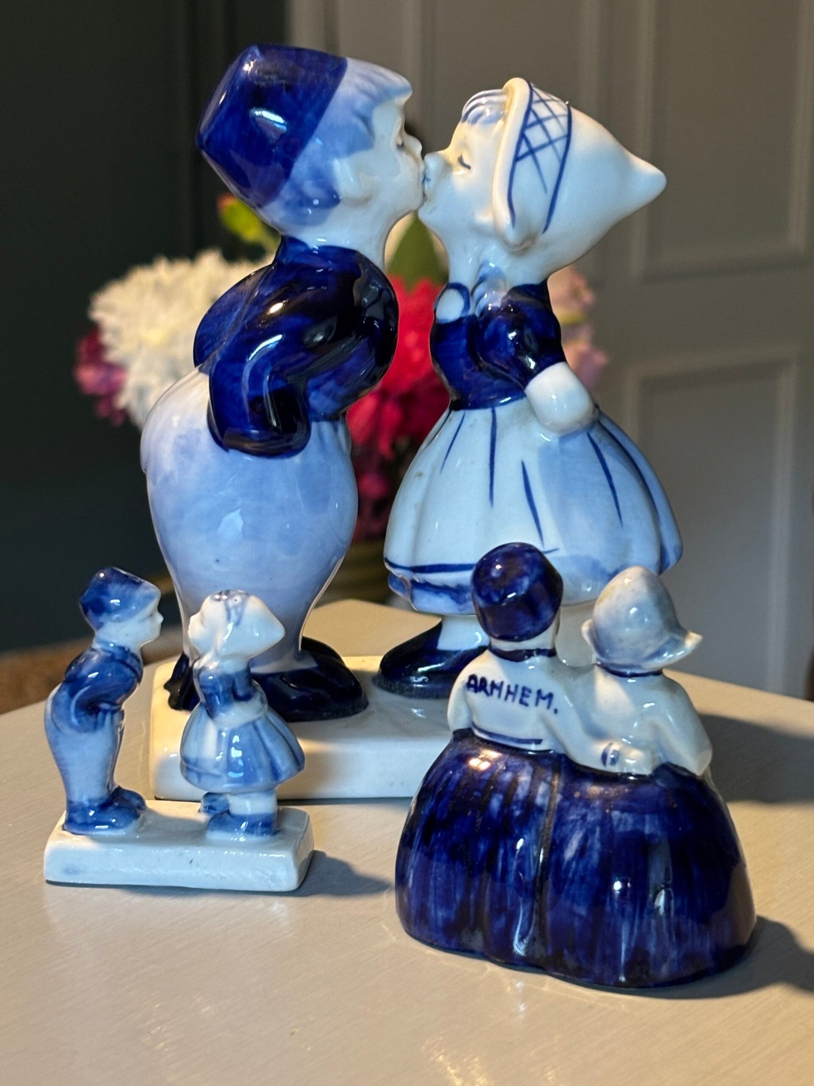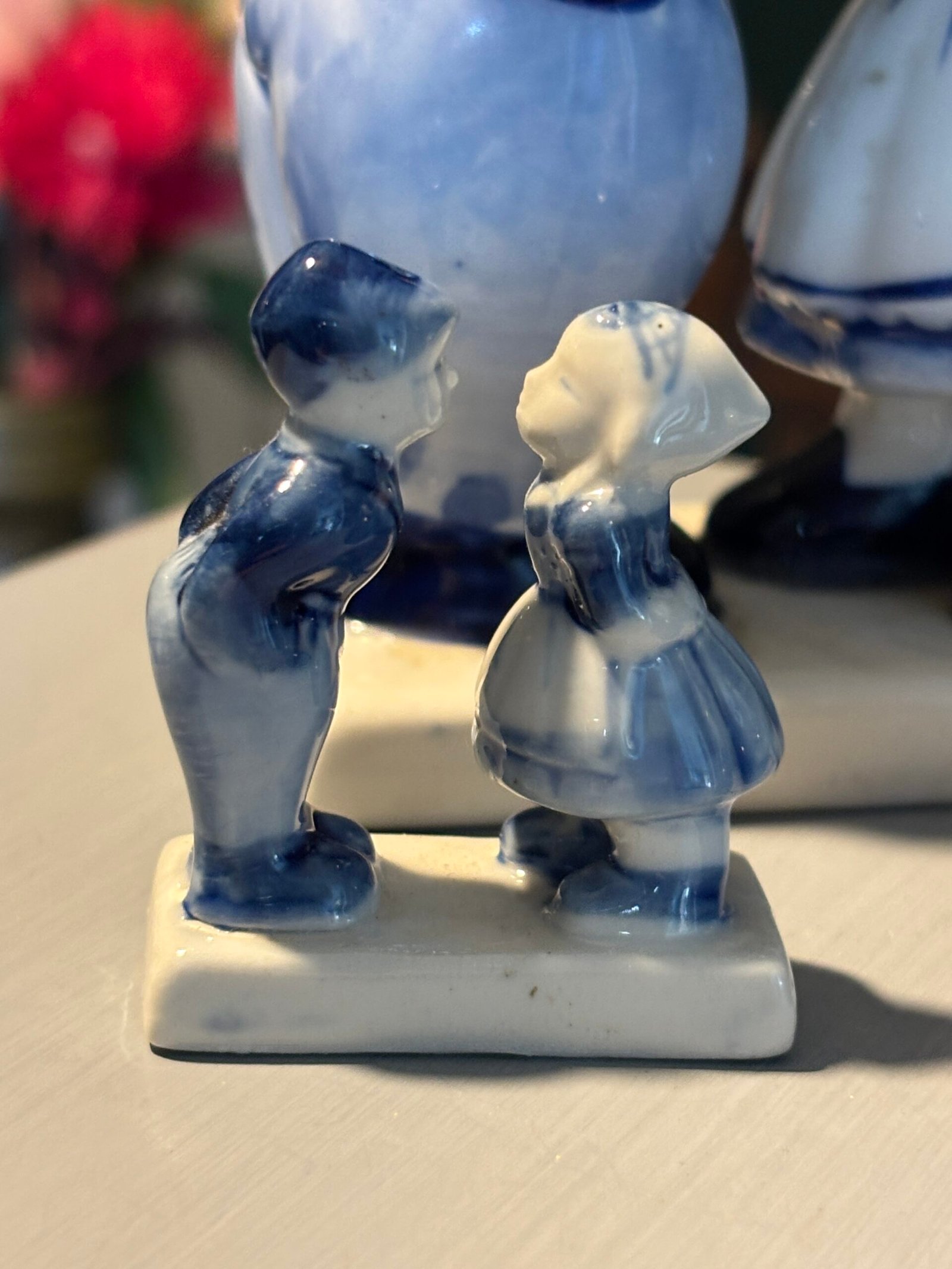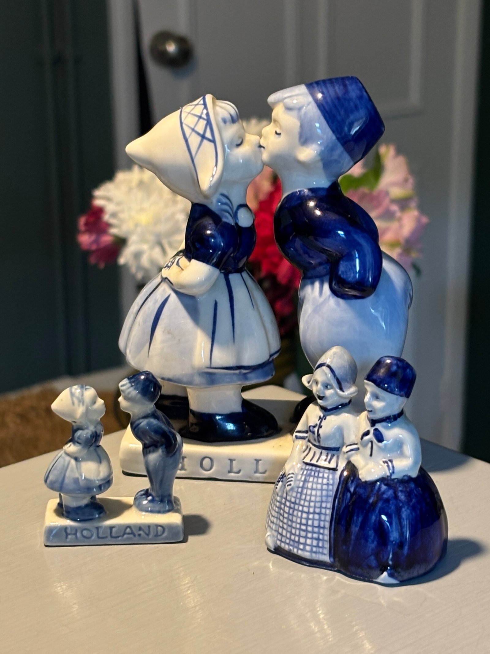 Capture the charm of the Netherlands with this beautiful collection of authentic Vintage Delft Blue ceramic figurines. This set features the iconic “Kissing Dutch Couple” in three different sizes, perfect for a mantel, windowsill, or as a gift for a collector of blue and white porcelain.
