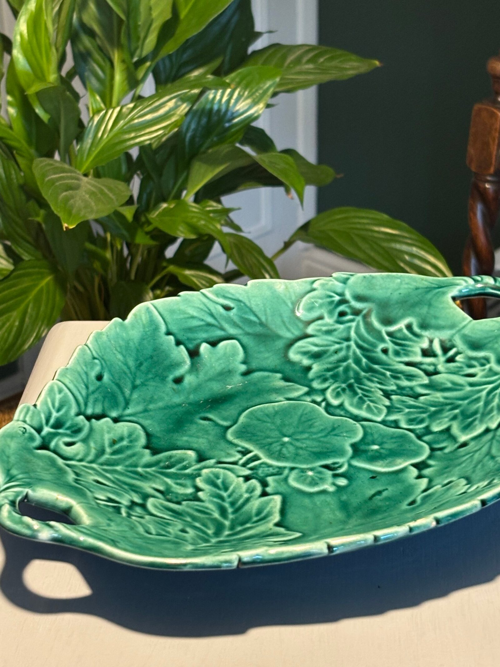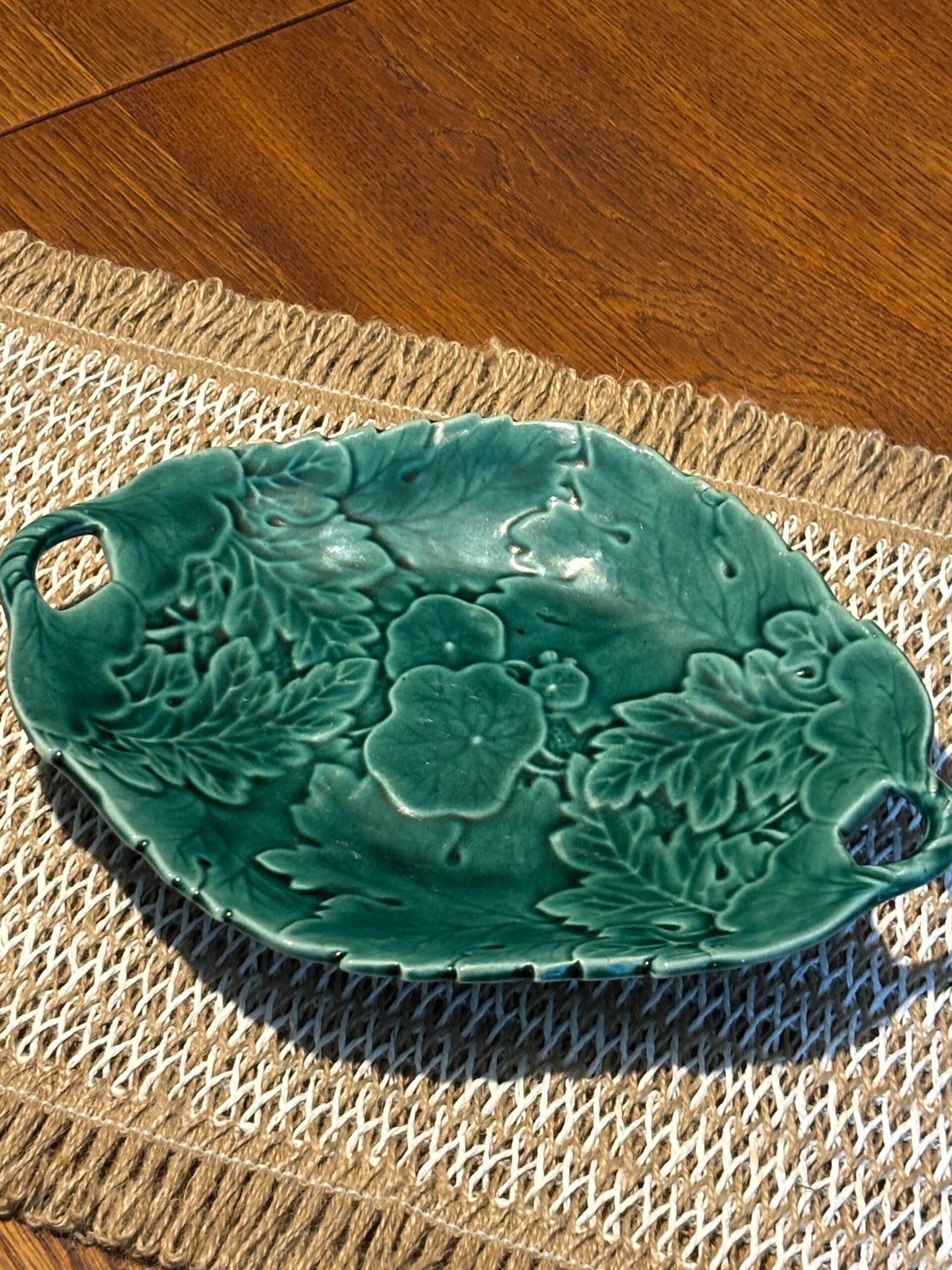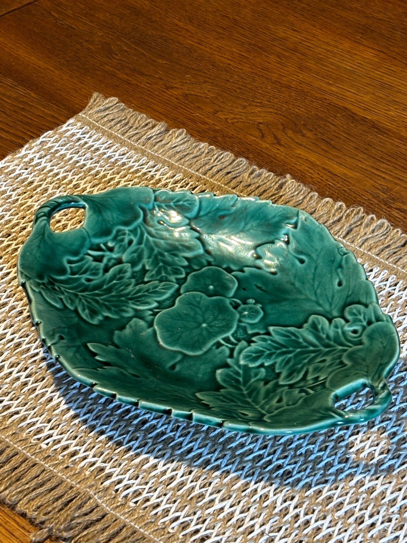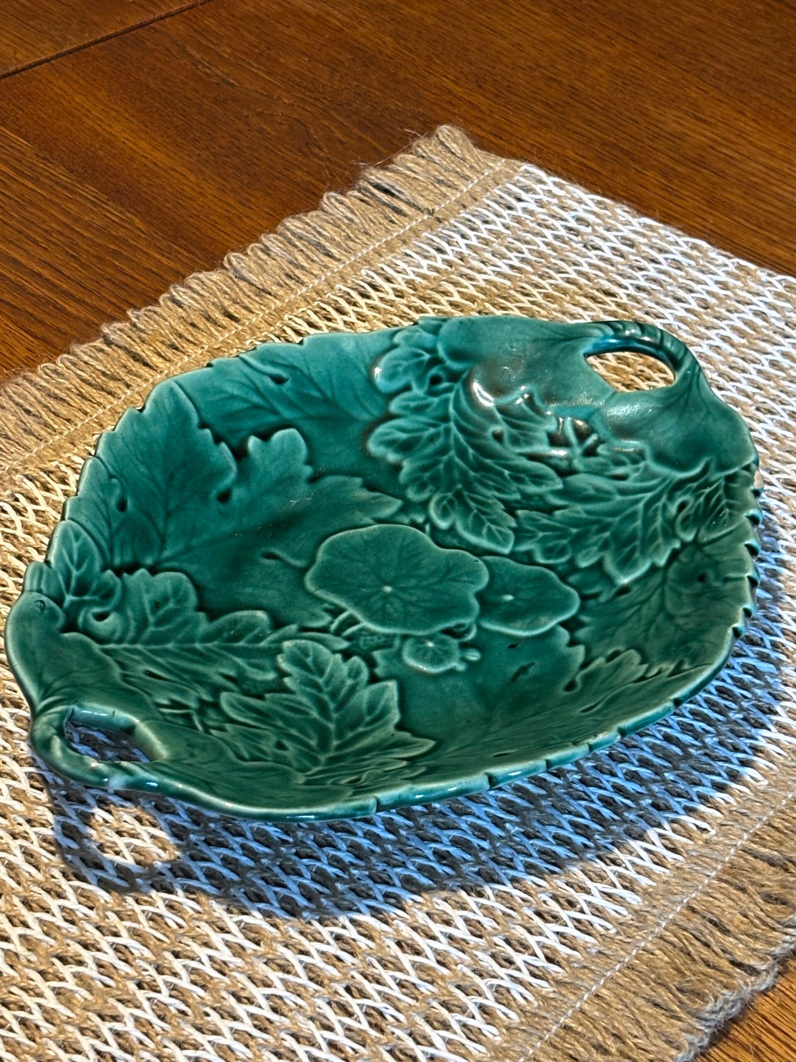 Add a touch of botanical elegance to your home with this stunning vintage Majolica-style serving dish. Featuring an intricate, high-relief design of overlapping geranium and oak leaves, this piece is finished in a rich, vibrant emerald green glaze that catches the light beautifully.