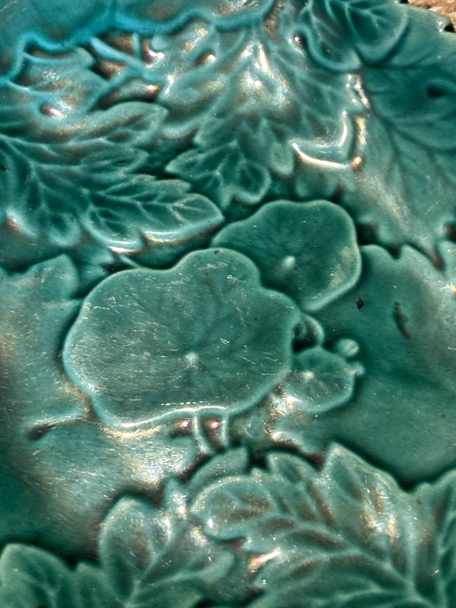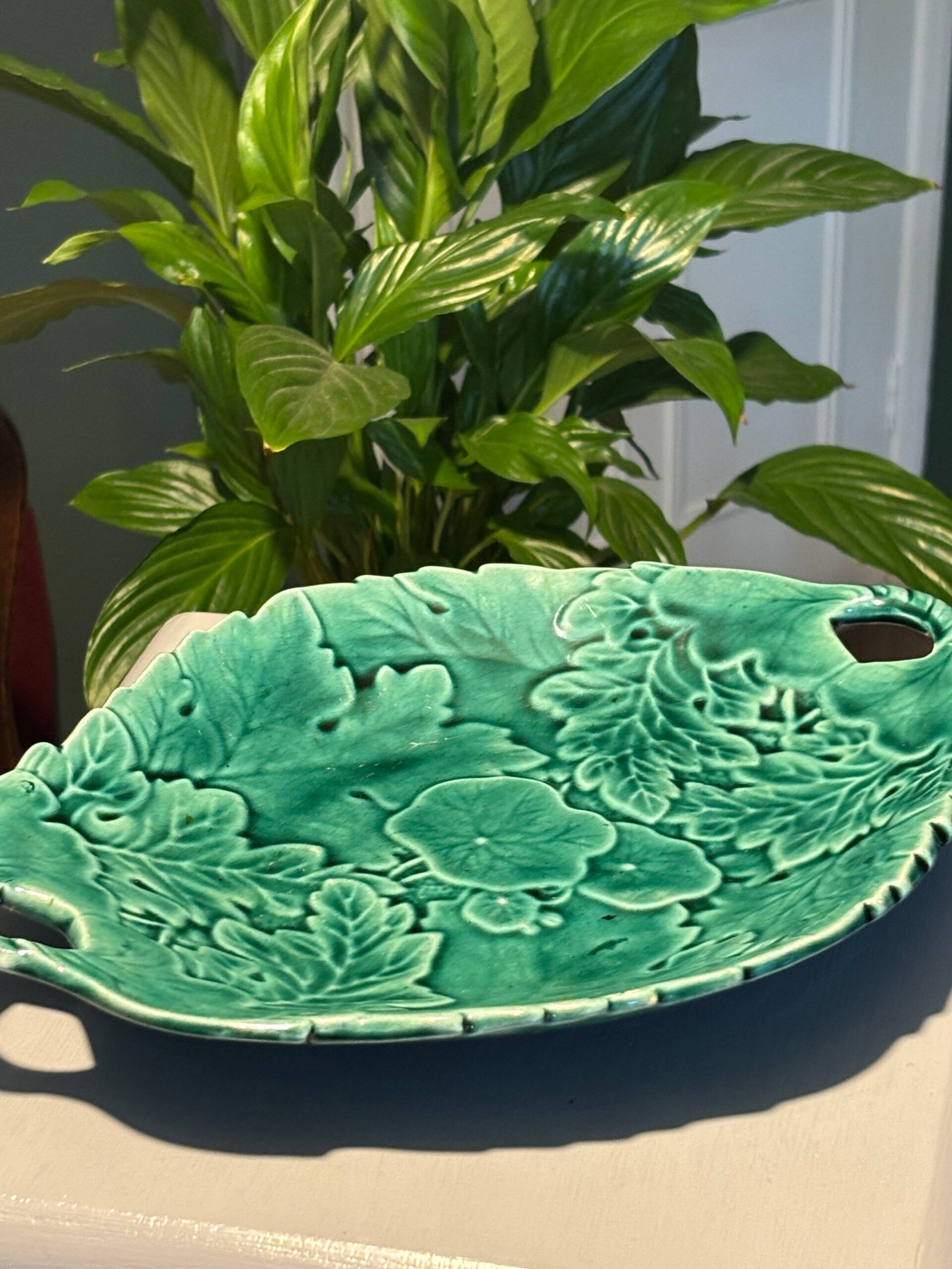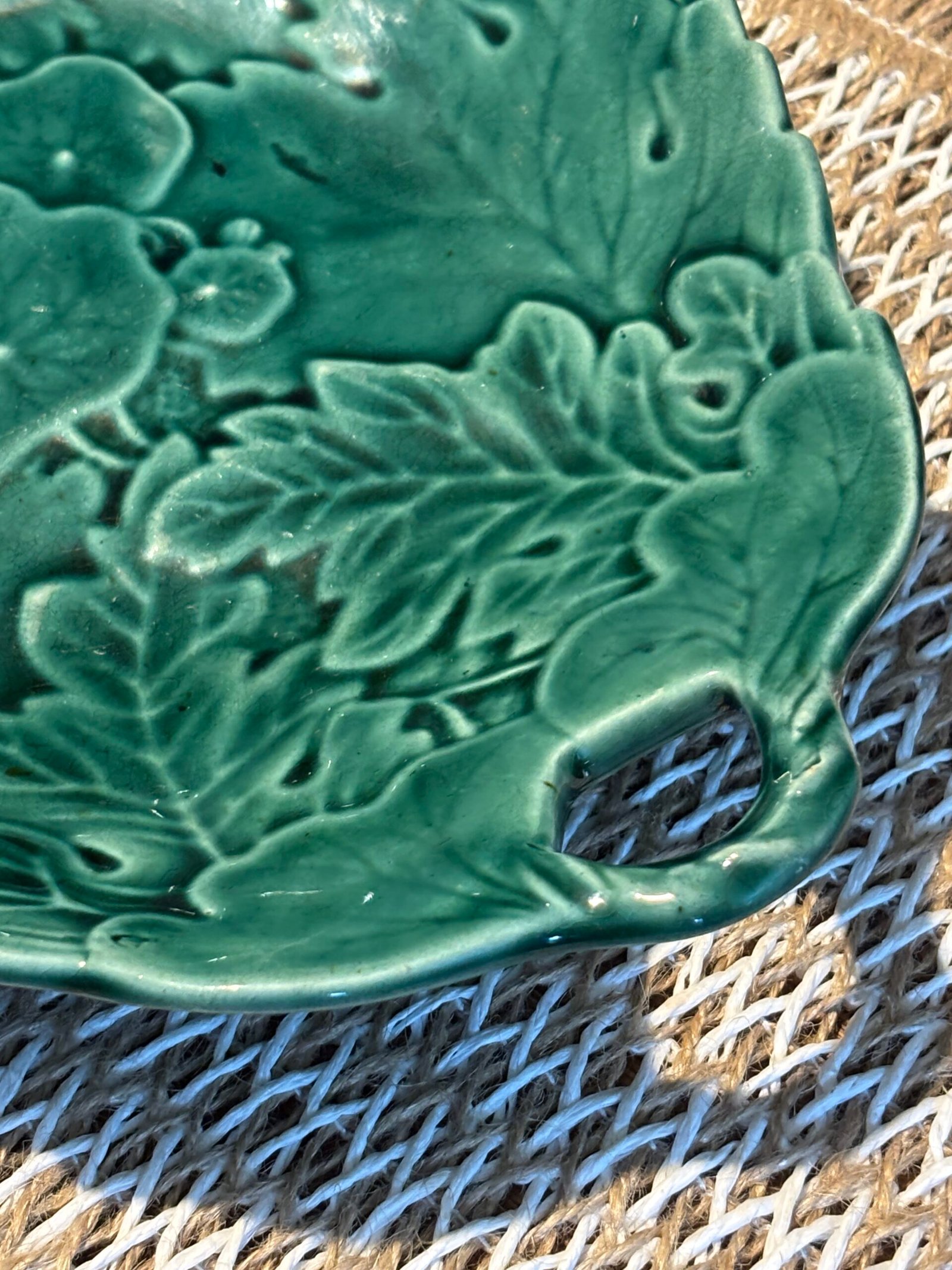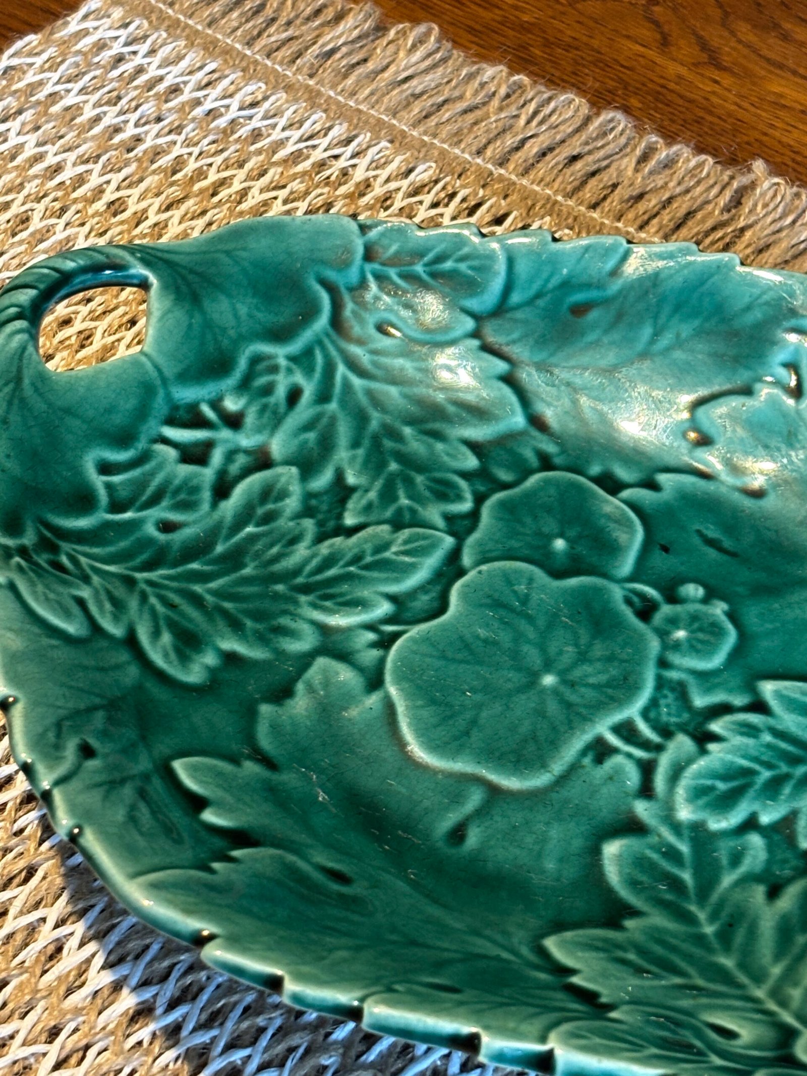 Add a touch of botanical elegance to your home with this stunning vintage Majolica-style serving dish. Featuring an intricate, high-relief design of overlapping geranium and oak leaves, this piece is finished in a rich, vibrant emerald green glaze that catches the light beautifully.