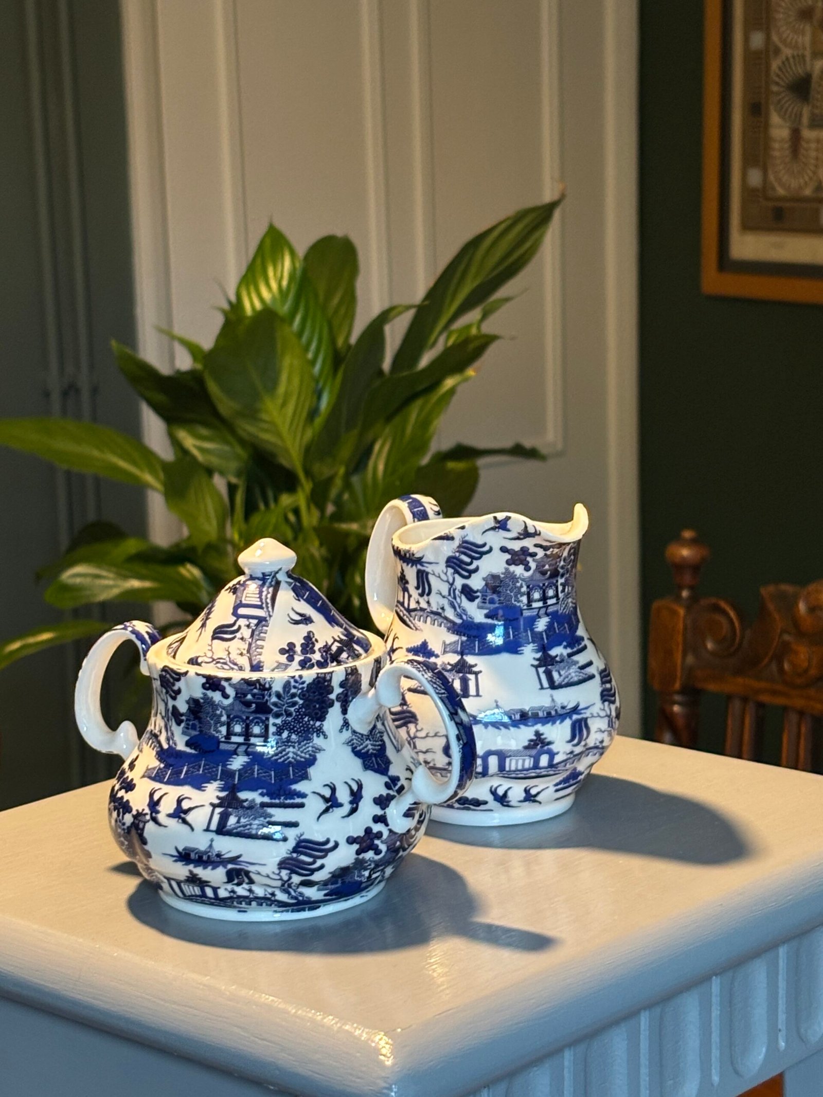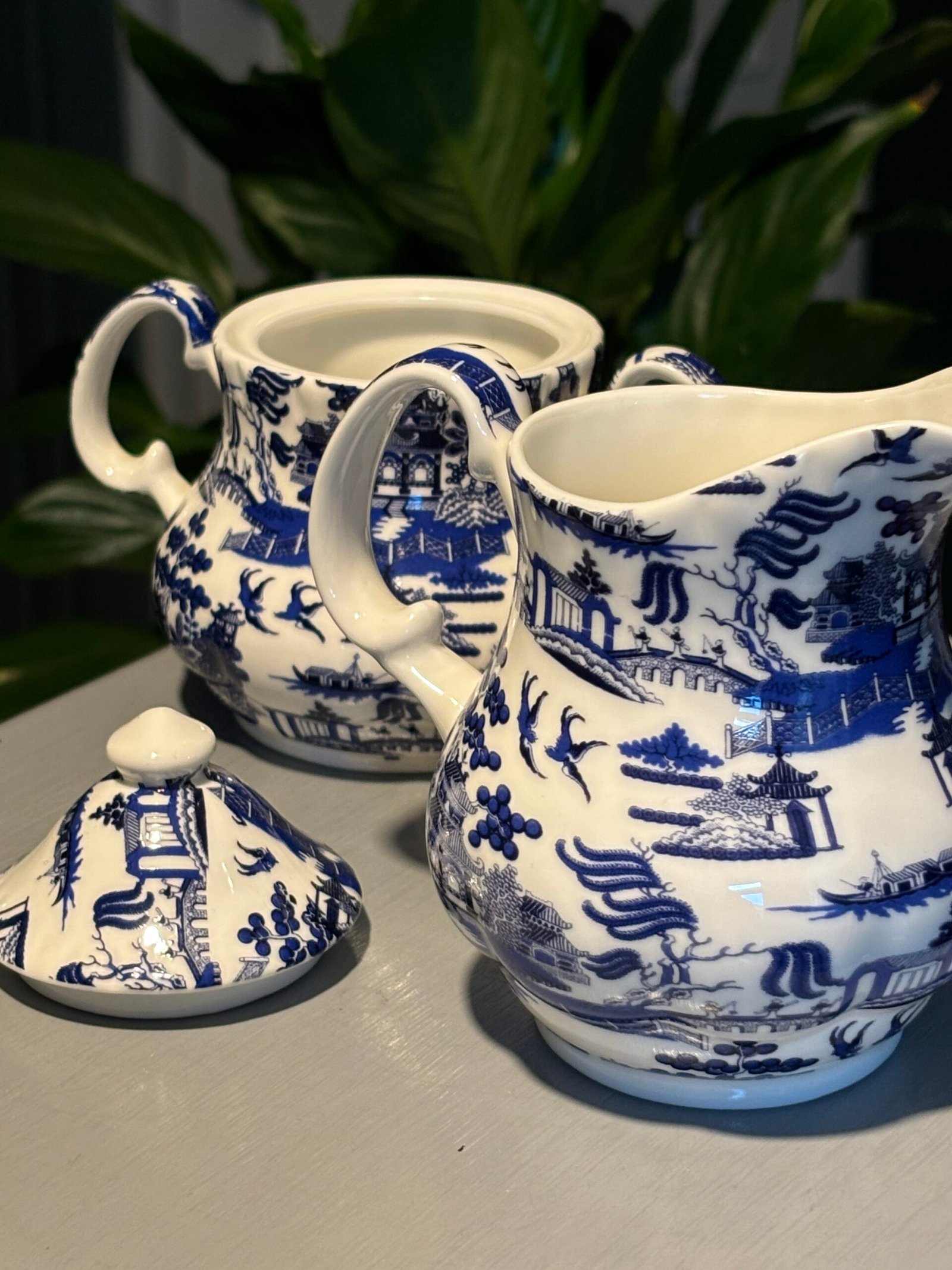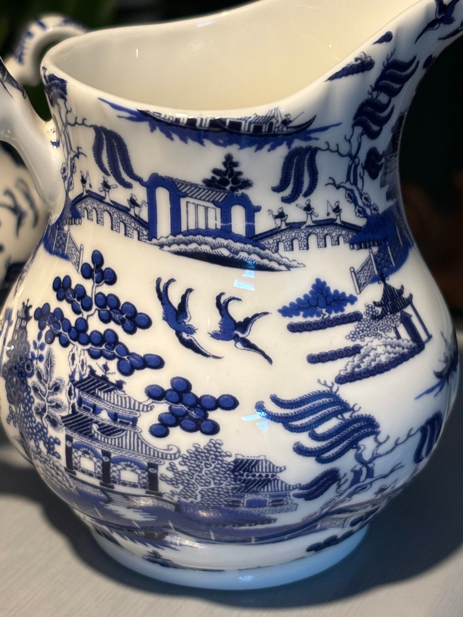 This set features the iconic and highly collectible Blue Willow transferware pattern, depicting the classic bridge, pagodas, and lovebirds. Made in the historic pottery hub of Stoke-on-Trent, England, these pieces have a lovely scalloped/swirled body and elegant ornate handles.