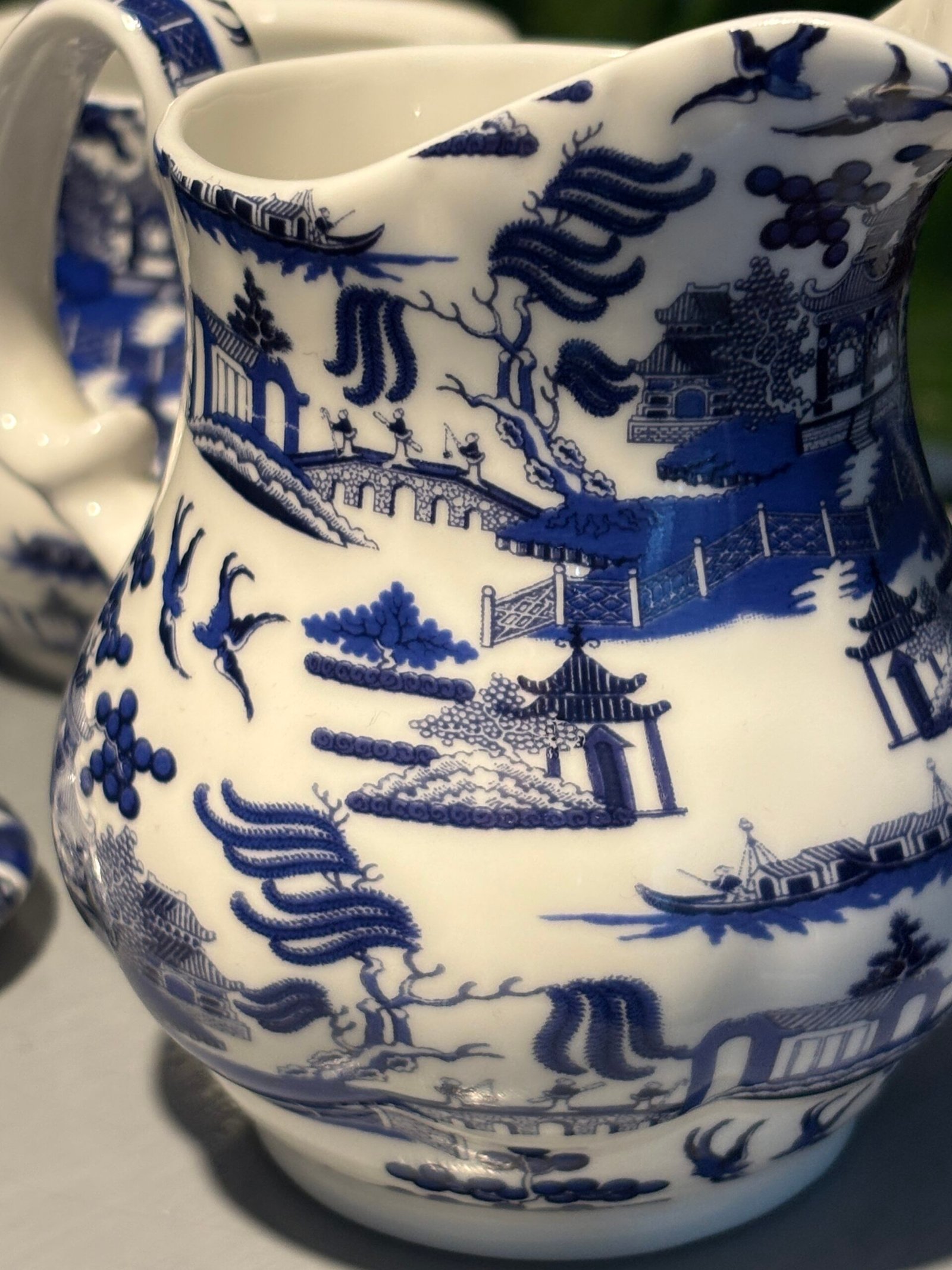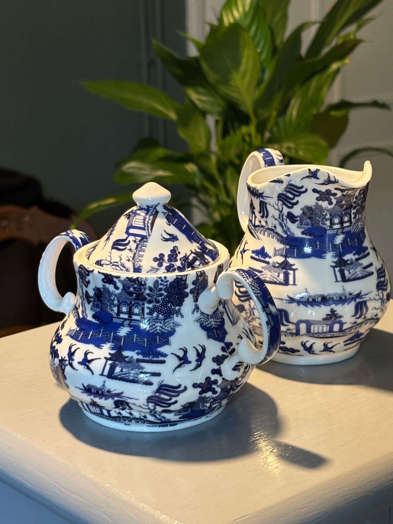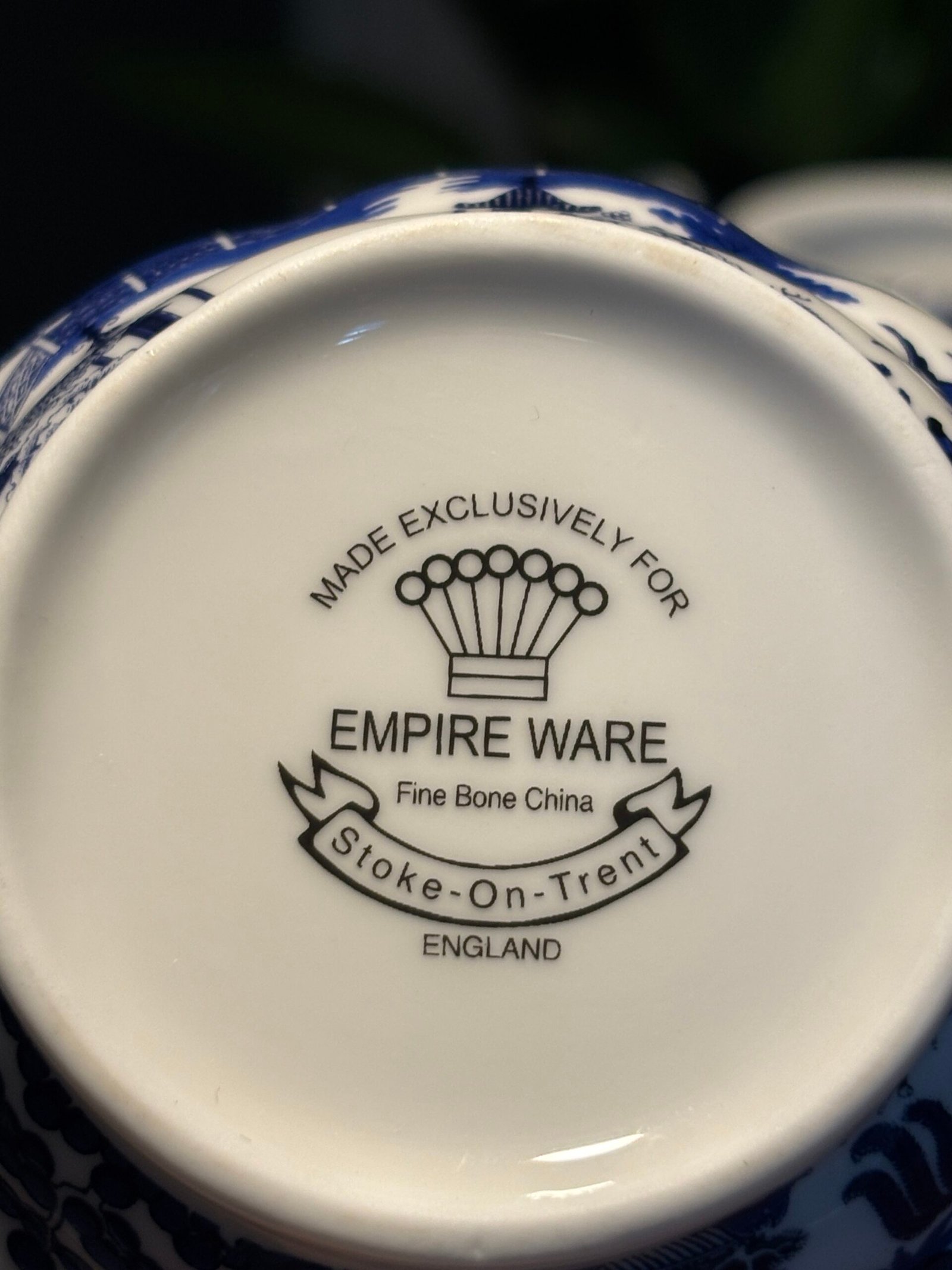 This set features the iconic and highly collectible Blue Willow transferware pattern, depicting the classic bridge, pagodas, and lovebirds. Made in the historic pottery hub of Stoke-on-Trent, England, these pieces have a lovely scalloped/swirled body and elegant ornate handles.