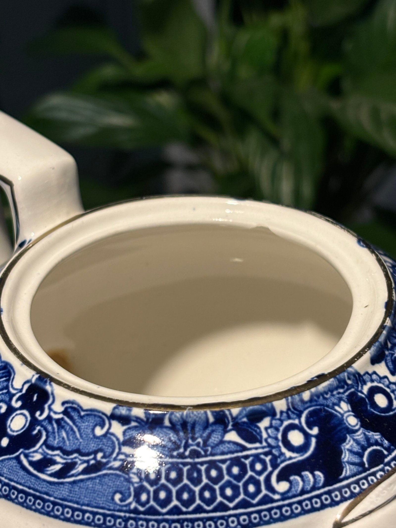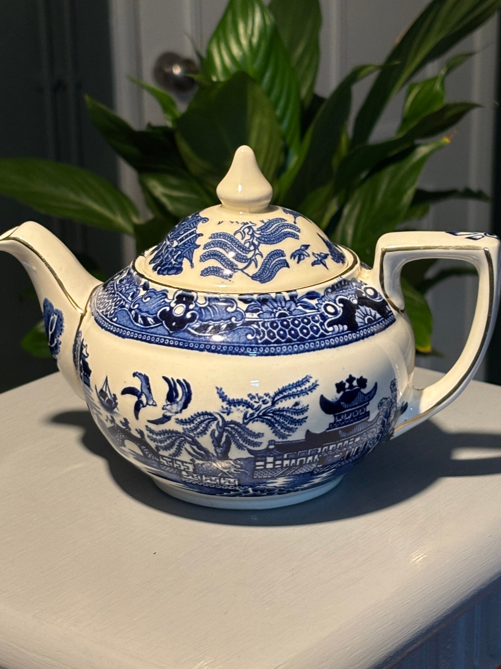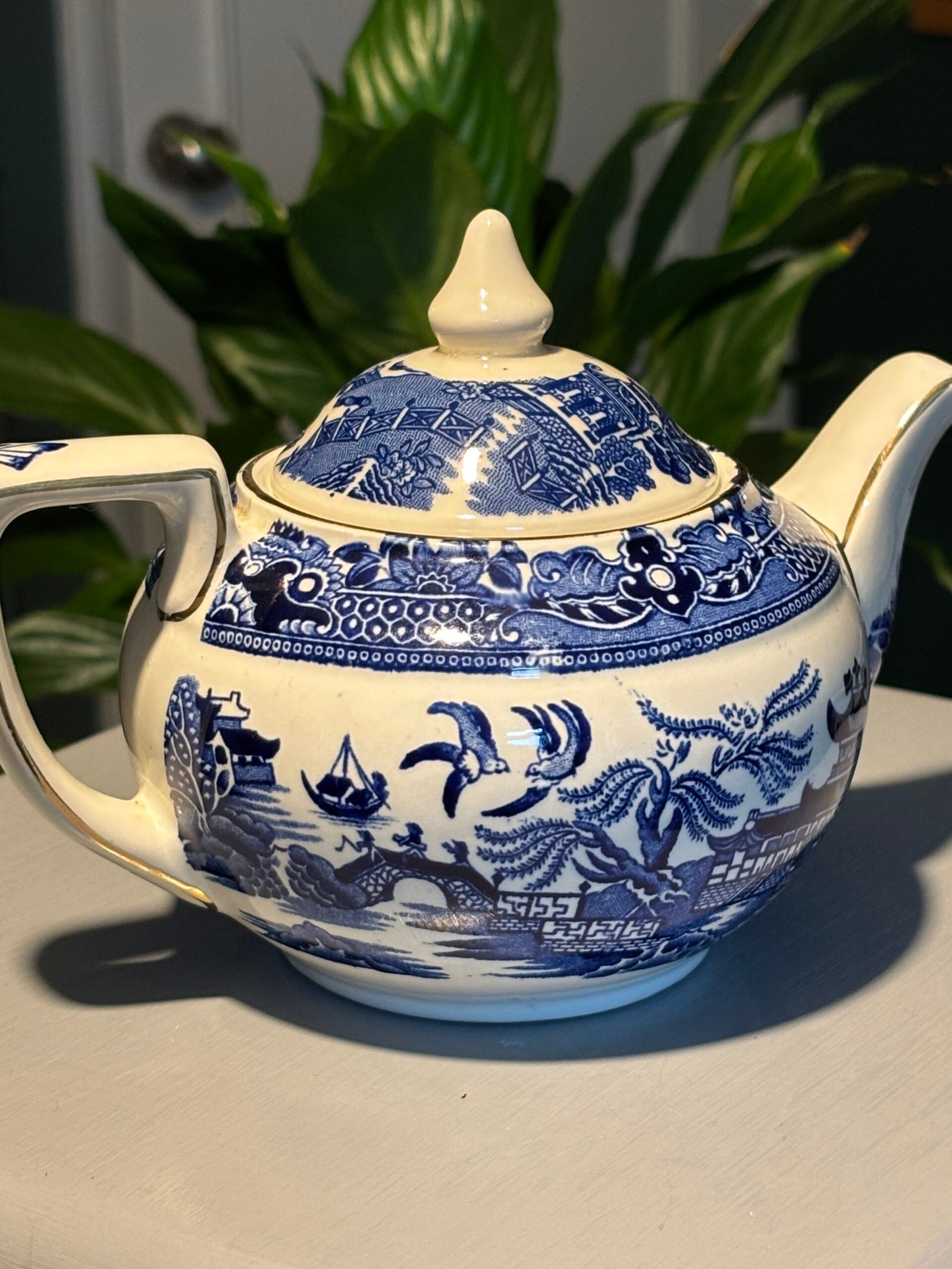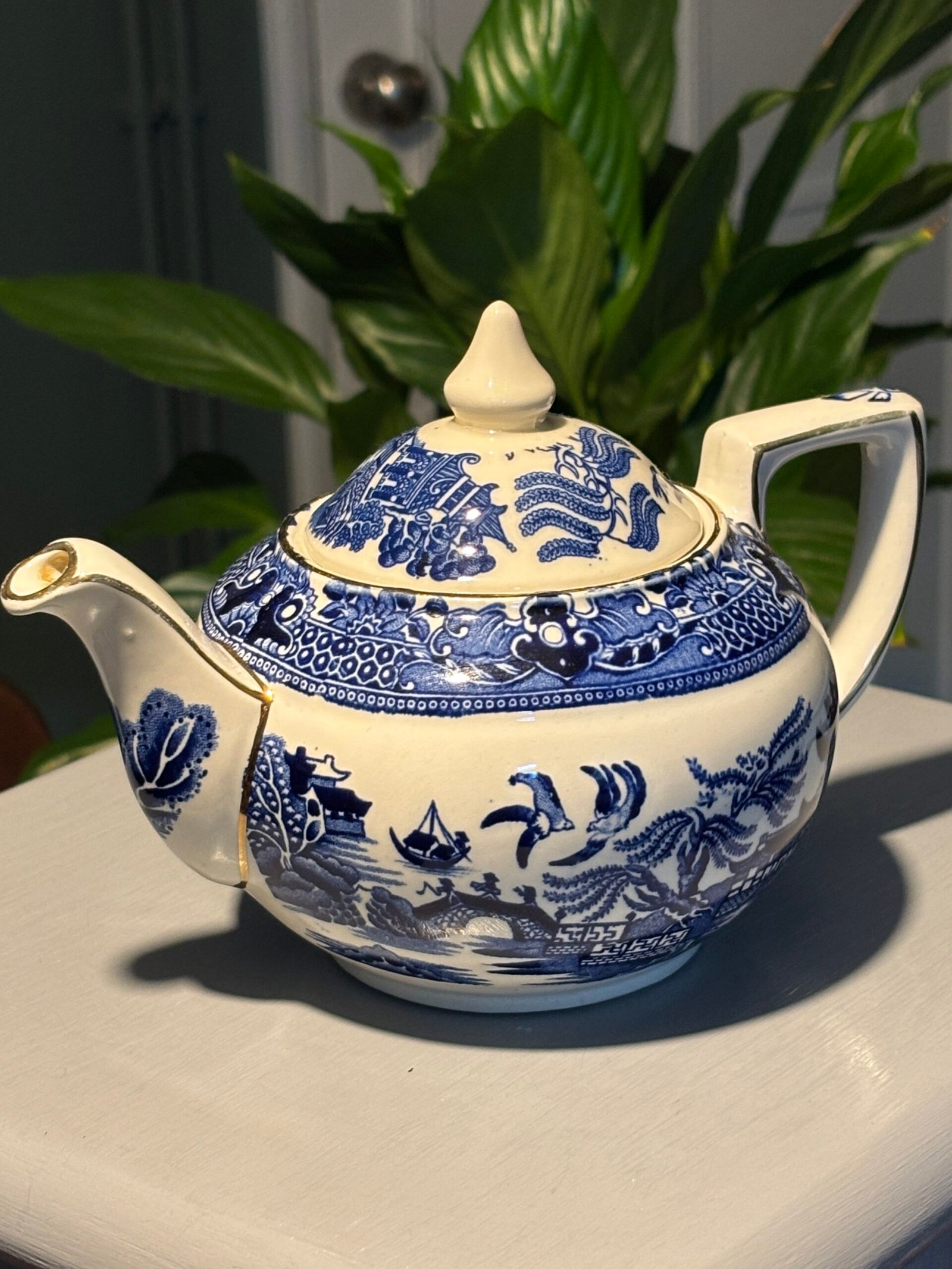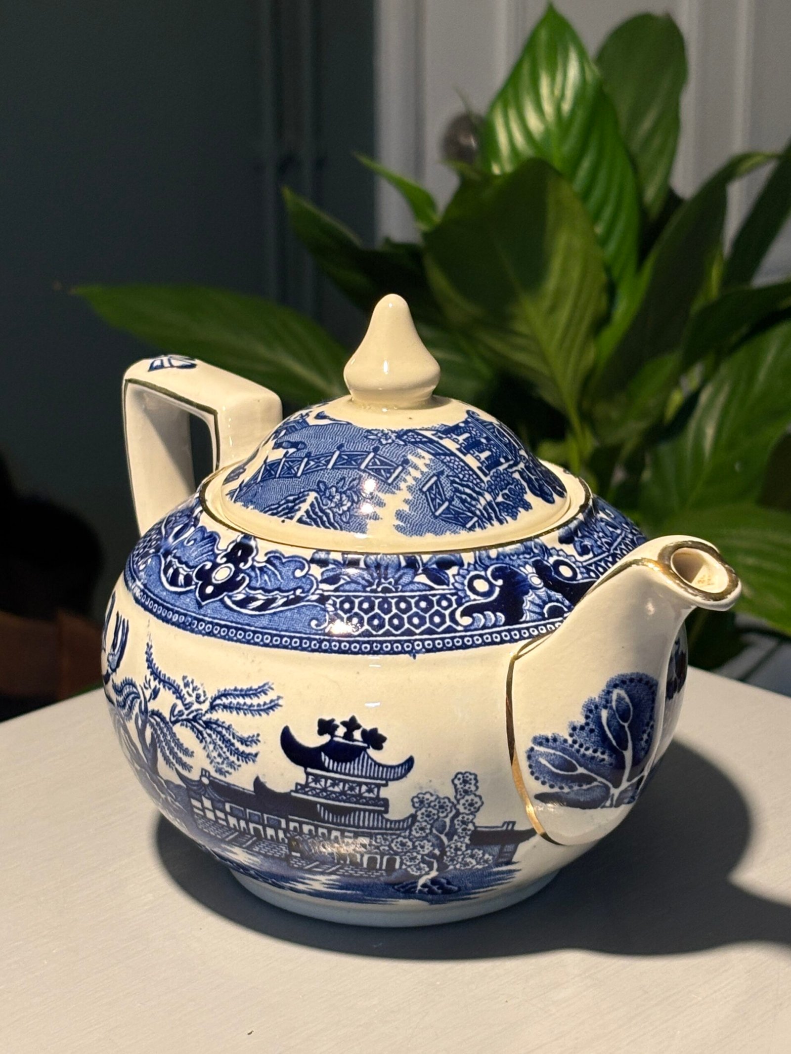 Burleigh Ware teapot features the legendary “Willow” transferware pattern in a deep, rich cobalt blue against a crisp white background. Crafted in Burslem, England, this piece showcases high-quality British pottery craftsmanship with elegant gold-rimmed detailing along the spout, lid, and rim. Small chip to inside rim of teapot.