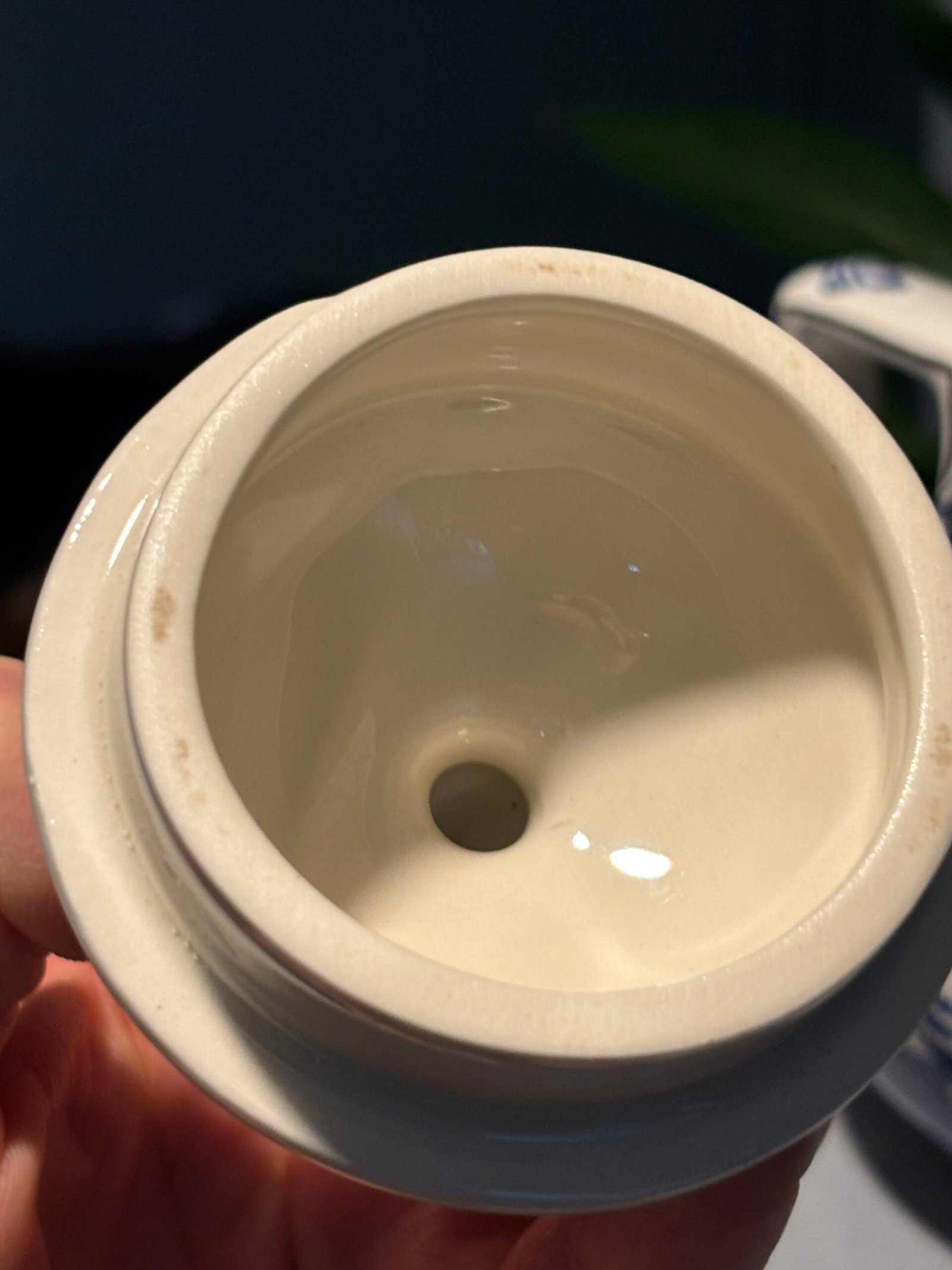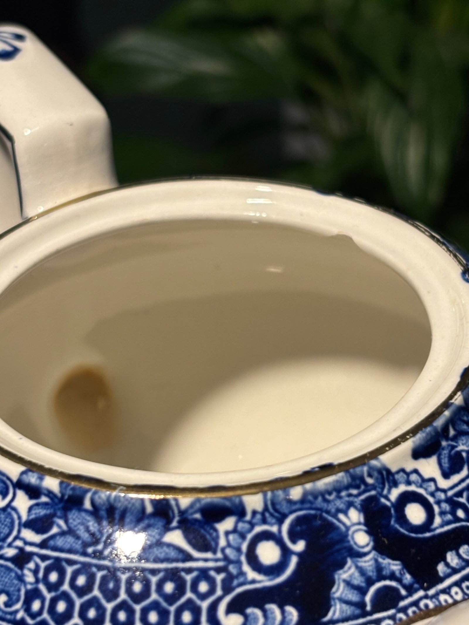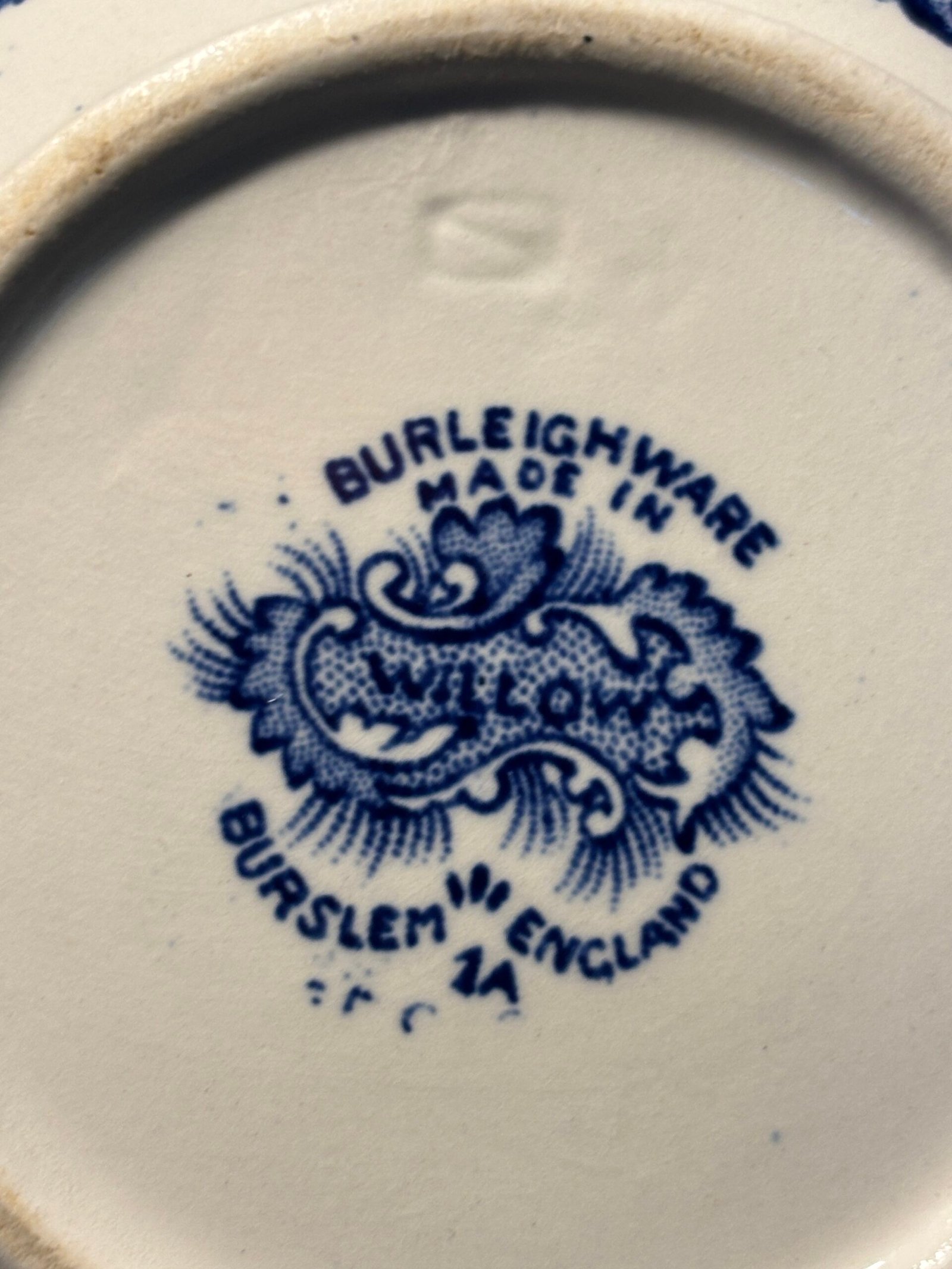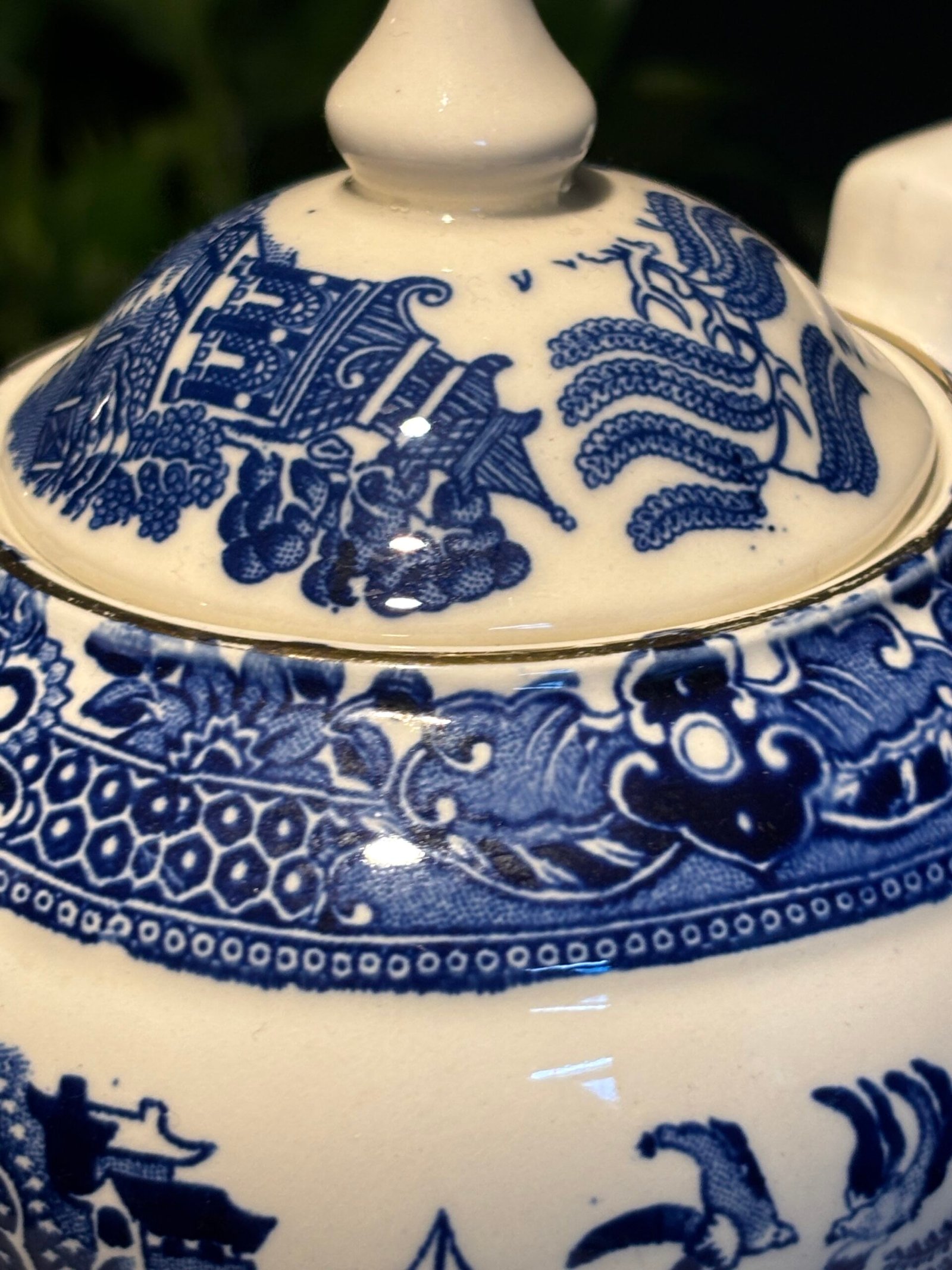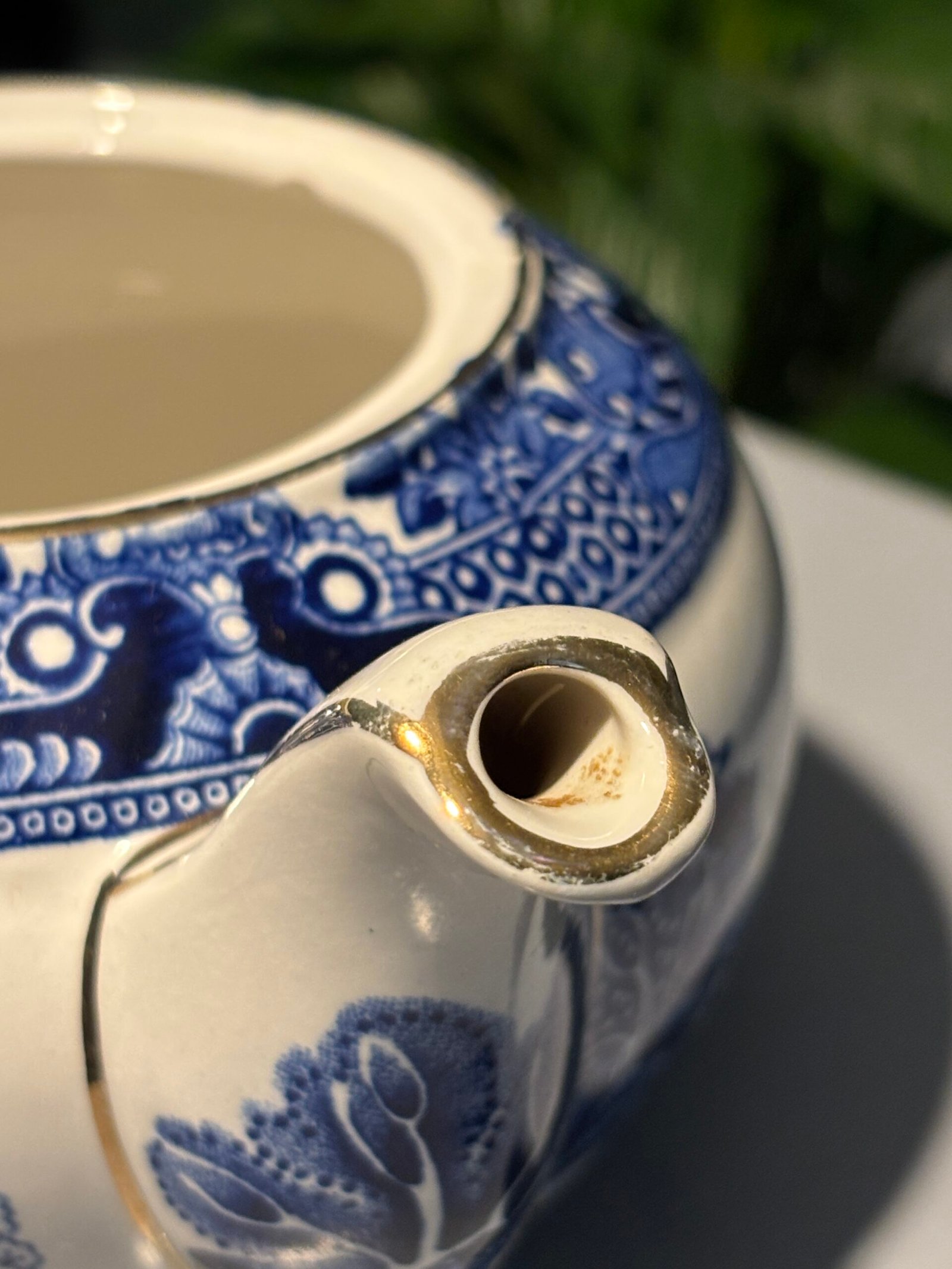 Burleigh Ware teapot features the legendary “Willow” transferware pattern in a deep, rich cobalt blue against a crisp white background. Crafted in Burslem, England, this piece showcases high-quality British pottery craftsmanship with elegant gold-rimmed detailing along the spout, lid, and rim. Small chip to inside rim of teapot.