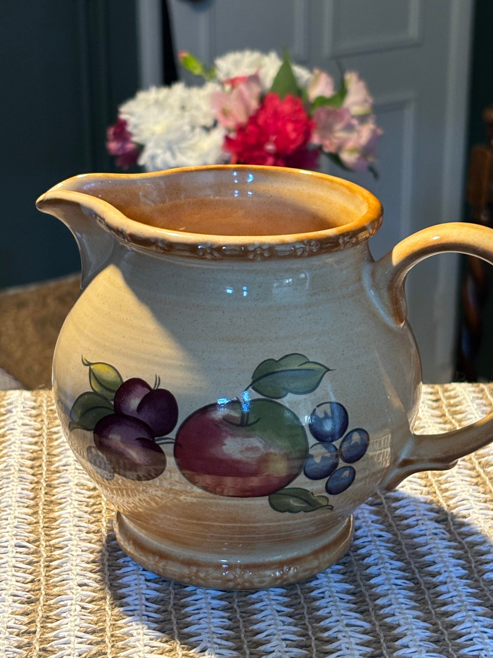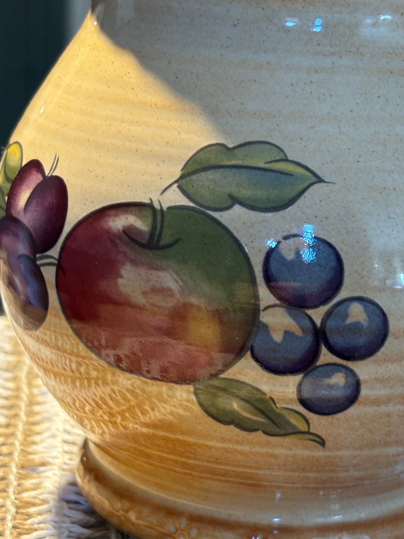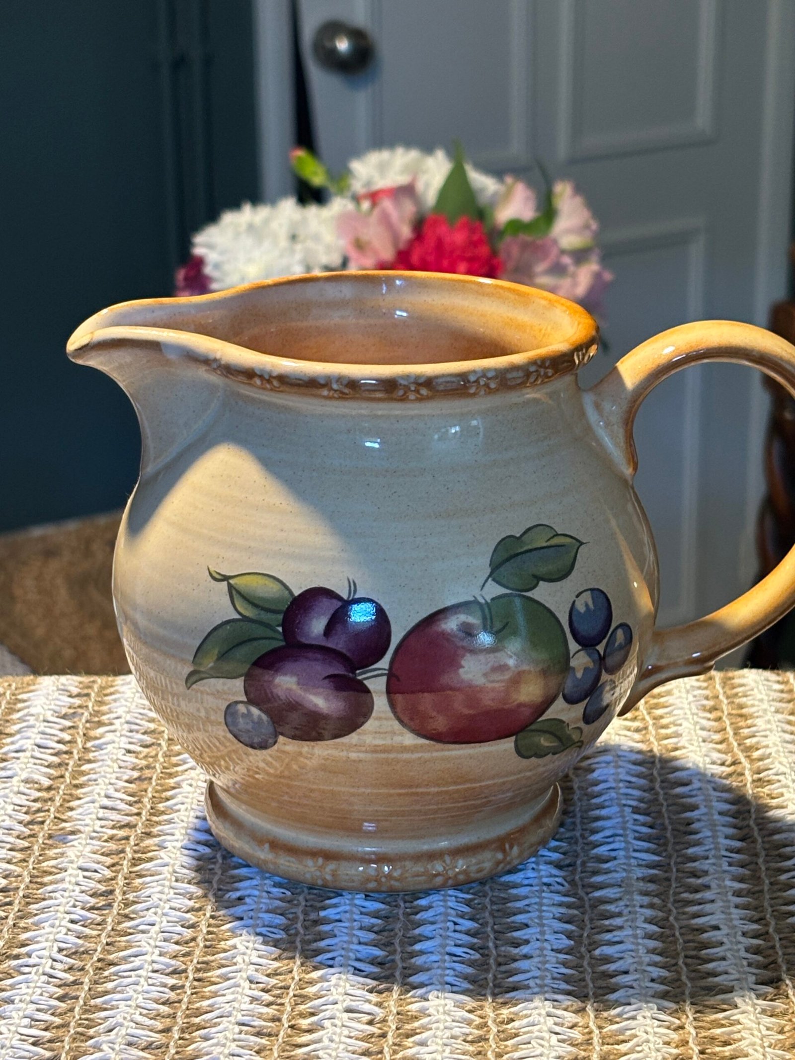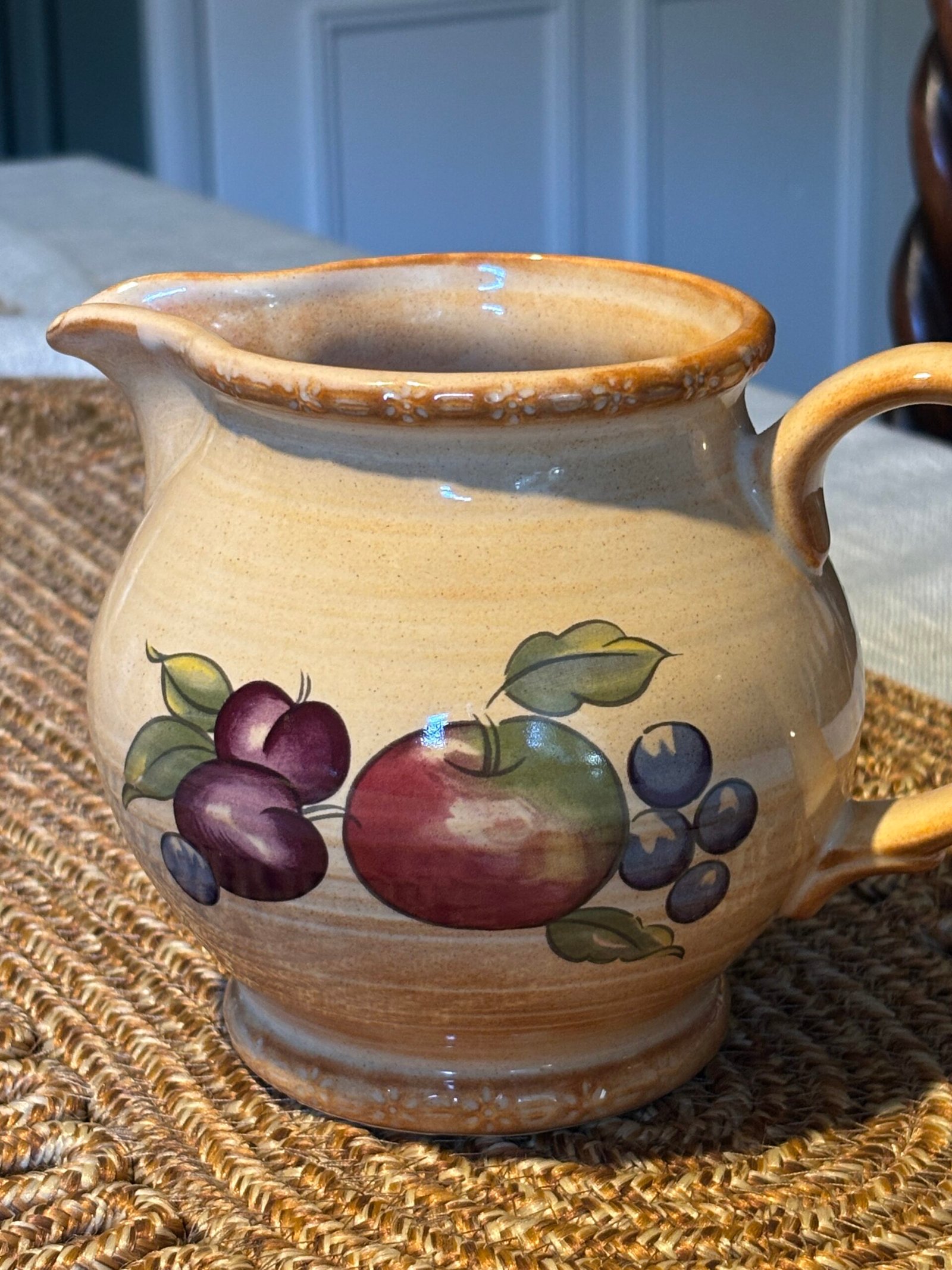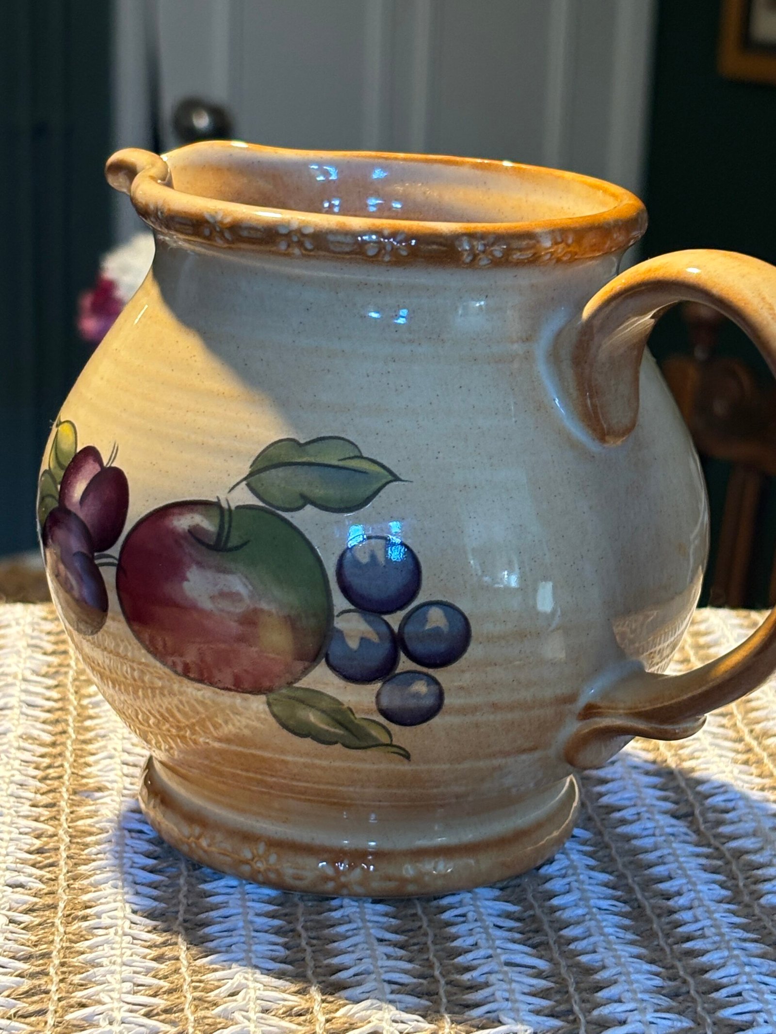 Add a touch of English country charm to your kitchen with this beautiful vintage pitcher from the renowned Hornsea Pottery. Featuring the classic “Yeovil” pattern, this jug is decorated with a vibrant hand-painted fruit motif including apples, plums, and berries against a warm, speckled cream stoneware background.