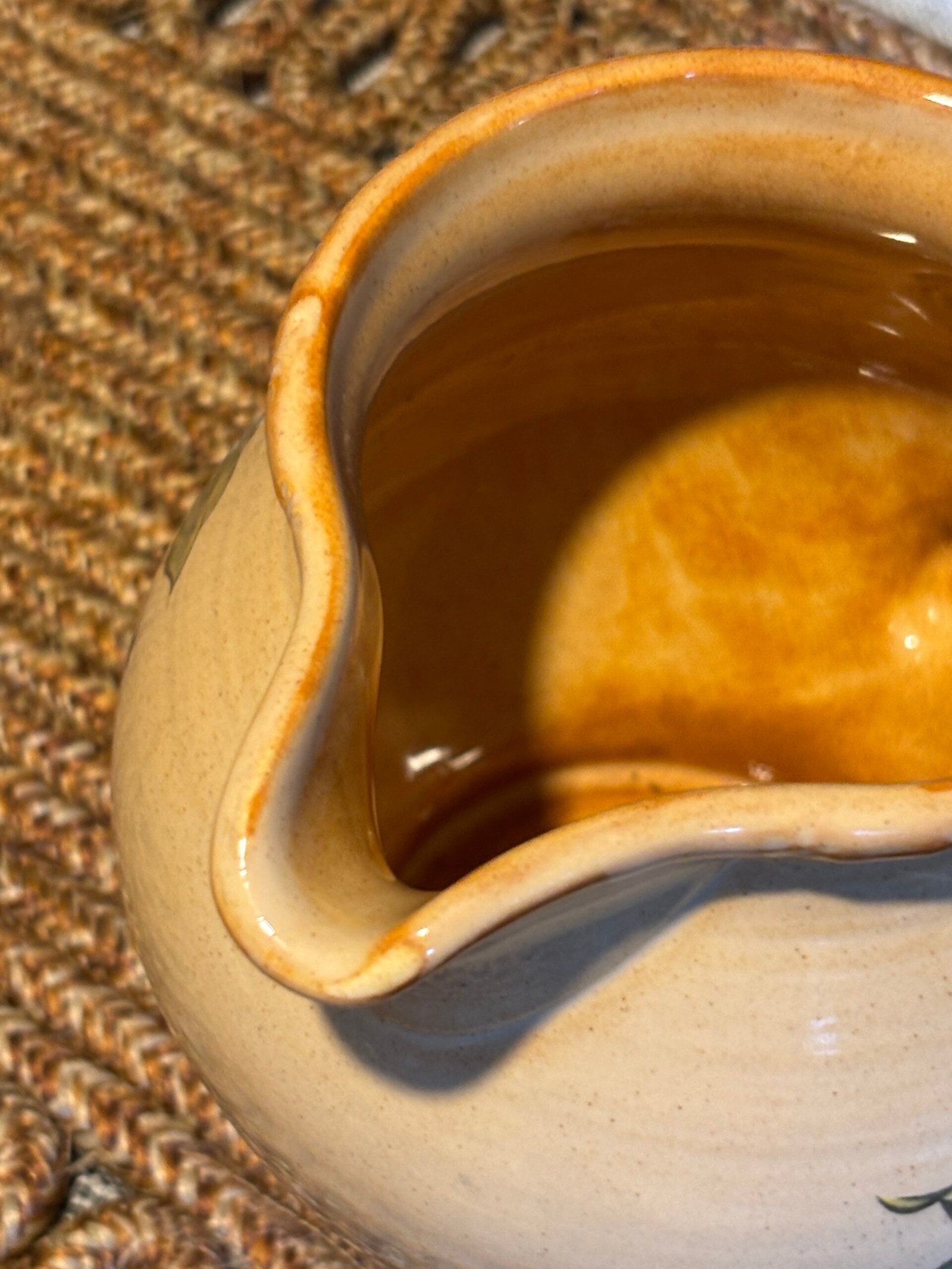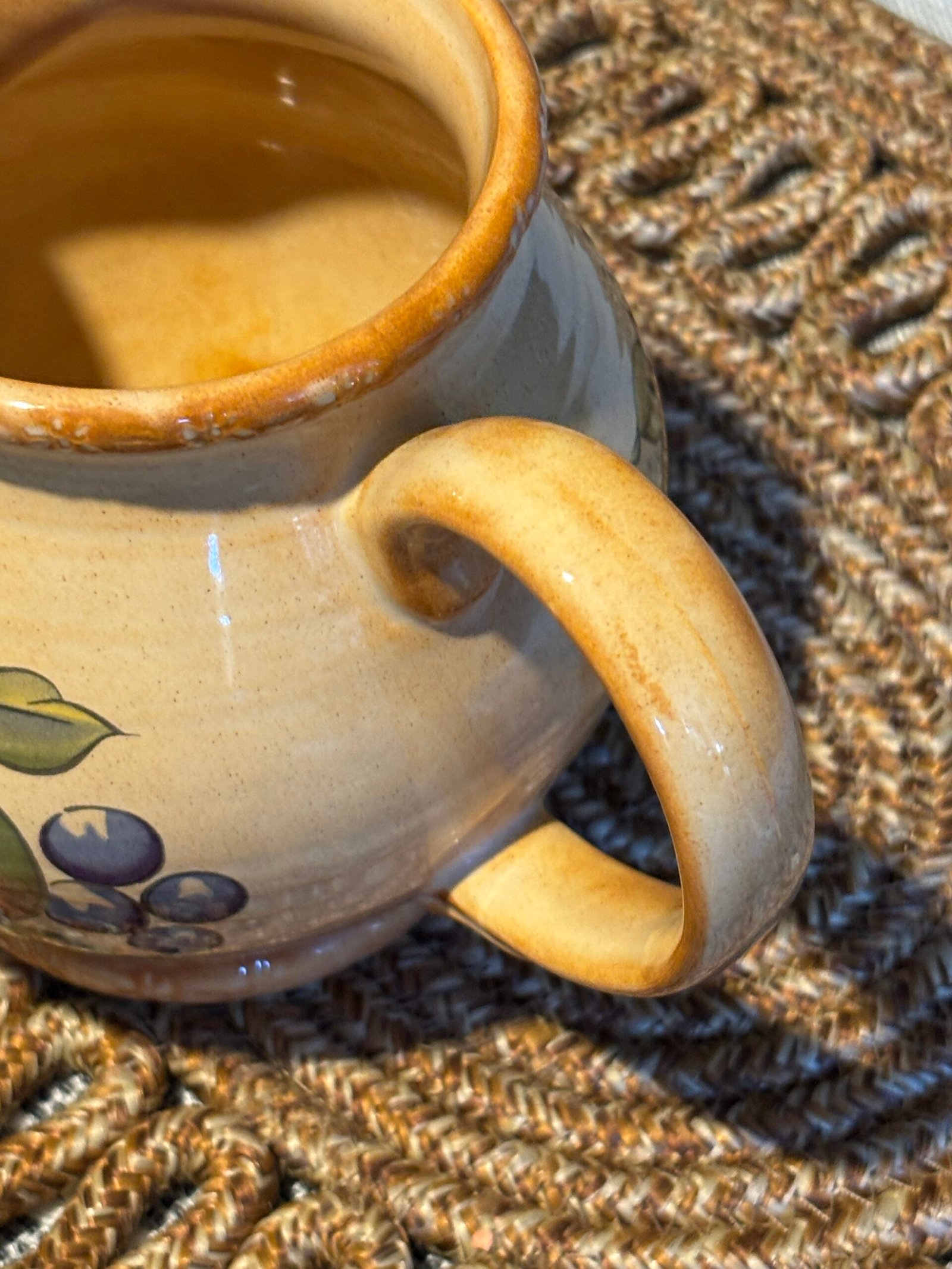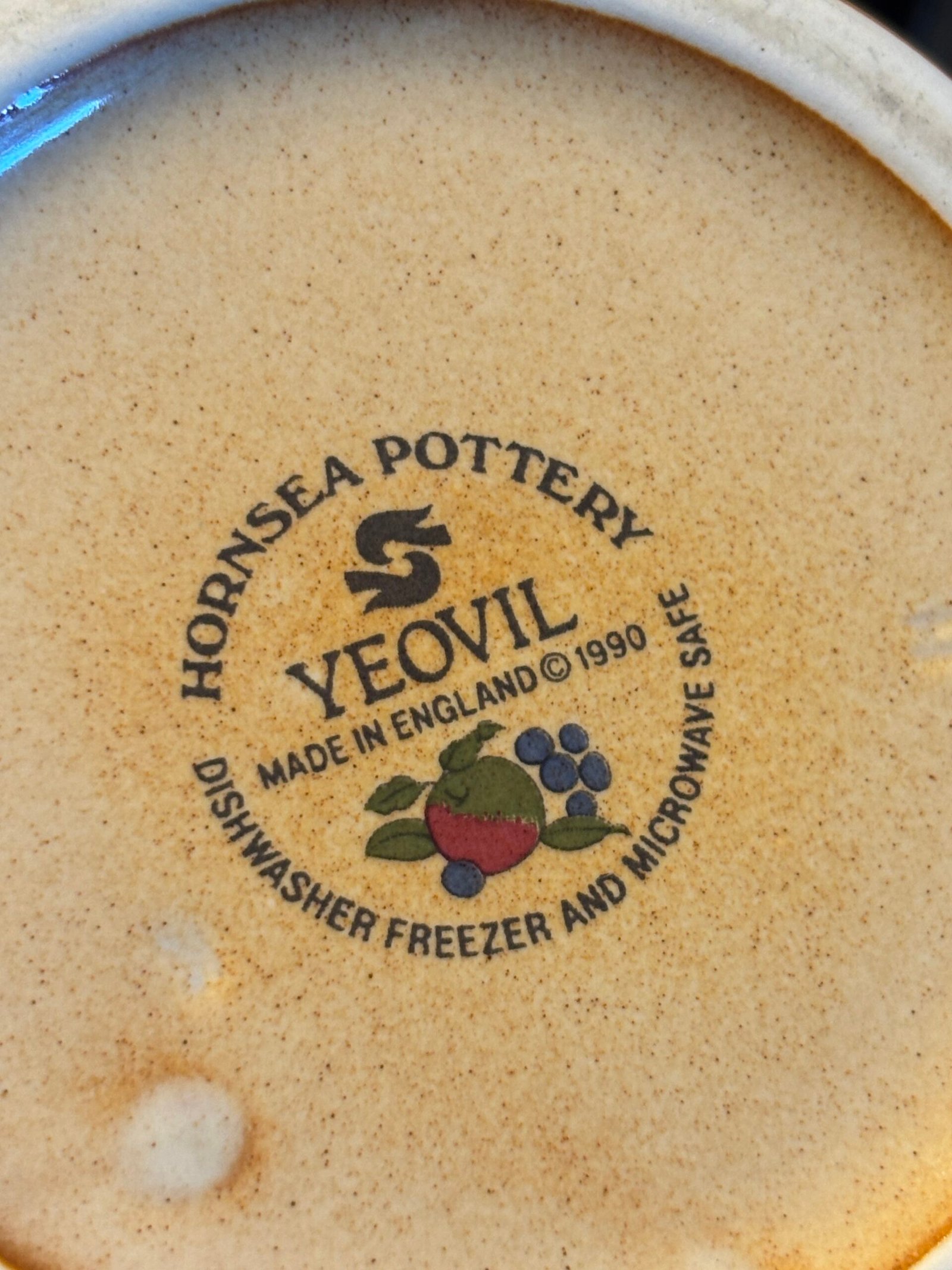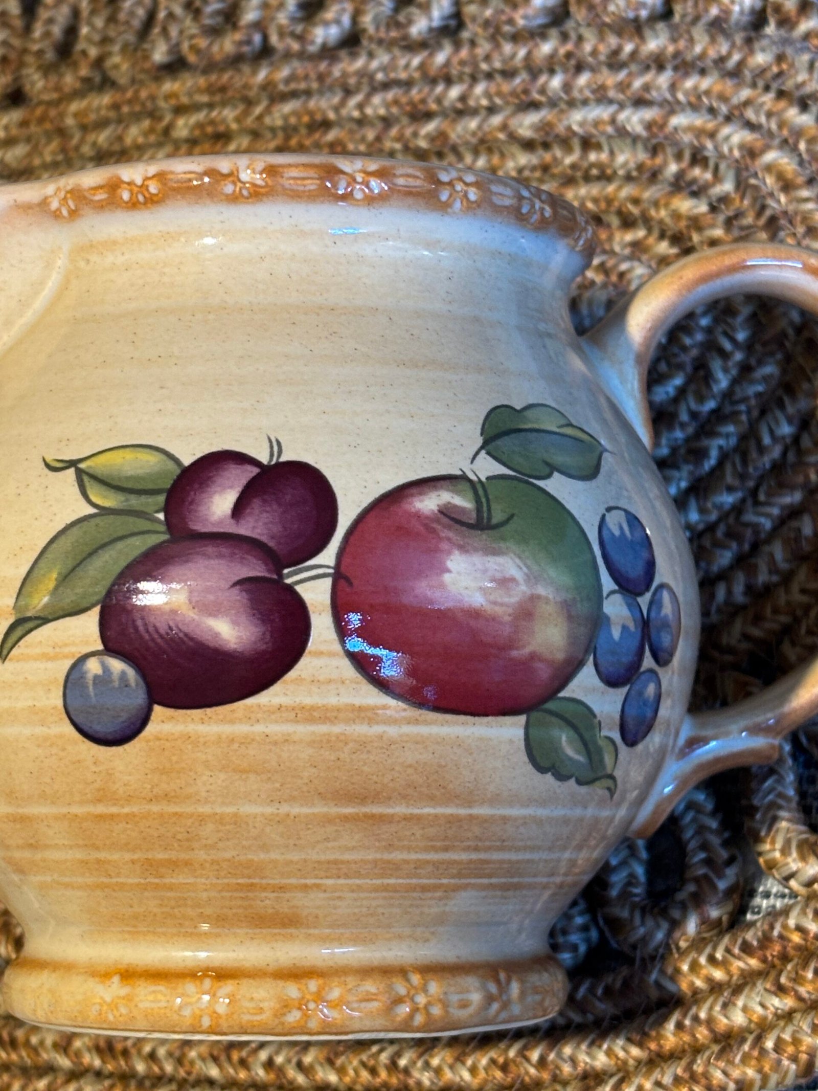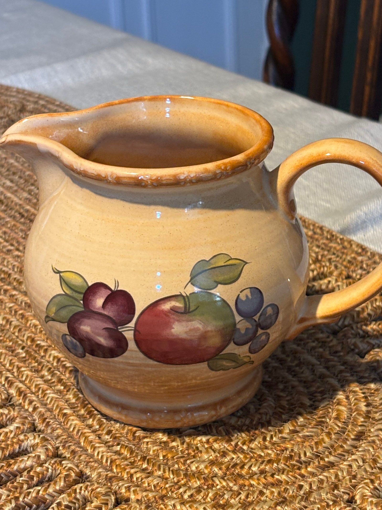 Add a touch of English country charm to your kitchen with this beautiful vintage pitcher from the renowned Hornsea Pottery. Featuring the classic “Yeovil” pattern, this jug is decorated with a vibrant hand-painted fruit motif including apples, plums, and berries against a warm, speckled cream stoneware background.
