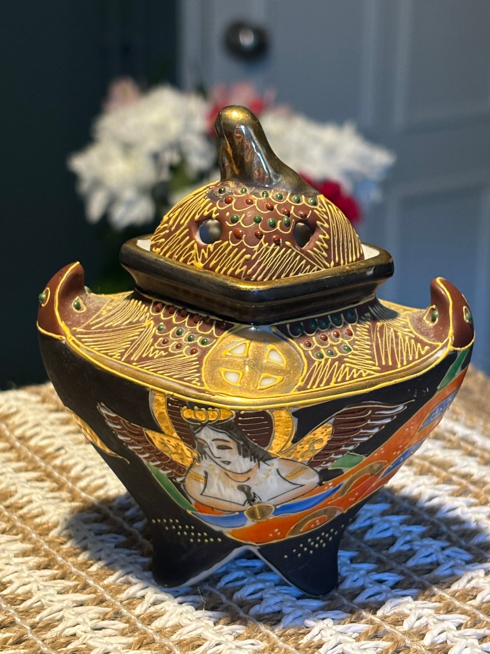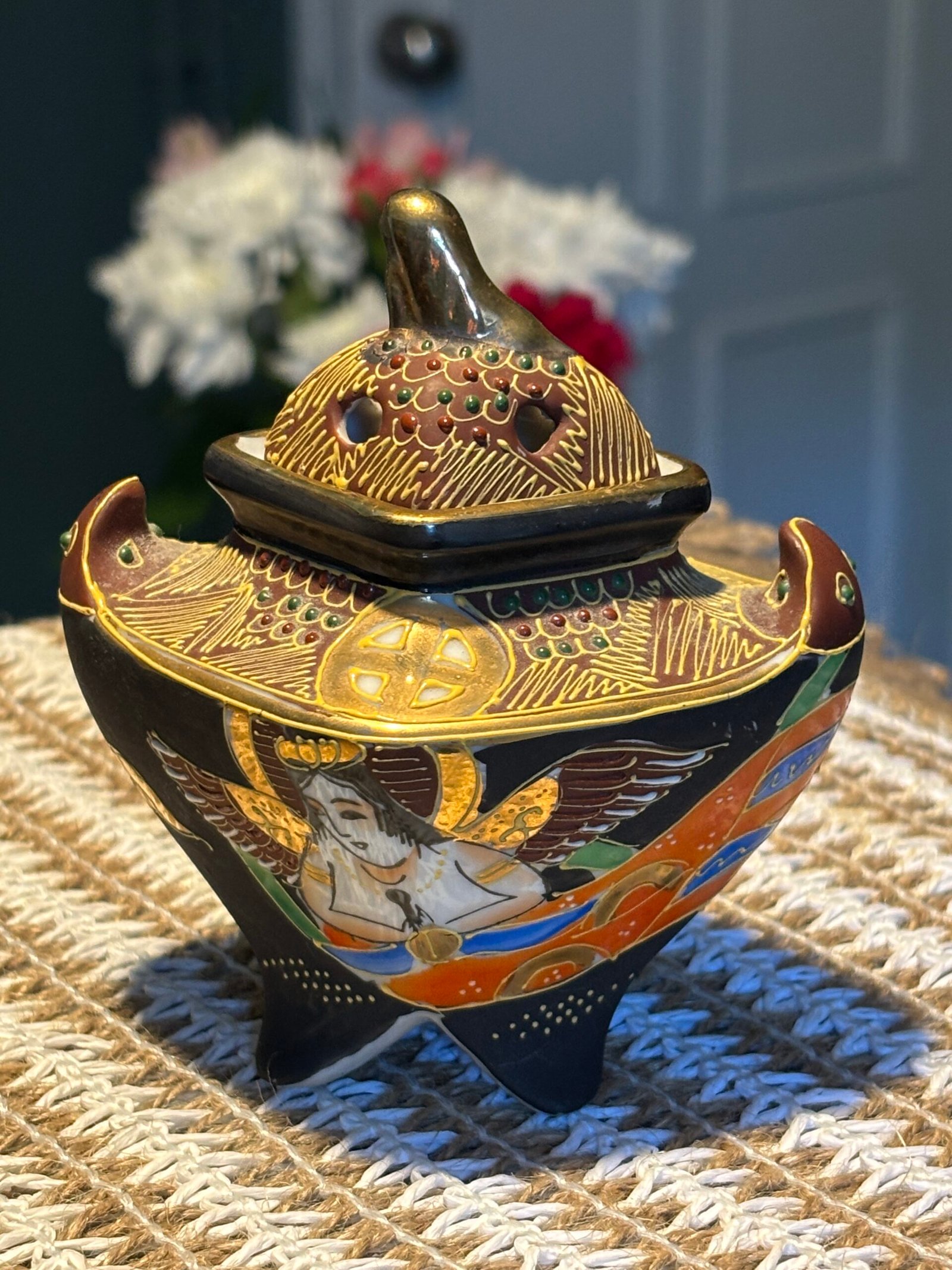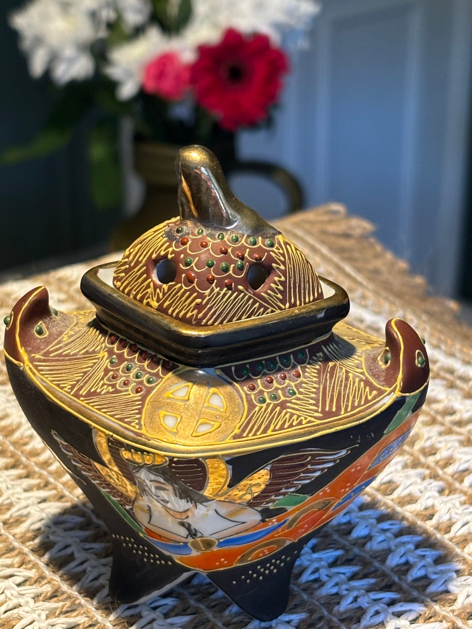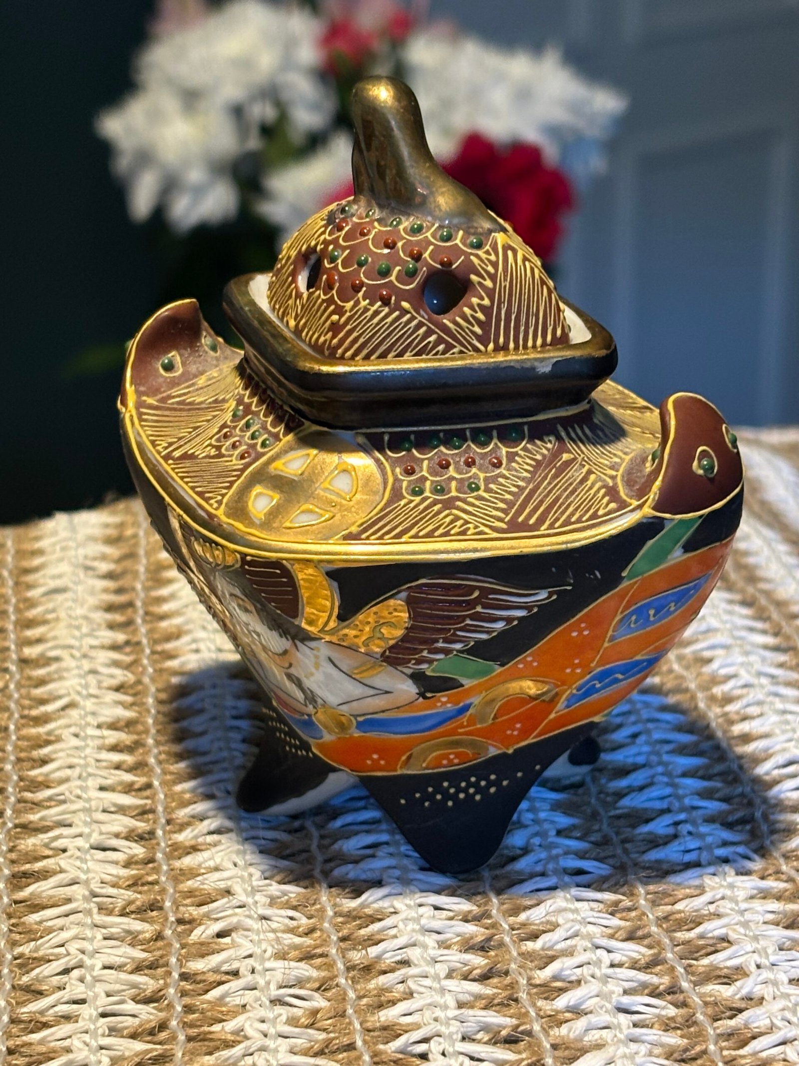 A beautiful and delicate vintage Japanese Satsuma Koro (incense burner), standing at 10cm tall. This piece features stunning Moriage (raised enamel) detailing, giving it a rich, 3D texture that catches the light beautifully.