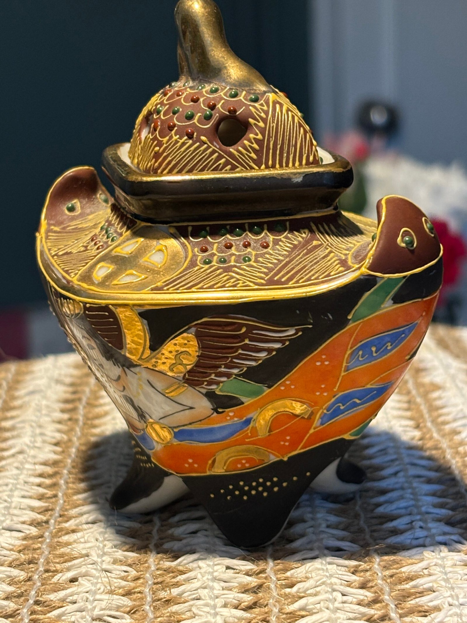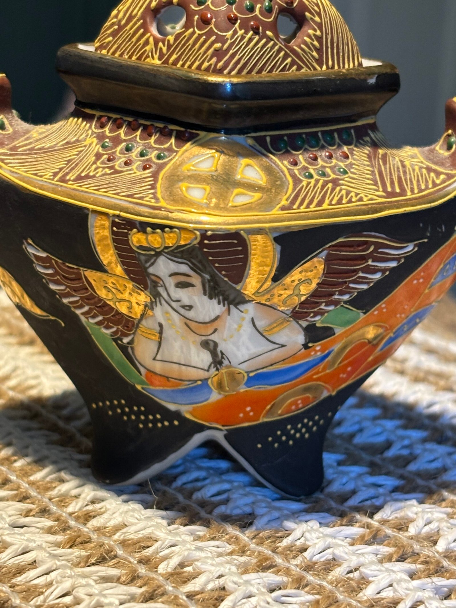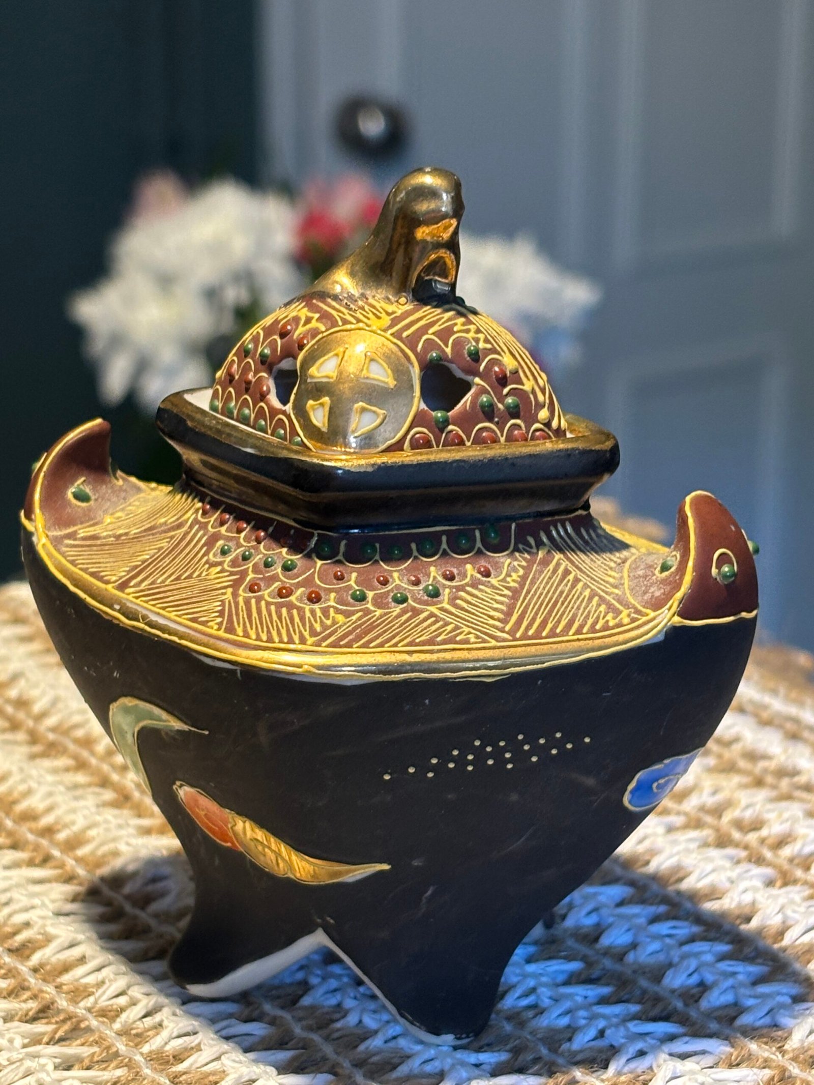 A beautiful and delicate vintage Japanese Satsuma Koro (incense burner), standing at 10cm tall. This piece features stunning Moriage (raised enamel) detailing, giving it a rich, 3D texture that catches the light beautifully.