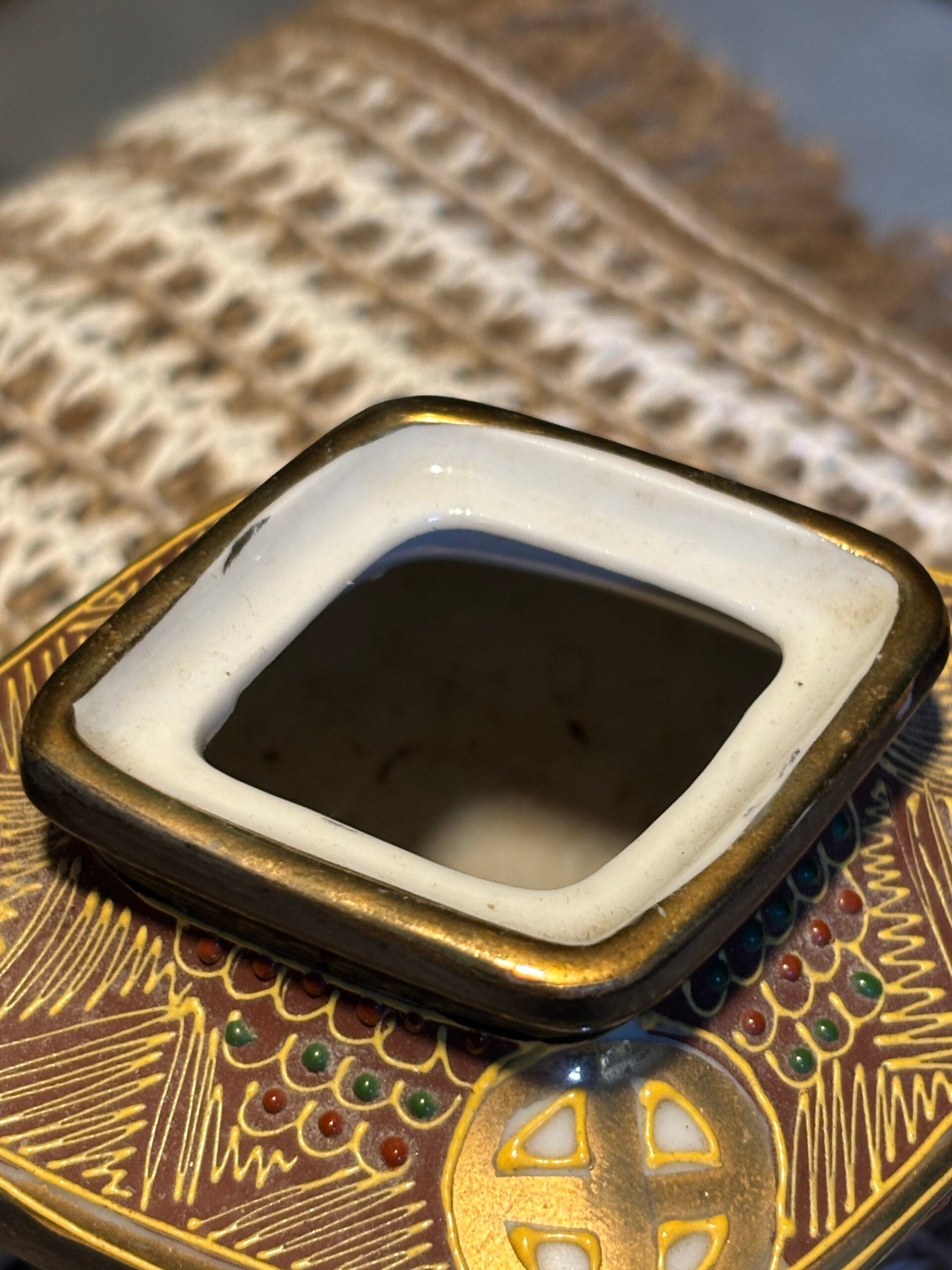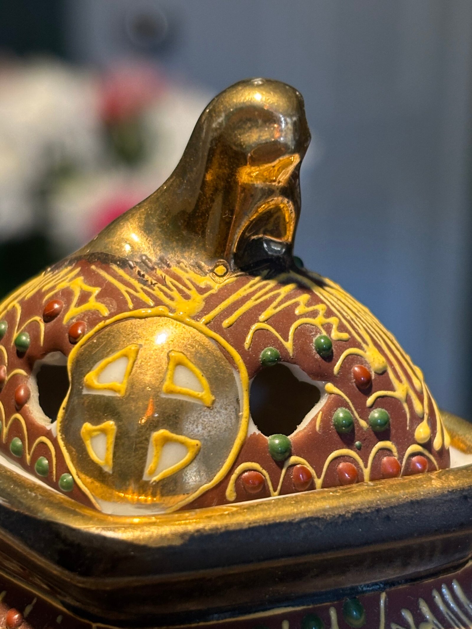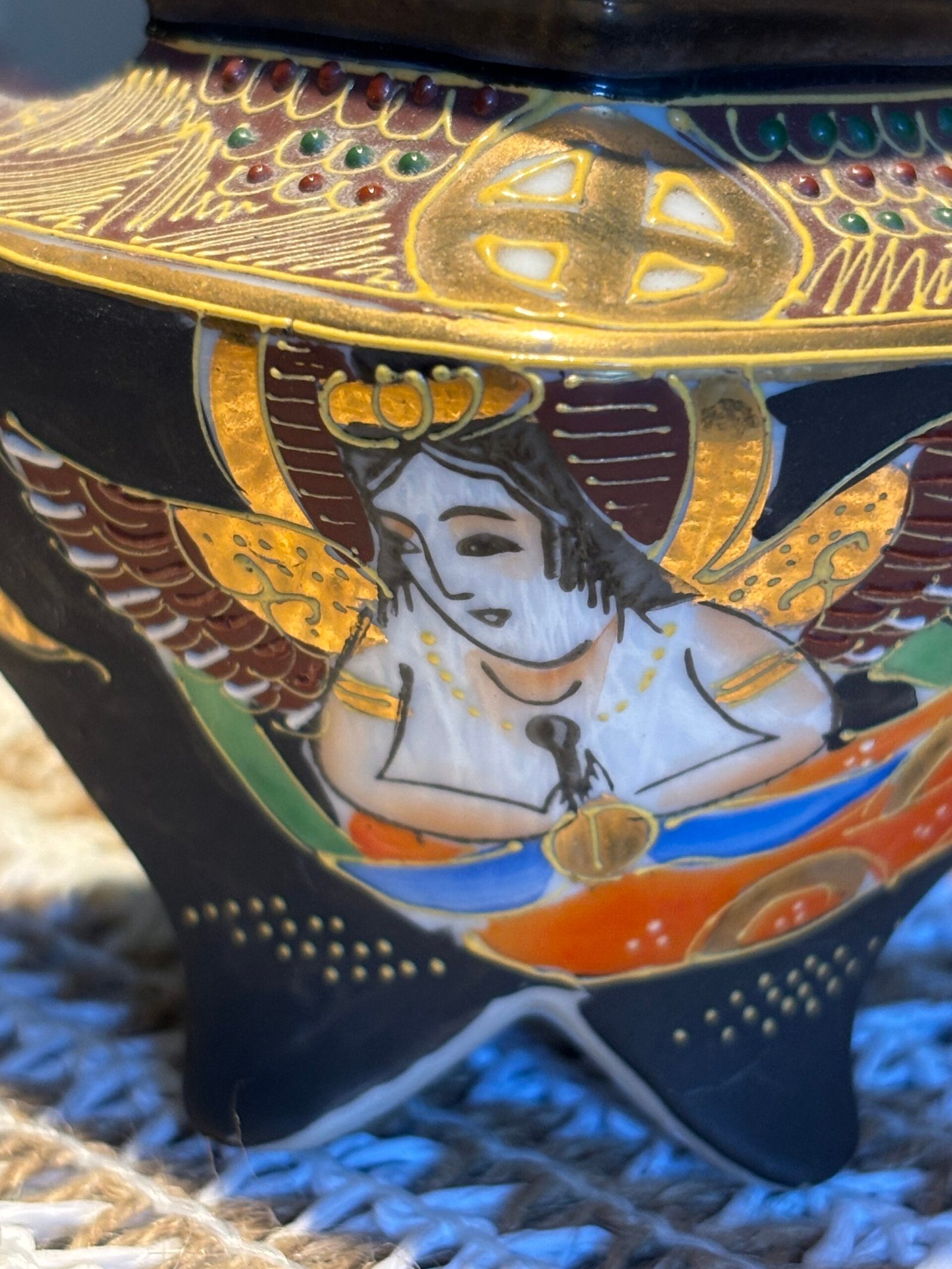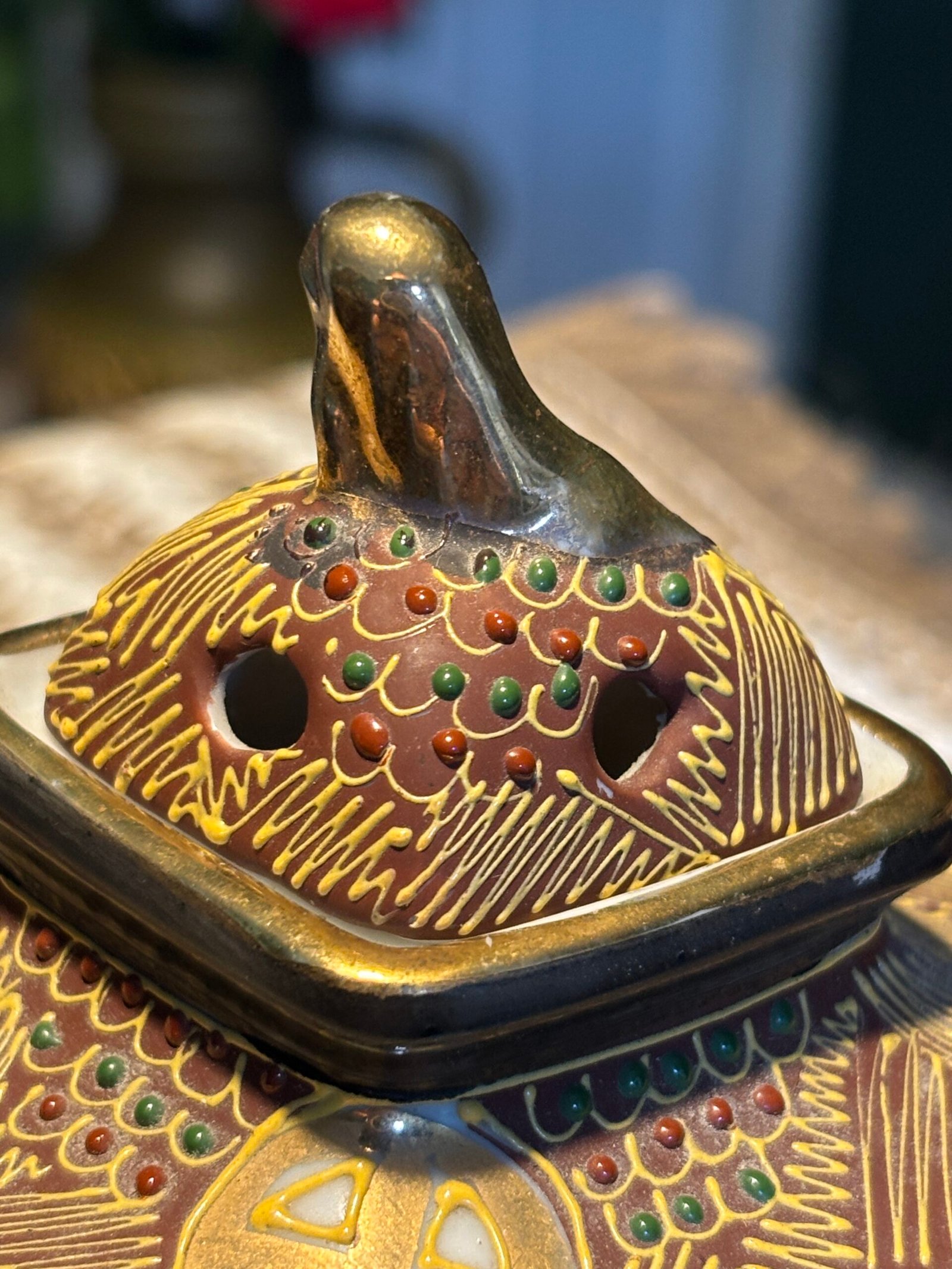 A beautiful and delicate vintage Japanese Satsuma Koro (incense burner), standing at 10cm tall. This piece features stunning Moriage (raised enamel) detailing, giving it a rich, 3D texture that catches the light beautifully.