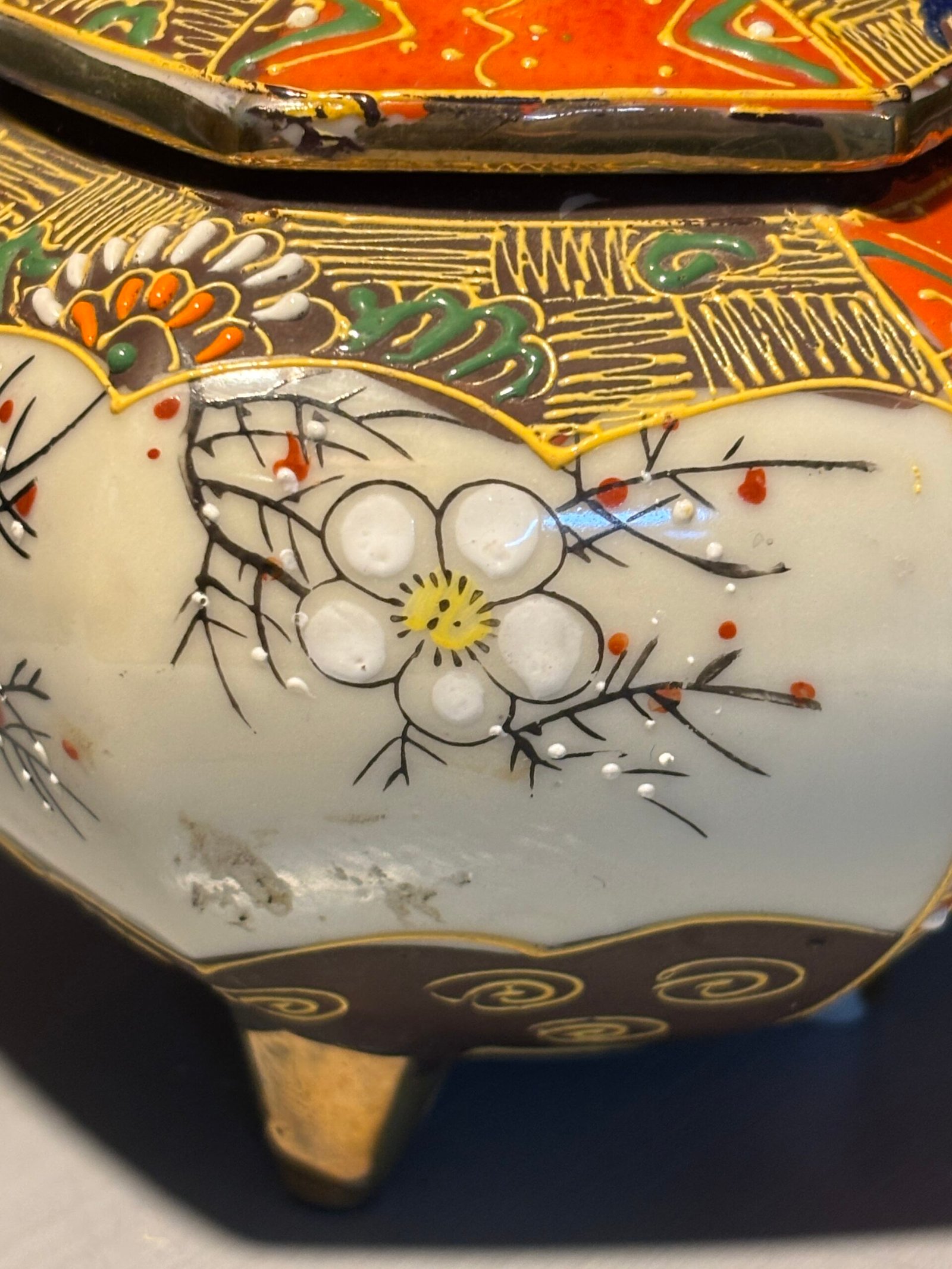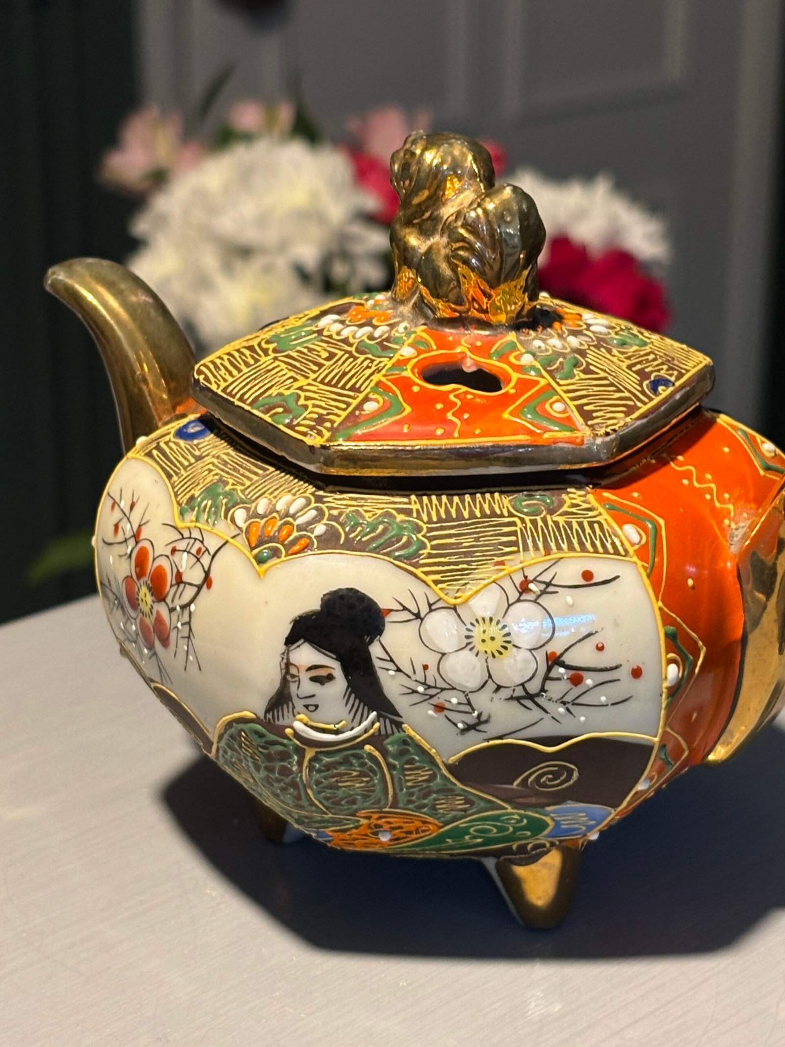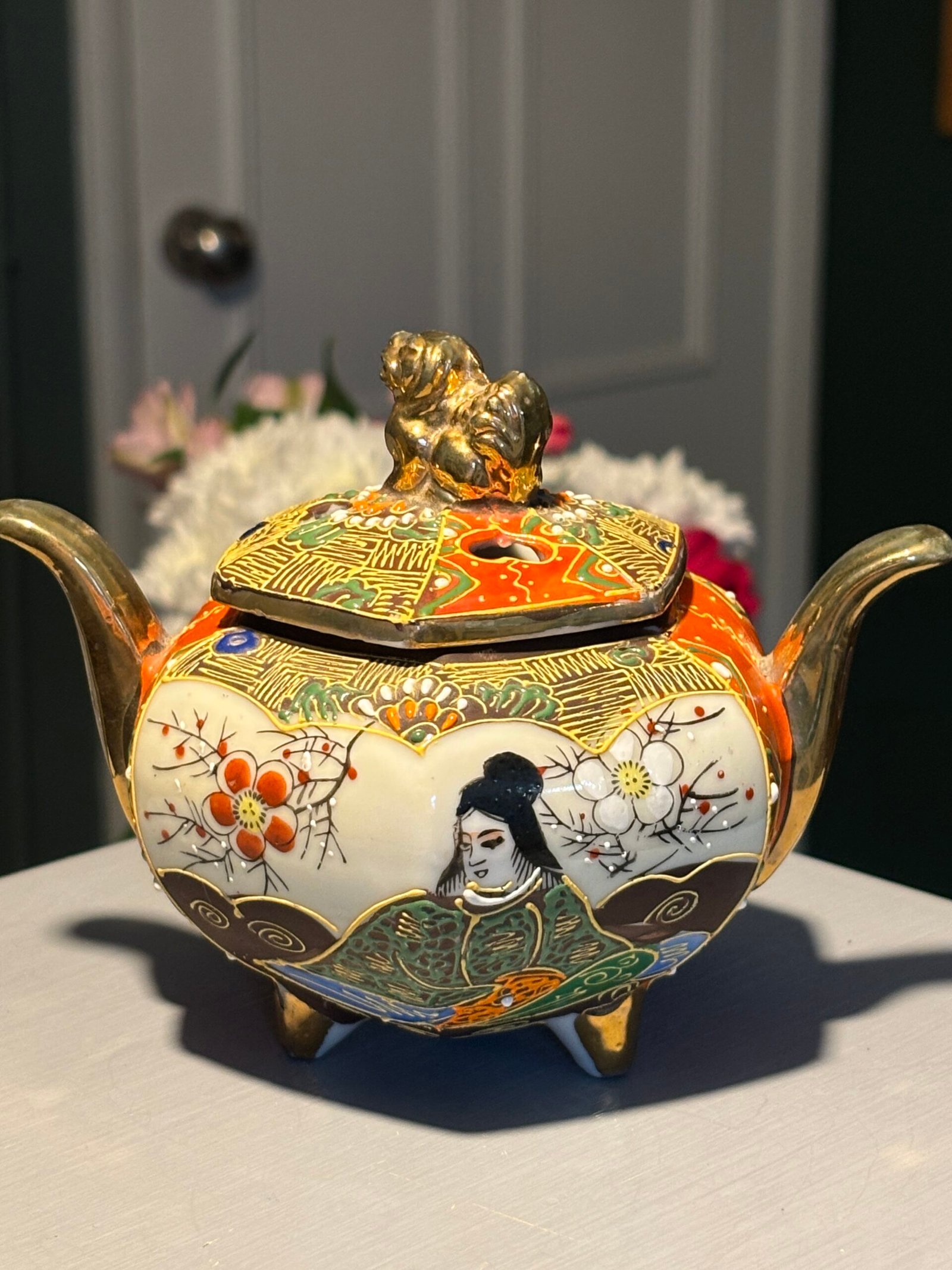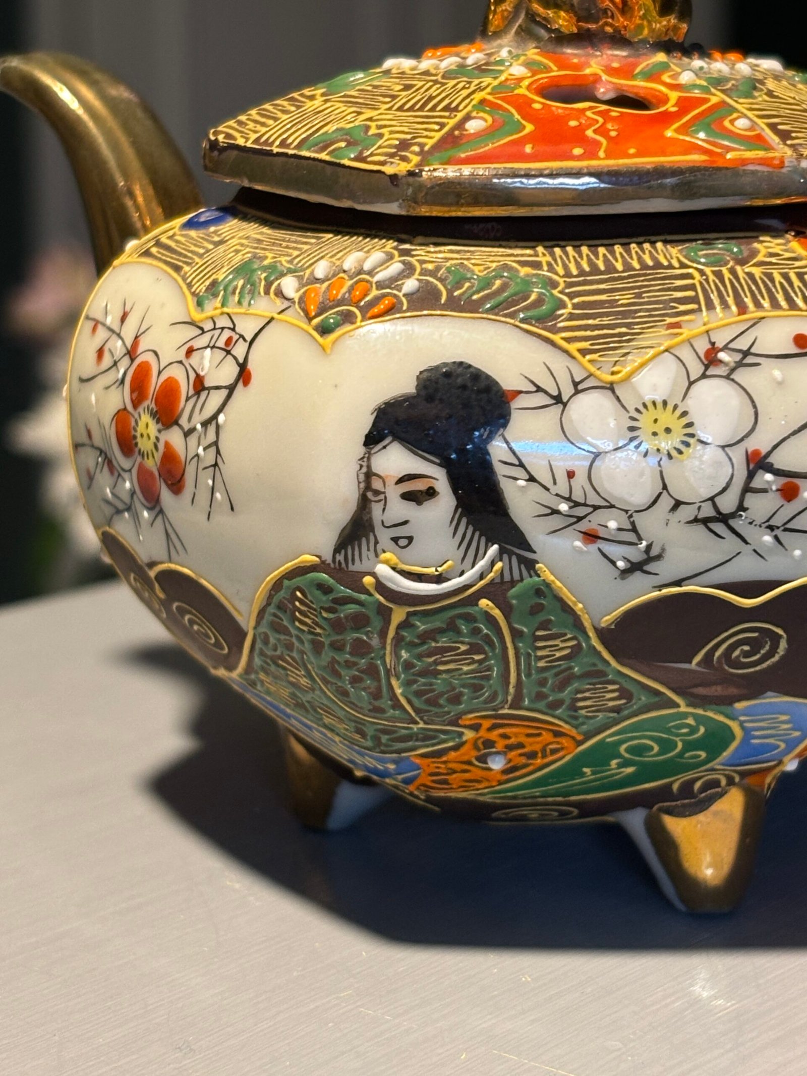 A beautiful vintage Japanese Satsuma-style tripod incense burner (Koro). This piece is richly decorated with traditional moriage (raised enamel) techniques, featuring hand-painted scenes of a Geisha and delicate floral motifs in vibrant oranges, greens, and gold gilding.